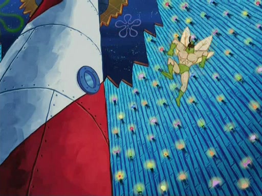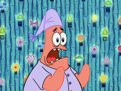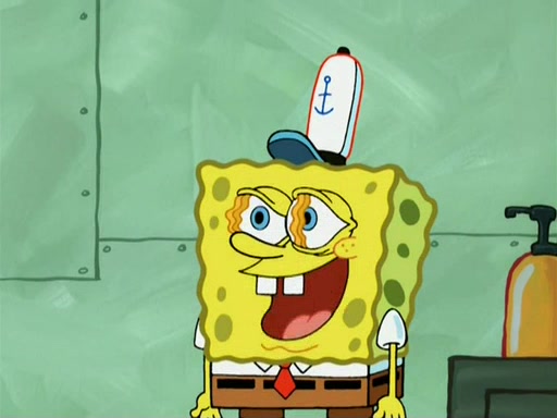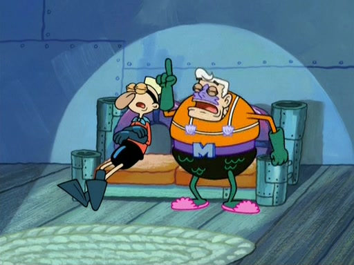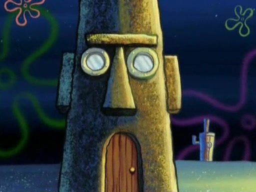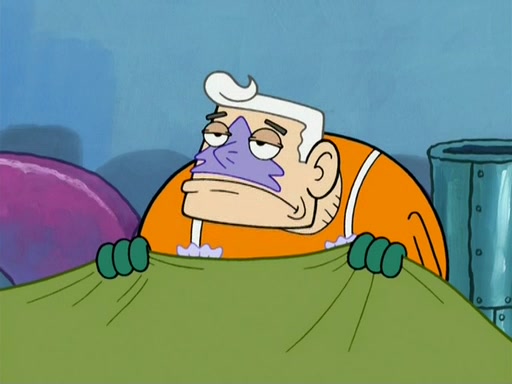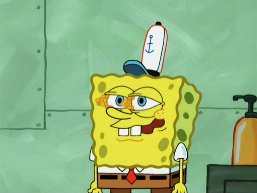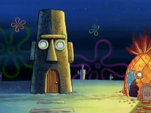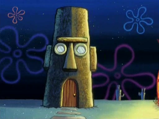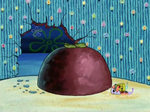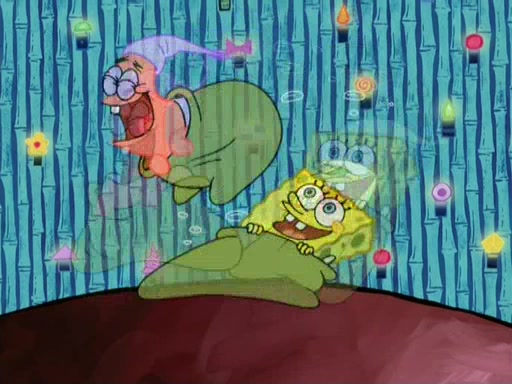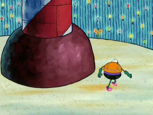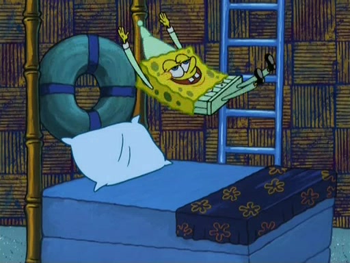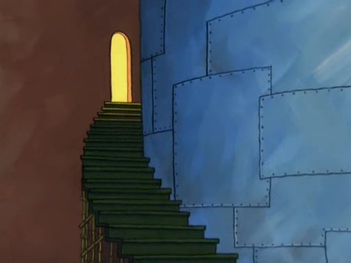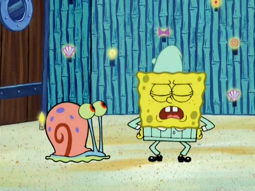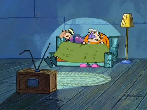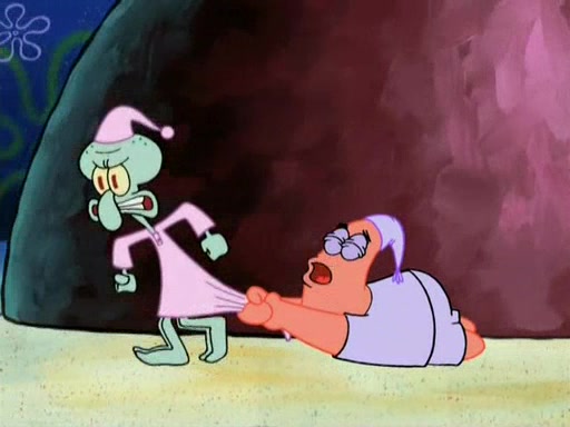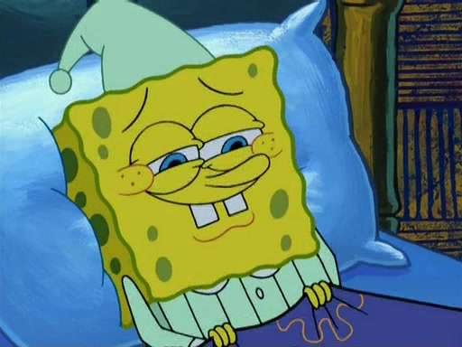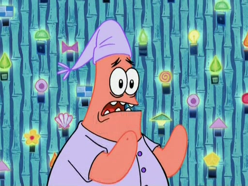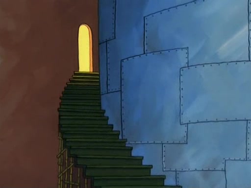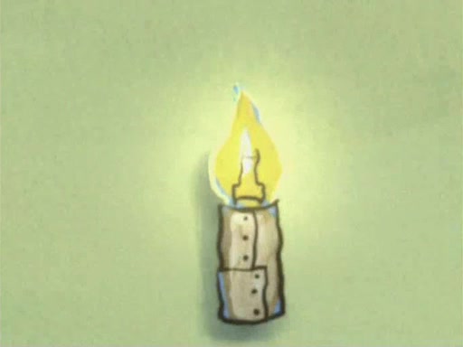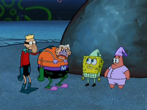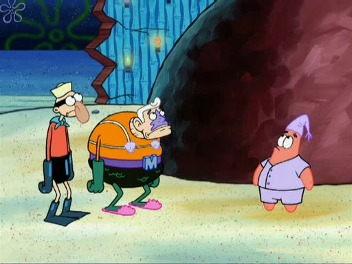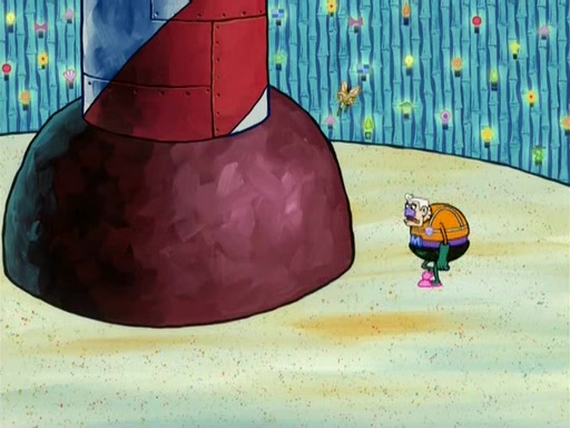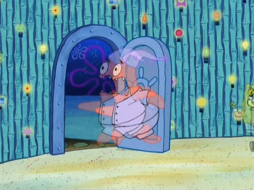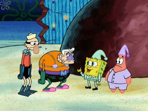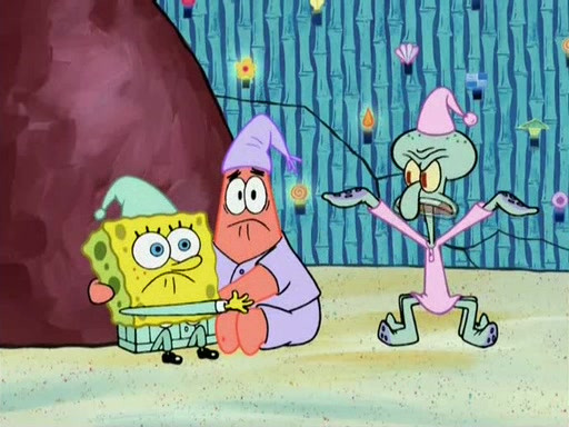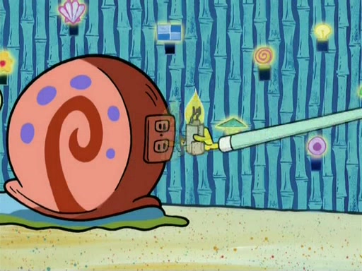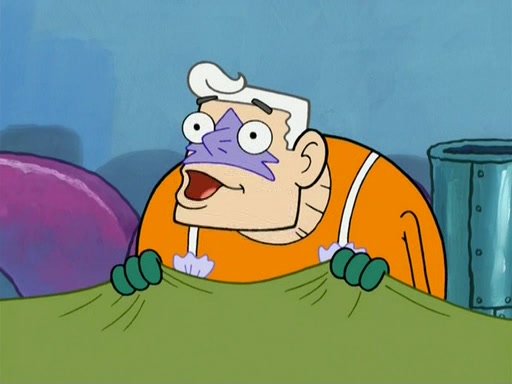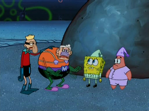 SpongeBob and Patrick are alone in the dark until the sun rises. Patrick goes up to get it, thinking it is a light and SpongeBob falls asleep. Patrick comes down again on fire shouting"Too much light!