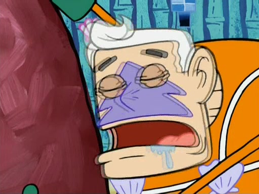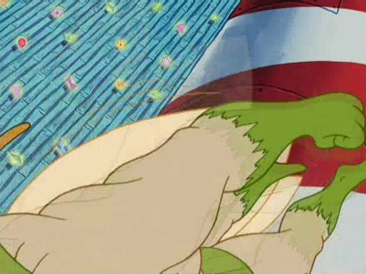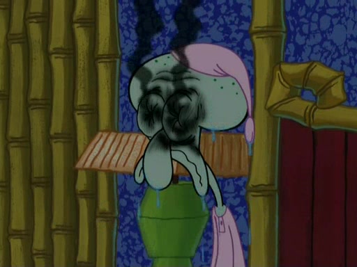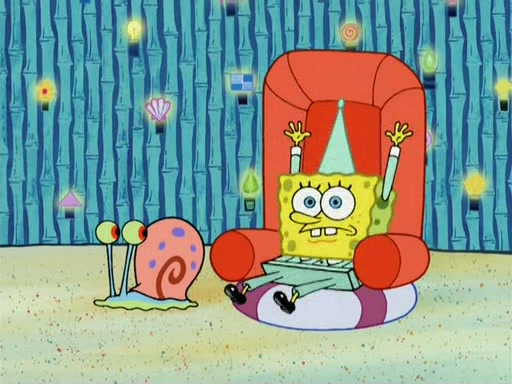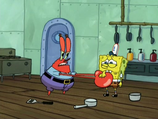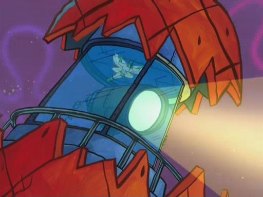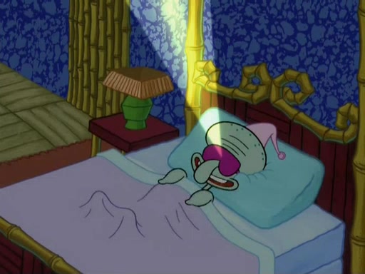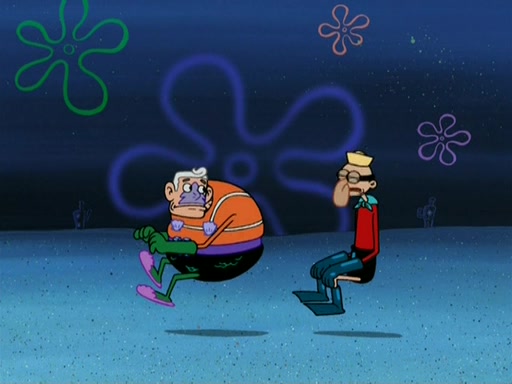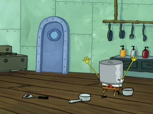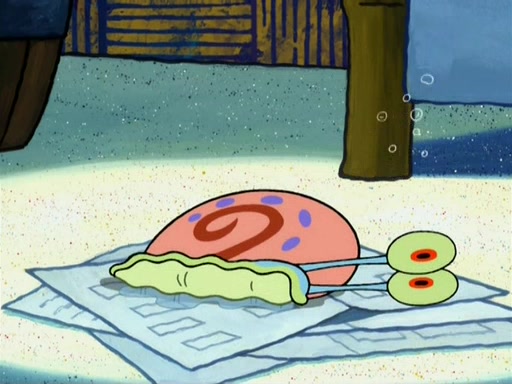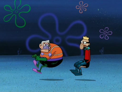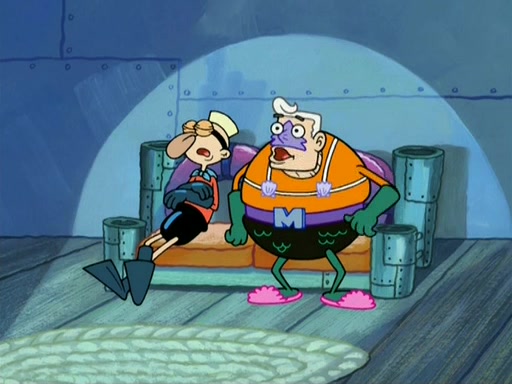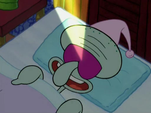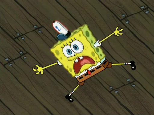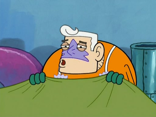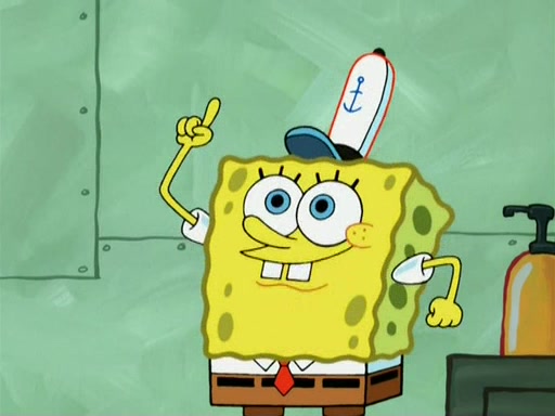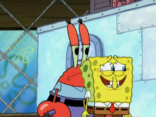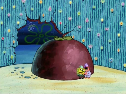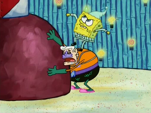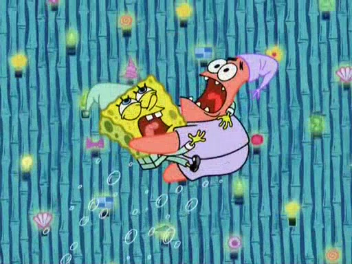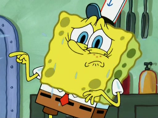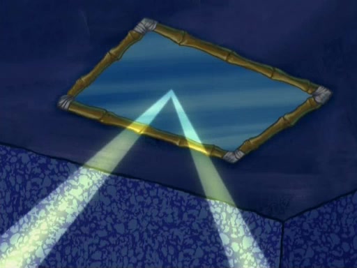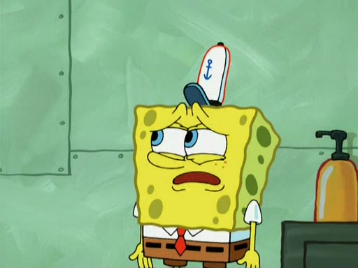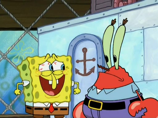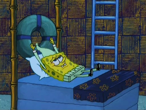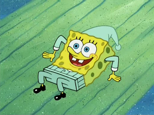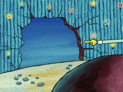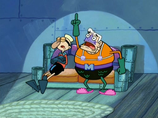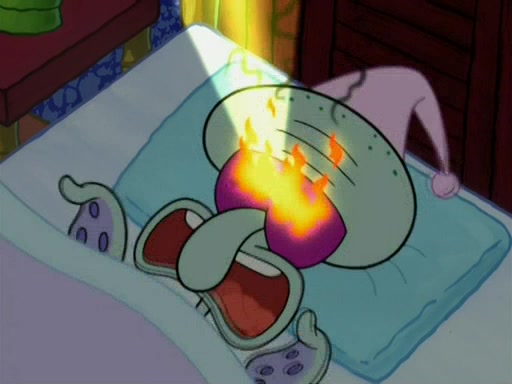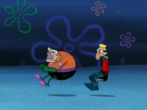 SpongeBob and Patrick are alone in the dark until the sun rises. Patrick goes up to get it, thinking it is a light and SpongeBob falls asleep. Patrick comes down again on fire shouting"Too much light!