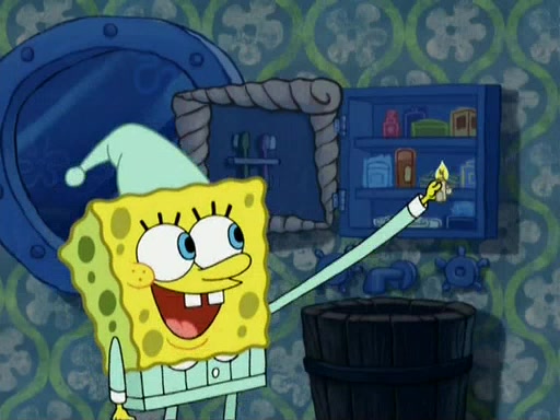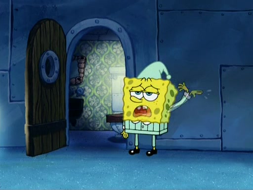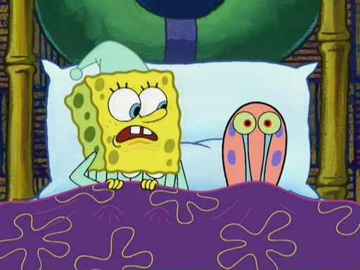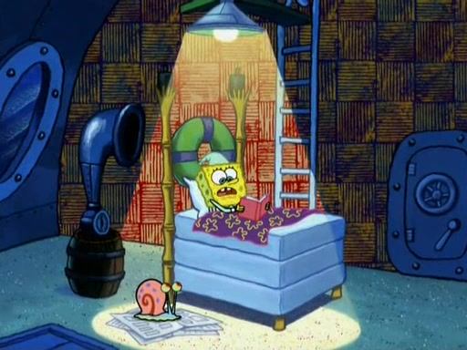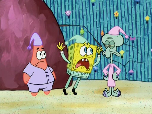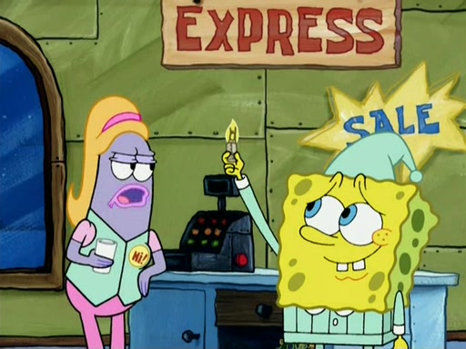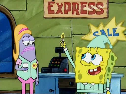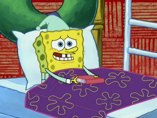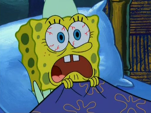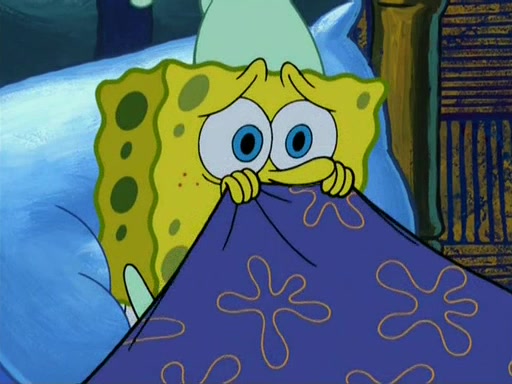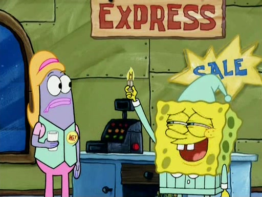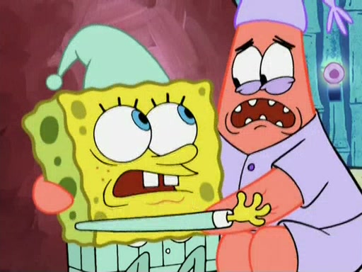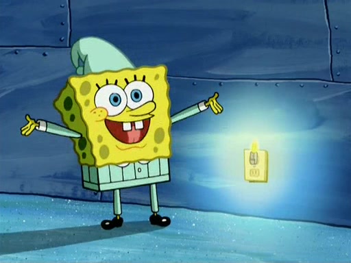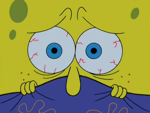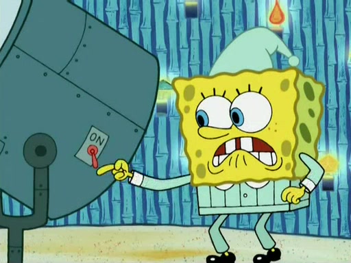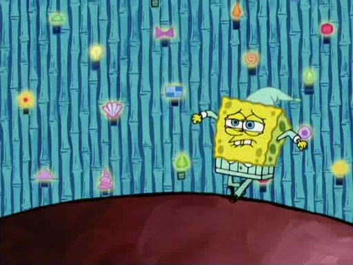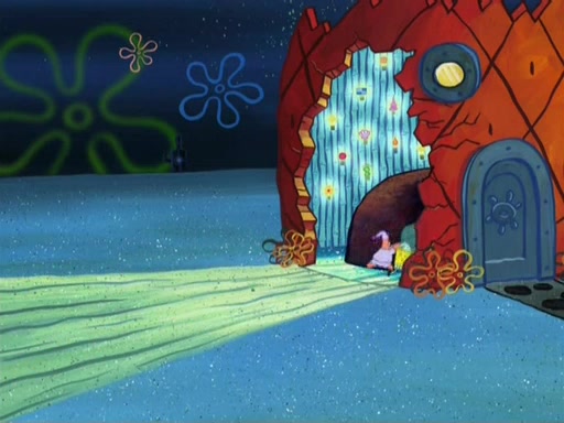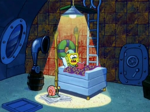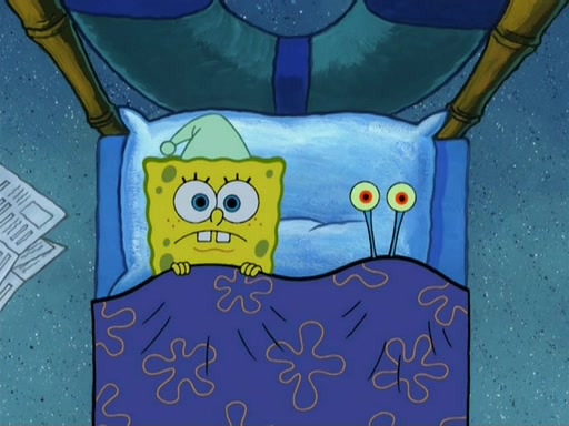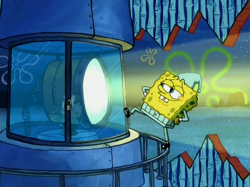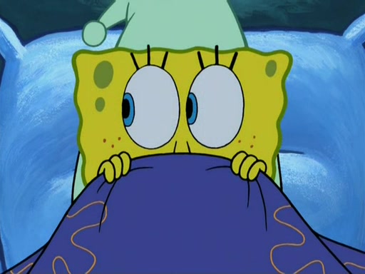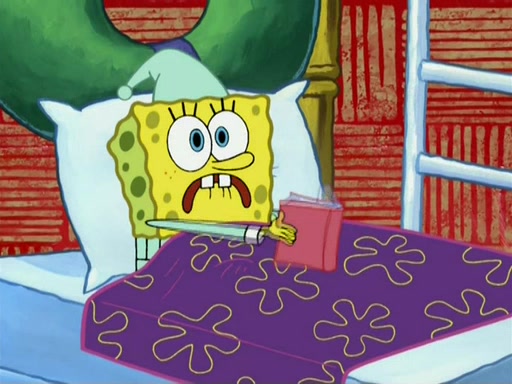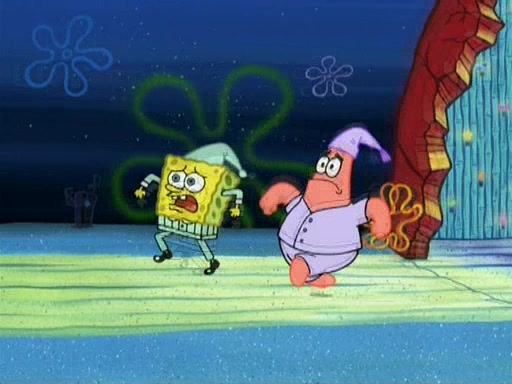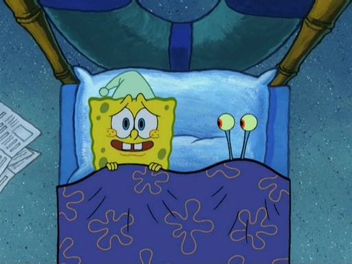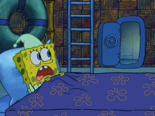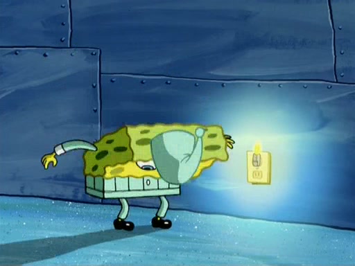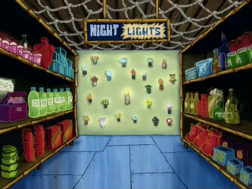 SpongeBob reads a scary book before bedtime. Because of that he sees scary creatures when he turns off the light (Such as the chair as a monstrous brain beast, and coral branch tapping the window as a monsters hand). When at the Krusty Krab, he gets terrified of a pot on his head, then he tells Mr. Krabs that if he blinks, he sees something scary, he then tries not to blink, but doesn't work, he then gets spooked by the dark in the freezer when Mr. Krabs wanted him to get some fresh patties. Mr. Krabs tells SpongeBob to get a night light so he won't be scared of the dark. However, he buys more when he finds more darkness in the house. Eventually, there are thousands of night lights in every room.