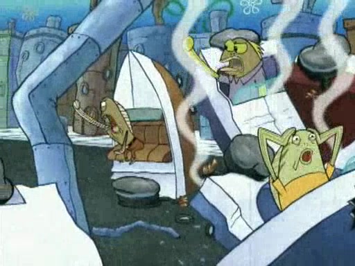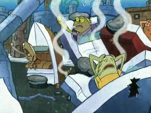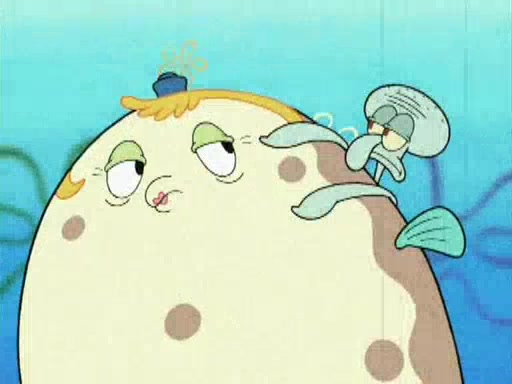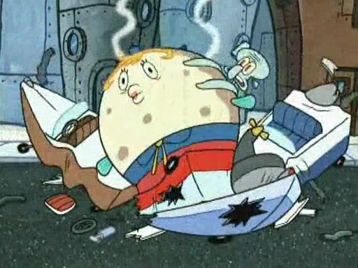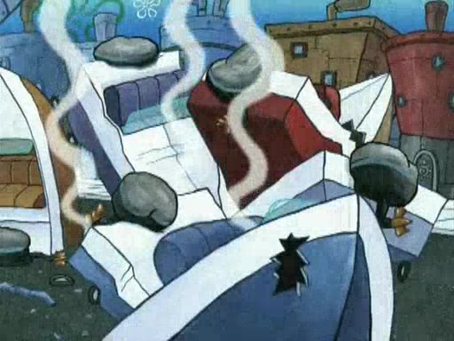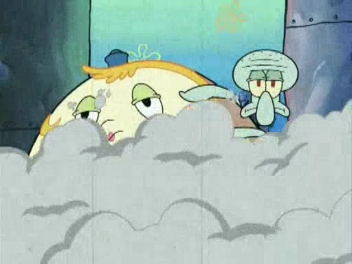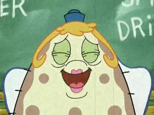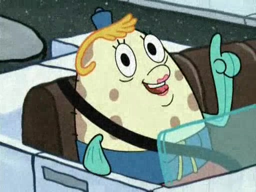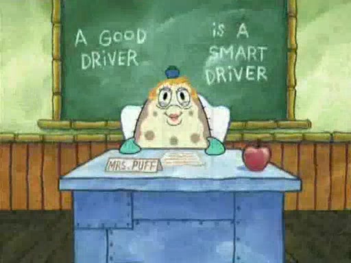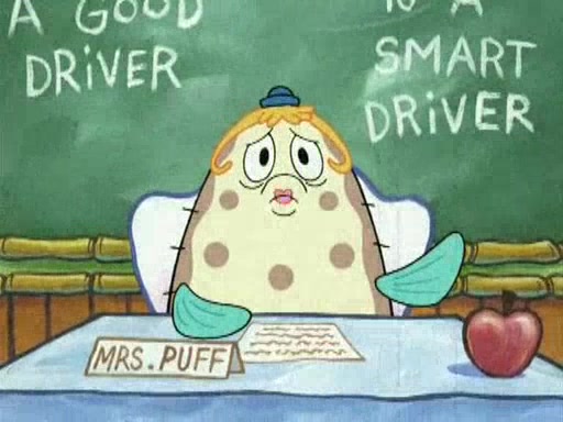 Then you see Mrs. Puff in Squidward's boat mobile talking about not drinking or eating while driving. Squidward is driving well, as usual. Mrs. Puff explains how Squidward's eyes are locked firmly on the road. Then SpongeBob is shown swerving while eating a hamburger and reading a magazine. When some fish are behind him he turns around and says: "Hi there!", causing them to crash. Eventually there is a huge stockpile of cars and the owners are furious. SpongeBob still speeds past, runs over a puddle and slides around saying: "Wheeeeeee!." SpongeBob then says hi to Mrs. Puff and Squidward when SpongeBob's boat mobile slips on a mini pebble, strangely making his boat mobile act as a ramp in which Squidward's boat mobile travel over. They fly into the big stockpile of all the cars and it makes a huge crash. Mrs. Puff blows up very fat and SpongeBob drives past saying: "Looks like you guys forgot your Boat Smarts!," he smiles and drives off, and Mrs. Puff and Squidward are not amused, making dust and the low quality video tape recorder stops with Mrs. Puff saying: "Never mind."