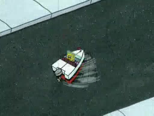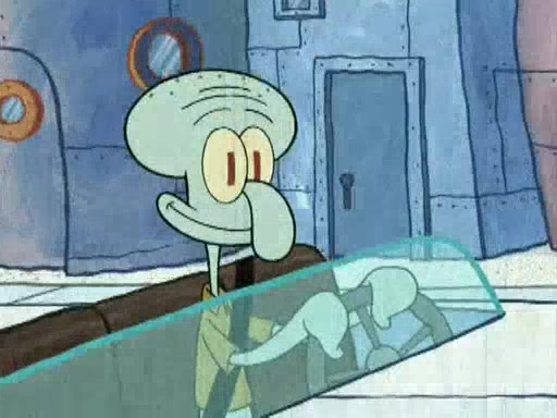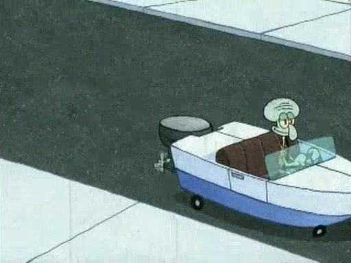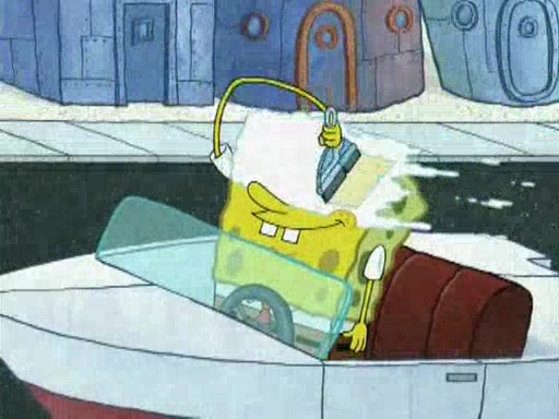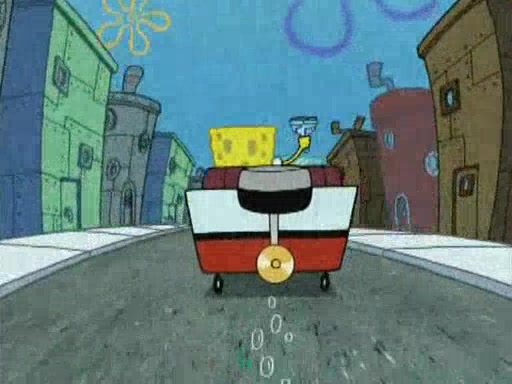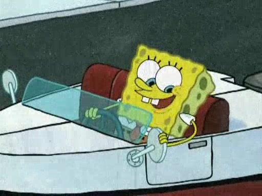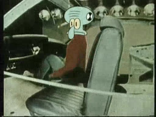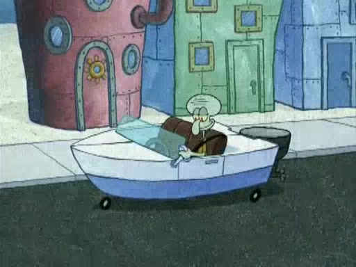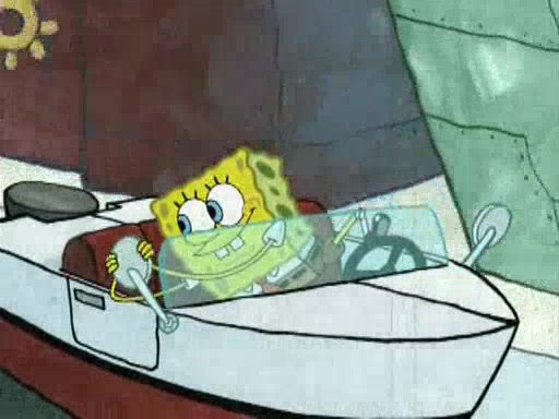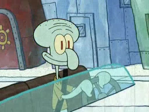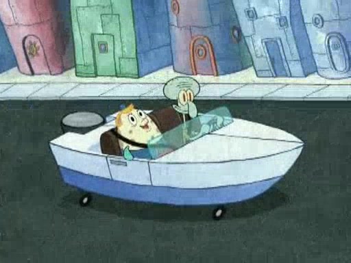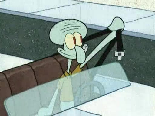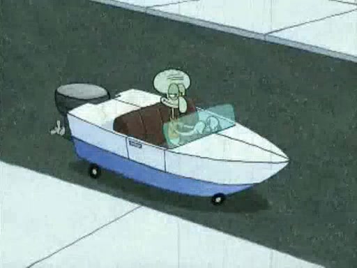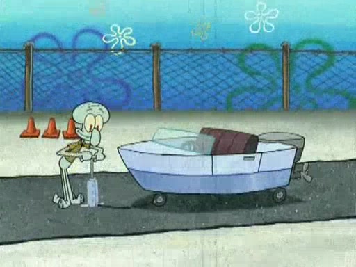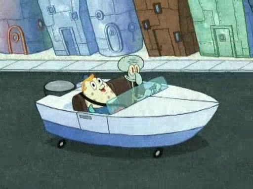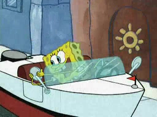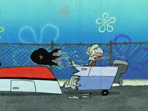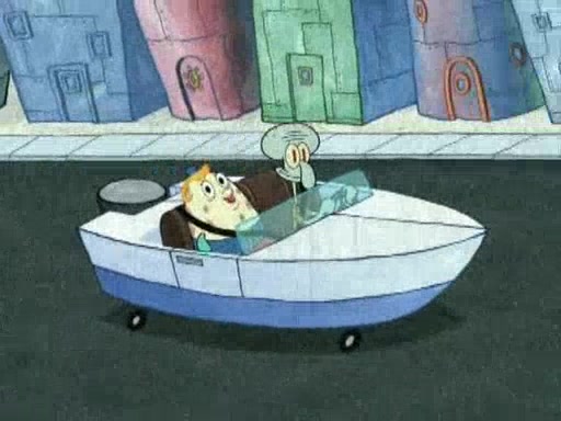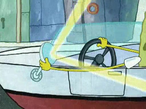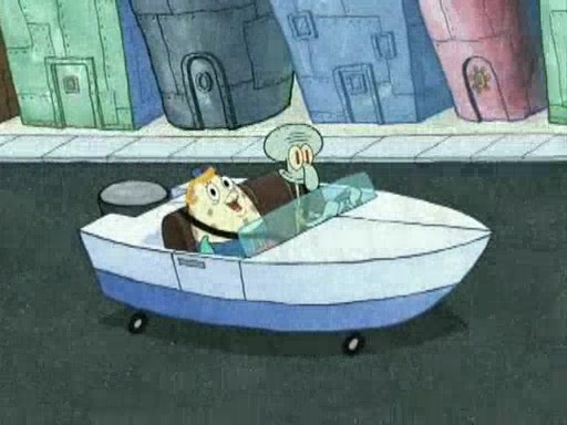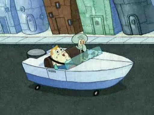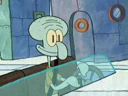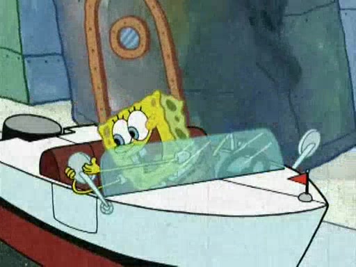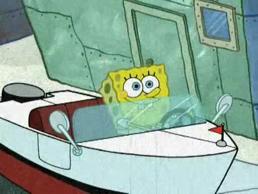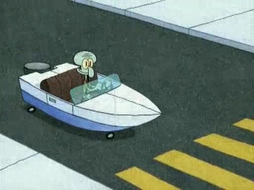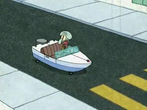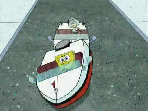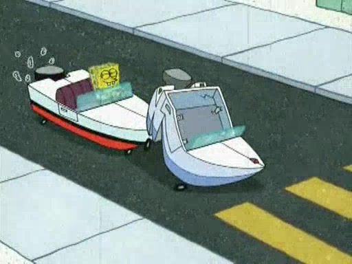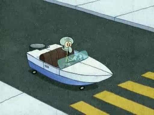 In the next scene, it shows Squidward adjusting his mirrors before he begins to start the boat mobile. Squidward starts the boat and begins to drive. SpongeBob adjusts his mirror dangerously while turning the steering wheel with one leg. He hits many fish, although he does not know because he is focusing on the mirror. He then swerves right in front of Squidward. SpongeBob adjusts the other mirror and hits Squidward with a beam of light and he is almost blinded until he puts on sunglasses. But Squidward didn't see a wall and crashes into it. It shows a crash dummy, although instead of the head it shows Squidward's.