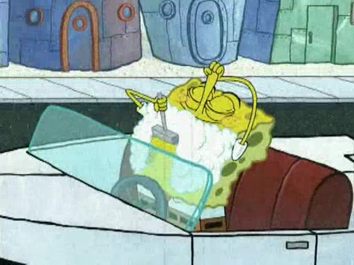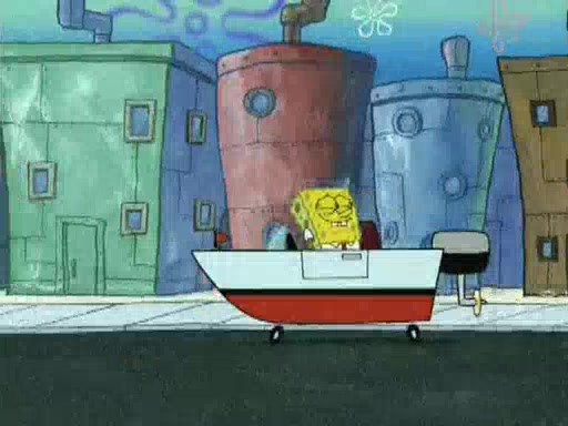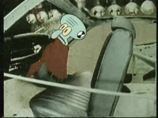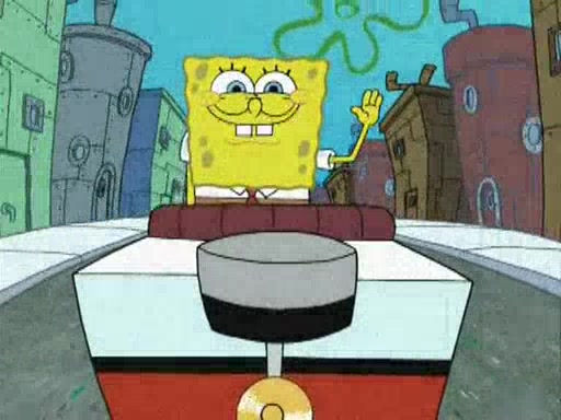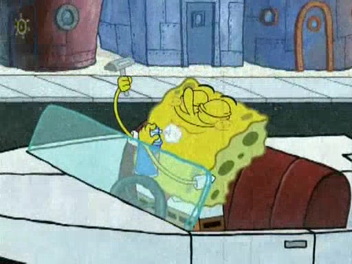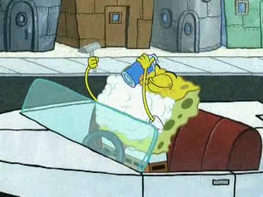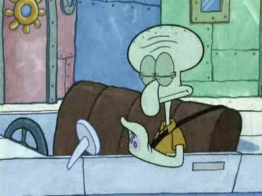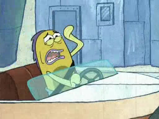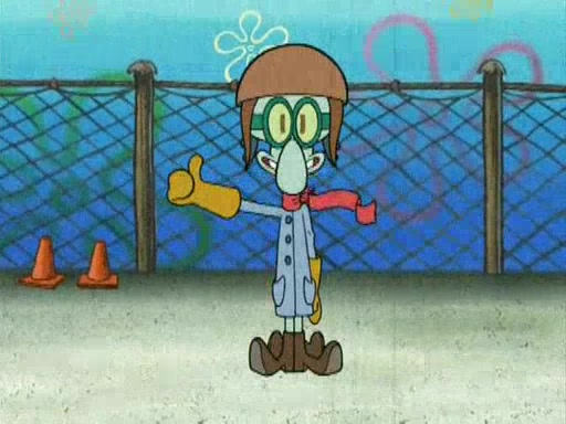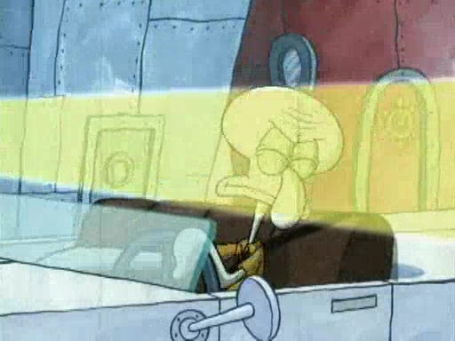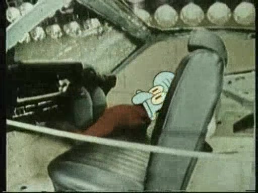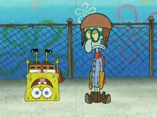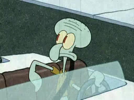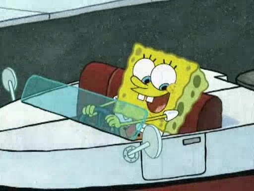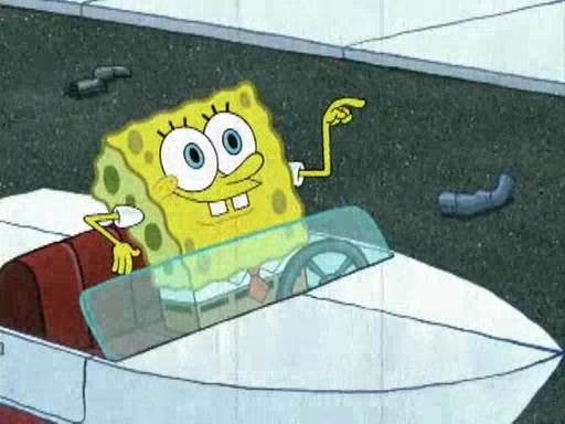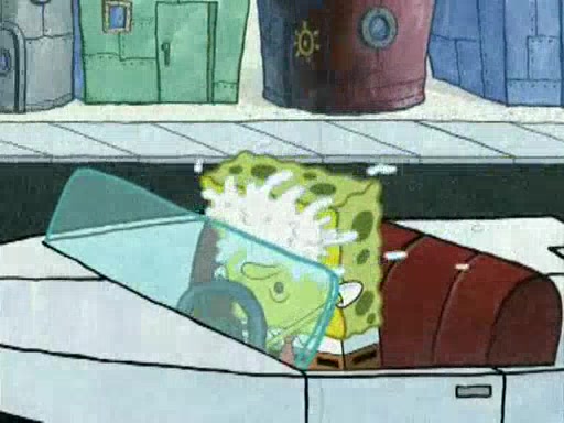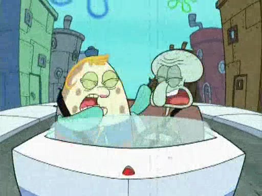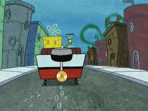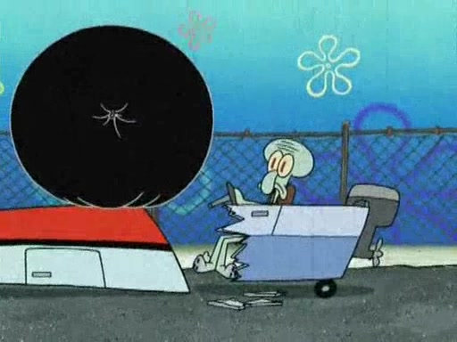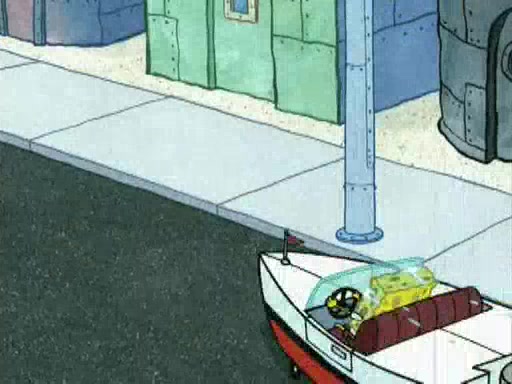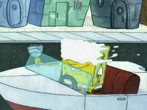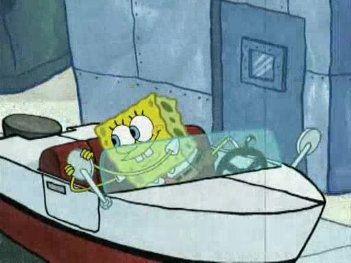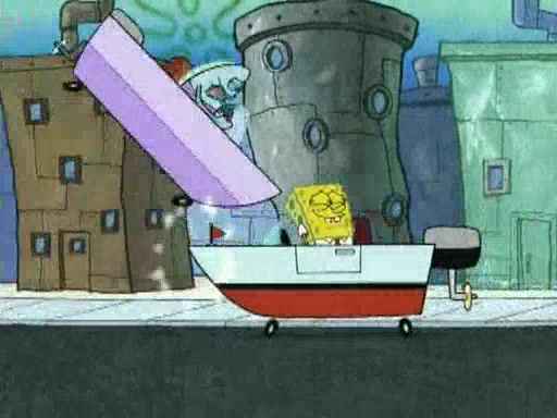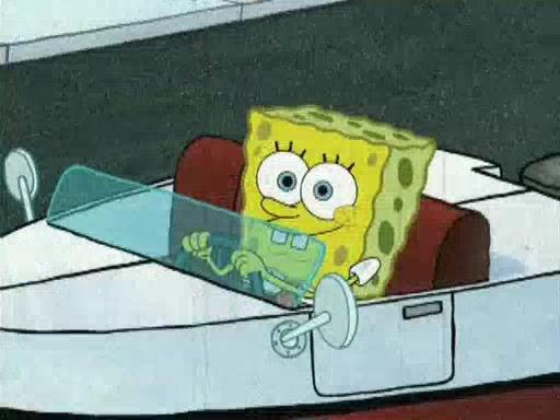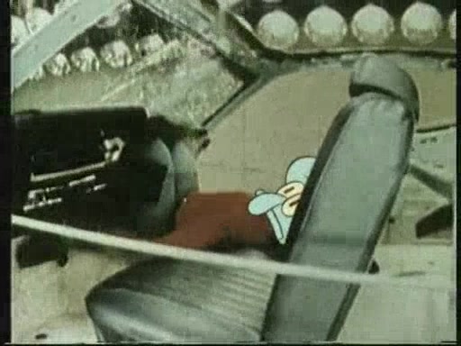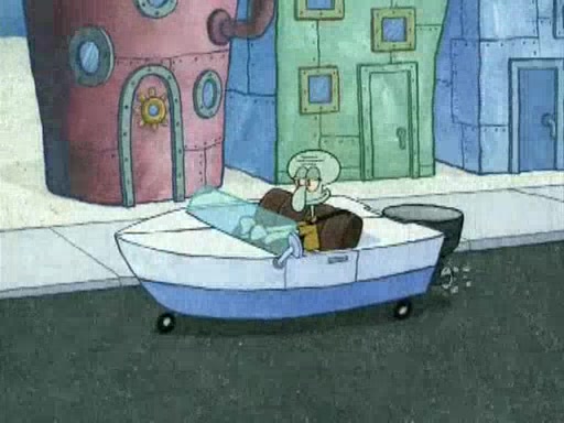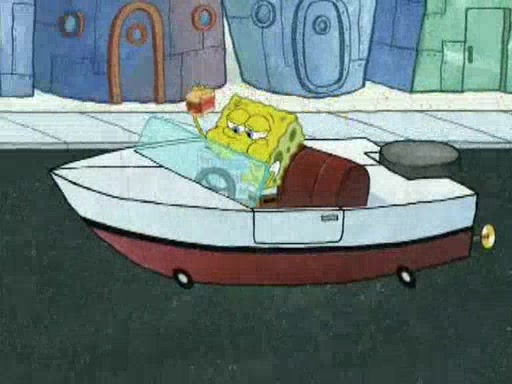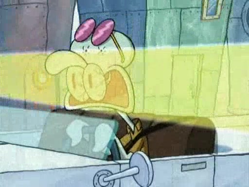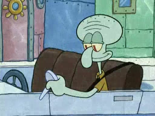 In the next scene, it shows Squidward adjusting his mirrors before he begins to start the boat mobile. Squidward starts the boat and begins to drive. SpongeBob adjusts his mirror dangerously while turning the steering wheel with one leg. He hits many fish, although he does not know because he is focusing on the mirror. He then swerves right in front of Squidward. SpongeBob adjusts the other mirror and hits Squidward with a beam of light and he is almost blinded until he puts on sunglasses. But Squidward didn't see a wall and crashes into it. It shows a crash dummy, although instead of the head it shows Squidward's.