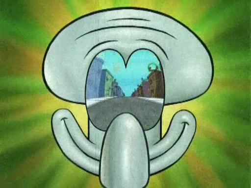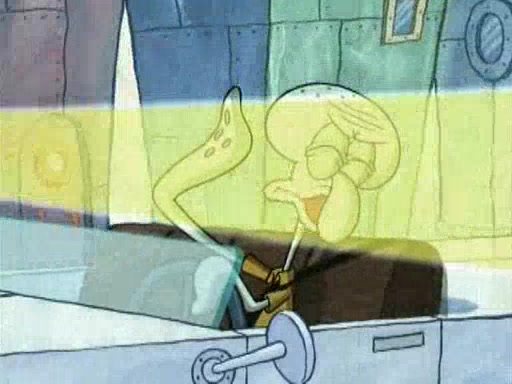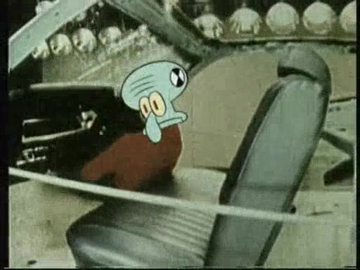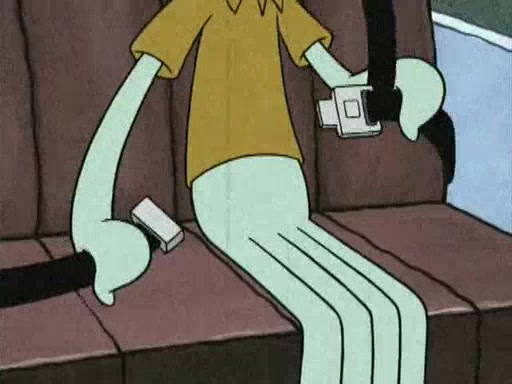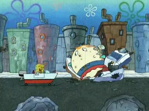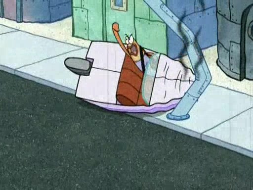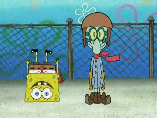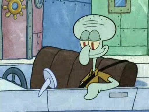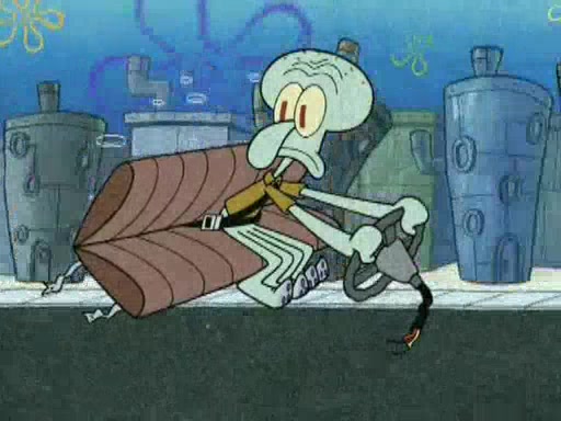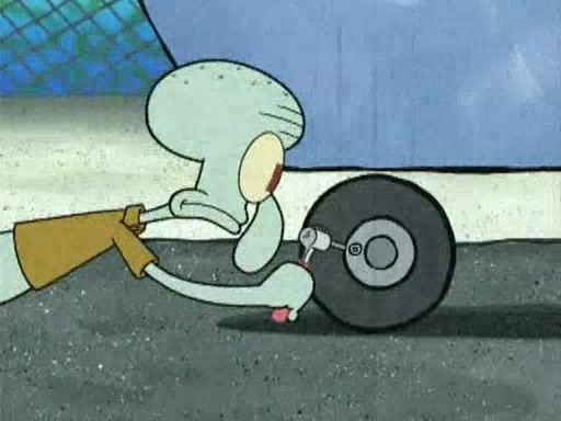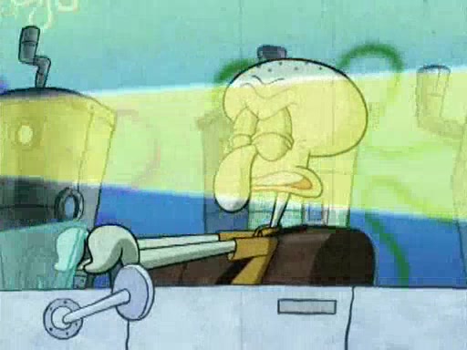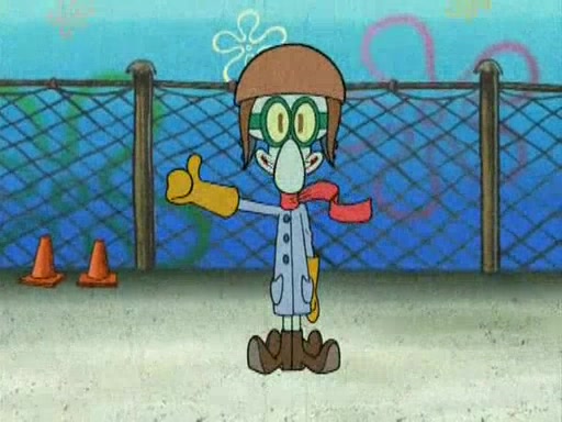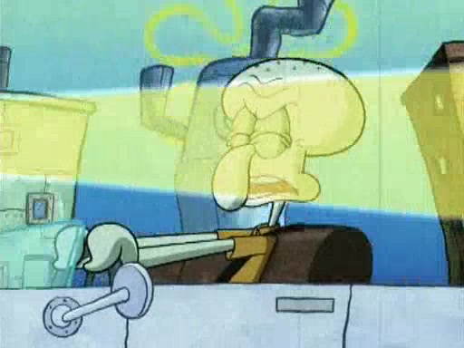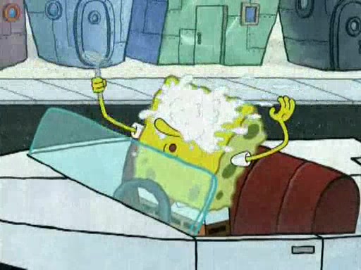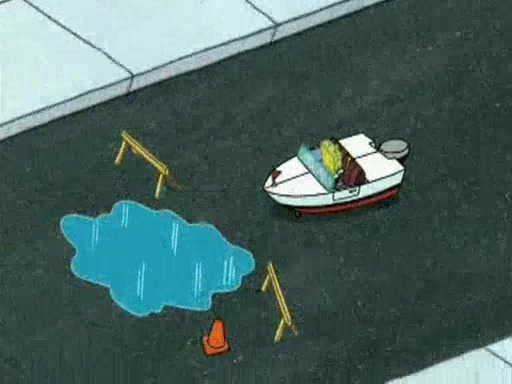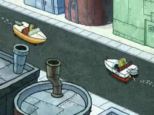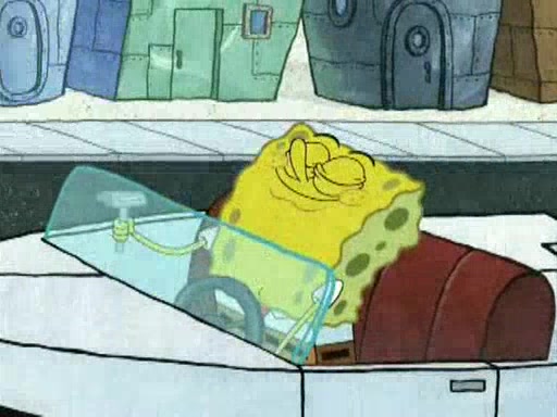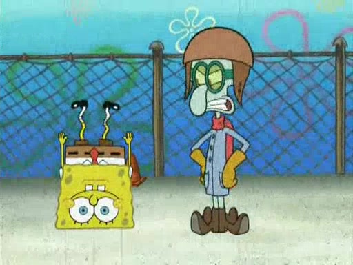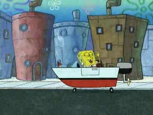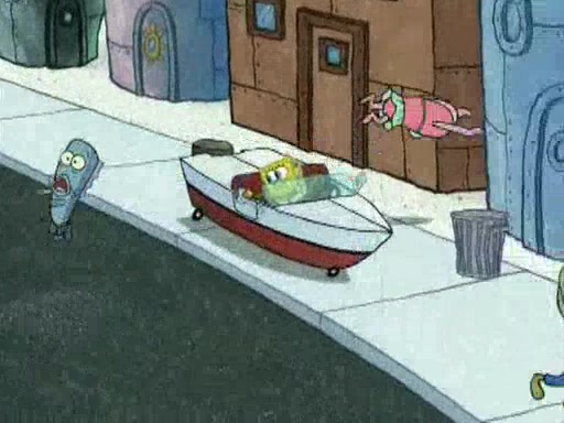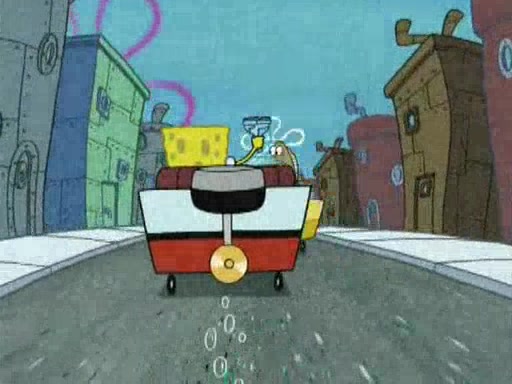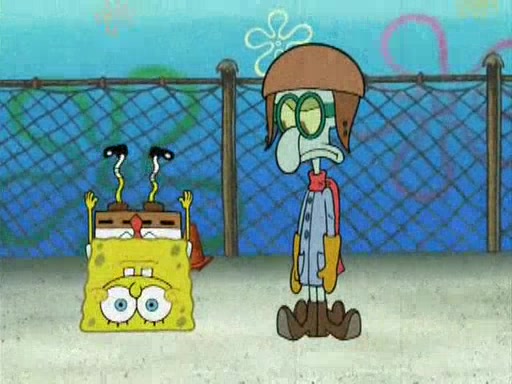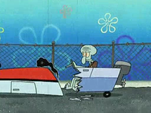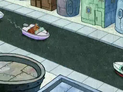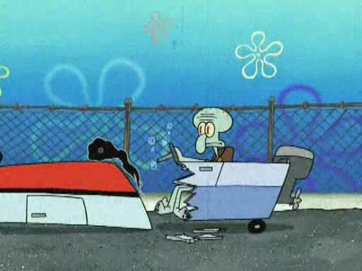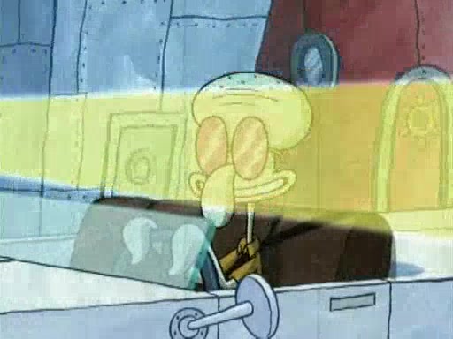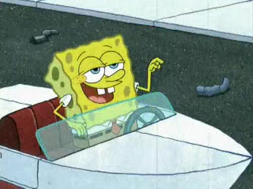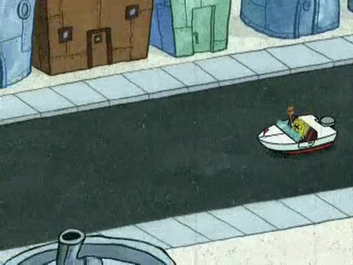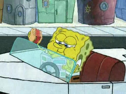 In the next scene, it shows Squidward adjusting his mirrors before he begins to start the boat mobile. Squidward starts the boat and begins to drive. SpongeBob adjusts his mirror dangerously while turning the steering wheel with one leg. He hits many fish, although he does not know because he is focusing on the mirror. He then swerves right in front of Squidward. SpongeBob adjusts the other mirror and hits Squidward with a beam of light and he is almost blinded until he puts on sunglasses. But Squidward didn't see a wall and crashes into it. It shows a crash dummy, although instead of the head it shows Squidward's.