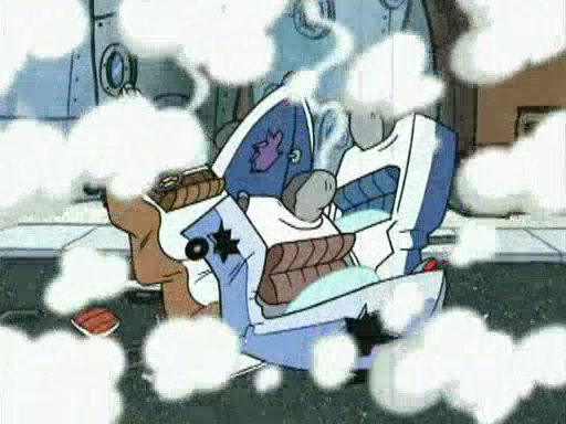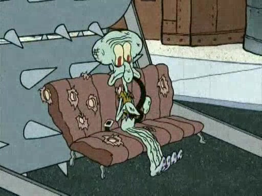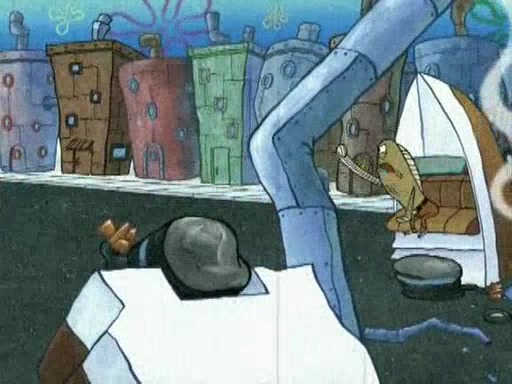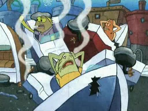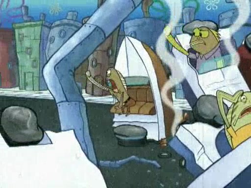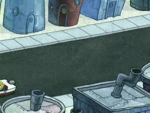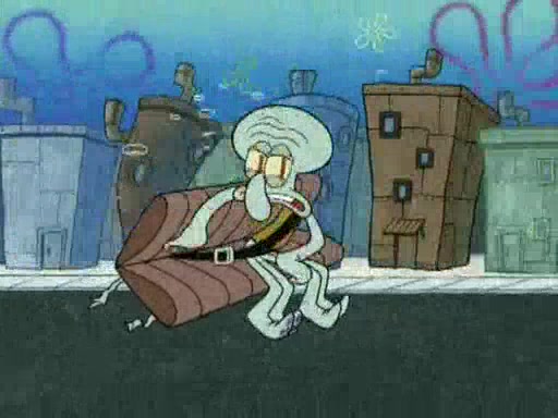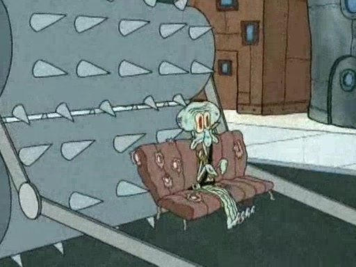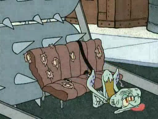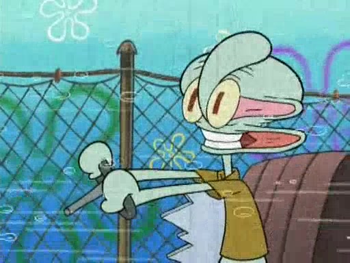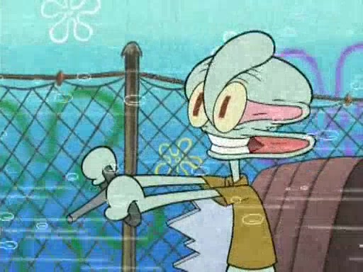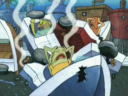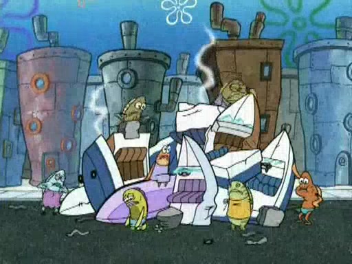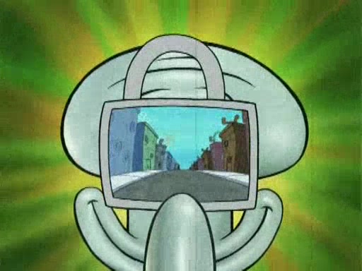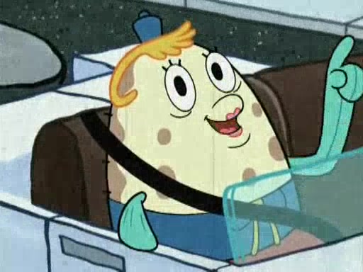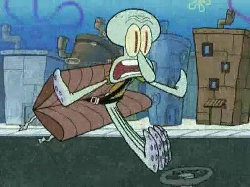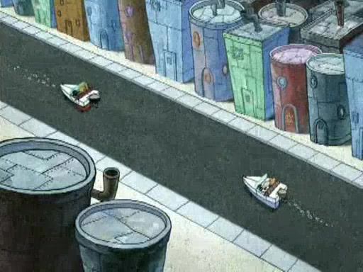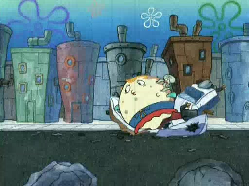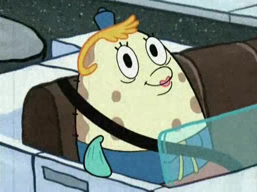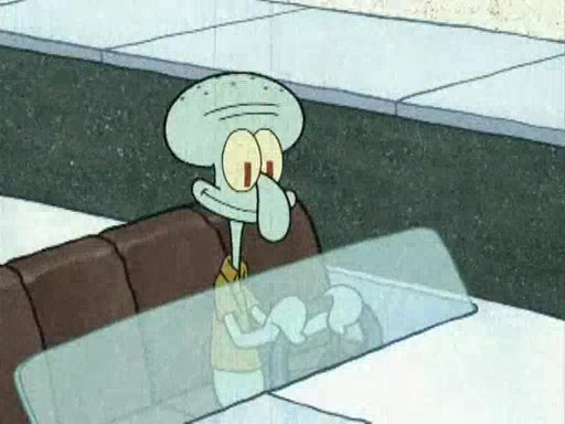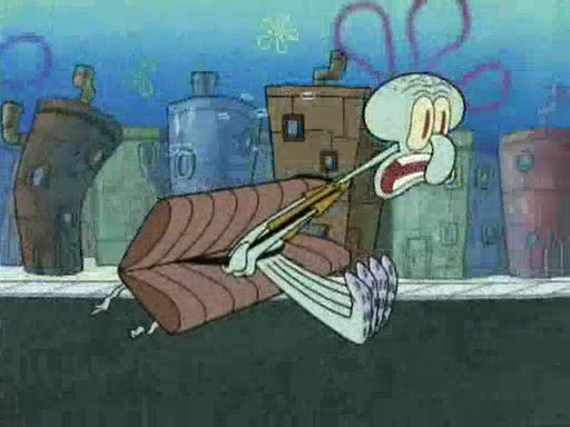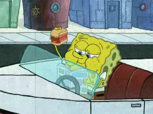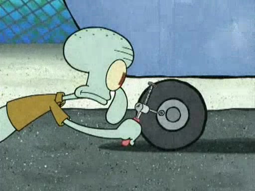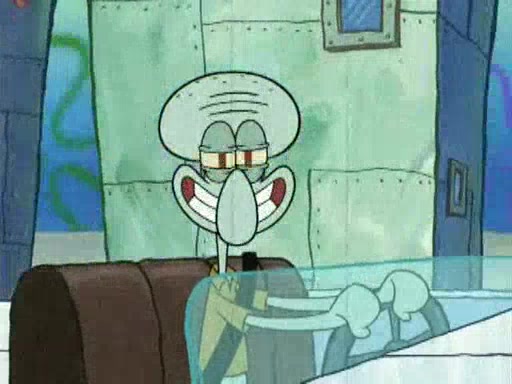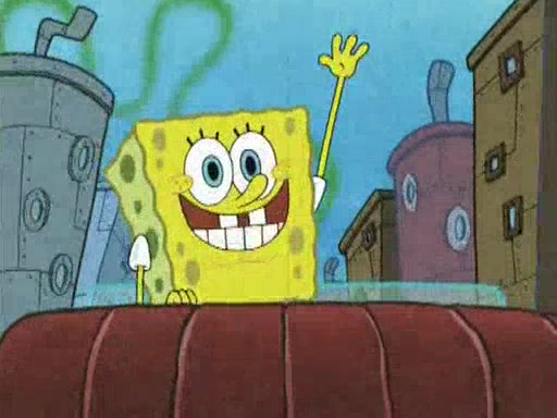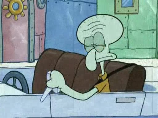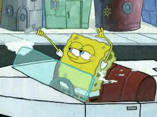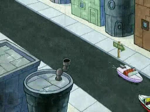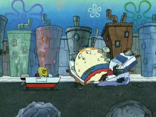 In the next scene, it shows Squidward adjusting his mirrors before he begins to start the boat mobile. Squidward starts the boat and begins to drive. SpongeBob adjusts his mirror dangerously while turning the steering wheel with one leg. He hits many fish, although he does not know because he is focusing on the mirror. He then swerves right in front of Squidward. SpongeBob adjusts the other mirror and hits Squidward with a beam of light and he is almost blinded until he puts on sunglasses. But Squidward didn't see a wall and crashes into it. It shows a crash dummy, although instead of the head it shows Squidward's.