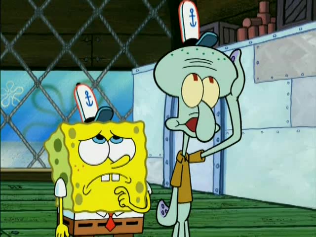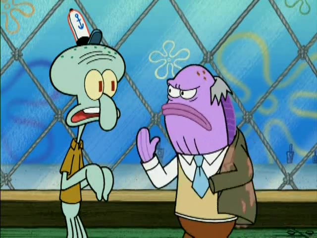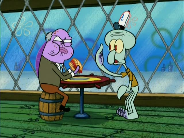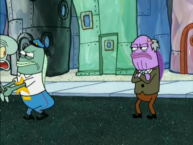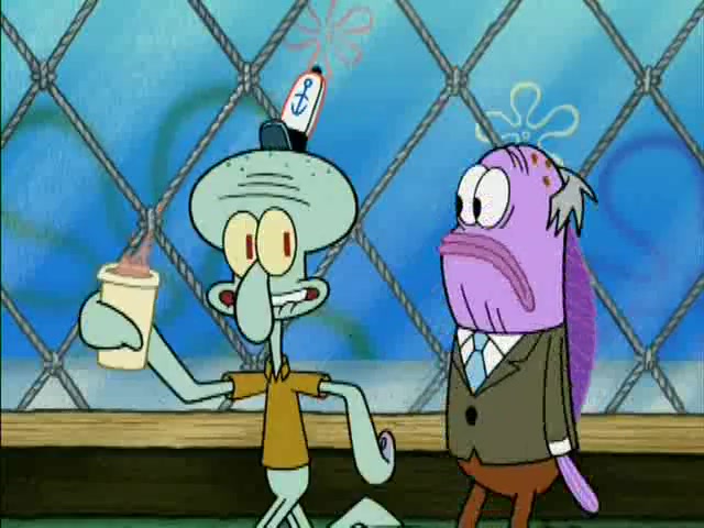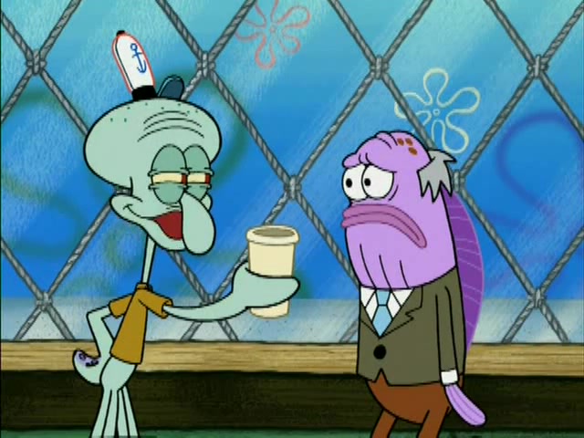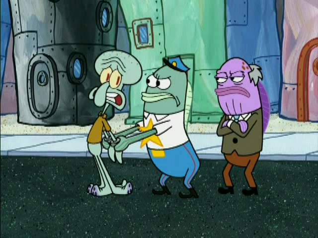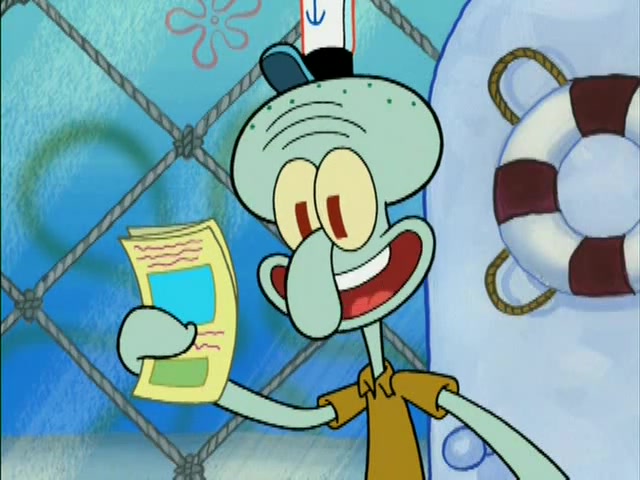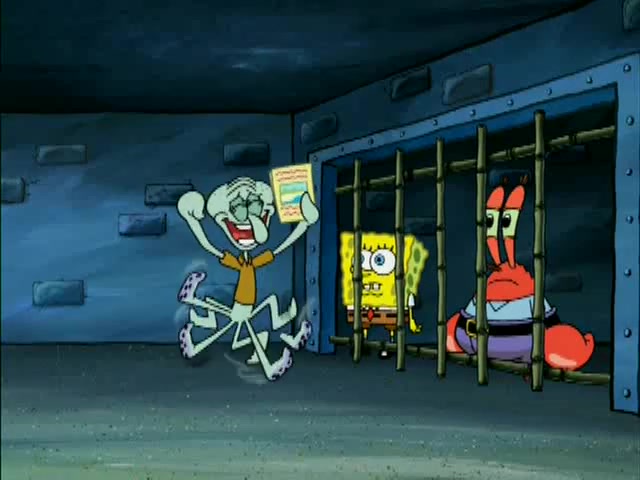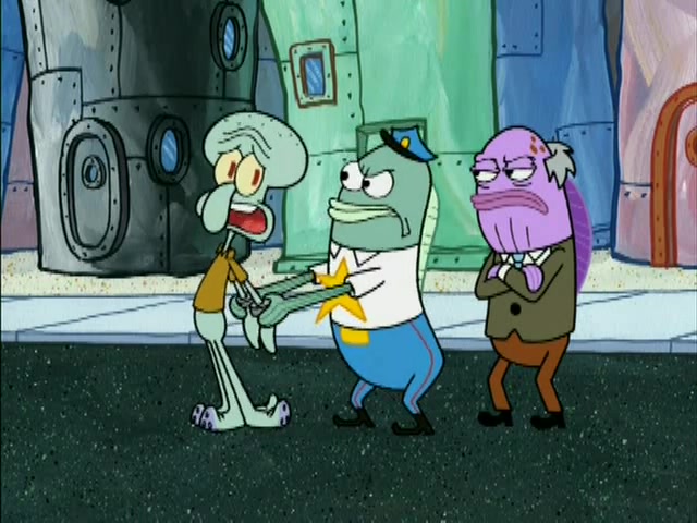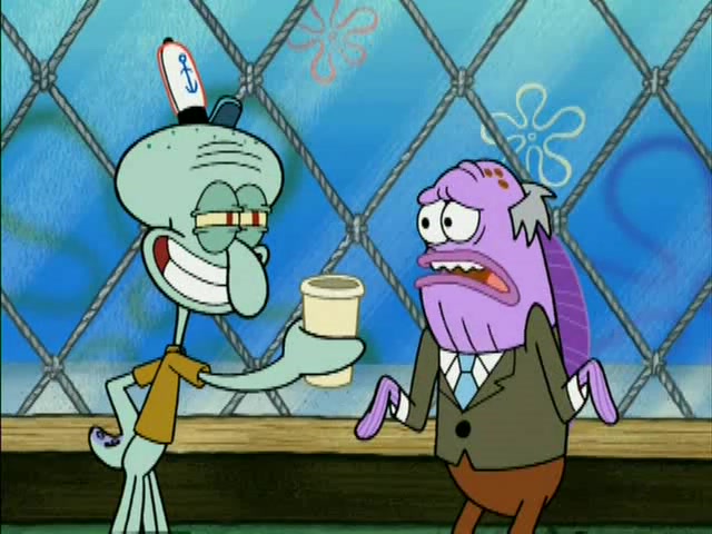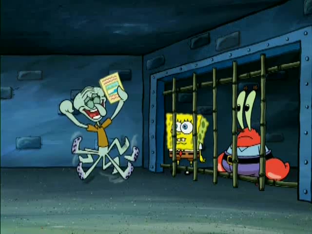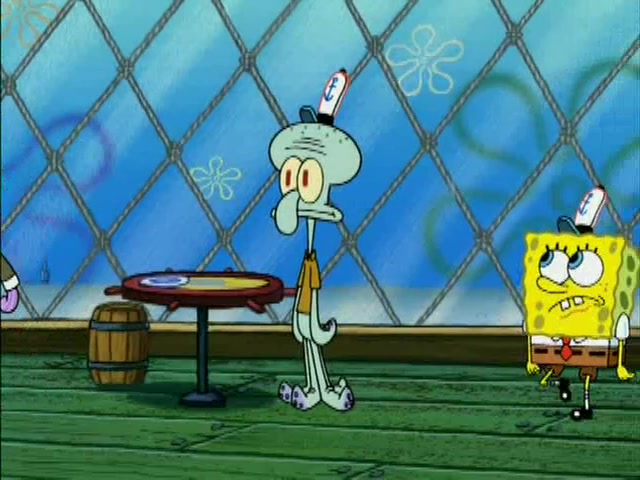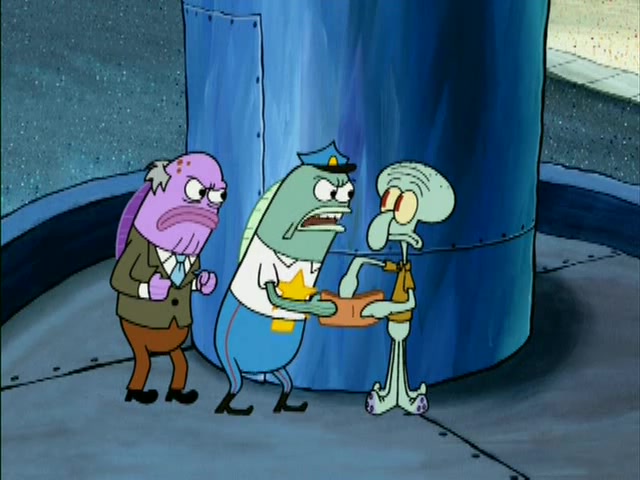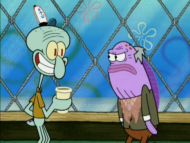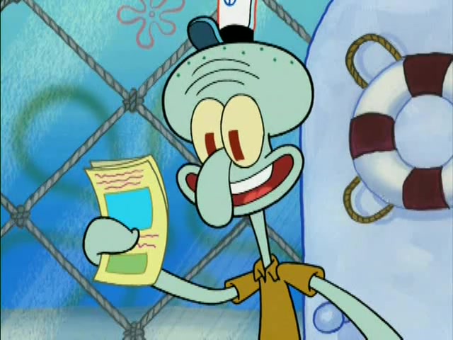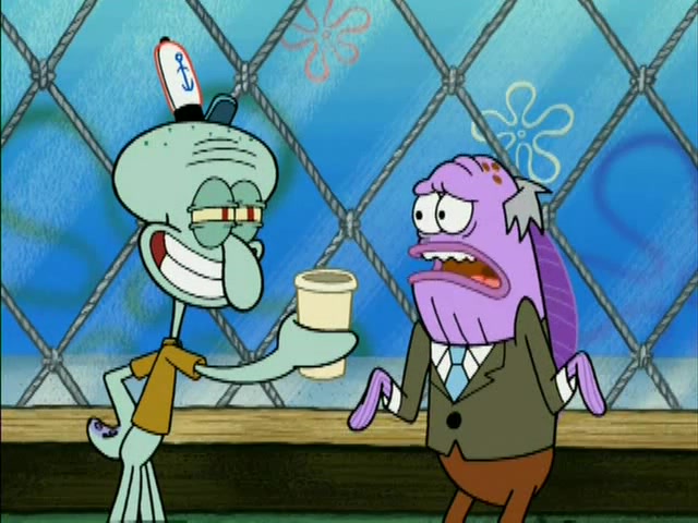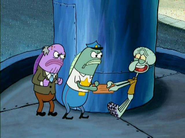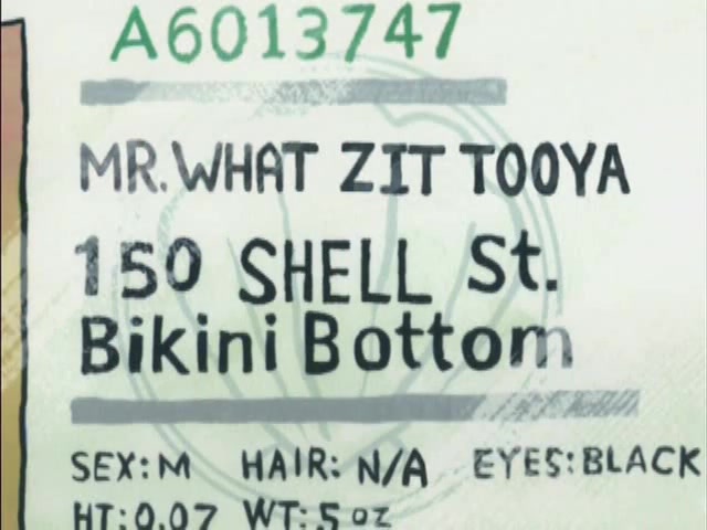 Mr. Krabs puts SpongeBob against Squidward in a work contest, telling them there will be a prize. He shows them a brochure for a cruise vacation, leading Squidward to believe the vacation is the prize. They have to name all the customers in the Krusty Krab. Somehow, SpongeBob knows everyone's name and Squidward is confused by this, so he asks SpongeBob why this is so. SpongeBob then he reveals he has a book with everybody's name in it. Squidward then swipes the book and says the names in the book. He told Mr. Krabs that he has more points than SpongeBob. Mr. Krabs didn't tally the scores but, he claims that they both were neck and neck to the winner and that they're was one costumer who's name was a mystery and whoever gets his name wins the competition. Squidward and SpongeBob were in a sudden death to know the last customer's name. After a struggle or trying to remember, Squidward then gets SpongeBob out of the way and asks the fish his name. He responds "What's it to ya". After three attempts to find out his name, Squidward snatched his wallet and ran. He attracted a cop who chased him because he ran a stop sign, and more so after he realizes he stole a wallet too. Squidward then makes it on top of the roof and after a tug-of-war for the wallet, Squidward manages to get his driver's license, which the name reads "Mr. What Zit Too Ya." He then is arrested. In jail, he gets the prize from Mr. Krabs and it turns out the prize is just a brochure for the trip. Squidward believes he is safe from SpongeBob and Patrick, but it turns out Patrick is his cellmate. He offers to play Parcheesi with Squidward, but Squidward just falls apart (literally).
