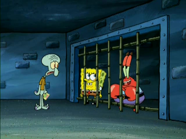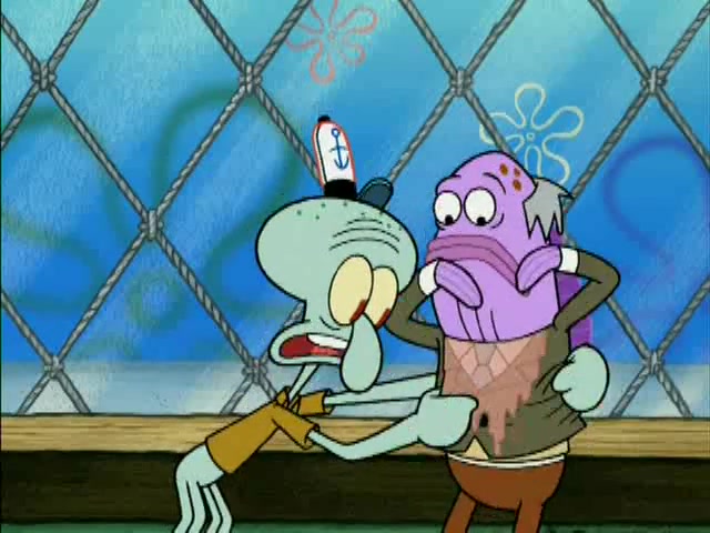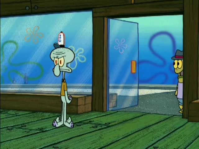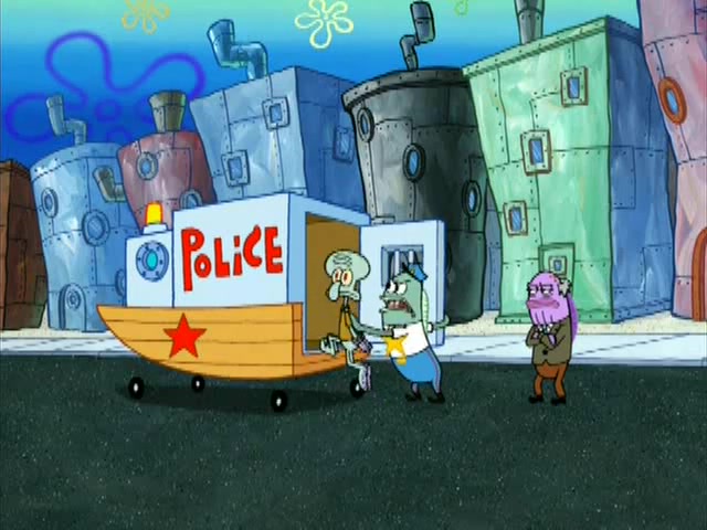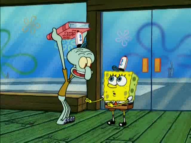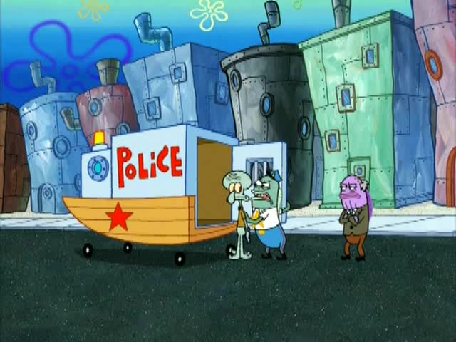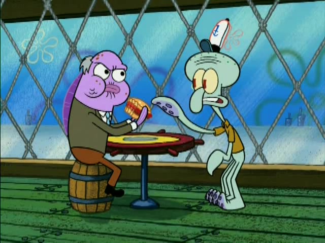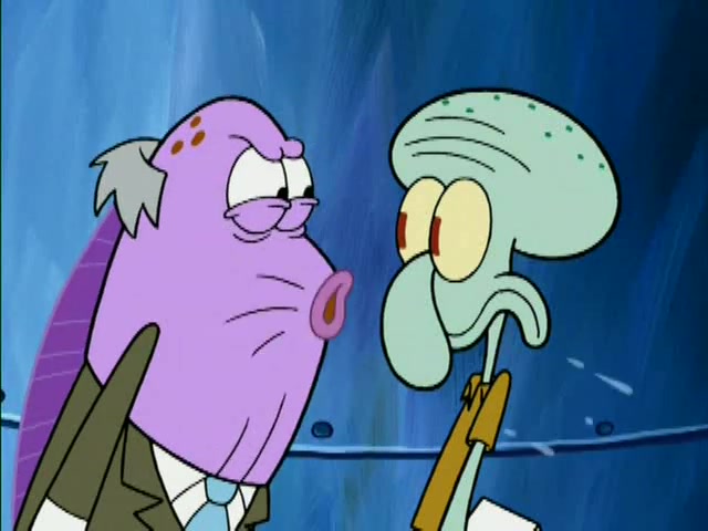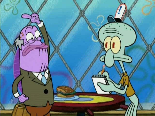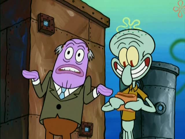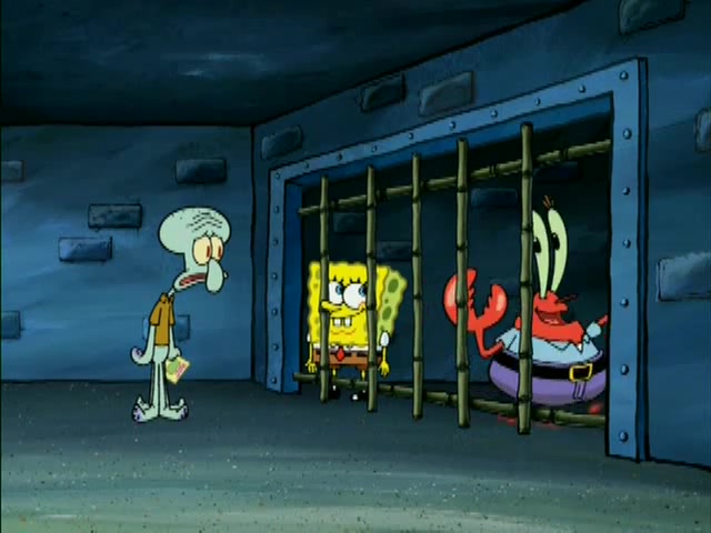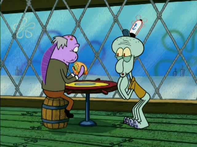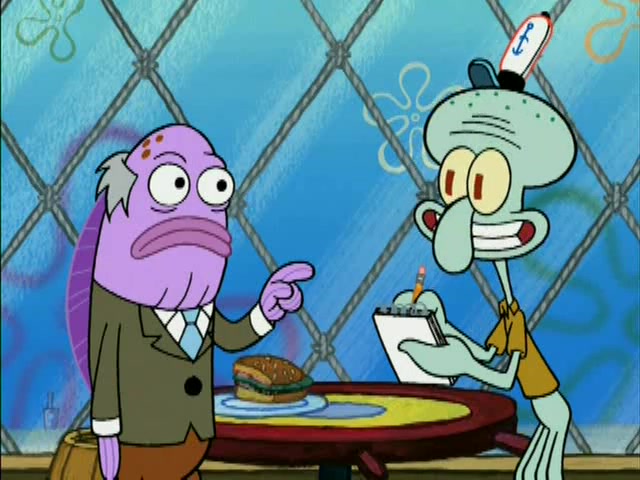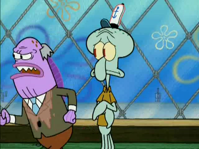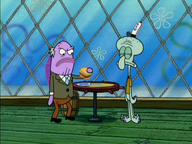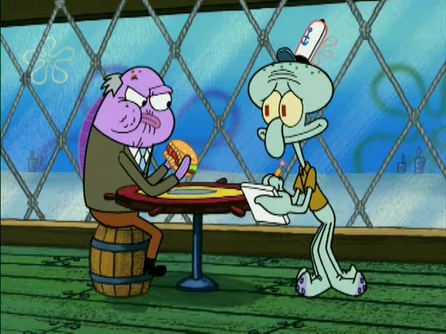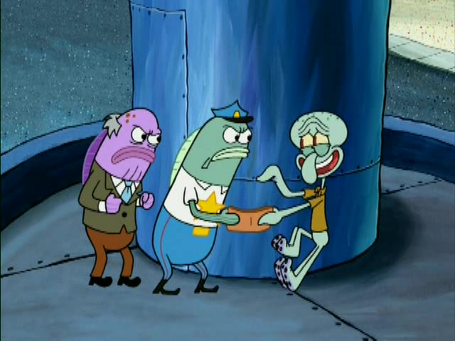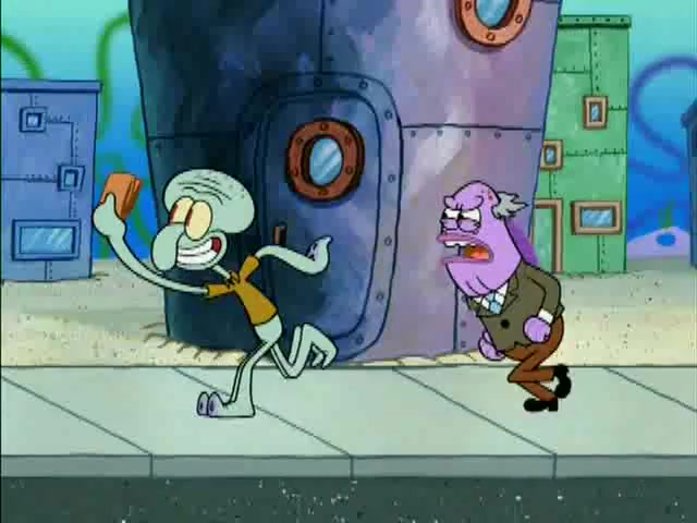 Mr. Krabs puts SpongeBob against Squidward in a work contest, telling them there will be a prize. He shows them a brochure for a cruise vacation, leading Squidward to believe the vacation is the prize. They have to name all the customers in the Krusty Krab. Somehow, SpongeBob knows everyone's name and Squidward is confused by this, so he asks SpongeBob why this is so. SpongeBob then he reveals he has a book with everybody's name in it. Squidward then swipes the book and says the names in the book. He told Mr. Krabs that he has more points than SpongeBob. Mr. Krabs didn't tally the scores but, he claims that they both were neck and neck to the winner and that they're was one costumer who's name was a mystery and whoever gets his name wins the competition. Squidward and SpongeBob were in a sudden death to know the last customer's name. After a struggle or trying to remember, Squidward then gets SpongeBob out of the way and asks the fish his name. He responds "What's it to ya". After three attempts to find out his name, Squidward snatched his wallet and ran. He attracted a cop who chased him because he ran a stop sign, and more so after he realizes he stole a wallet too. Squidward then makes it on top of the roof and after a tug-of-war for the wallet, Squidward manages to get his driver's license, which the name reads "Mr. What Zit Too Ya." He then is arrested. In jail, he gets the prize from Mr. Krabs and it turns out the prize is just a brochure for the trip. Squidward believes he is safe from SpongeBob and Patrick, but it turns out Patrick is his cellmate. He offers to play Parcheesi with Squidward, but Squidward just falls apart (literally).