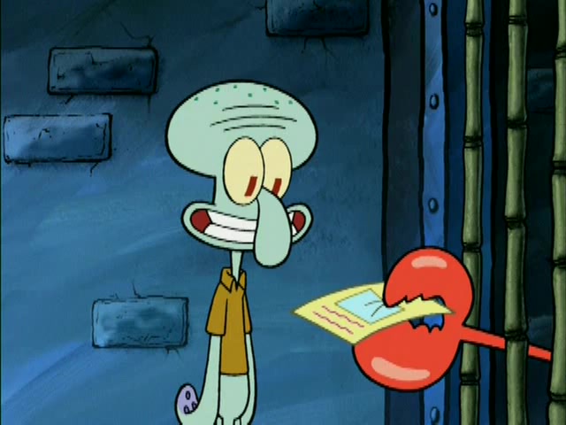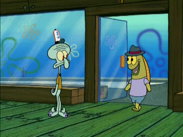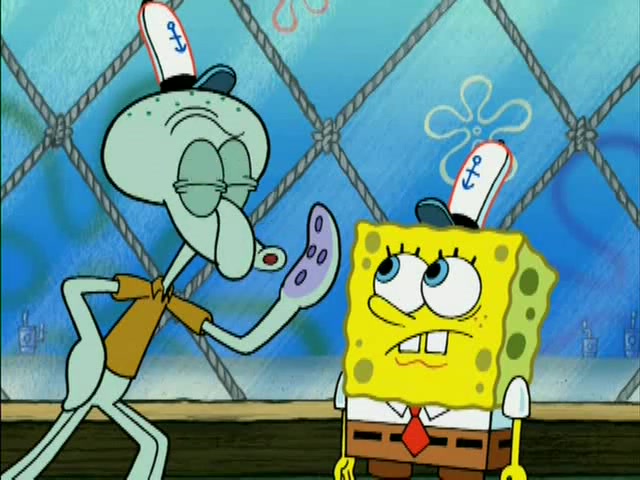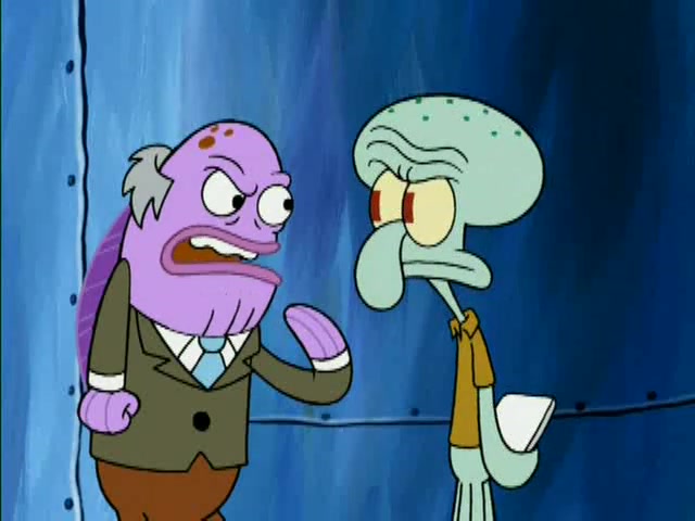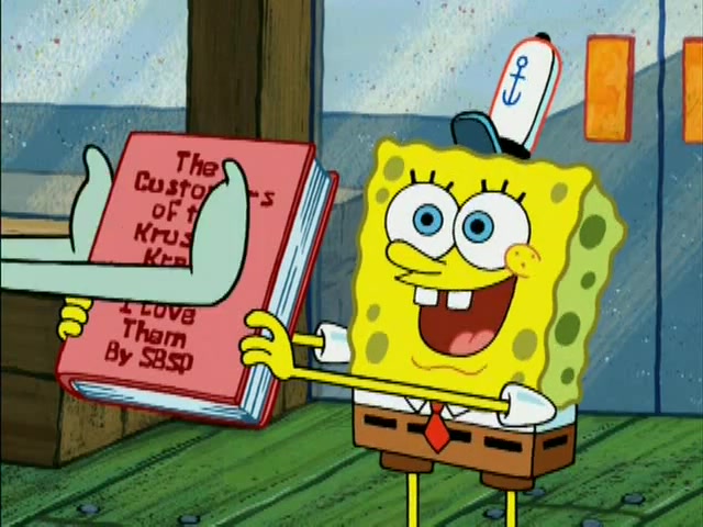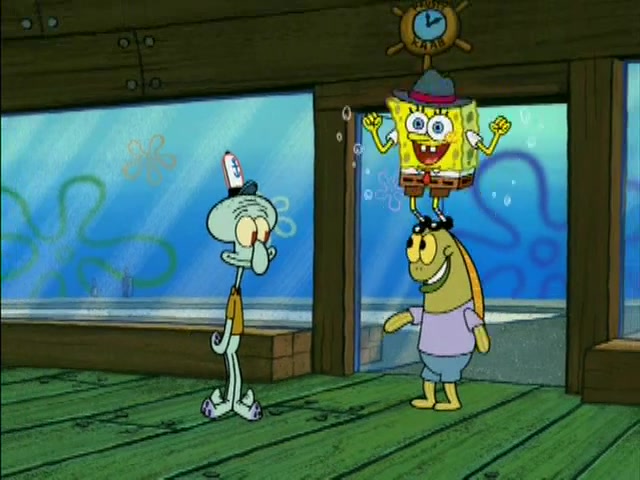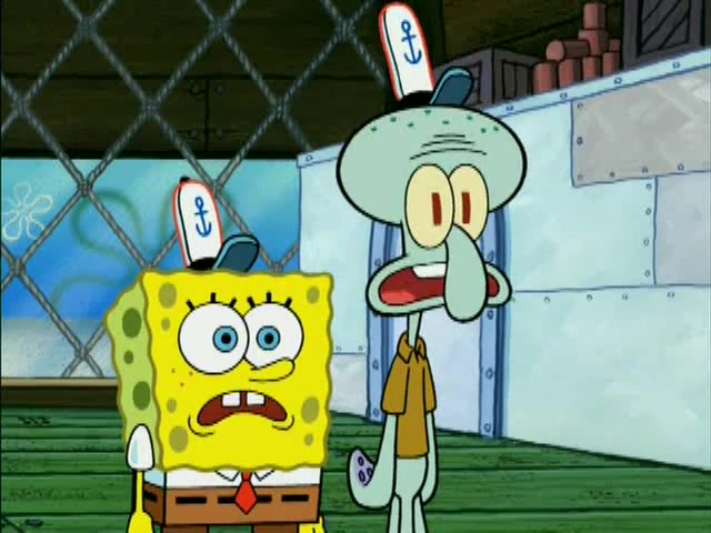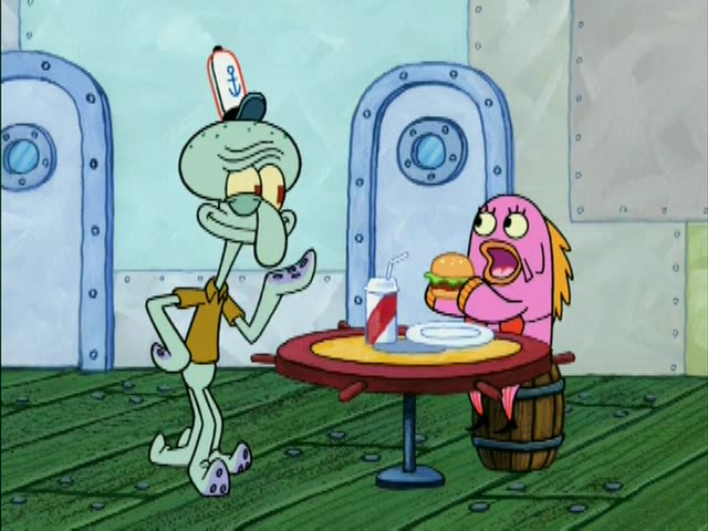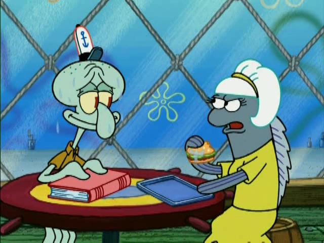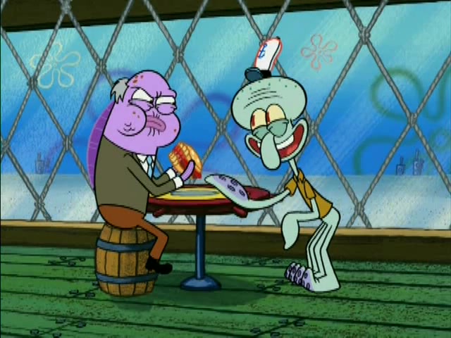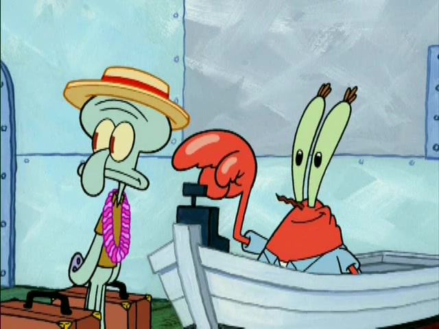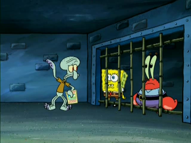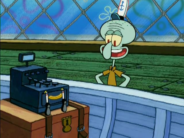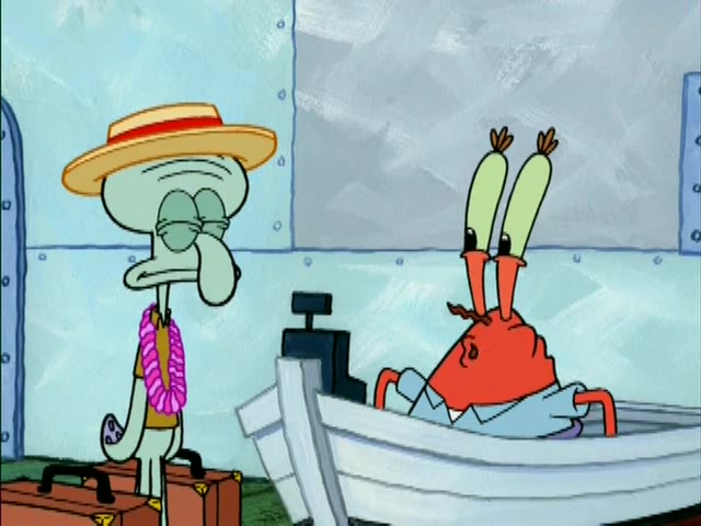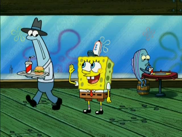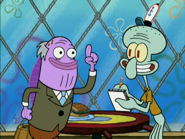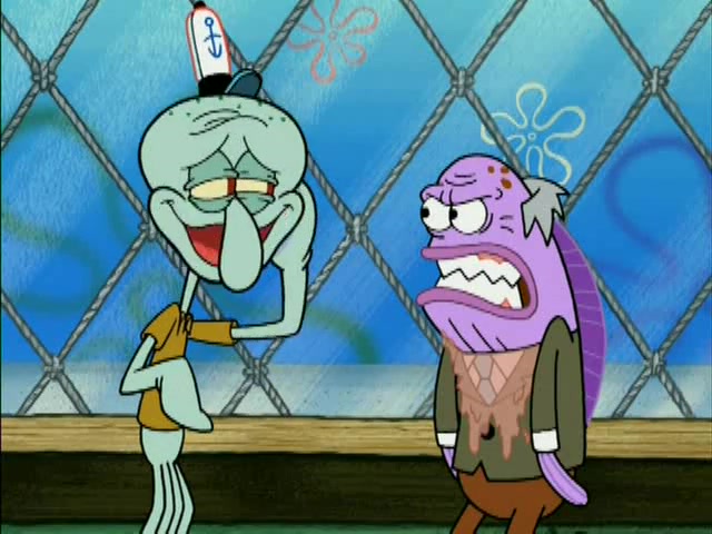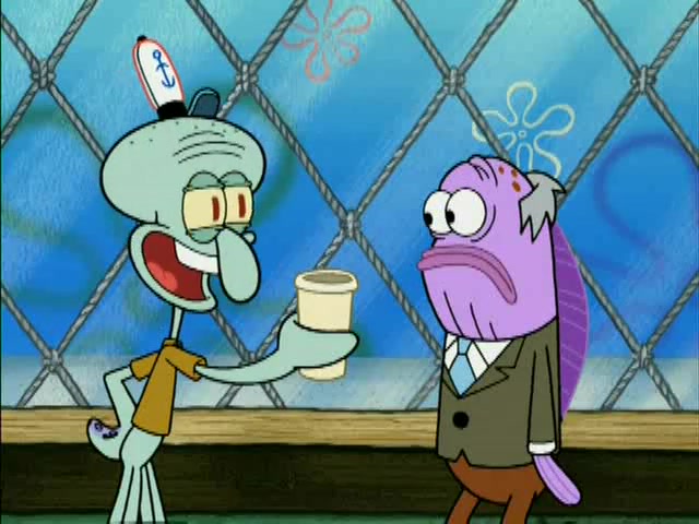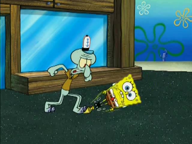 Mr. Krabs puts SpongeBob against Squidward in a work contest, telling them there will be a prize. He shows them a brochure for a cruise vacation, leading Squidward to believe the vacation is the prize. They have to name all the customers in the Krusty Krab. Somehow, SpongeBob knows everyone's name and Squidward is confused by this, so he asks SpongeBob why this is so. SpongeBob then he reveals he has a book with everybody's name in it. Squidward then swipes the book and says the names in the book. He told Mr. Krabs that he has more points than SpongeBob. Mr. Krabs didn't tally the scores but, he claims that they both were neck and neck to the winner and that they're was one costumer who's name was a mystery and whoever gets his name wins the competition. Squidward and SpongeBob were in a sudden death to know the last customer's name. After a struggle or trying to remember, Squidward then gets SpongeBob out of the way and asks the fish his name. He responds "What's it to ya". After three attempts to find out his name, Squidward snatched his wallet and ran. He attracted a cop who chased him because he ran a stop sign, and more so after he realizes he stole a wallet too. Squidward then makes it on top of the roof and after a tug-of-war for the wallet, Squidward manages to get his driver's license, which the name reads "Mr. What Zit Too Ya." He then is arrested. In jail, he gets the prize from Mr. Krabs and it turns out the prize is just a brochure for the trip. Squidward believes he is safe from SpongeBob and Patrick, but it turns out Patrick is his cellmate. He offers to play Parcheesi with Squidward, but Squidward just falls apart (literally).