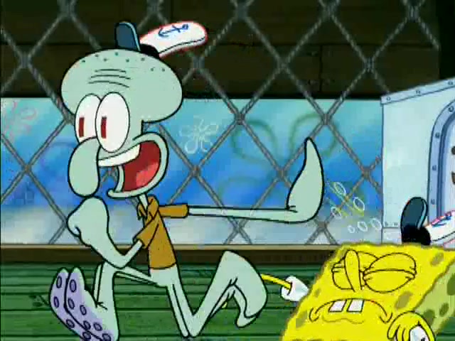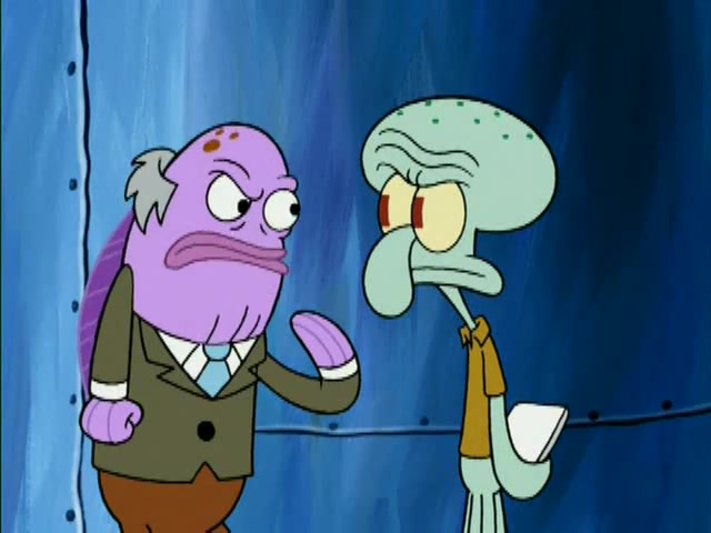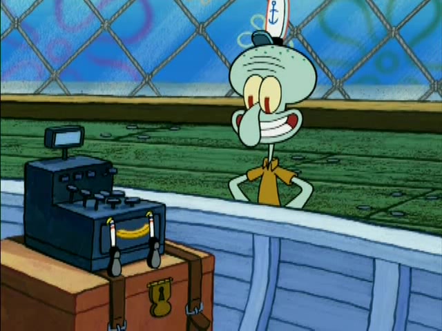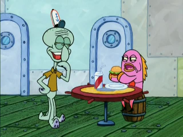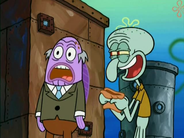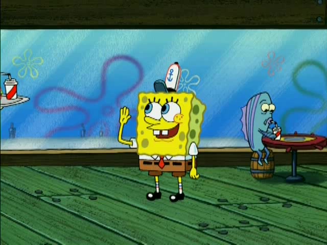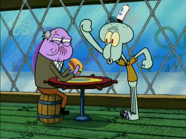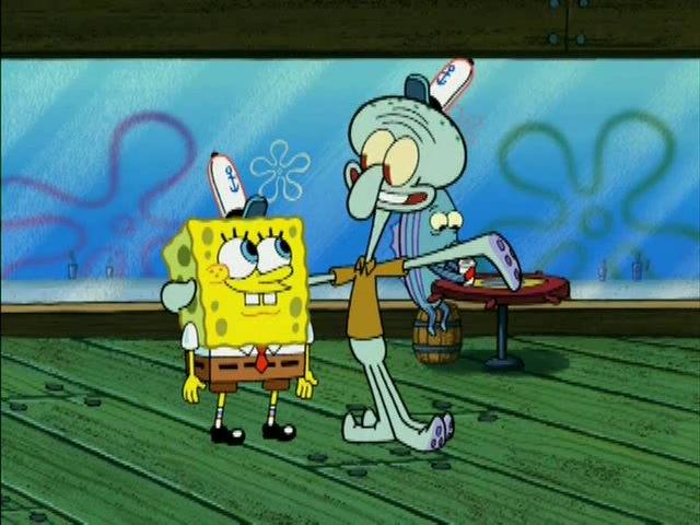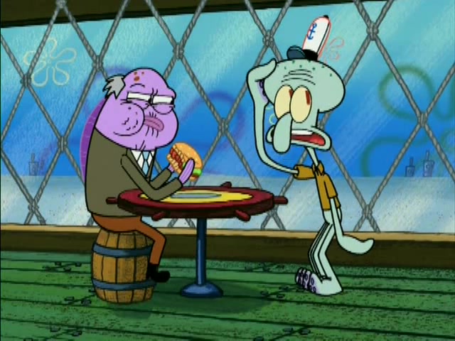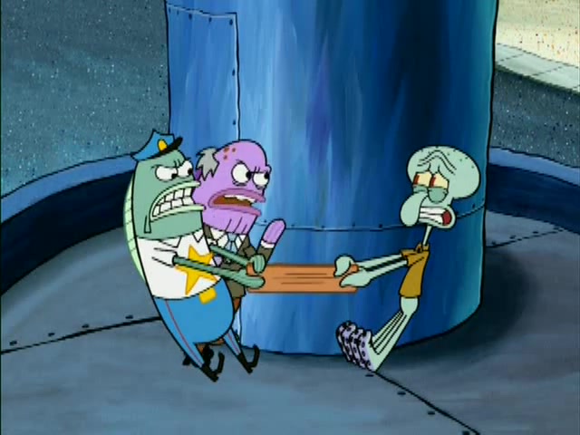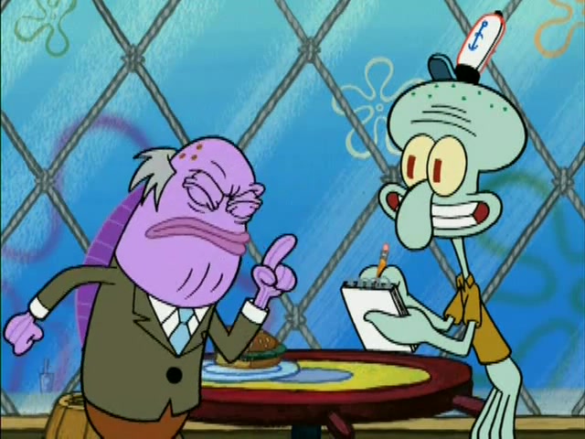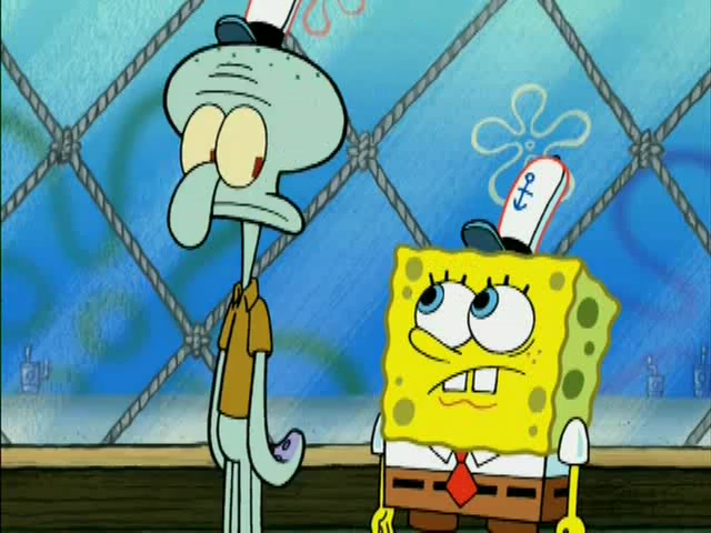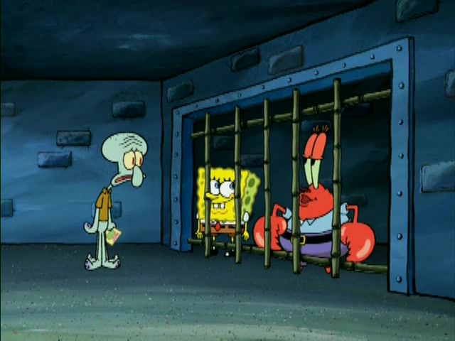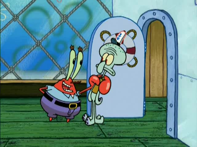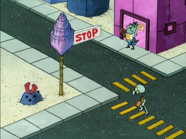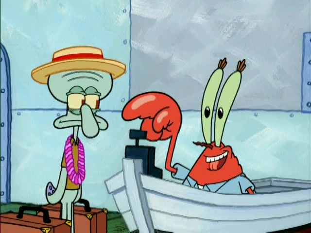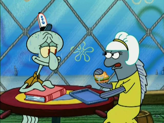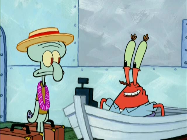 Mr. Krabs puts SpongeBob against Squidward in a work contest, telling them there will be a prize. He shows them a brochure for a cruise vacation, leading Squidward to believe the vacation is the prize. They have to name all the customers in the Krusty Krab. Somehow, SpongeBob knows everyone's name and Squidward is confused by this, so he asks SpongeBob why this is so. SpongeBob then he reveals he has a book with everybody's name in it. Squidward then swipes the book and says the names in the book. He told Mr. Krabs that he has more points than SpongeBob. Mr. Krabs didn't tally the scores but, he claims that they both were neck and neck to the winner and that they're was one costumer who's name was a mystery and whoever gets his name wins the competition. Squidward and SpongeBob were in a sudden death to know the last customer's name. After a struggle or trying to remember, Squidward then gets SpongeBob out of the way and asks the fish his name. He responds "What's it to ya". After three attempts to find out his name, Squidward snatched his wallet and ran. He attracted a cop who chased him because he ran a stop sign, and more so after he realizes he stole a wallet too. Squidward then makes it on top of the roof and after a tug-of-war for the wallet, Squidward manages to get his driver's license, which the name reads "Mr. What Zit Too Ya." He then is arrested. In jail, he gets the prize from Mr. Krabs and it turns out the prize is just a brochure for the trip. Squidward believes he is safe from SpongeBob and Patrick, but it turns out Patrick is his cellmate. He offers to play Parcheesi with Squidward, but Squidward just falls apart (literally).