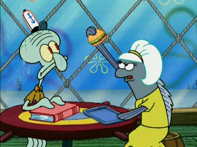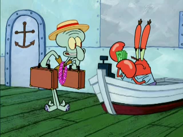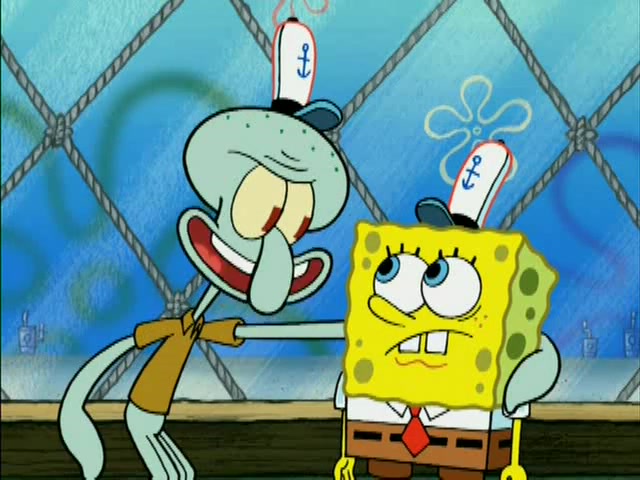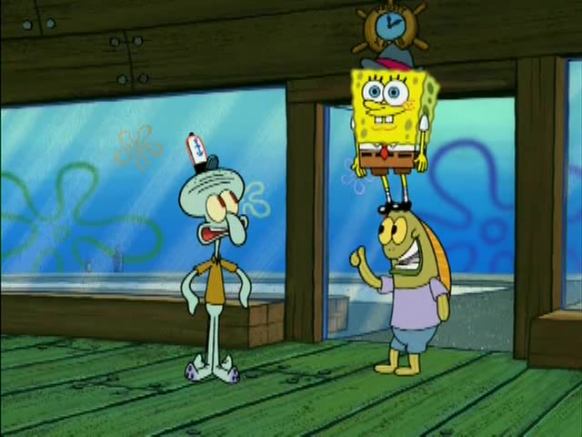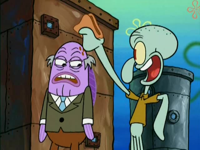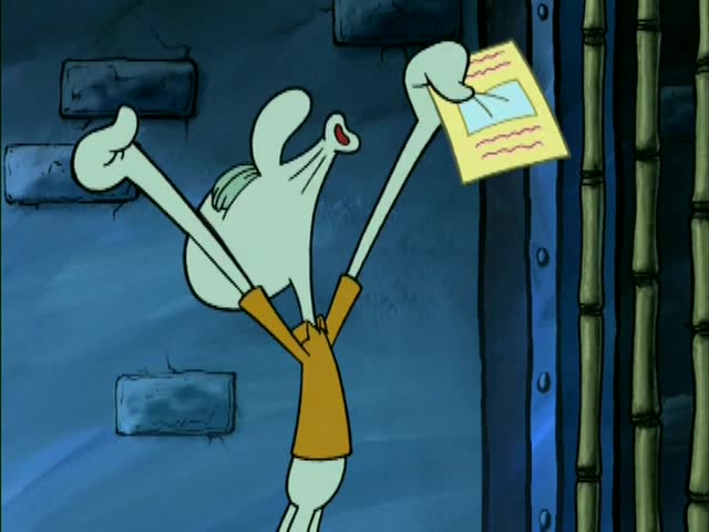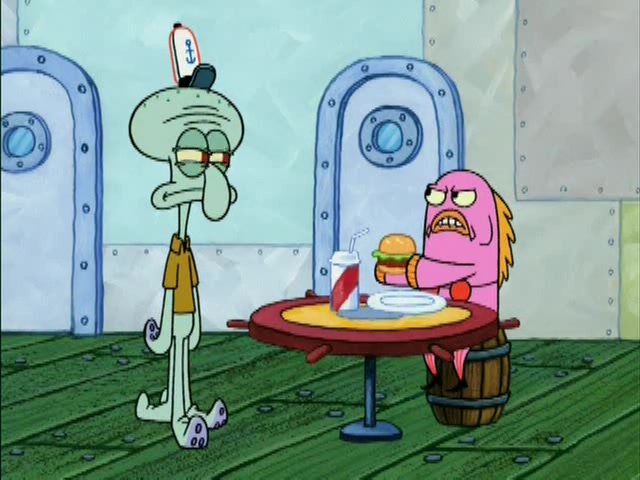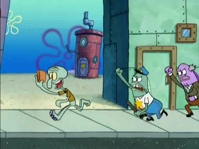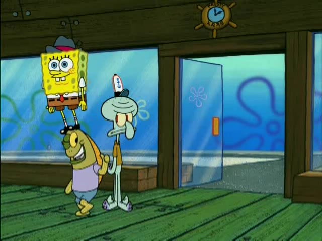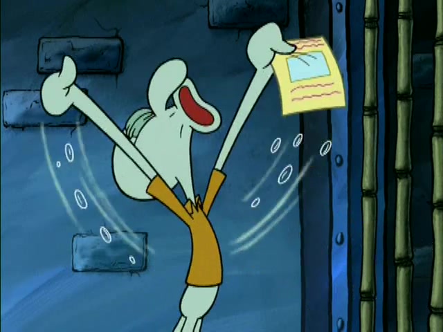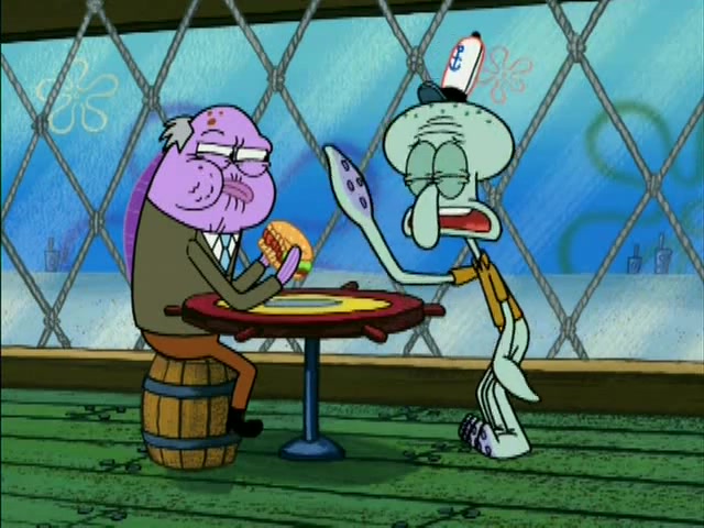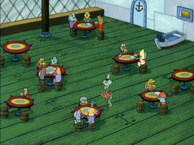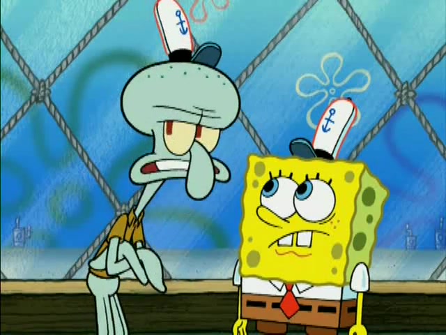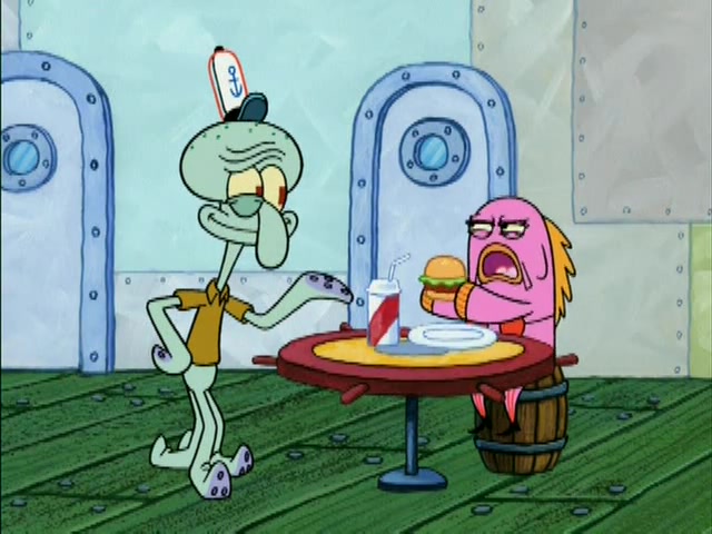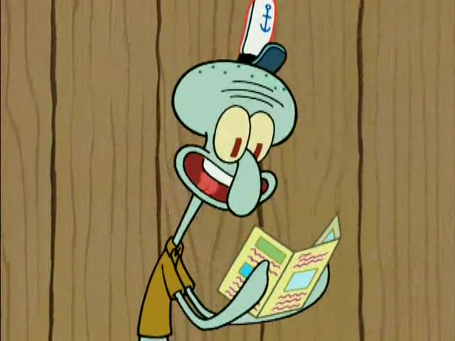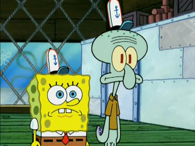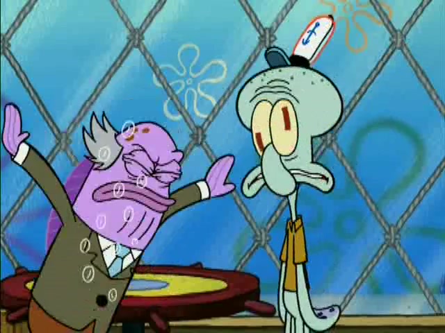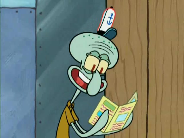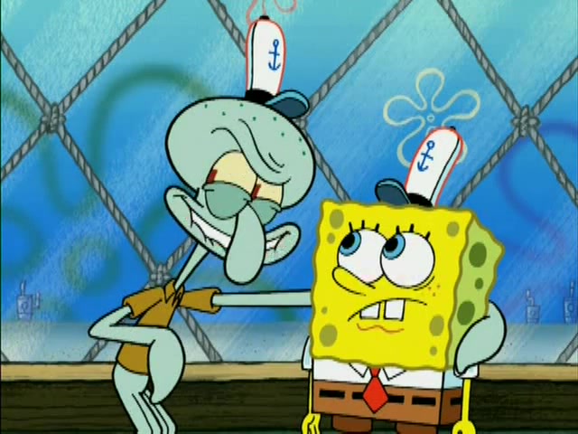 Mr. Krabs puts SpongeBob against Squidward in a work contest, telling them there will be a prize. He shows them a brochure for a cruise vacation, leading Squidward to believe the vacation is the prize. They have to name all the customers in the Krusty Krab. Somehow, SpongeBob knows everyone's name and Squidward is confused by this, so he asks SpongeBob why this is so. SpongeBob then he reveals he has a book with everybody's name in it. Squidward then swipes the book and says the names in the book. He told Mr. Krabs that he has more points than SpongeBob. Mr. Krabs didn't tally the scores but, he claims that they both were neck and neck to the winner and that they're was one costumer who's name was a mystery and whoever gets his name wins the competition. Squidward and SpongeBob were in a sudden death to know the last customer's name. After a struggle or trying to remember, Squidward then gets SpongeBob out of the way and asks the fish his name. He responds "What's it to ya". After three attempts to find out his name, Squidward snatched his wallet and ran. He attracted a cop who chased him because he ran a stop sign, and more so after he realizes he stole a wallet too. Squidward then makes it on top of the roof and after a tug-of-war for the wallet, Squidward manages to get his driver's license, which the name reads "Mr. What Zit Too Ya." He then is arrested. In jail, he gets the prize from Mr. Krabs and it turns out the prize is just a brochure for the trip. Squidward believes he is safe from SpongeBob and Patrick, but it turns out Patrick is his cellmate. He offers to play Parcheesi with Squidward, but Squidward just falls apart (literally).