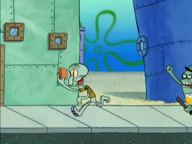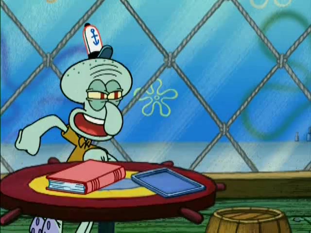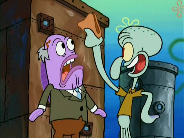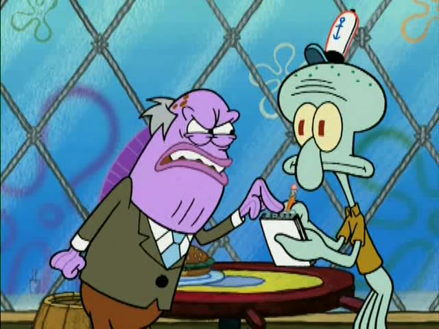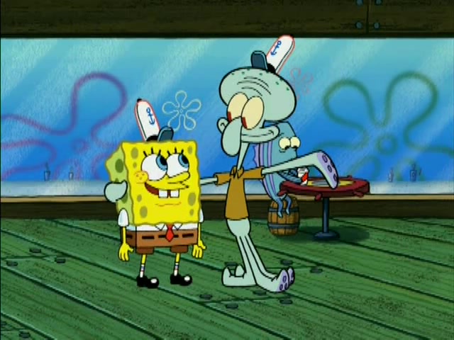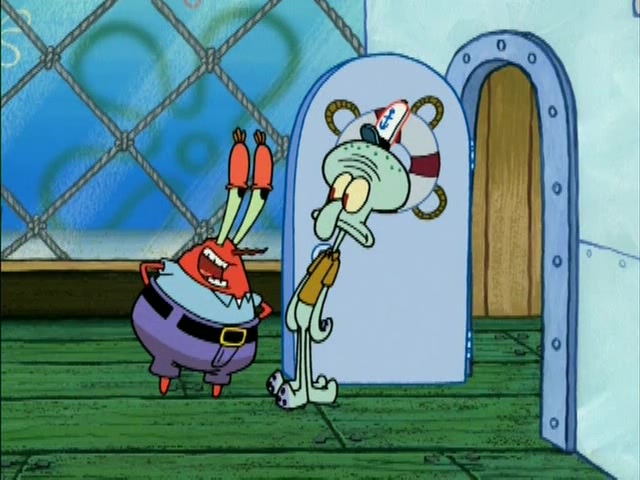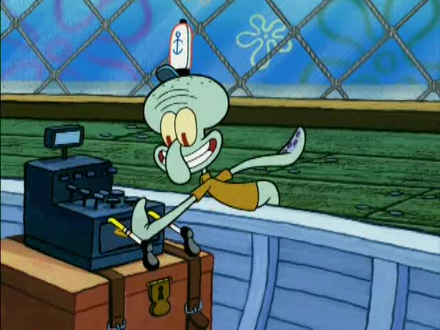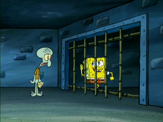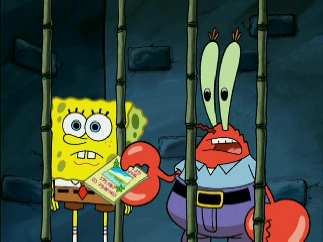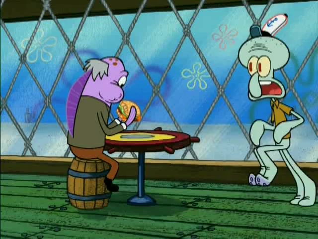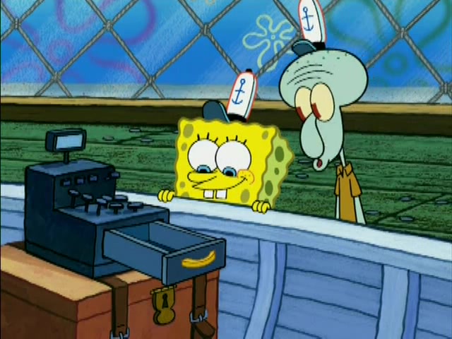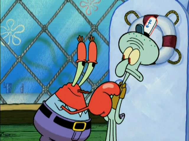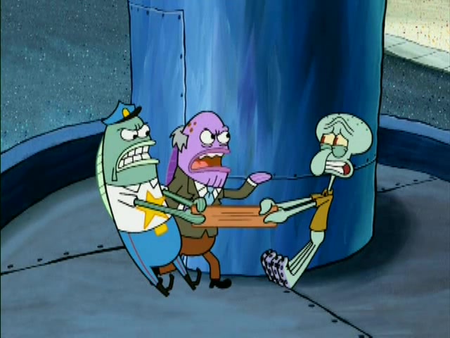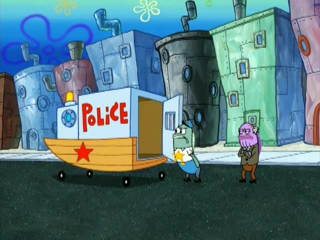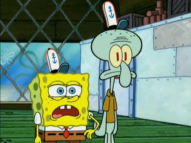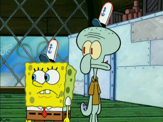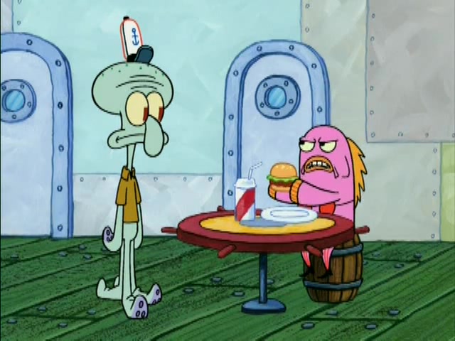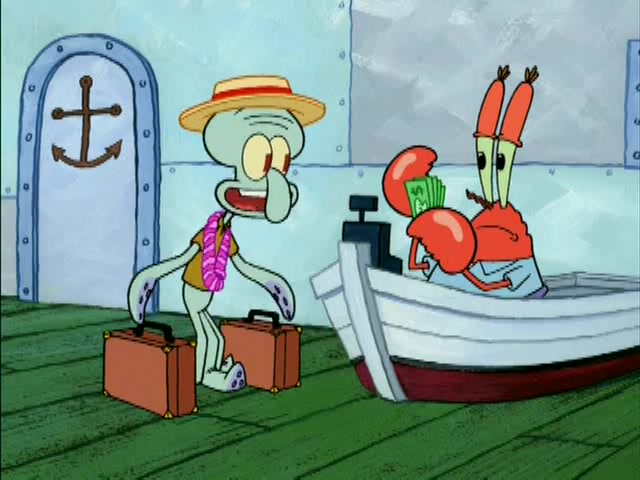 Mr. Krabs puts SpongeBob against Squidward in a work contest, telling them there will be a prize. He shows them a brochure for a cruise vacation, leading Squidward to believe the vacation is the prize. They have to name all the customers in the Krusty Krab. Somehow, SpongeBob knows everyone's name and Squidward is confused by this, so he asks SpongeBob why this is so. SpongeBob then he reveals he has a book with everybody's name in it. Squidward then swipes the book and says the names in the book. He told Mr. Krabs that he has more points than SpongeBob. Mr. Krabs didn't tally the scores but, he claims that they both were neck and neck to the winner and that they're was one costumer who's name was a mystery and whoever gets his name wins the competition. Squidward and SpongeBob were in a sudden death to know the last customer's name. After a struggle or trying to remember, Squidward then gets SpongeBob out of the way and asks the fish his name. He responds "What's it to ya". After three attempts to find out his name, Squidward snatched his wallet and ran. He attracted a cop who chased him because he ran a stop sign, and more so after he realizes he stole a wallet too. Squidward then makes it on top of the roof and after a tug-of-war for the wallet, Squidward manages to get his driver's license, which the name reads "Mr. What Zit Too Ya." He then is arrested. In jail, he gets the prize from Mr. Krabs and it turns out the prize is just a brochure for the trip. Squidward believes he is safe from SpongeBob and Patrick, but it turns out Patrick is his cellmate. He offers to play Parcheesi with Squidward, but Squidward just falls apart (literally).
