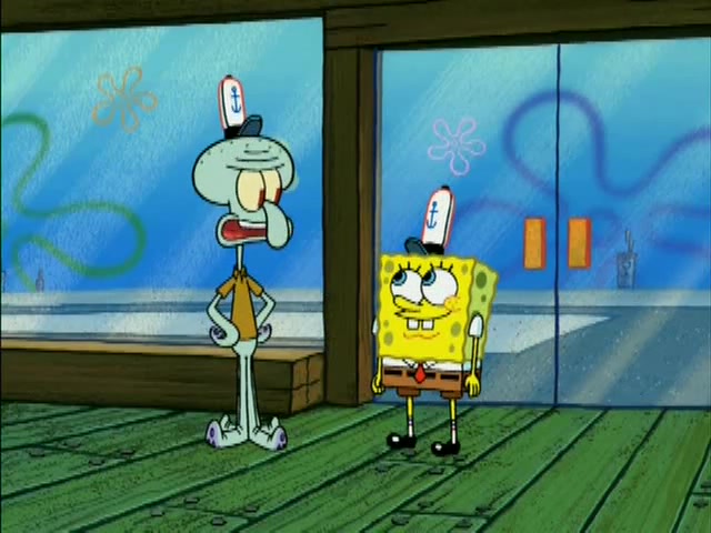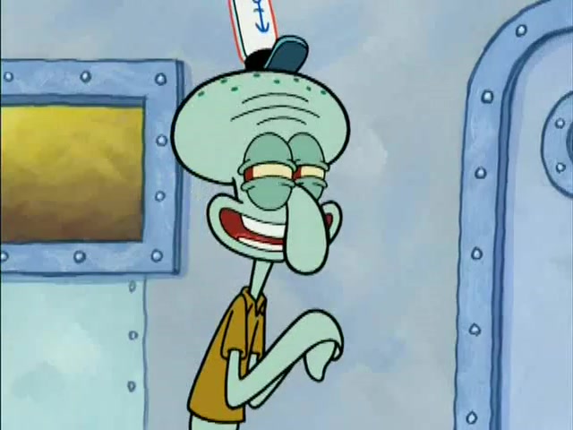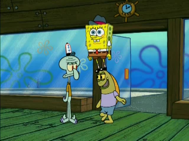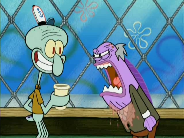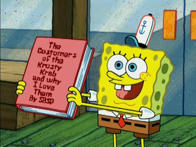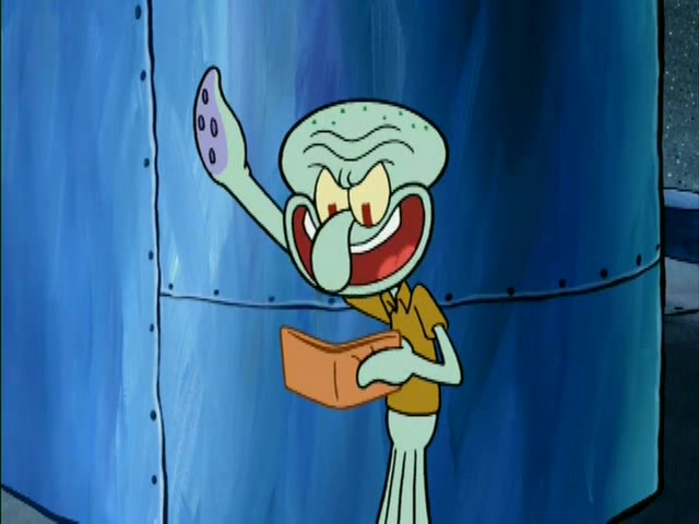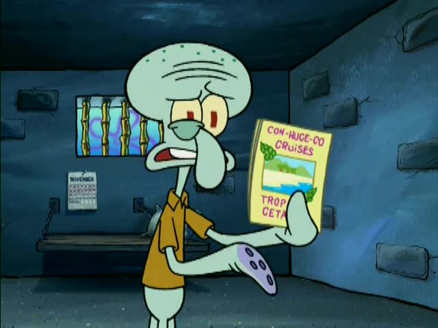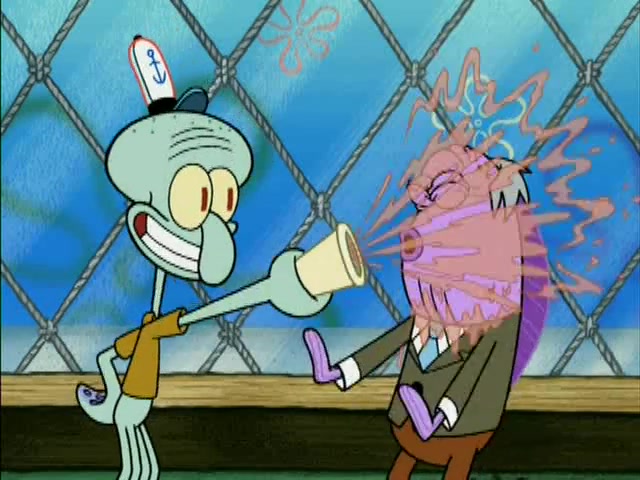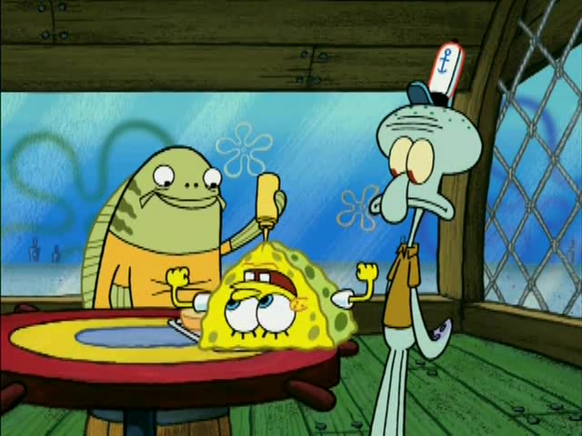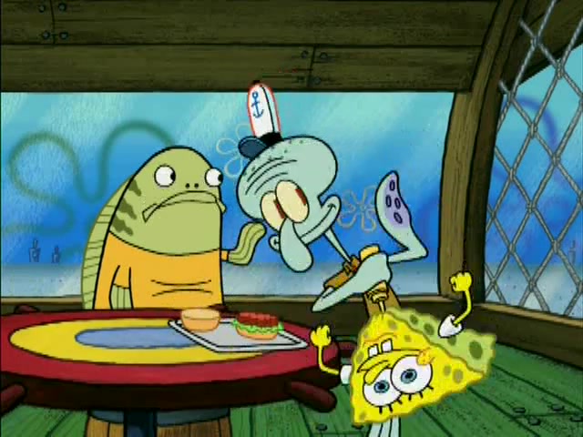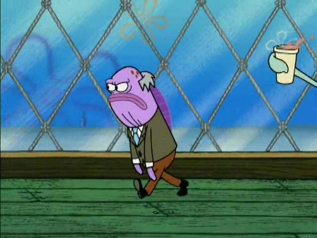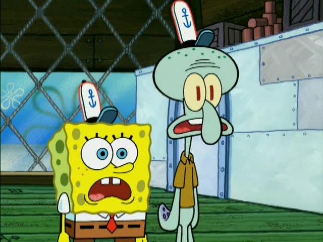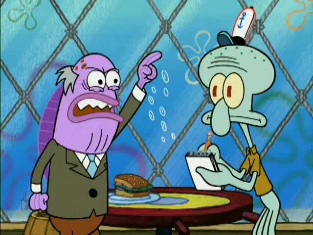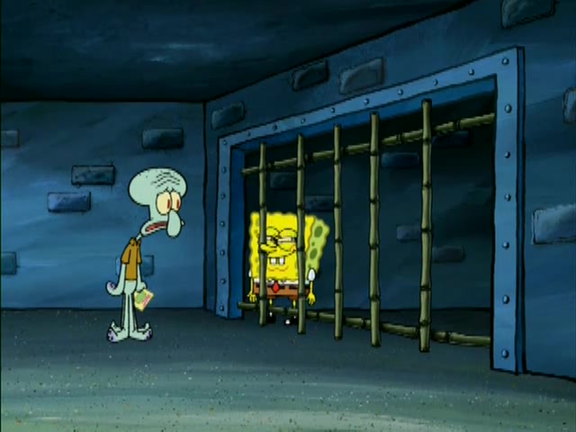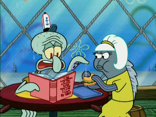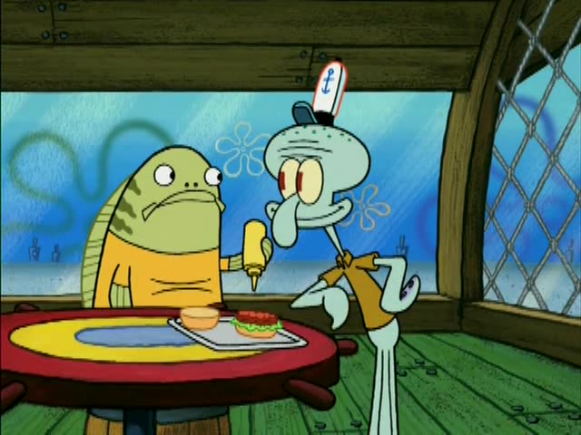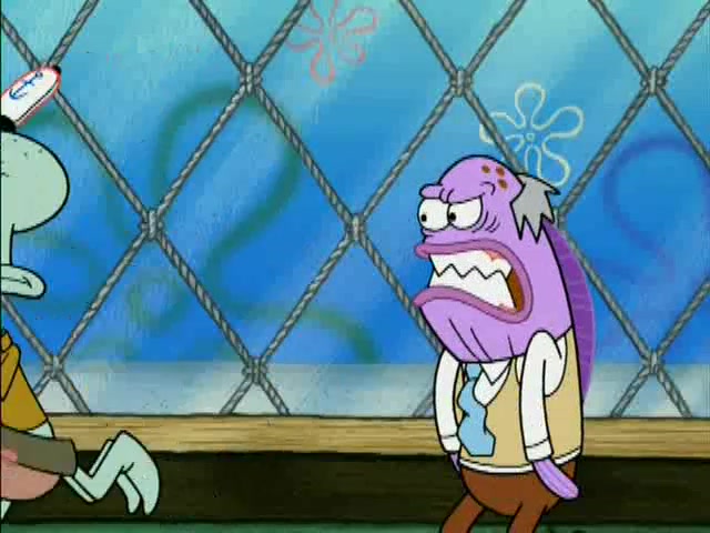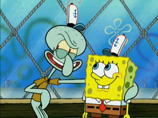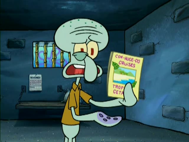 Mr. Krabs puts SpongeBob against Squidward in a work contest, telling them there will be a prize. He shows them a brochure for a cruise vacation, leading Squidward to believe the vacation is the prize. They have to name all the customers in the Krusty Krab. Somehow, SpongeBob knows everyone's name and Squidward is confused by this, so he asks SpongeBob why this is so. SpongeBob then he reveals he has a book with everybody's name in it. Squidward then swipes the book and says the names in the book. He told Mr. Krabs that he has more points than SpongeBob. Mr. Krabs didn't tally the scores but, he claims that they both were neck and neck to the winner and that they're was one costumer who's name was a mystery and whoever gets his name wins the competition. Squidward and SpongeBob were in a sudden death to know the last customer's name. After a struggle or trying to remember, Squidward then gets SpongeBob out of the way and asks the fish his name. He responds "What's it to ya". After three attempts to find out his name, Squidward snatched his wallet and ran. He attracted a cop who chased him because he ran a stop sign, and more so after he realizes he stole a wallet too. Squidward then makes it on top of the roof and after a tug-of-war for the wallet, Squidward manages to get his driver's license, which the name reads "Mr. What Zit Too Ya." He then is arrested. In jail, he gets the prize from Mr. Krabs and it turns out the prize is just a brochure for the trip. Squidward believes he is safe from SpongeBob and Patrick, but it turns out Patrick is his cellmate. He offers to play Parcheesi with Squidward, but Squidward just falls apart (literally).