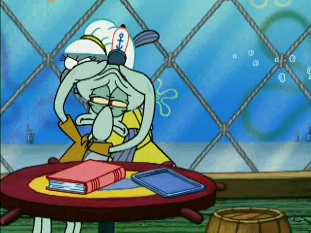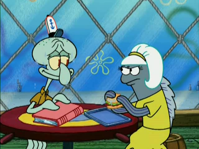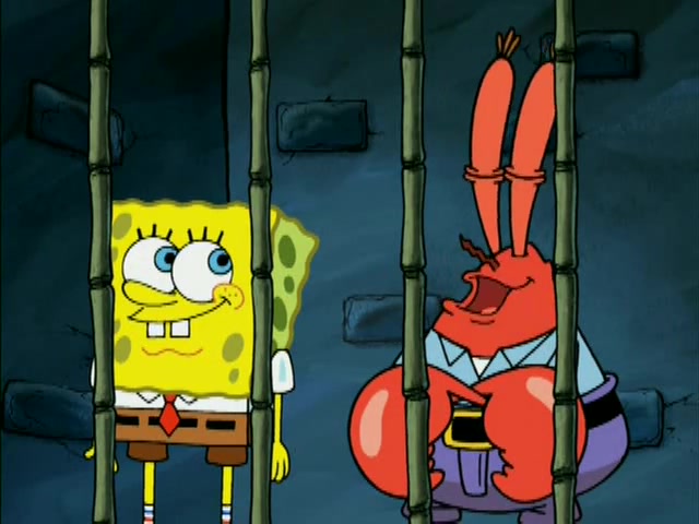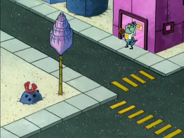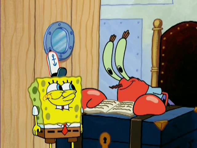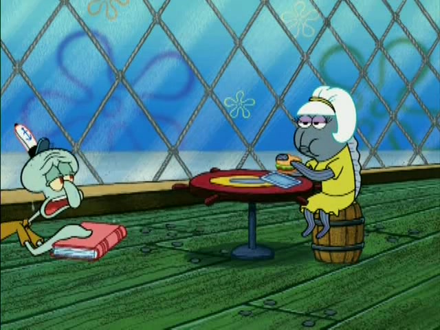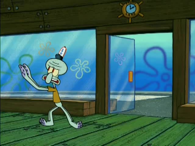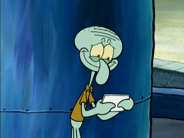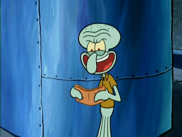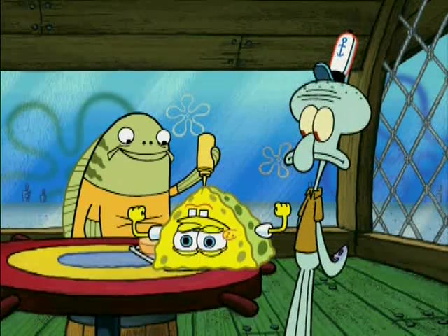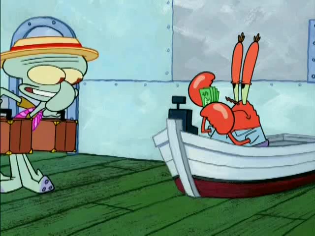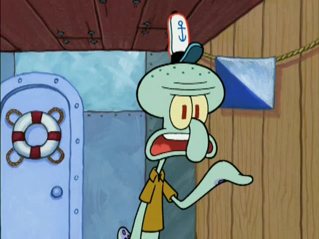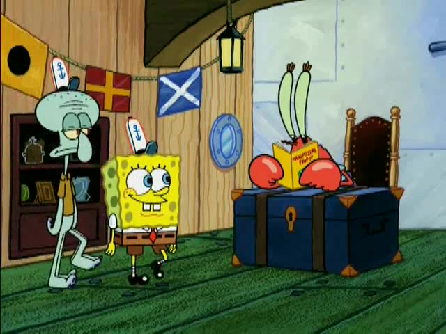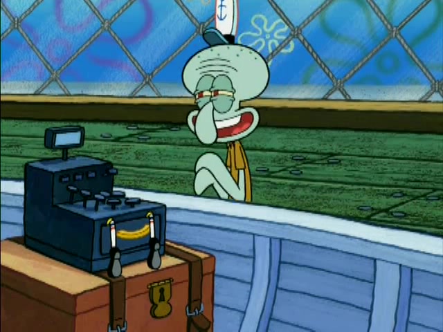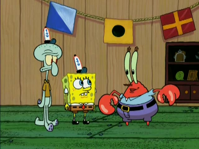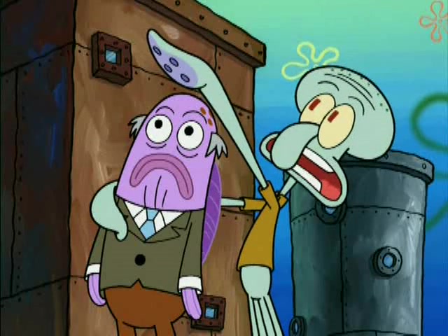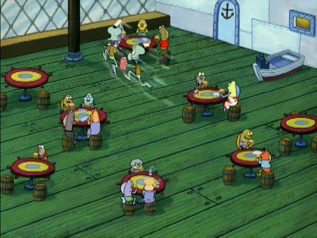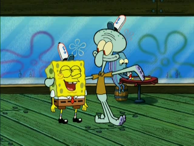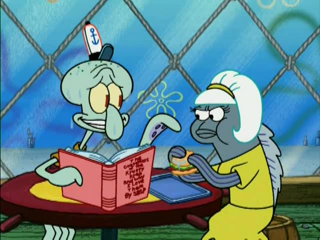 Mr. Krabs puts SpongeBob against Squidward in a work contest, telling them there will be a prize. He shows them a brochure for a cruise vacation, leading Squidward to believe the vacation is the prize. They have to name all the customers in the Krusty Krab. Somehow, SpongeBob knows everyone's name and Squidward is confused by this, so he asks SpongeBob why this is so. SpongeBob then he reveals he has a book with everybody's name in it. Squidward then swipes the book and says the names in the book. He told Mr. Krabs that he has more points than SpongeBob. Mr. Krabs didn't tally the scores but, he claims that they both were neck and neck to the winner and that they're was one costumer who's name was a mystery and whoever gets his name wins the competition. Squidward and SpongeBob were in a sudden death to know the last customer's name. After a struggle or trying to remember, Squidward then gets SpongeBob out of the way and asks the fish his name. He responds "What's it to ya". After three attempts to find out his name, Squidward snatched his wallet and ran. He attracted a cop who chased him because he ran a stop sign, and more so after he realizes he stole a wallet too. Squidward then makes it on top of the roof and after a tug-of-war for the wallet, Squidward manages to get his driver's license, which the name reads "Mr. What Zit Too Ya." He then is arrested. In jail, he gets the prize from Mr. Krabs and it turns out the prize is just a brochure for the trip. Squidward believes he is safe from SpongeBob and Patrick, but it turns out Patrick is his cellmate. He offers to play Parcheesi with Squidward, but Squidward just falls apart (literally).