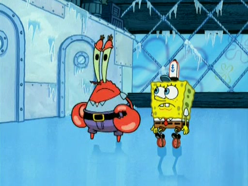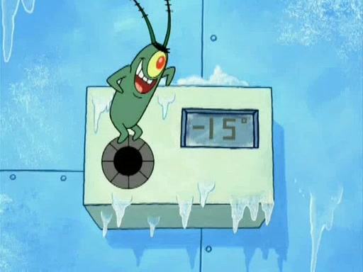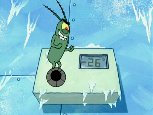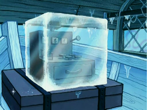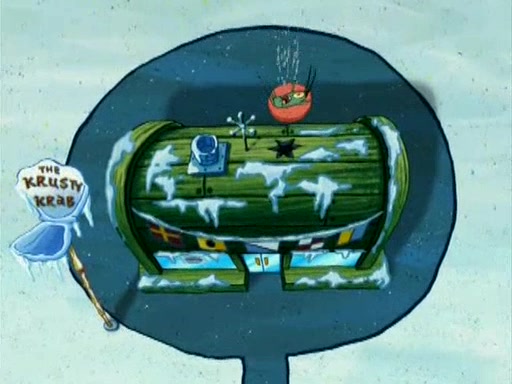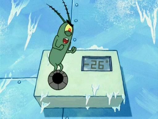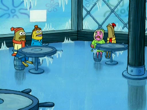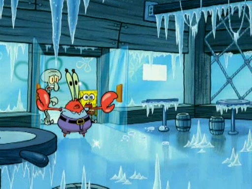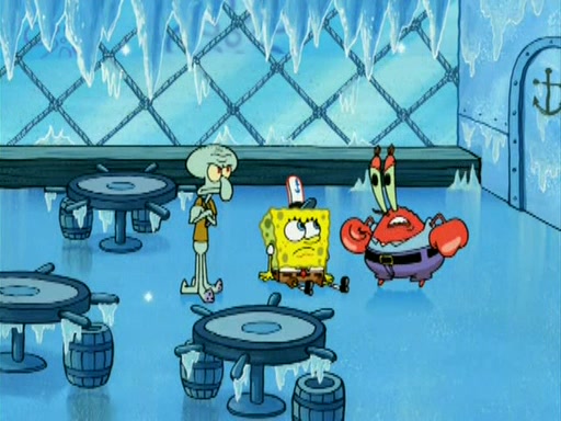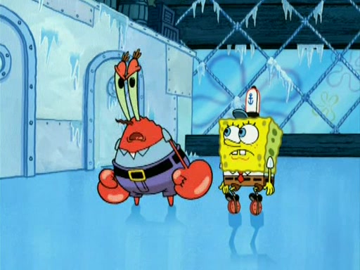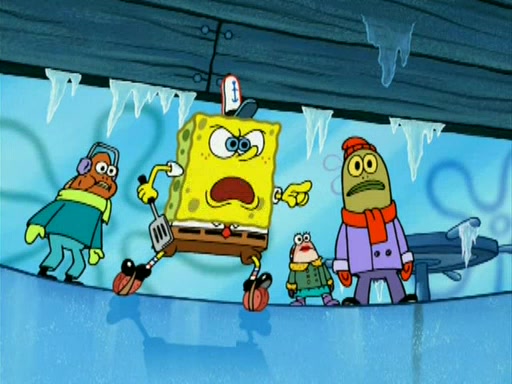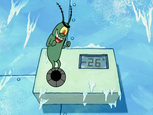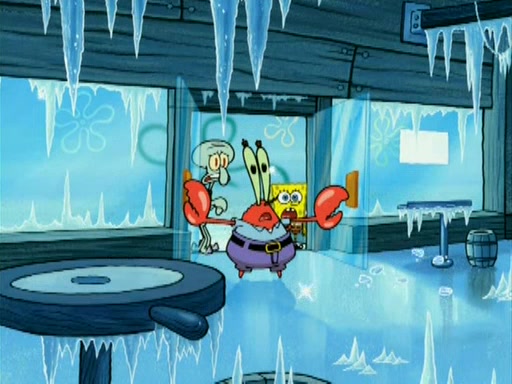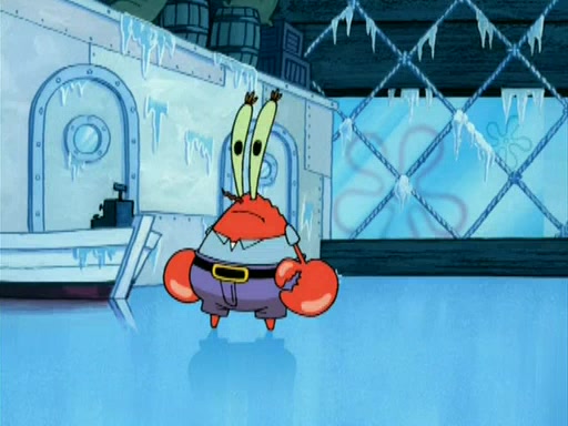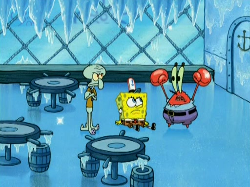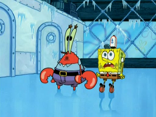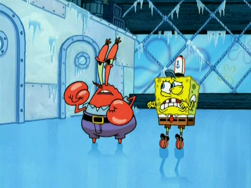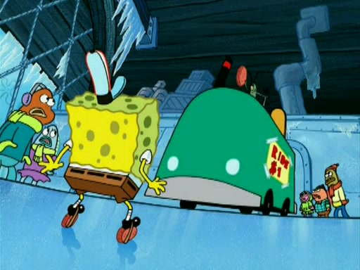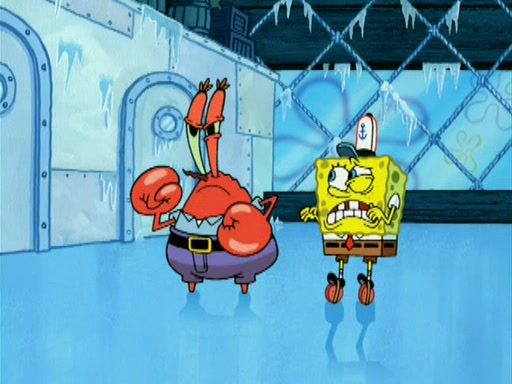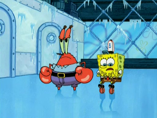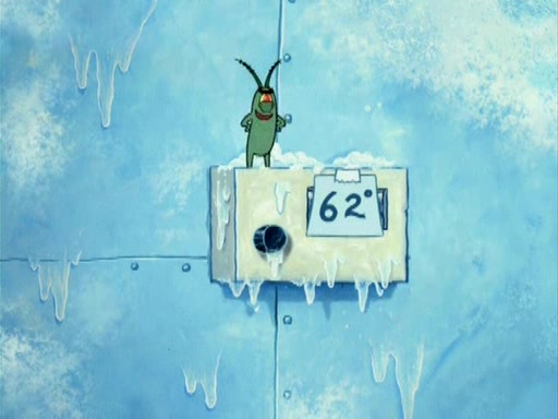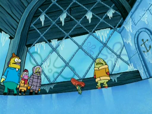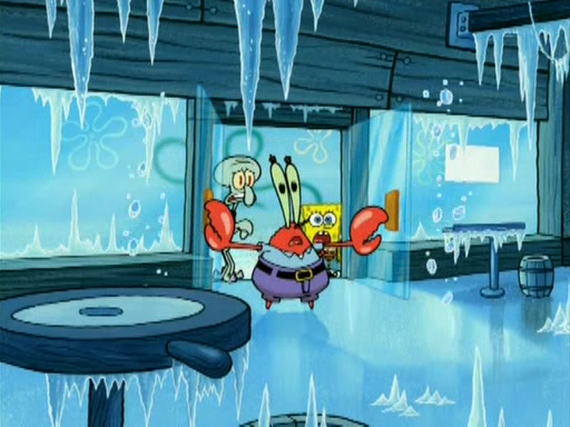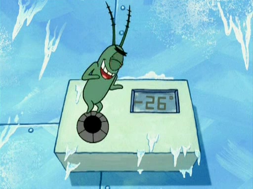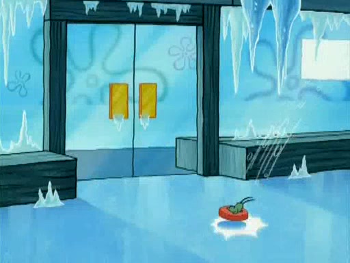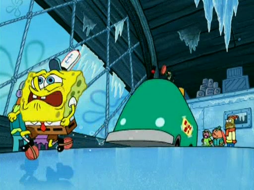 During the freezing cold weather in Bikini Bottom, Squidward complains about the temperature in the Krusty Krab. When Squidward tries to turn up the heat on the thermostat, Mr. Krabs berates him, allowing Plankton to get an idea to freeze his competition out of business. The next morning, Plankton has frozen the Krusty Krab down to -15 degrees, but the customers continue to stay due to the Krabby Patties and the new patty skates SpongeBob invented. Mr. Krabs has turned the restaurant into and ice rink. Karen advises Plankton to swipe a Krabby Patty in the confusion, but SpongeBob and some local hockey players prevent him from escaping. When SpongeBob blocks the doors, Plankton turns to the thermostat, and begins freezing and boiling the patrons. He then gets careless and falls off the dial, allowing Mr. Krabs to freeze him. Later, Mr. Krabs has turned the Krusty Krab into a swimming pool, relaxing on a floating chair, while he thanks Plankton (trapped in a ice cube) for his ideas, and sips lemonade with Plankton as the ice in the drink.