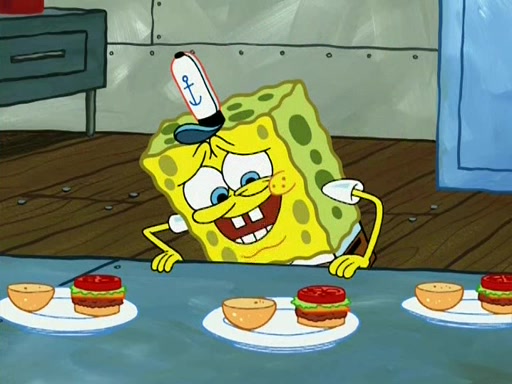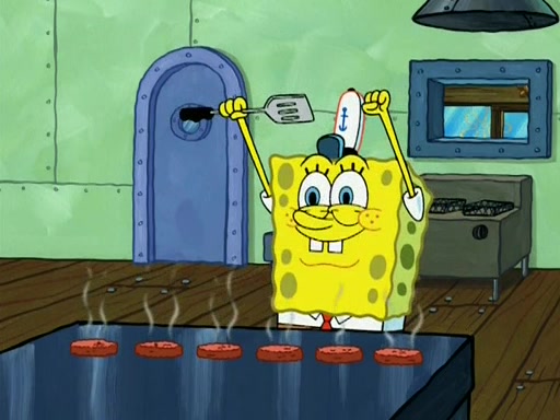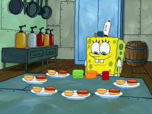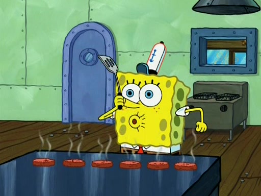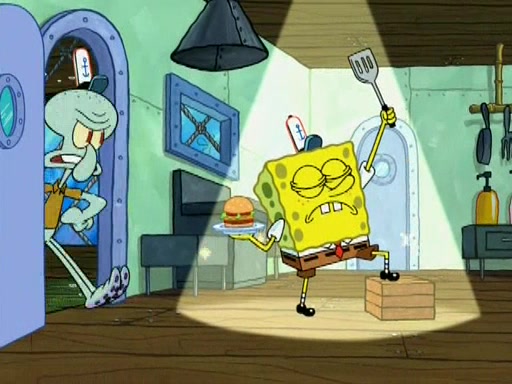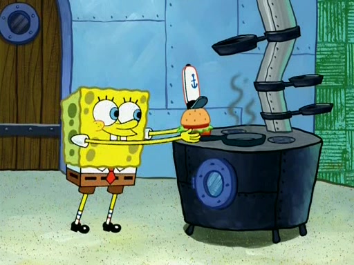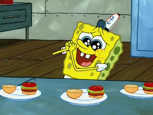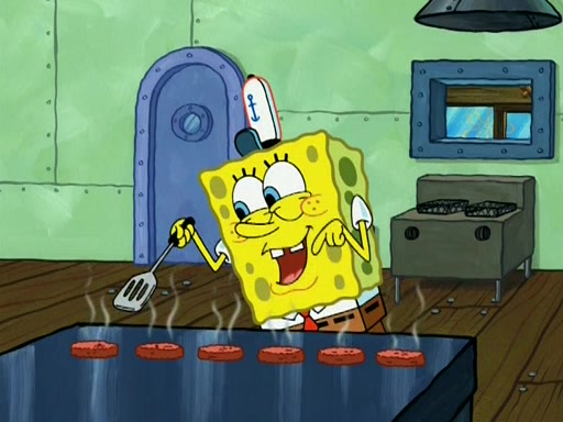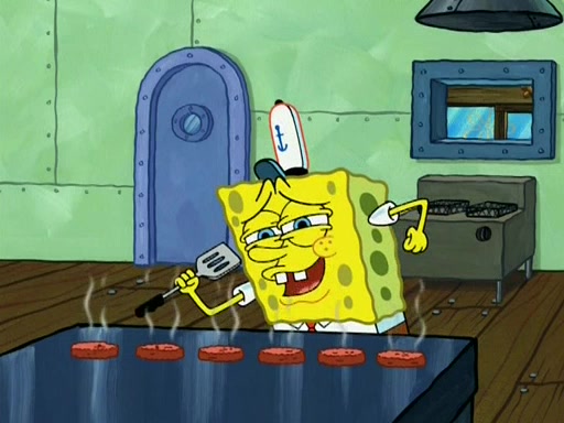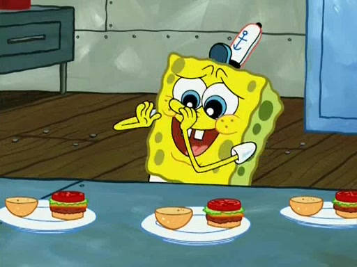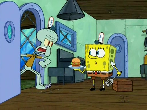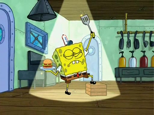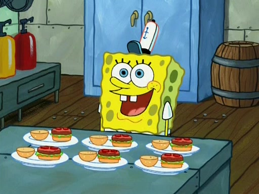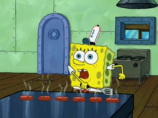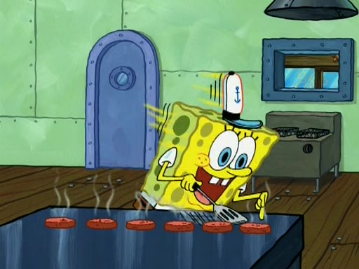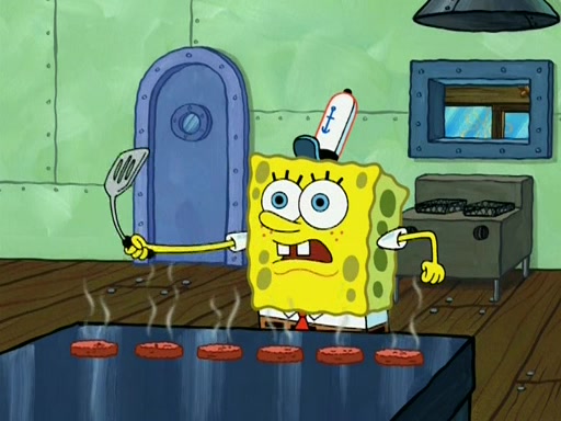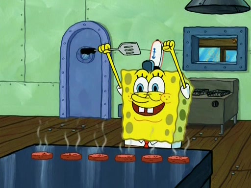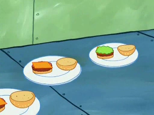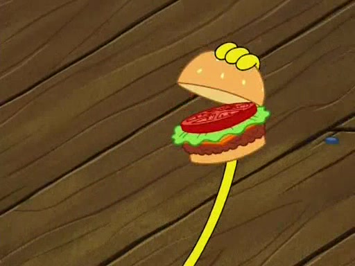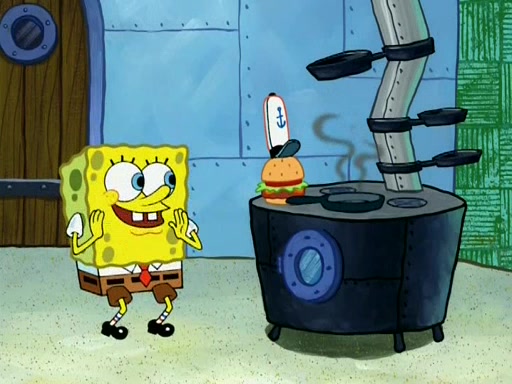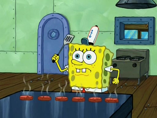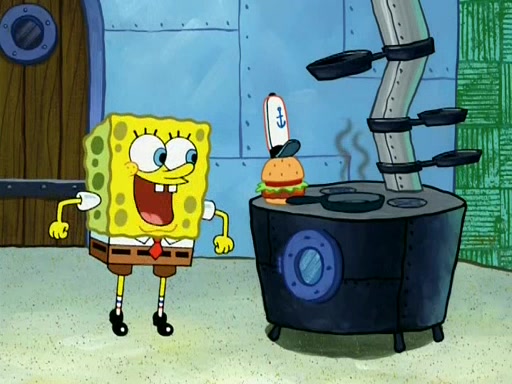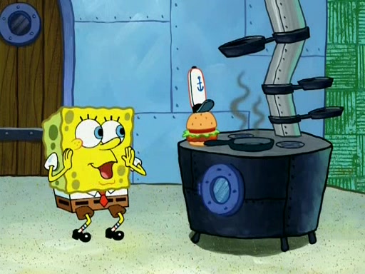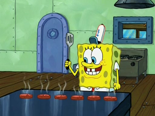 At the Krusty Krab, SpongeBob is seen cooking Krabby Patties. He makes several Krabby Patties and falls in love with one, naming it "Patty." The patties are taken to customers who start wolfing down on the food. Consumed by guilt, SpongeBob rescues Patty by replacing her with a shoe.