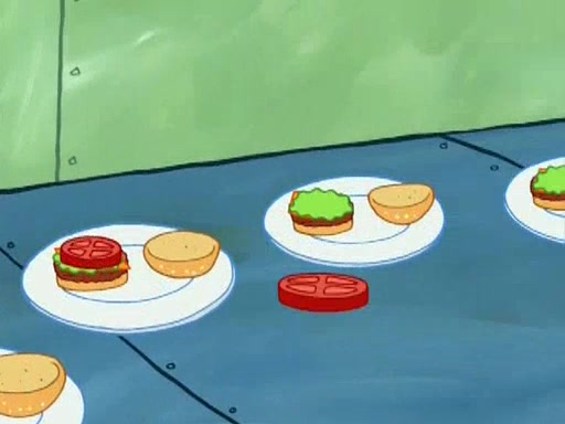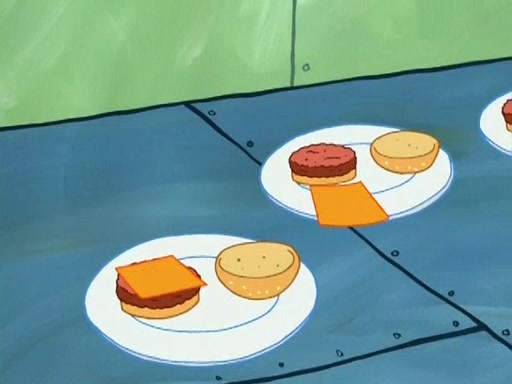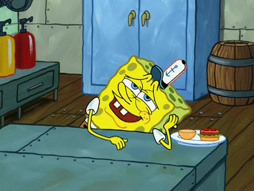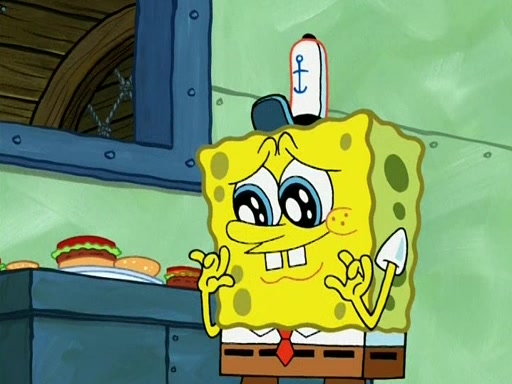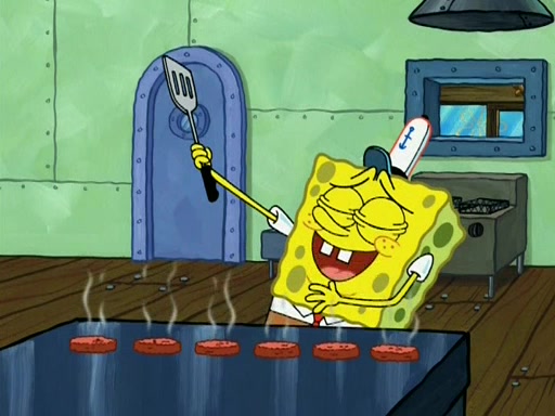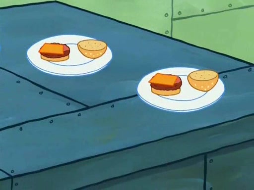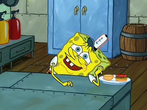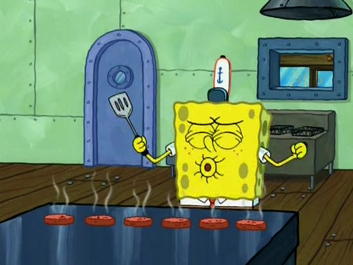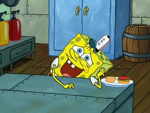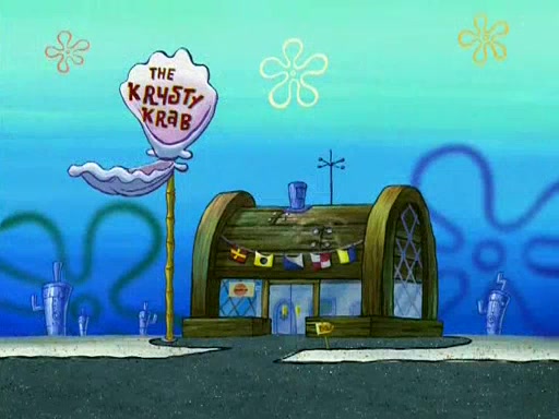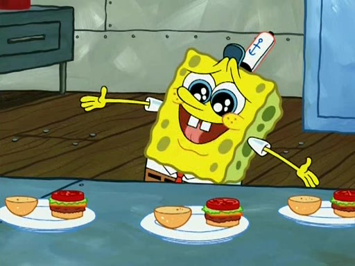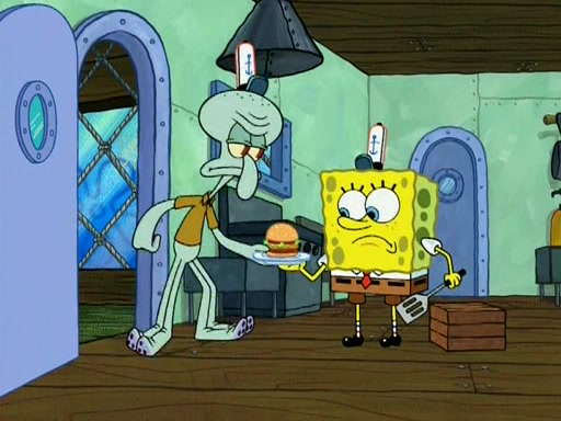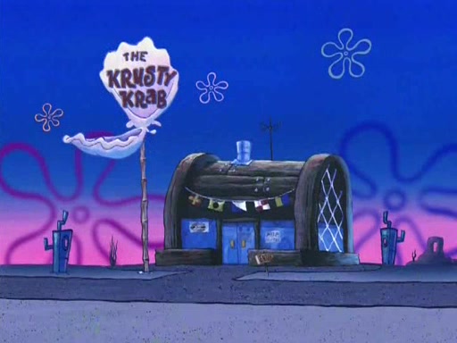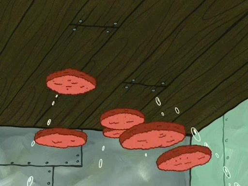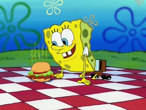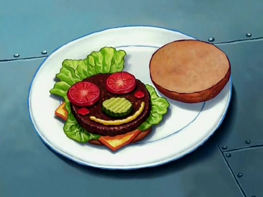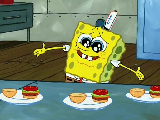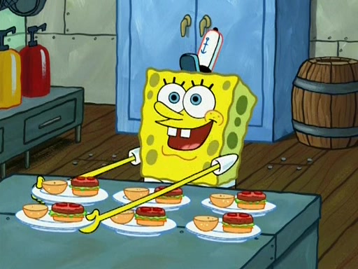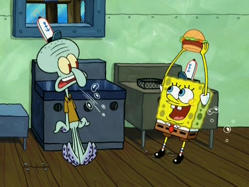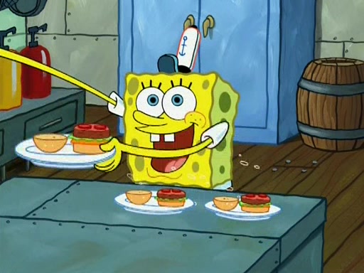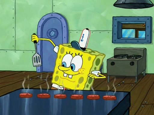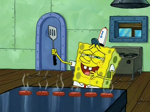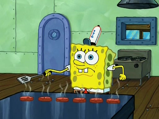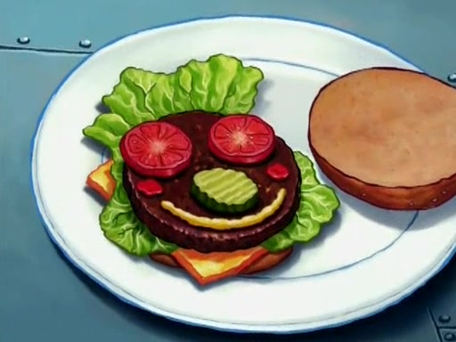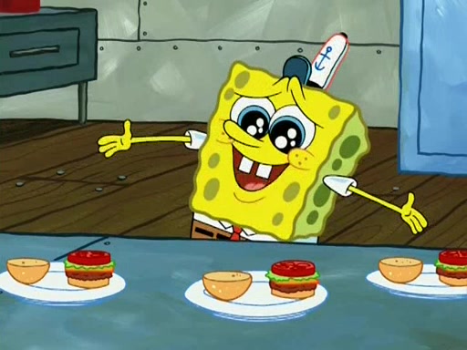 At the Krusty Krab, SpongeBob is seen cooking Krabby Patties. He makes several Krabby Patties and falls in love with one, naming it "Patty." The patties are taken to customers who start wolfing down on the food. Consumed by guilt, SpongeBob rescues Patty by replacing her with a shoe.