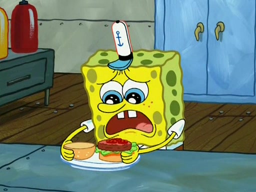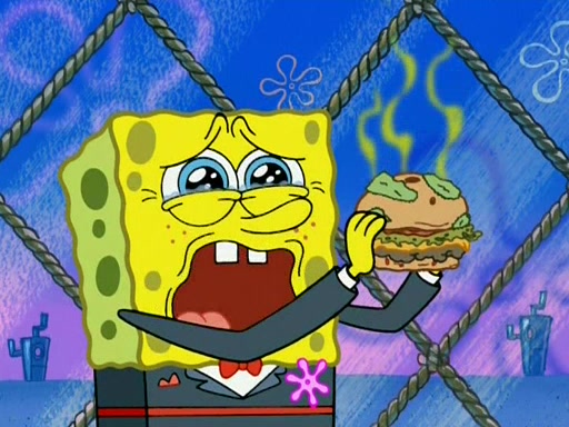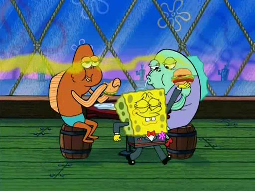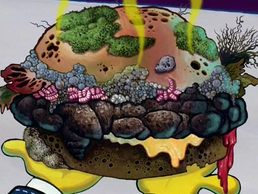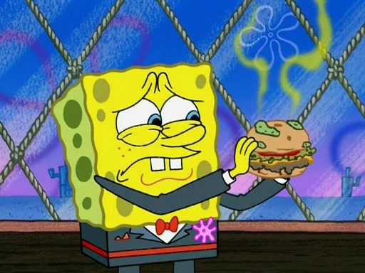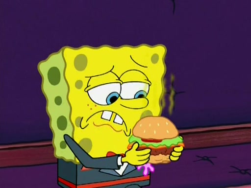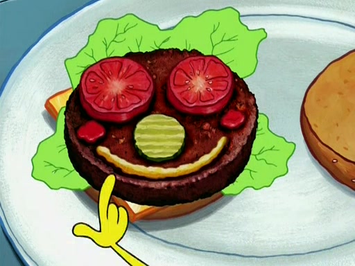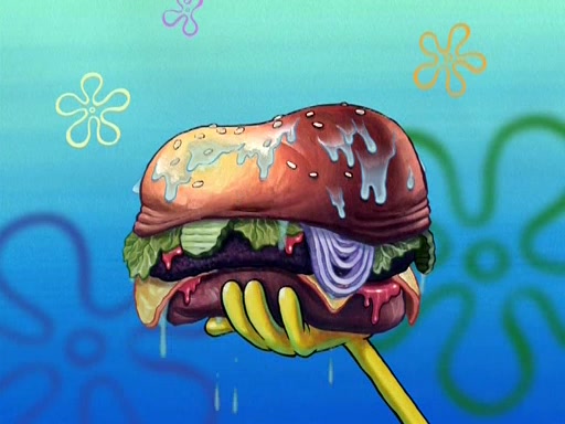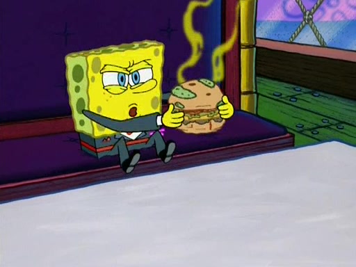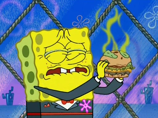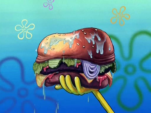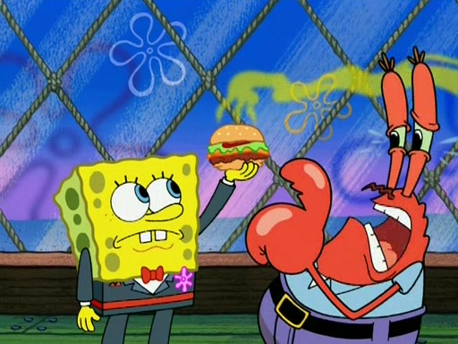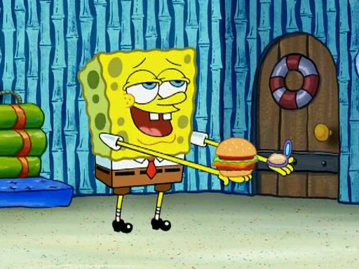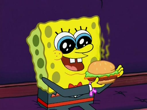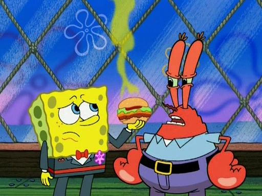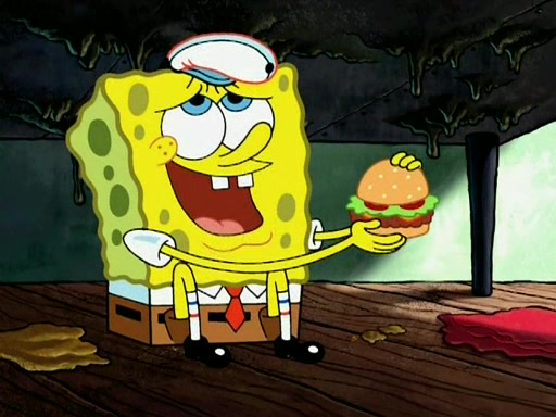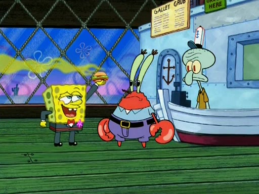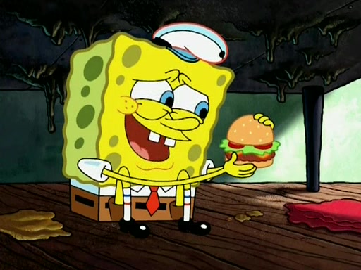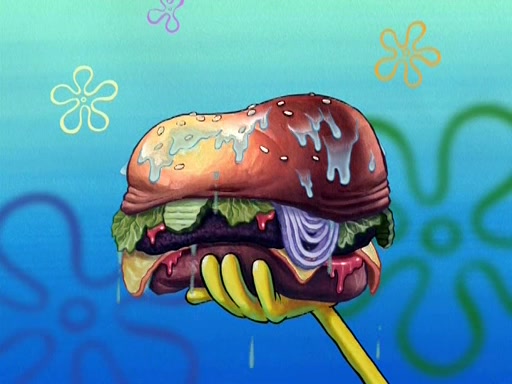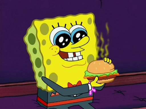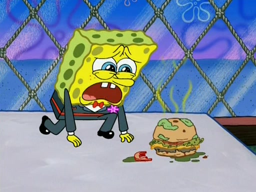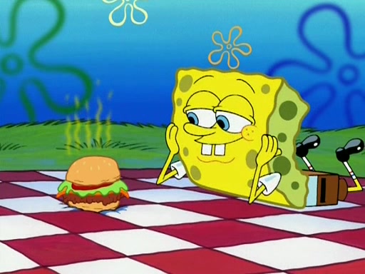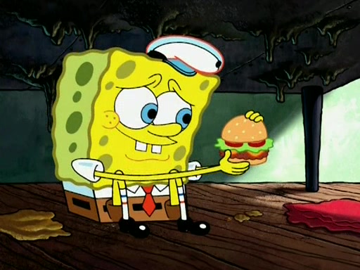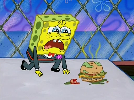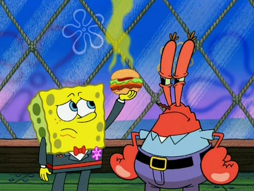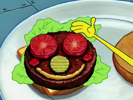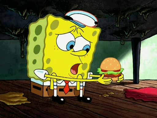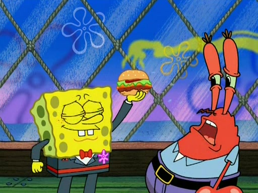 SpongeBob questions how this came to be. Mr. Krabs tells the fry cook that he once fell in love with a Krabby Patty. He then tells SpongeBob that Krabby Patties are meant to be loved and eaten. SpongeBob finally knows what he must do and eats his date, feeling nauseous afterward. The episode ends with SpongeBob asking for a doggie bag.