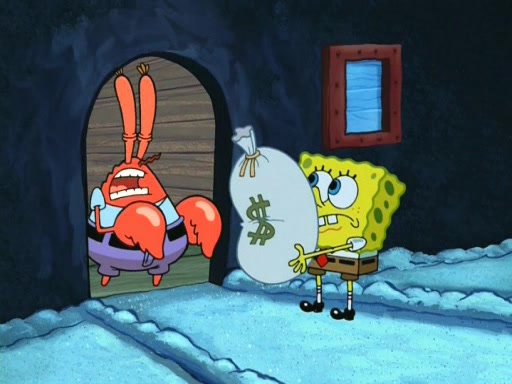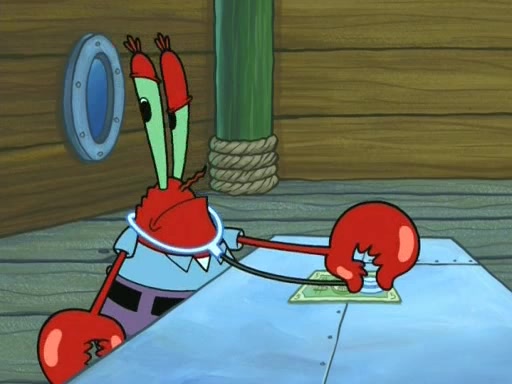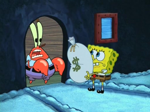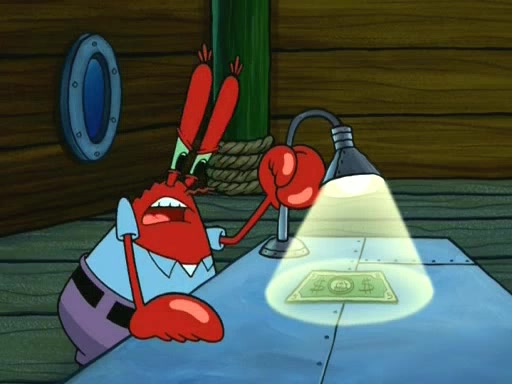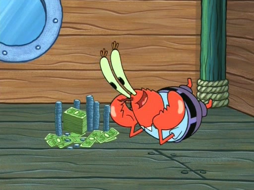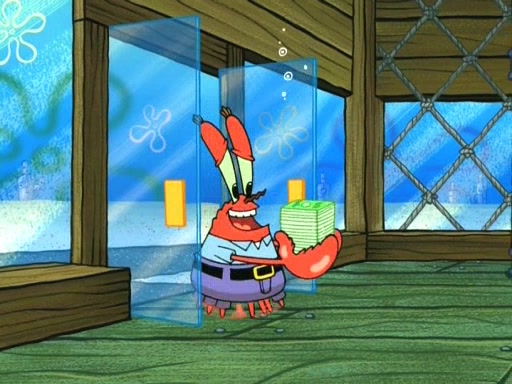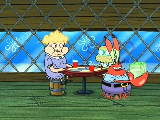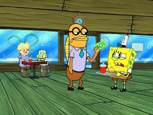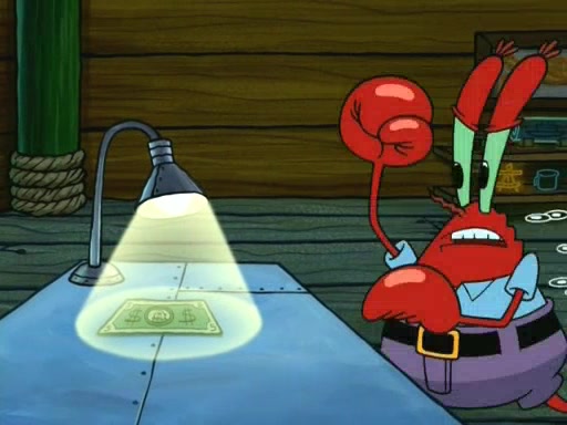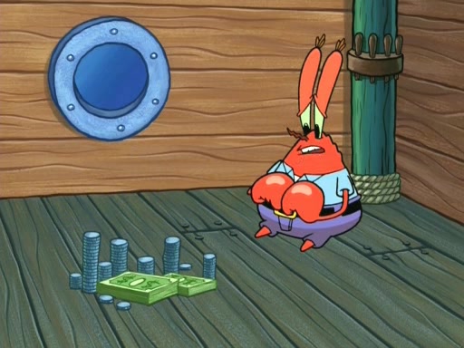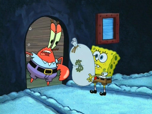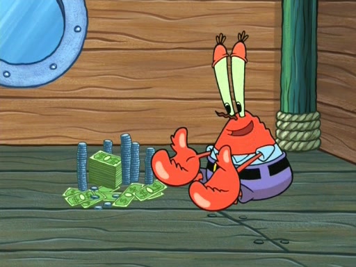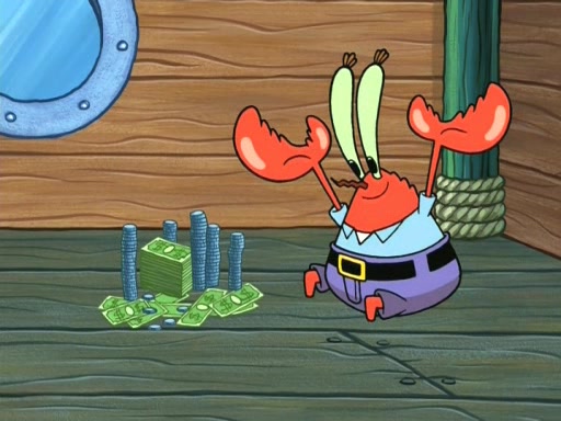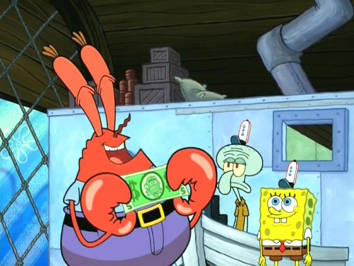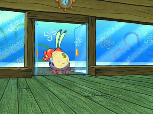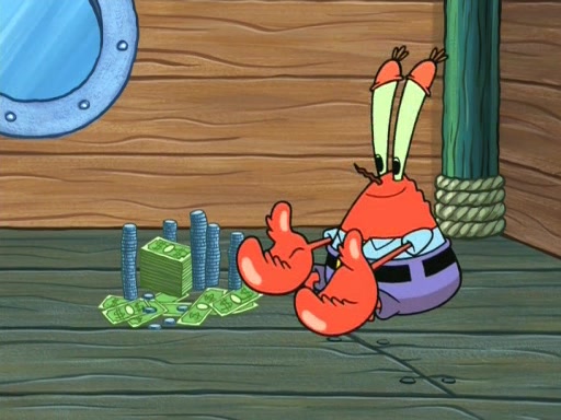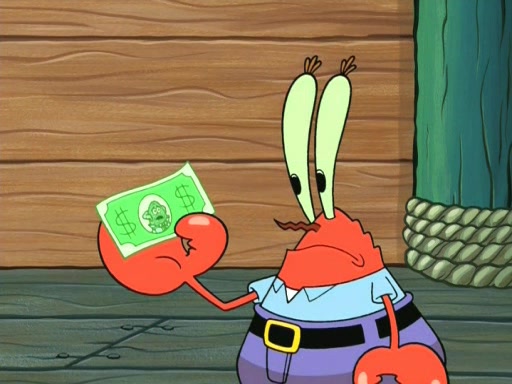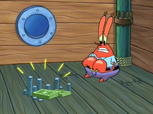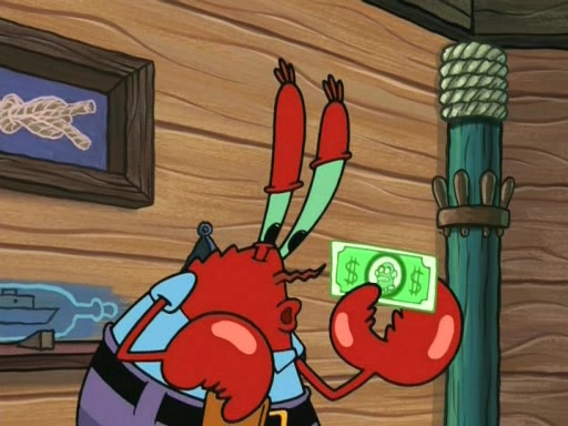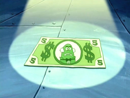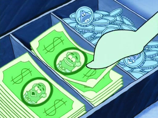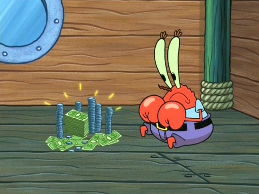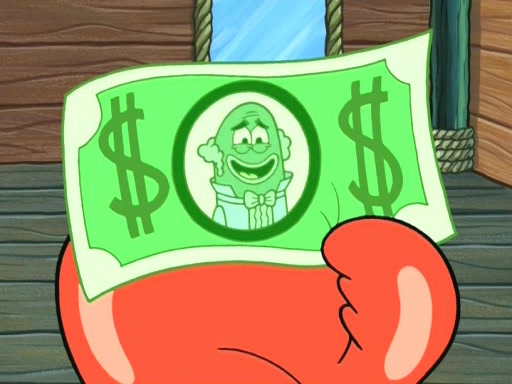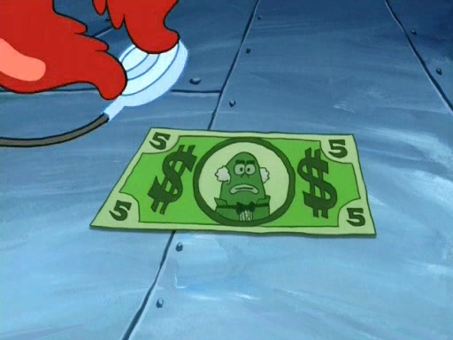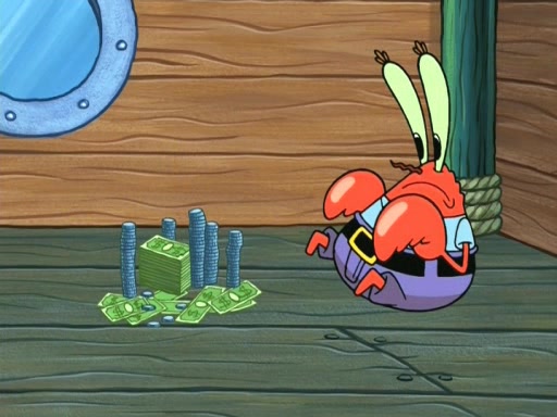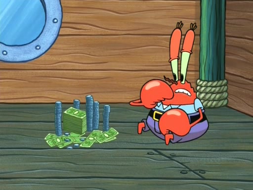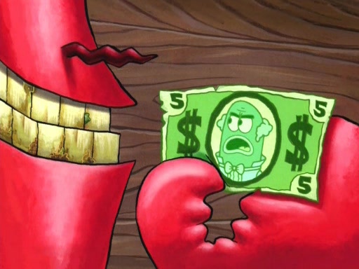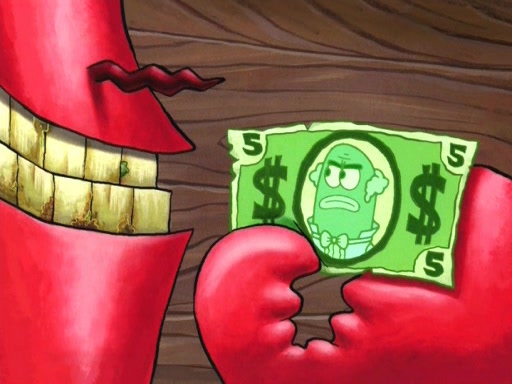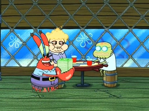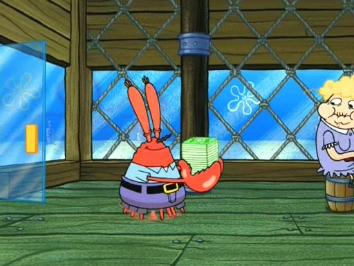 At the Krusty Krab, a customer wants to sit at a certain table, but two elderly people (Old Man Jenkins and Mary) are already sitting there. SpongeBob said the customer could sit at the table when they are done although the guy said he would pay $5 if he gets it now. Mr. Krabs agrees with this offer, and kicks the old people out. Mr. Krabs then says "Money talks," likes the idea, and wishes he could talk to money.