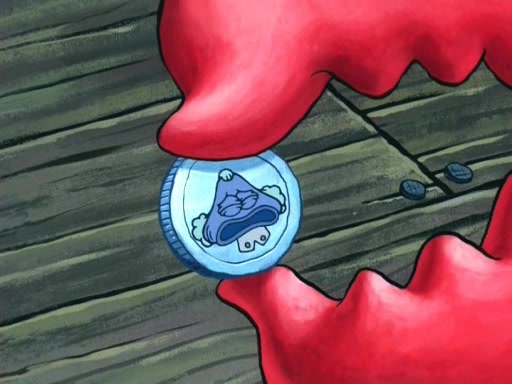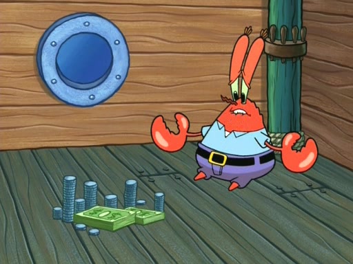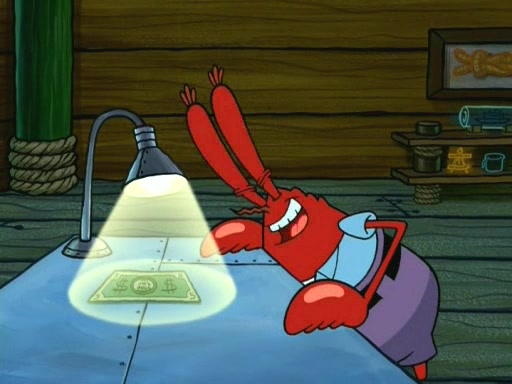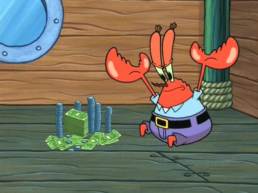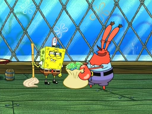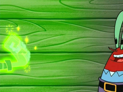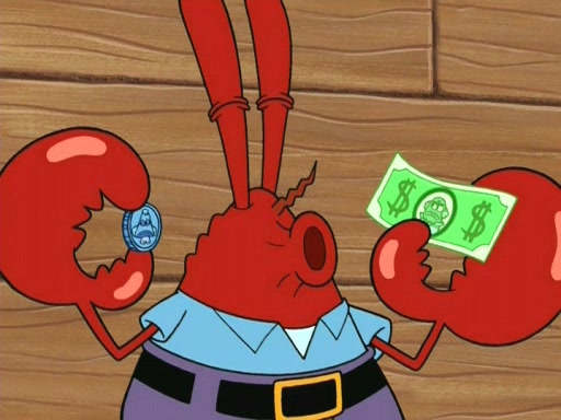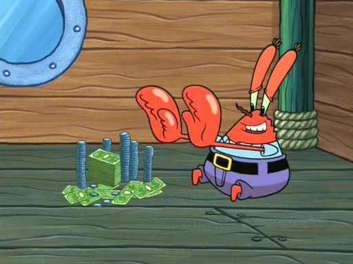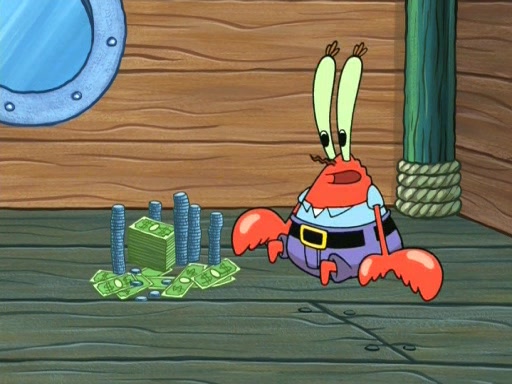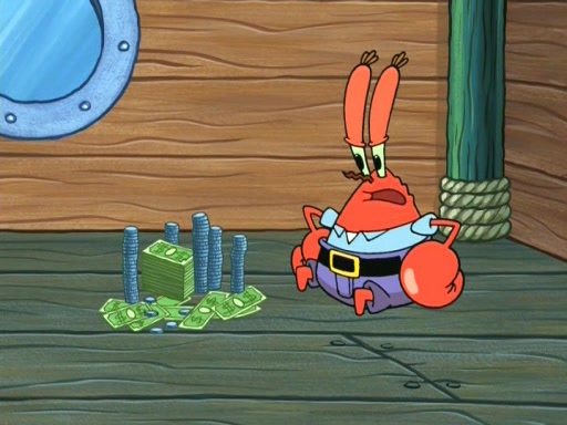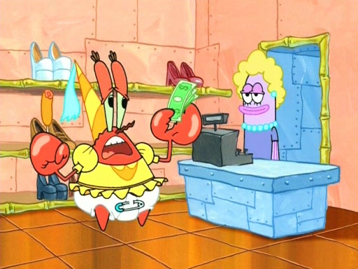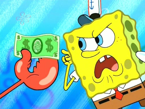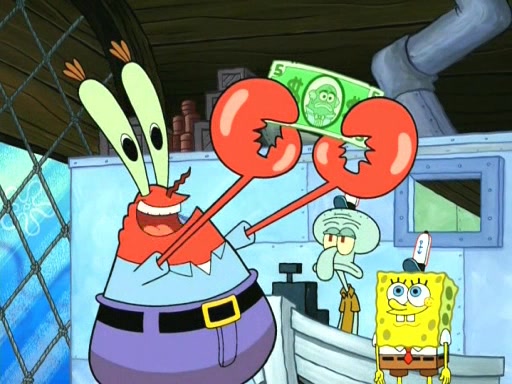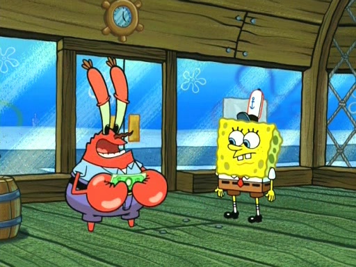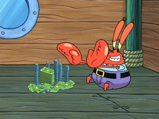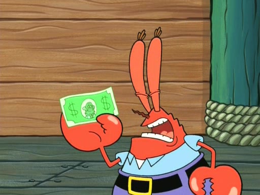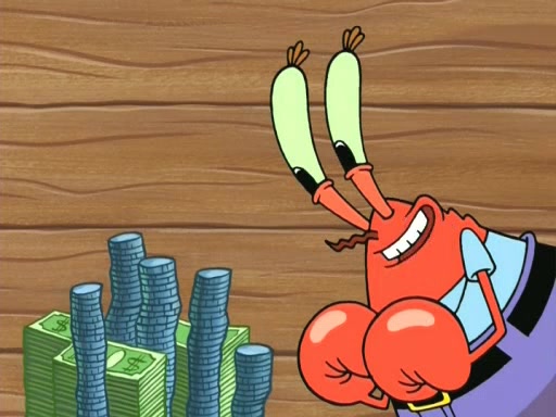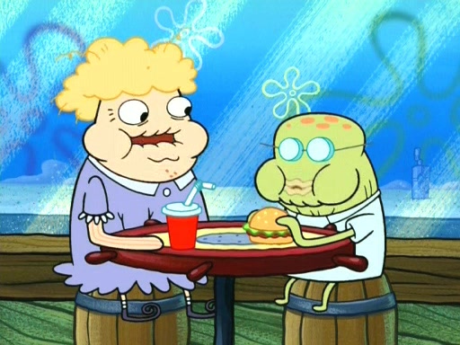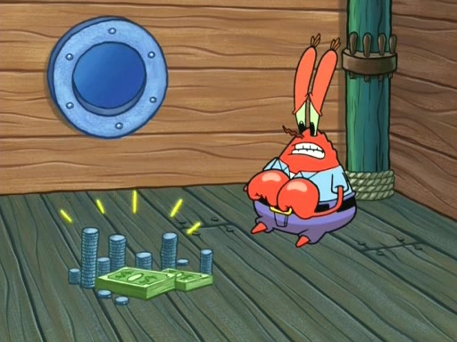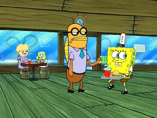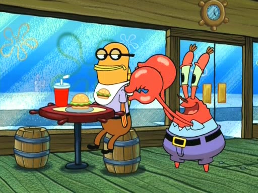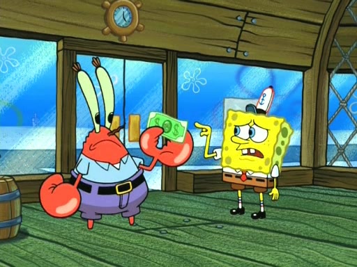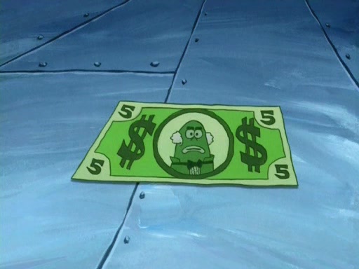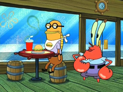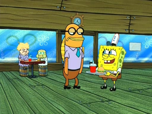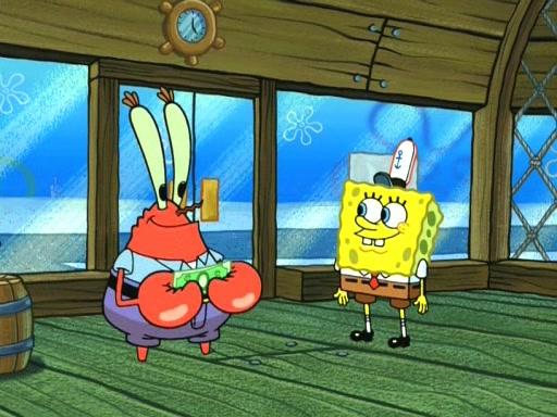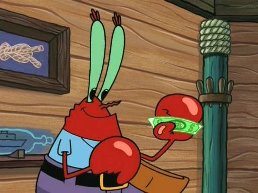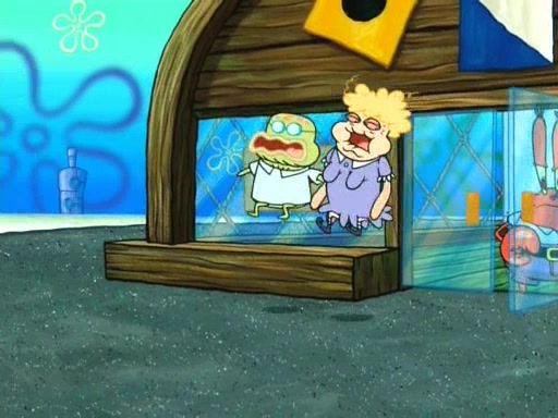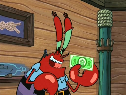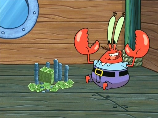 At the Krusty Krab, a customer wants to sit at a certain table, but two elderly people (Old Man Jenkins and Mary) are already sitting there. SpongeBob said the customer could sit at the table when they are done although the guy said he would pay $5 if he gets it now. Mr. Krabs agrees with this offer, and kicks the old people out. Mr. Krabs then says "Money talks," likes the idea, and wishes he could talk to money.