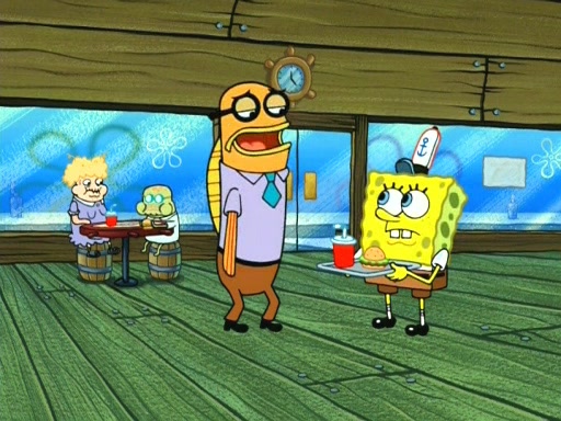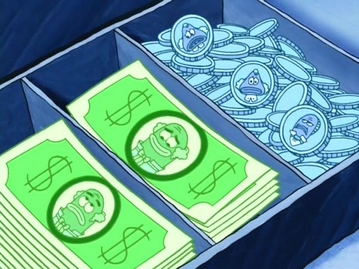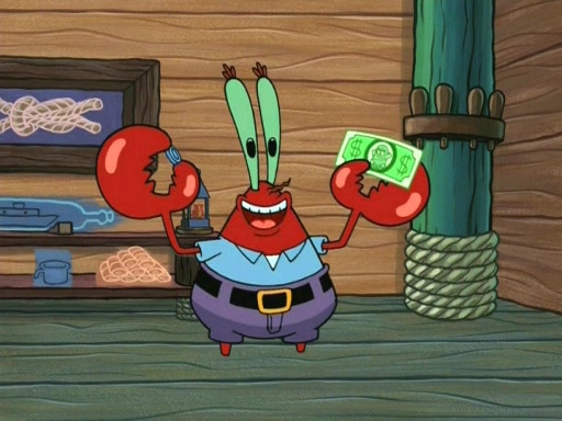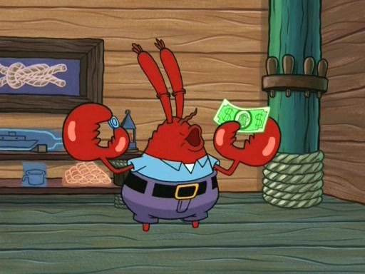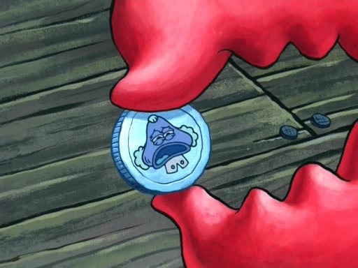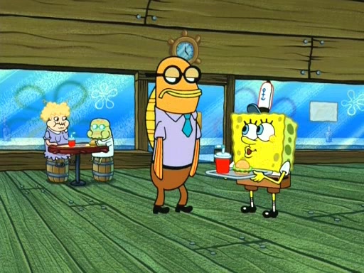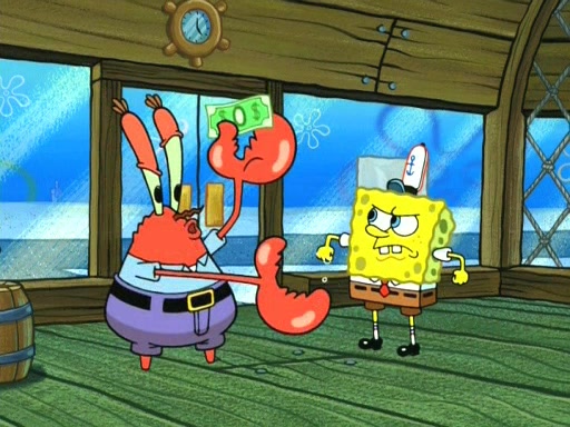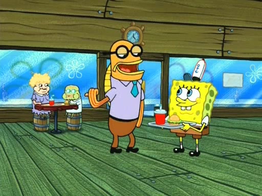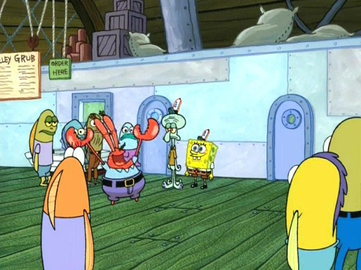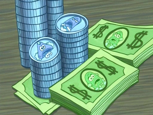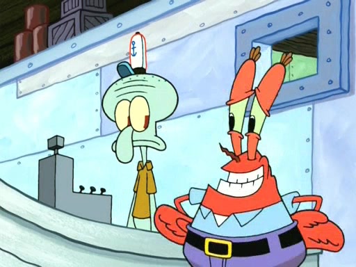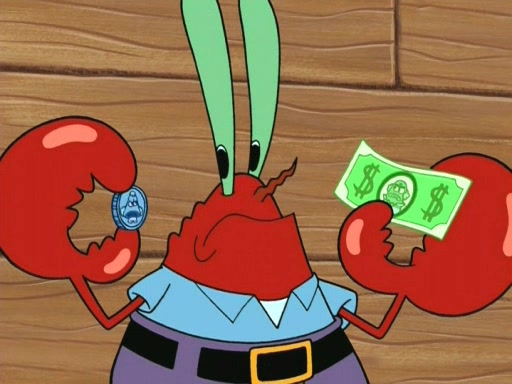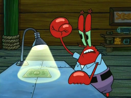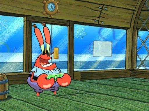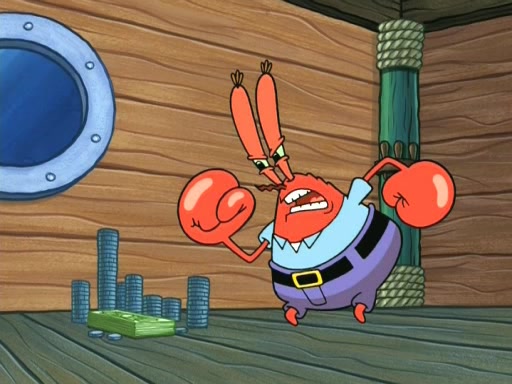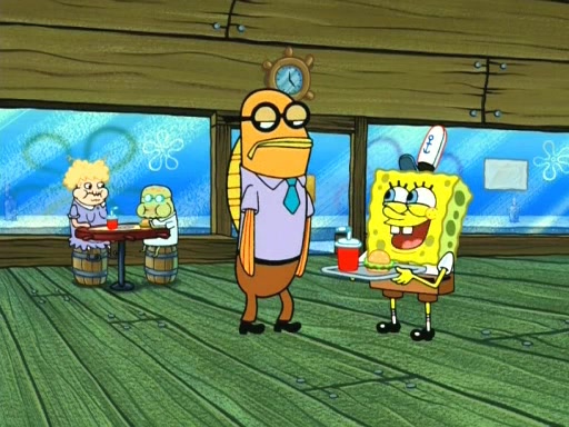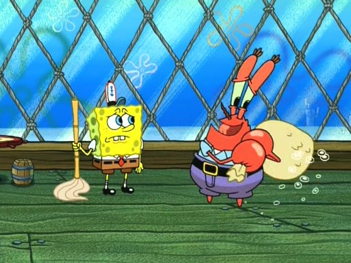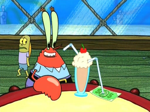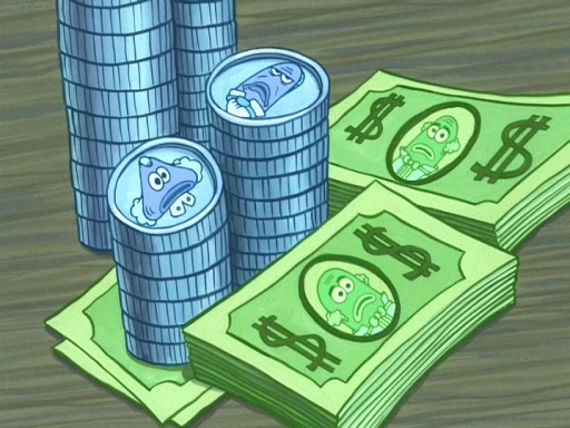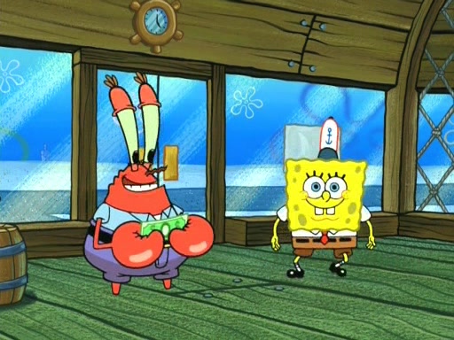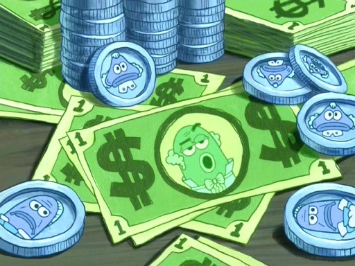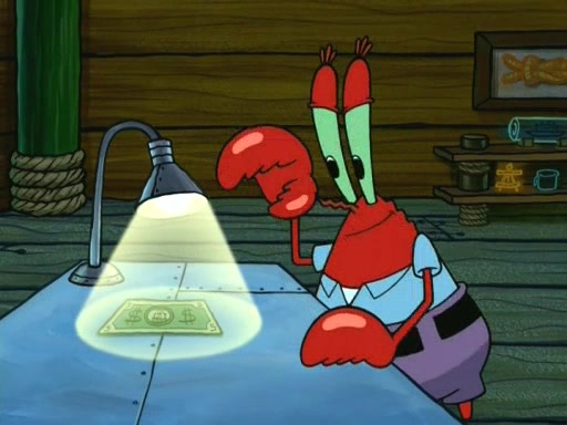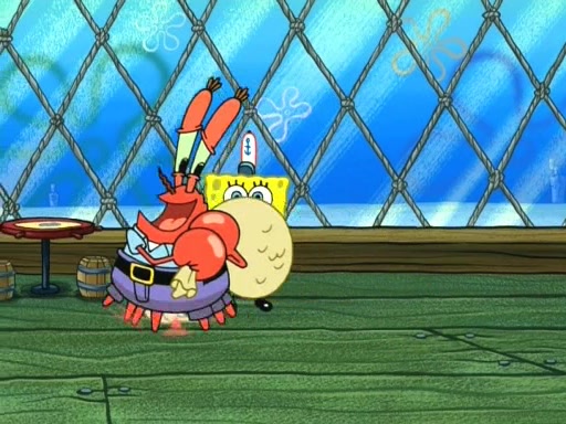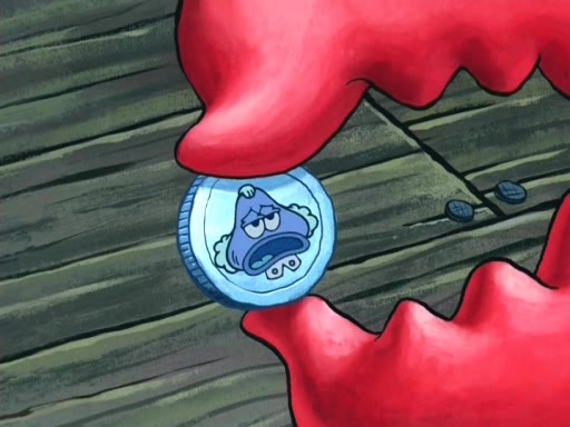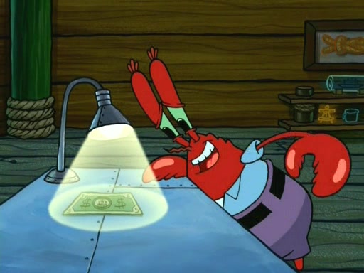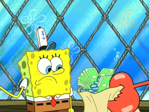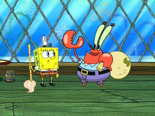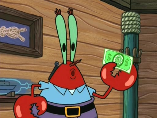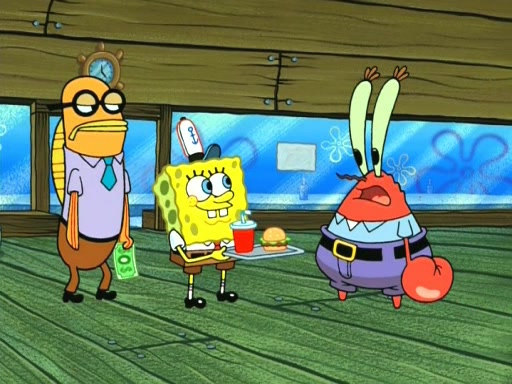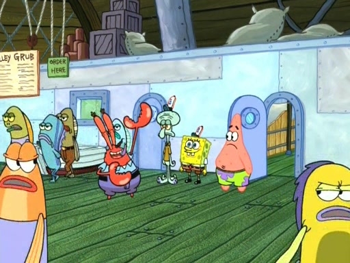 At the Krusty Krab, a customer wants to sit at a certain table, but two elderly people (Old Man Jenkins and Mary) are already sitting there. SpongeBob said the customer could sit at the table when they are done although the guy said he would pay $5 if he gets it now. Mr. Krabs agrees with this offer, and kicks the old people out. Mr. Krabs then says "Money talks," likes the idea, and wishes he could talk to money.