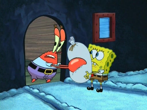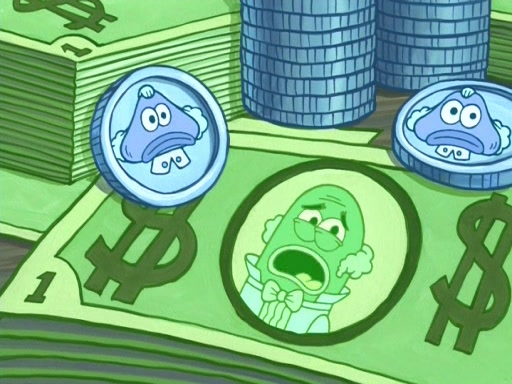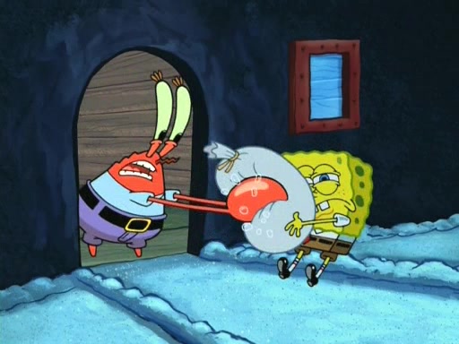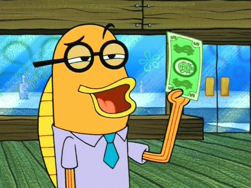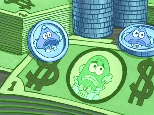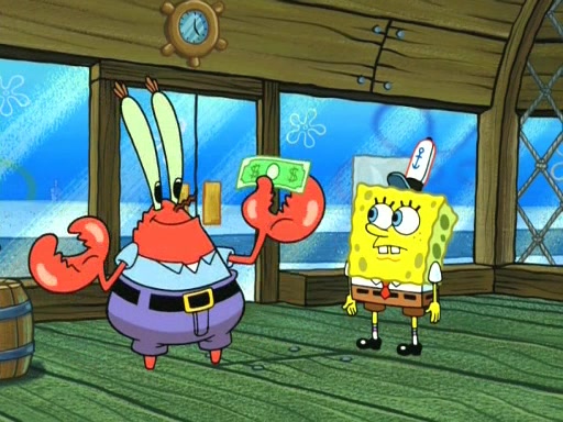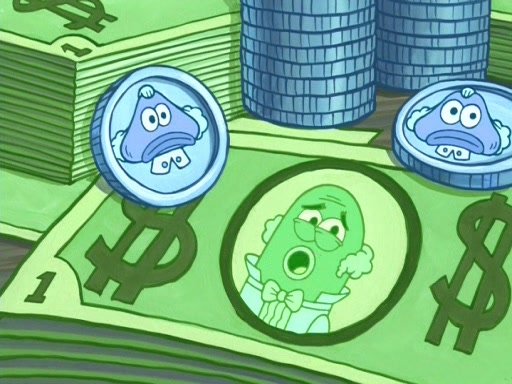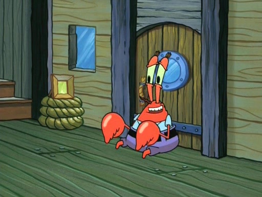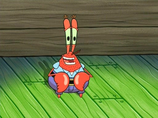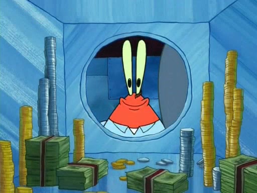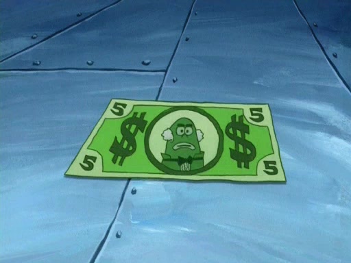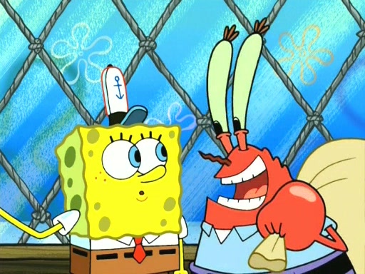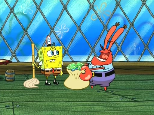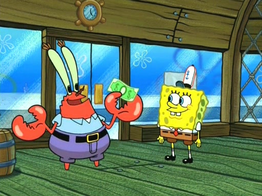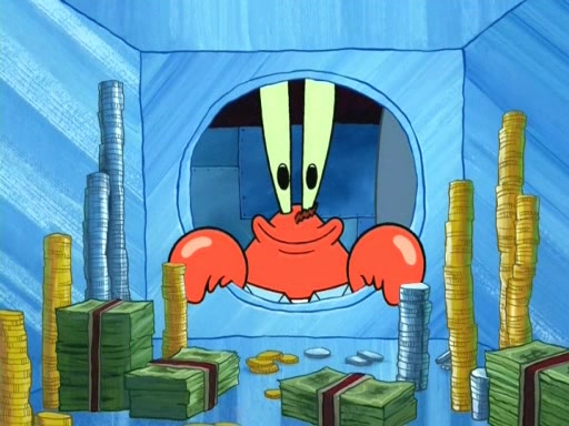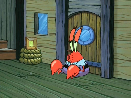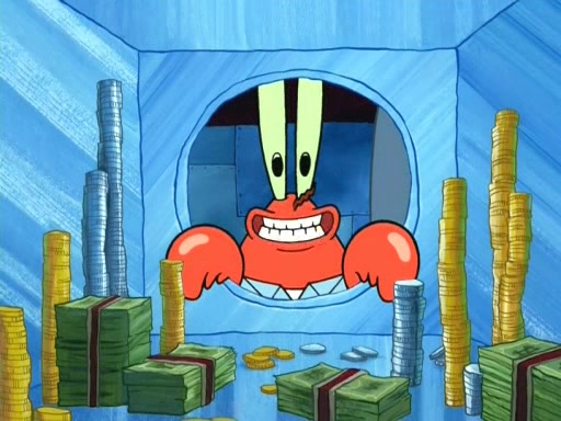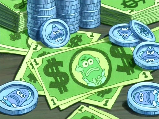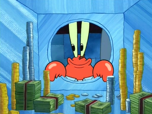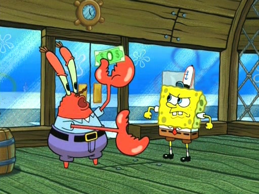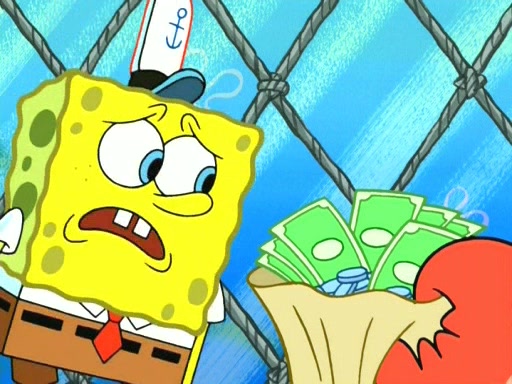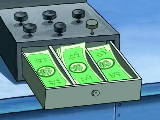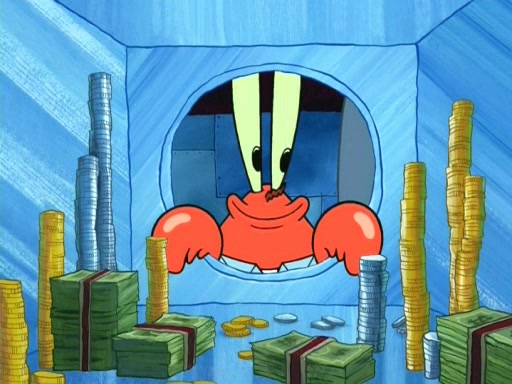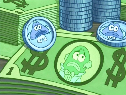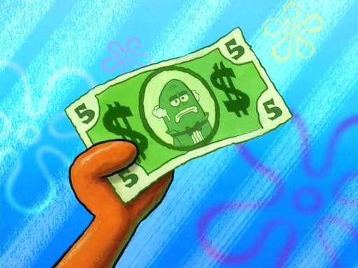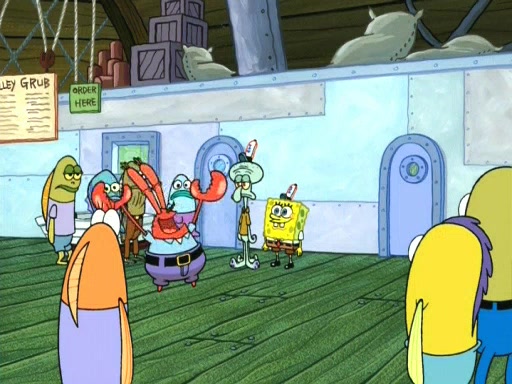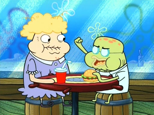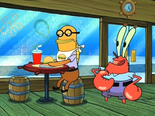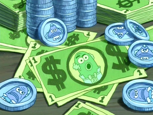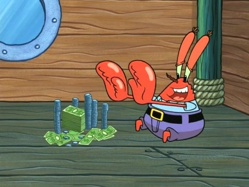At the Krusty Krab, a customer wants to sit at a certain table, but two elderly people (Old Man Jenkins and Mary) are already sitting there. SpongeBob said the customer could sit at the table when they are done although the guy said he would pay $5 if he gets it now. Mr. Krabs agrees with this offer, and kicks the old people out. Mr. Krabs then says "Money talks," likes the idea, and wishes he could talk to money.