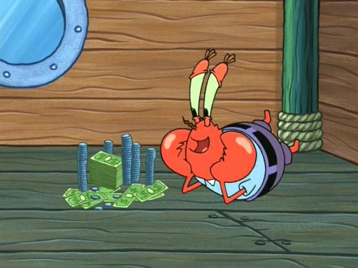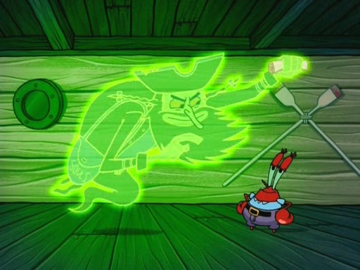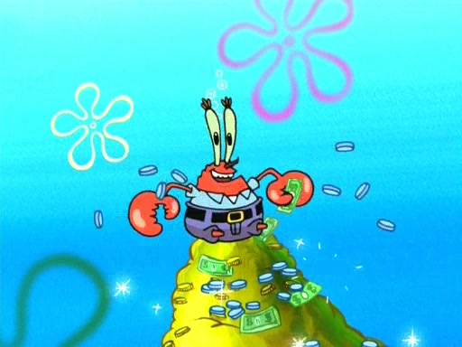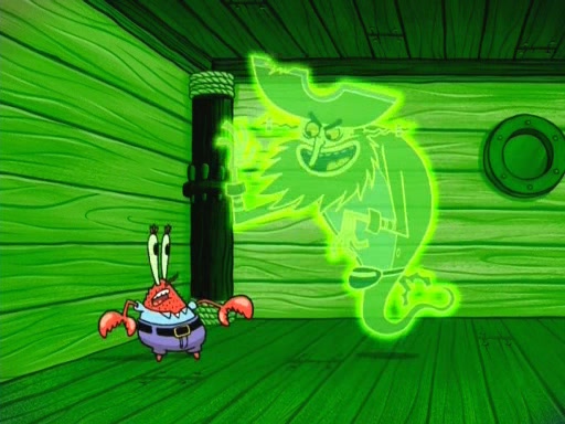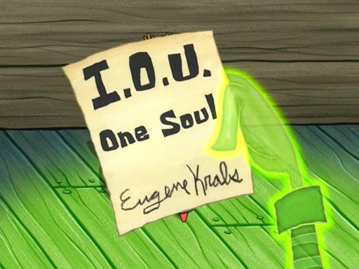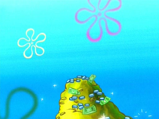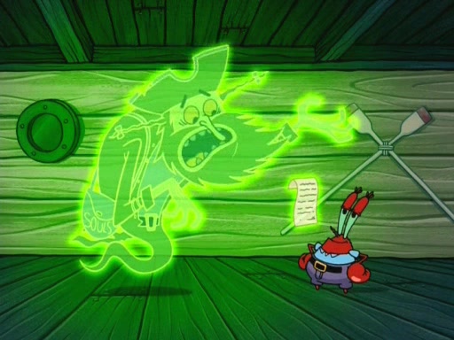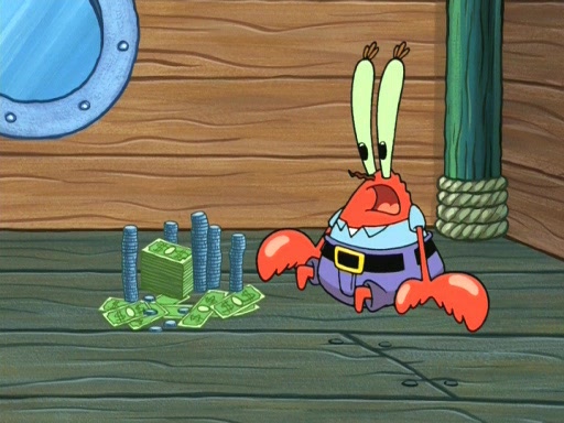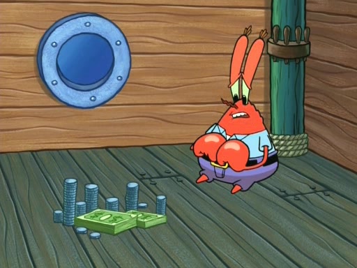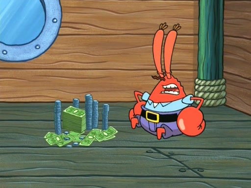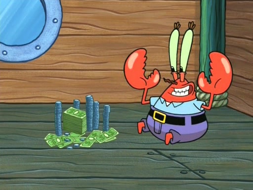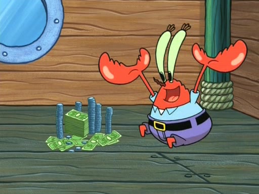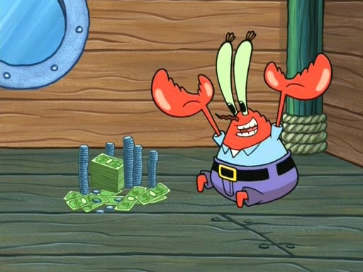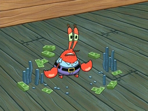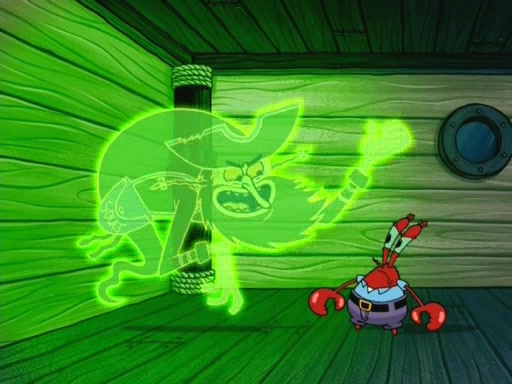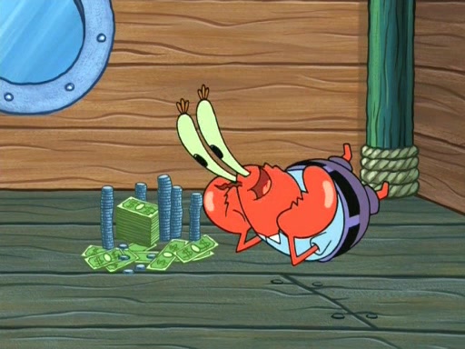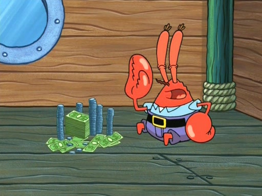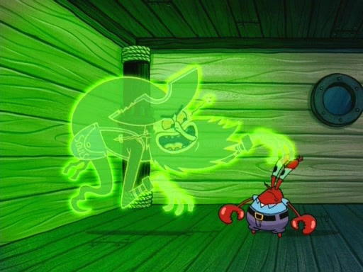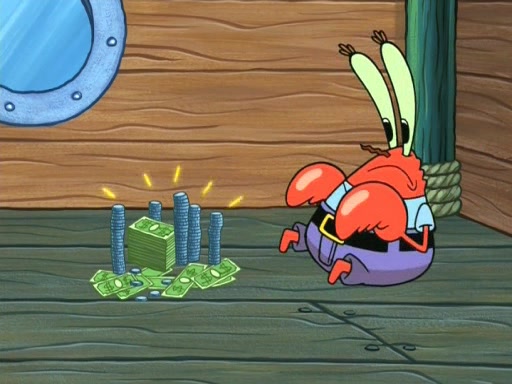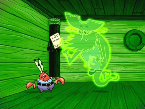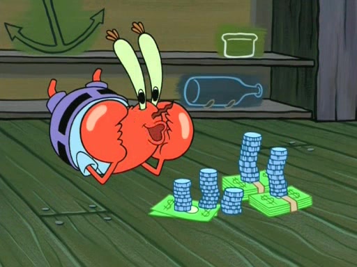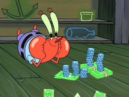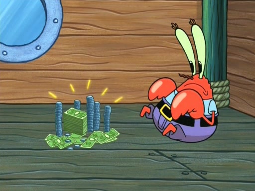 Later at his house, Mr. Krabs forces the money to talk. Of course, it doesn't. Mr. Krabs then shouts he wants to talk to money. The Flying Dutchman appears and said he would grant his wish if he sells his soul. Mr. Krabs takes the offer, and the Flying Dutchman throws pixie dust on him. Mr. Krabs then wakes up and thinks it was a dream, until he hears his money talk. At first he is delighted. He takes all the money from his safe at the Krusty Krab and takes it home. But to Mr. Krabs' disappointment, the money tells him how badly they want to be spent. He decided to spend some of it on fairy princess outfits, corn dogs, and diapers (as the money wanted). Mr. Krabs tries to put the rest of money in a bag, give it to SpongeBob, and ask him to bury it but that just makes him lose the money so he takes the bag back. Mr. Krabs becomes restless, and starts to regret his deal with the Flying Dutchman. The Flying Dutchman appears and is about to take Mr. Krabs's soul, but he said he already sold his soul. Suddenly, a group of ghosts are lined up and say that Mr. Krabs sold his soul to them too.