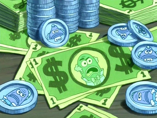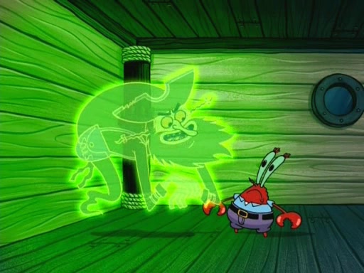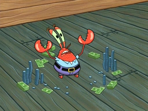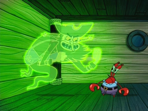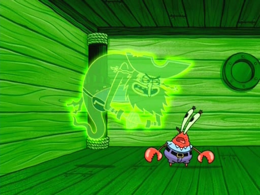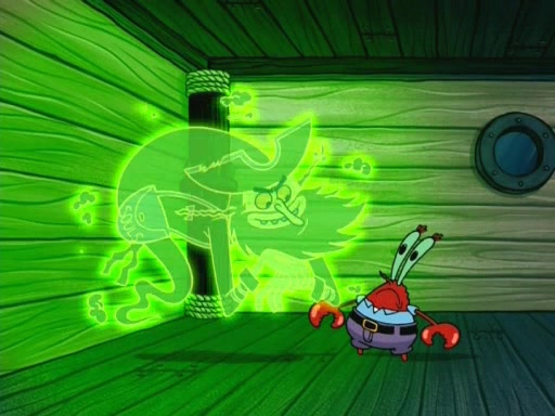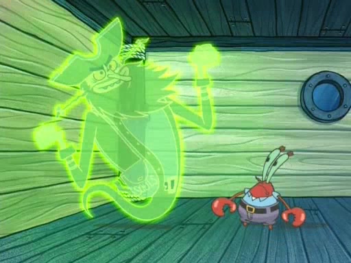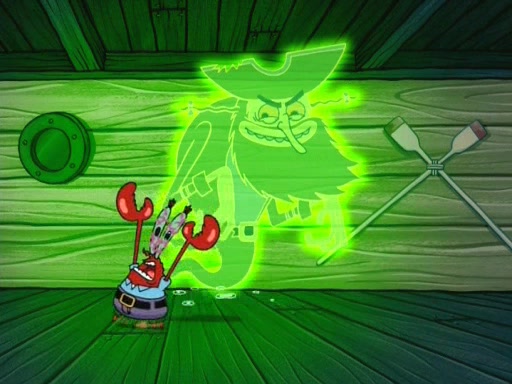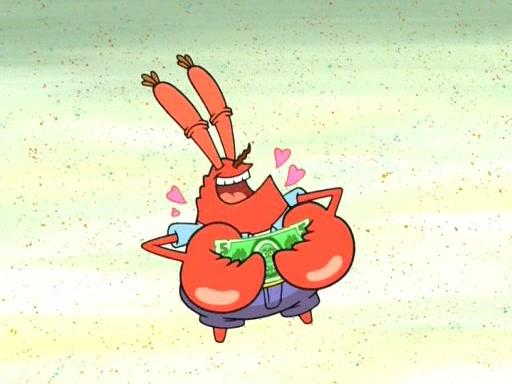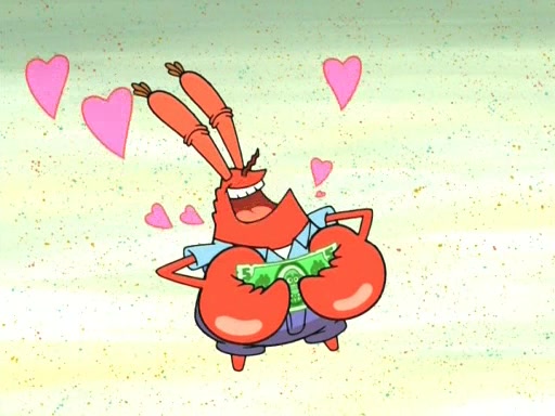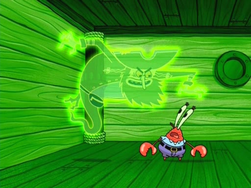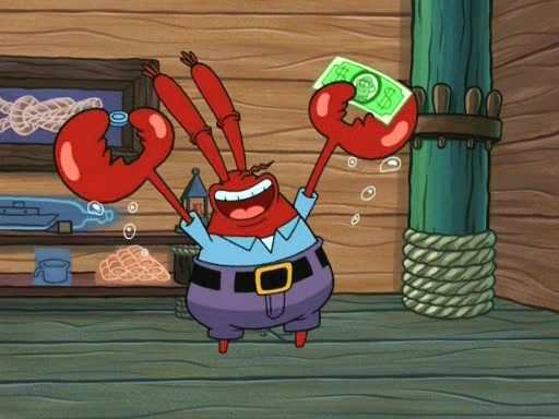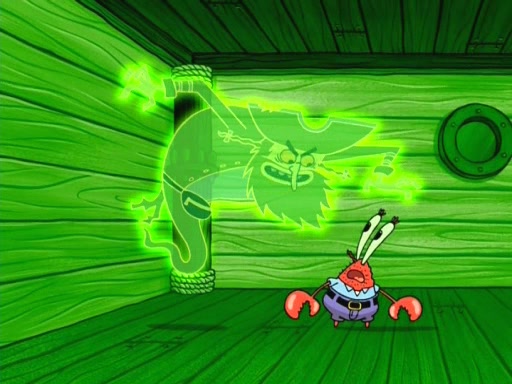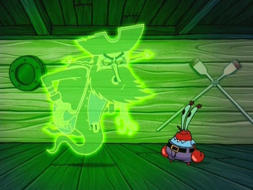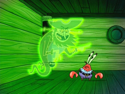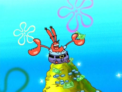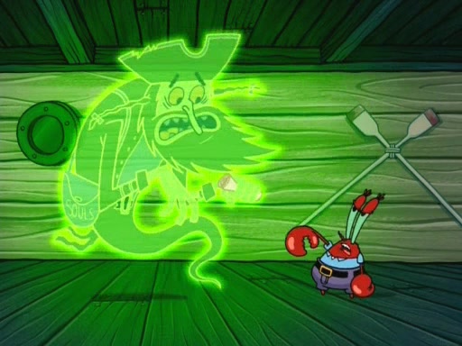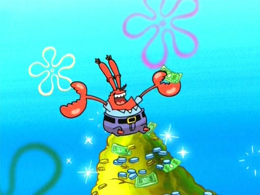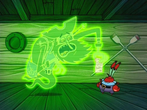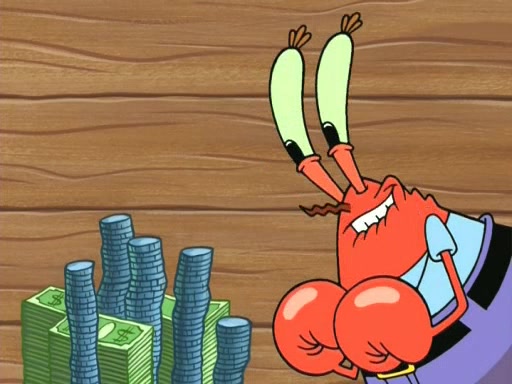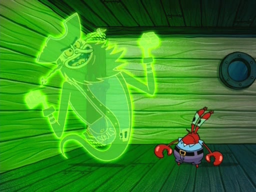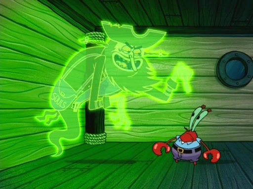 Later at his house, Mr. Krabs forces the money to talk. Of course, it doesn't. Mr. Krabs then shouts he wants to talk to money. The Flying Dutchman appears and said he would grant his wish if he sells his soul. Mr. Krabs takes the offer, and the Flying Dutchman throws pixie dust on him. Mr. Krabs then wakes up and thinks it was a dream, until he hears his money talk. At first he is delighted. He takes all the money from his safe at the Krusty Krab and takes it home. But to Mr. Krabs' disappointment, the money tells him how badly they want to be spent. He decided to spend some of it on fairy princess outfits, corn dogs, and diapers (as the money wanted). Mr. Krabs tries to put the rest of money in a bag, give it to SpongeBob, and ask him to bury it but that just makes him lose the money so he takes the bag back. Mr. Krabs becomes restless, and starts to regret his deal with the Flying Dutchman. The Flying Dutchman appears and is about to take Mr. Krabs's soul, but he said he already sold his soul. Suddenly, a group of ghosts are lined up and say that Mr. Krabs sold his soul to them too.