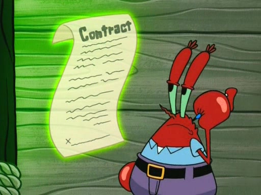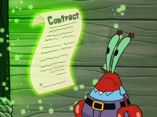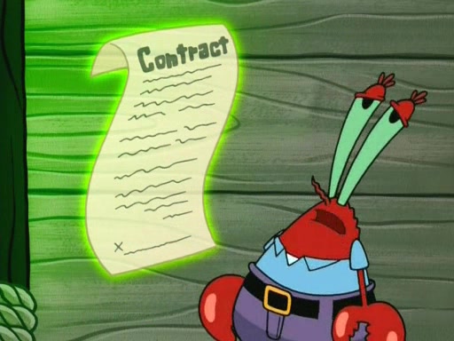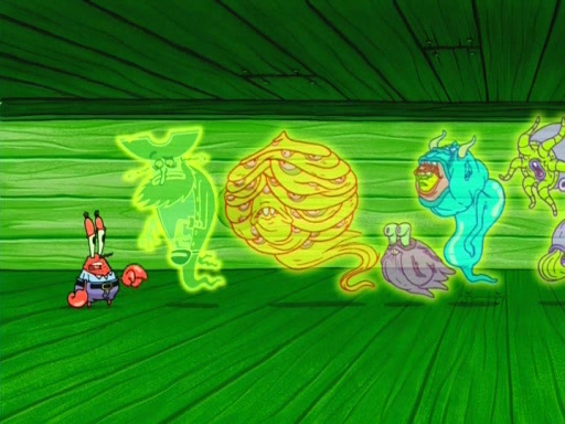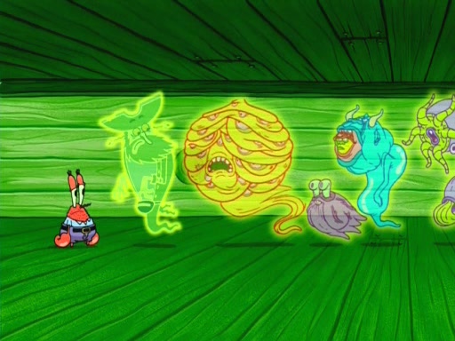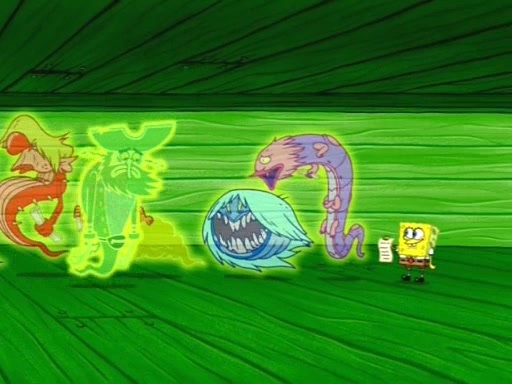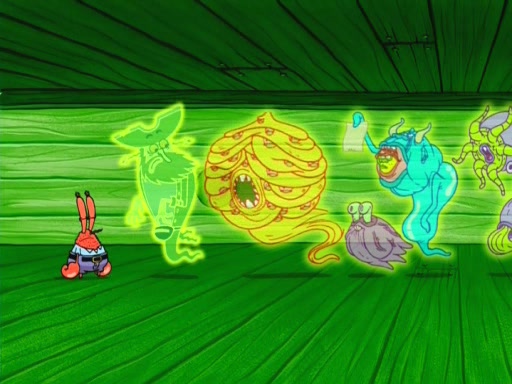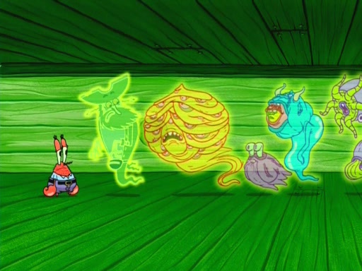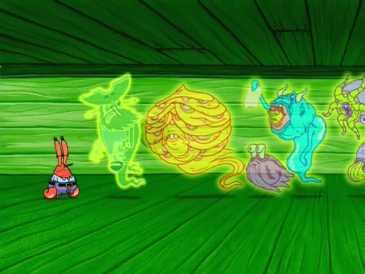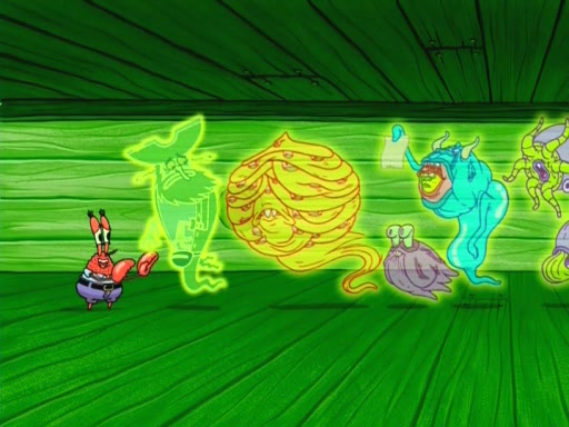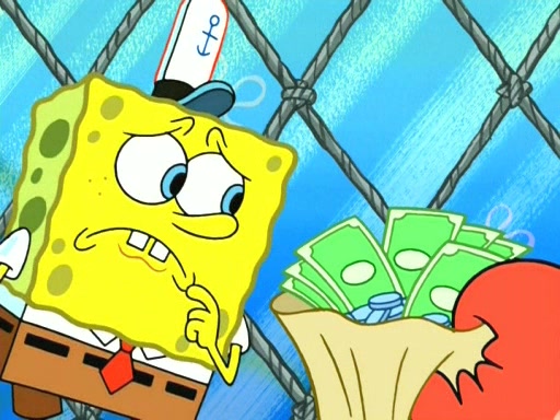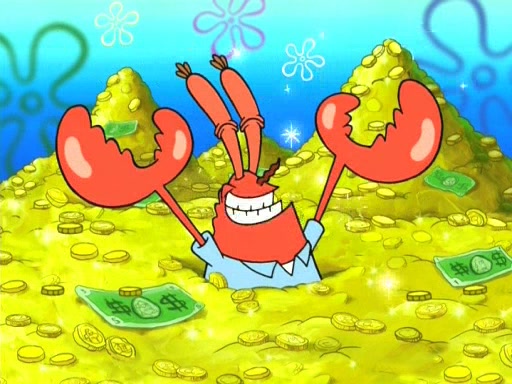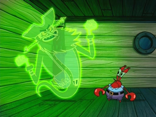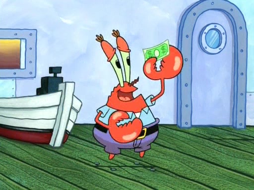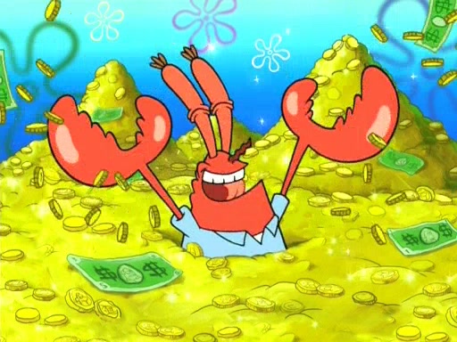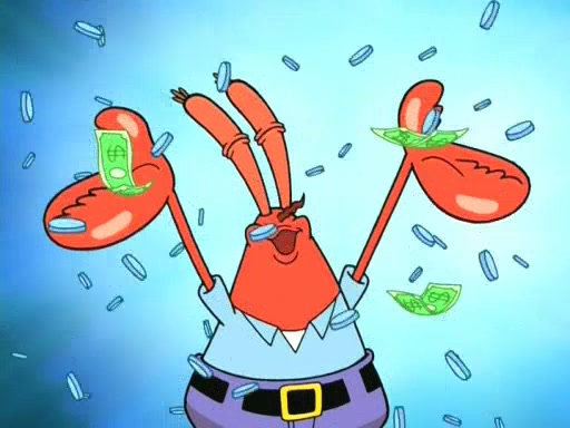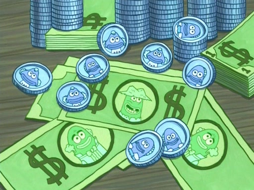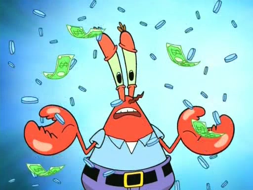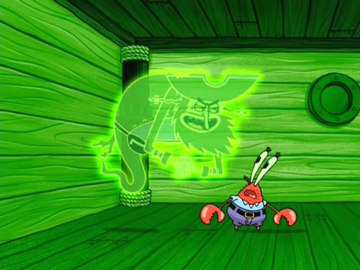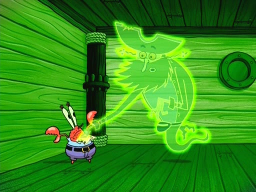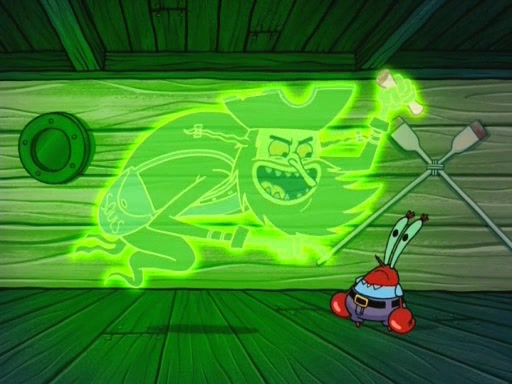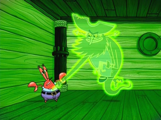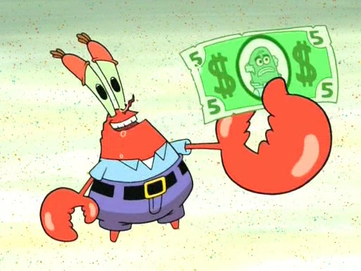 Later at his house, Mr. Krabs forces the money to talk. Of course, it doesn't. Mr. Krabs then shouts he wants to talk to money. The Flying Dutchman appears and said he would grant his wish if he sells his soul. Mr. Krabs takes the offer, and the Flying Dutchman throws pixie dust on him. Mr. Krabs then wakes up and thinks it was a dream, until he hears his money talk. At first he is delighted. He takes all the money from his safe at the Krusty Krab and takes it home. But to Mr. Krabs' disappointment, the money tells him how badly they want to be spent. He decided to spend some of it on fairy princess outfits, corn dogs, and diapers (as the money wanted). Mr. Krabs tries to put the rest of money in a bag, give it to SpongeBob, and ask him to bury it but that just makes him lose the money so he takes the bag back. Mr. Krabs becomes restless, and starts to regret his deal with the Flying Dutchman. The Flying Dutchman appears and is about to take Mr. Krabs's soul, but he said he already sold his soul. Suddenly, a group of ghosts are lined up and say that Mr. Krabs sold his soul to them too.