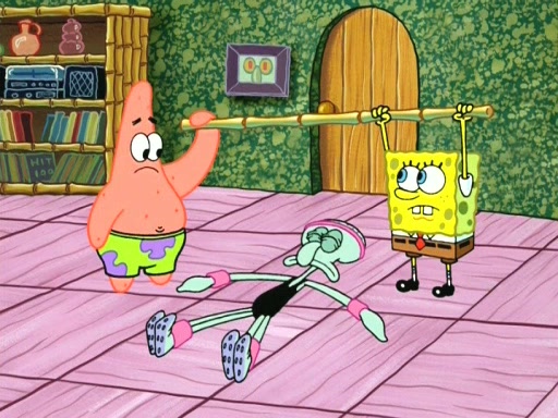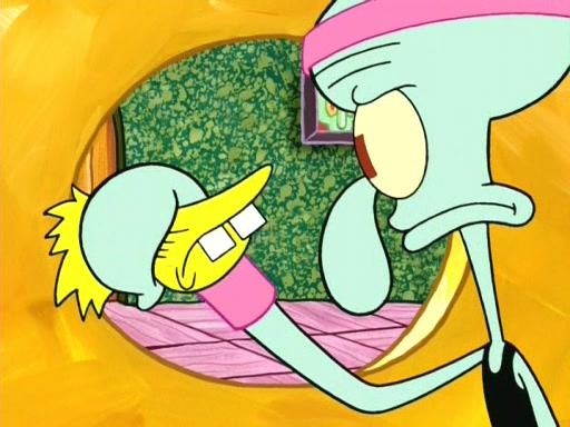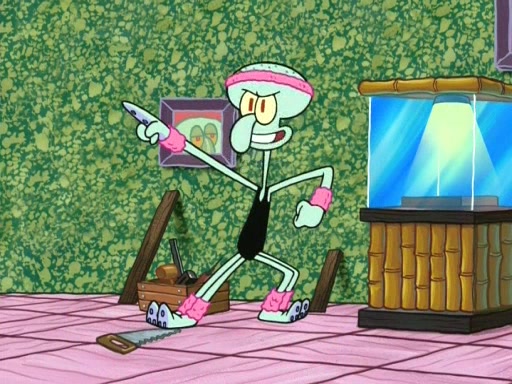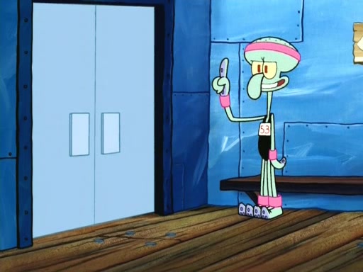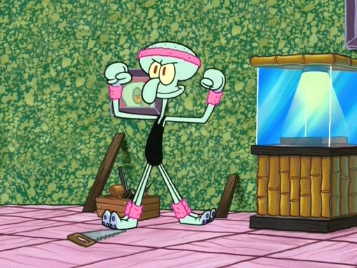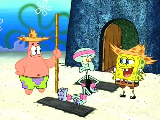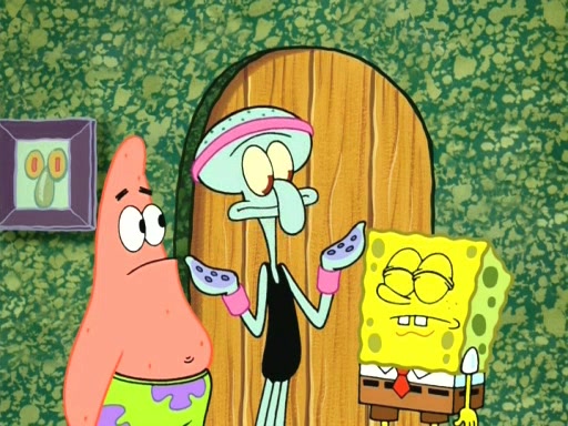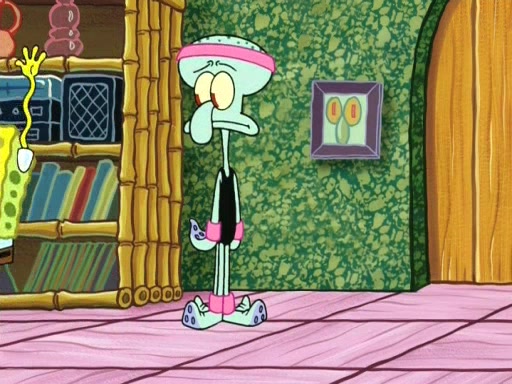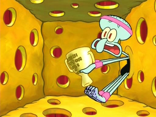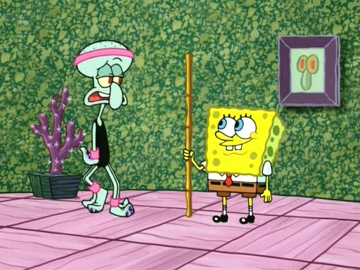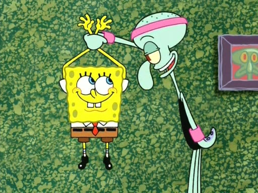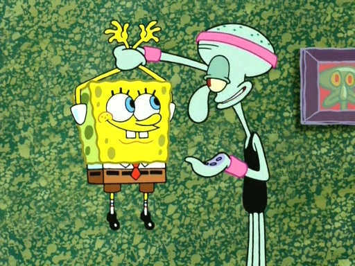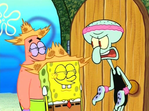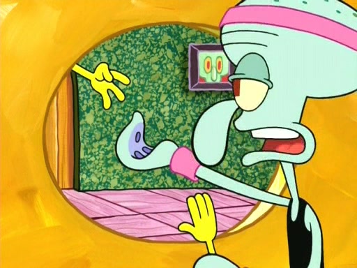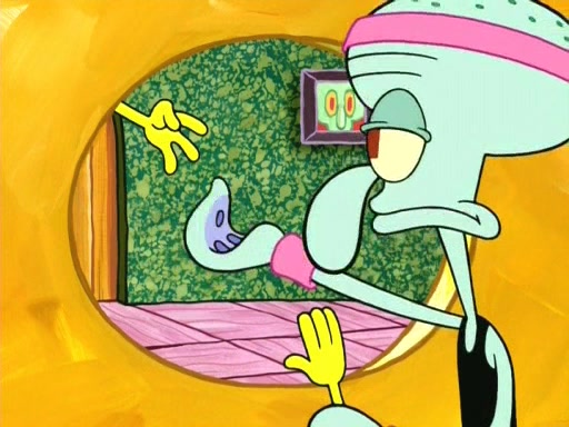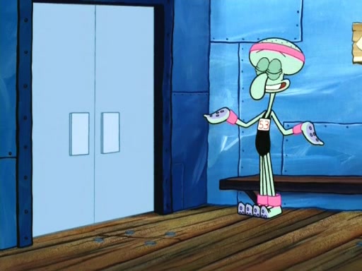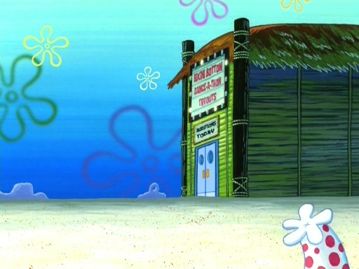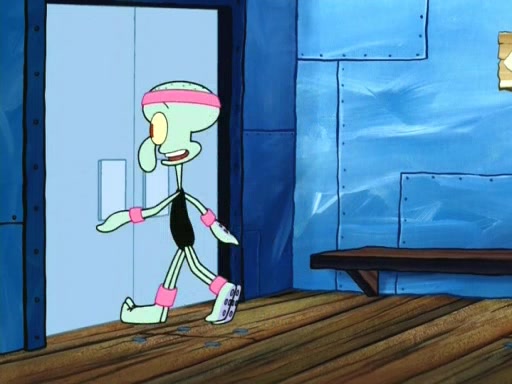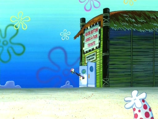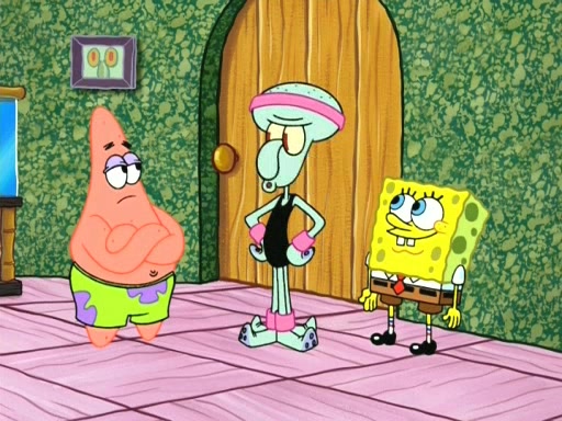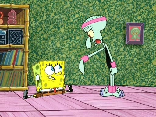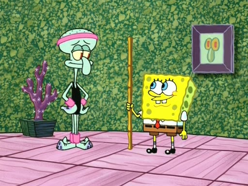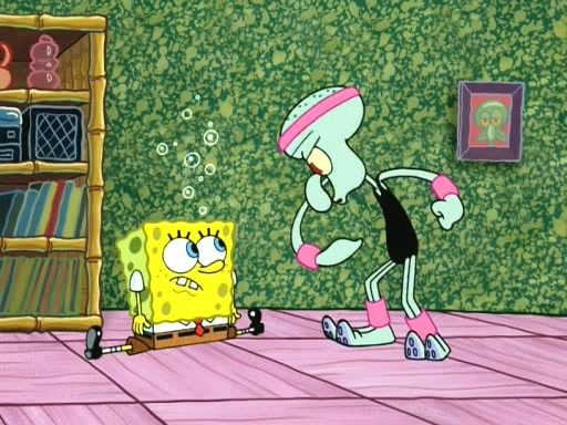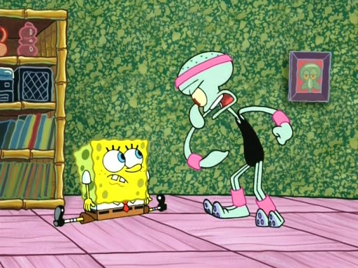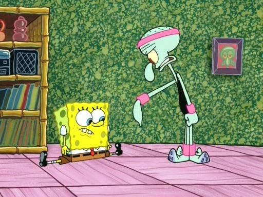 In the opening, Squidward makes a trophy case. SpongeBob and Patrick make it to the finals of the Bikini Bottom Dance-A-Thon competition while Squidward's confidence for the win is crushed when he fails to proceed to the finals, and is subsequently banned for life from the contest (and booted out of the building) when he tries to steal the trophy. Squidward's desire to win coaxes him to be the coach for SpongeBob and Patrick. Squidward wanted to see SpongeBob and Patrick's dance moves, but Patrick ends up with a butt cramp after trying to pass the limbo stick. He ends up rolling around in pain, and Squidward lets him roll out the door. Squidward asks for SpongeBob's moves, but all he has is wiggling his arms, going around and laughing. Squidward soon finds himself inside SpongeBob, which gives him an idea: Squidward gets inside of SpongeBob and controls the dancing.