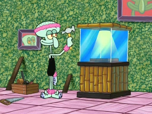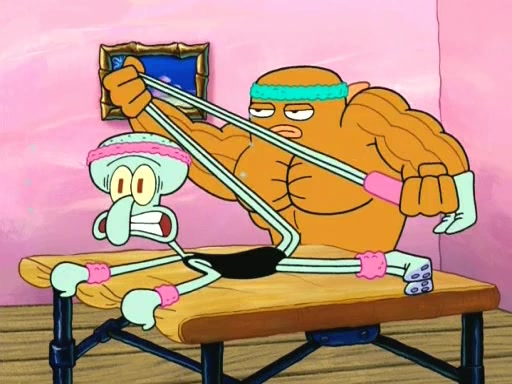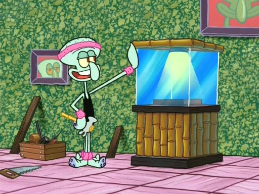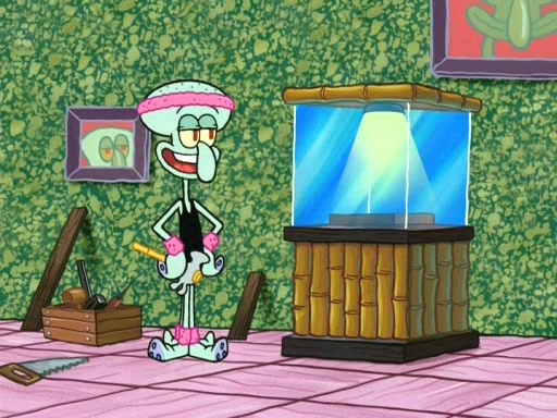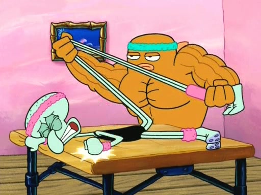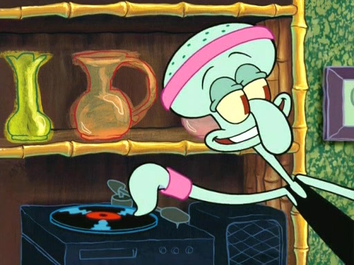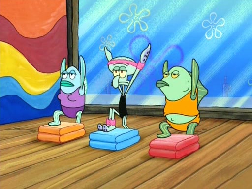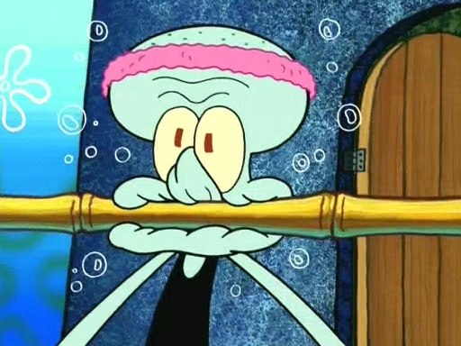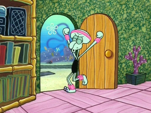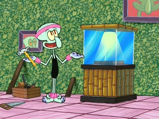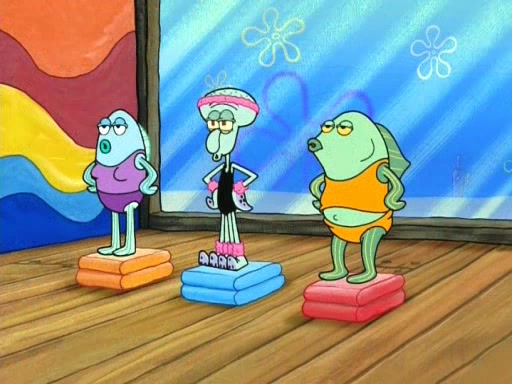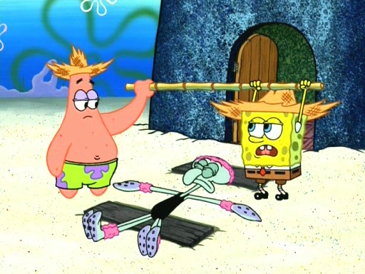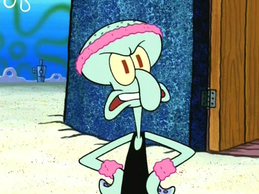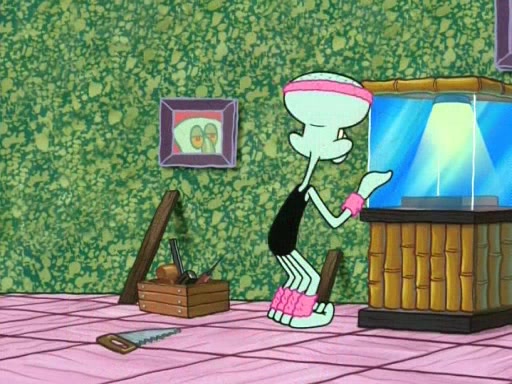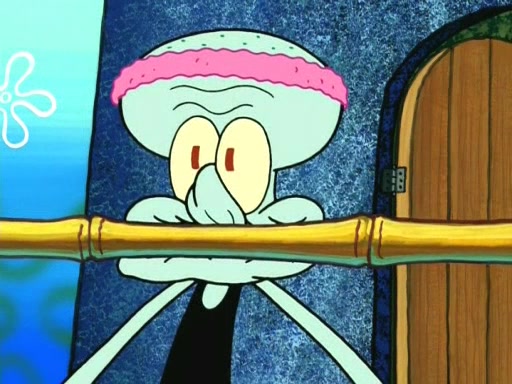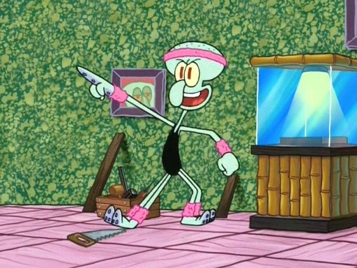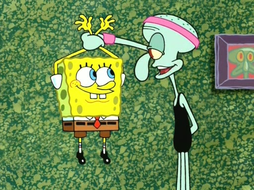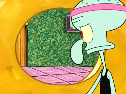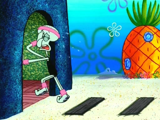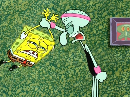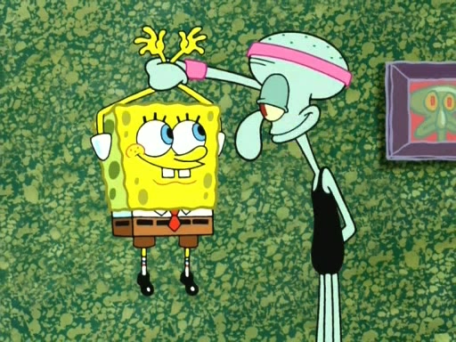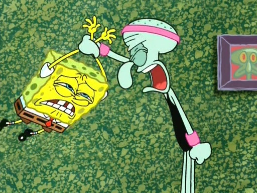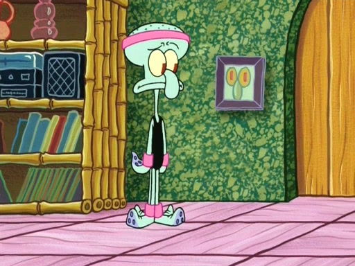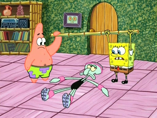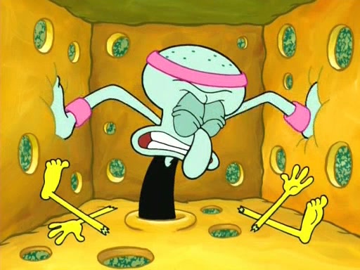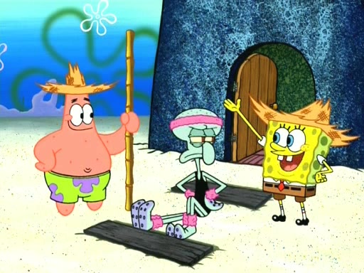 In the opening, Squidward makes a trophy case. SpongeBob and Patrick make it to the finals of the Bikini Bottom Dance-A-Thon competition while Squidward's confidence for the win is crushed when he fails to proceed to the finals, and is subsequently banned for life from the contest (and booted out of the building) when he tries to steal the trophy. Squidward's desire to win coaxes him to be the coach for SpongeBob and Patrick. Squidward wanted to see SpongeBob and Patrick's dance moves, but Patrick ends up with a butt cramp after trying to pass the limbo stick. He ends up rolling around in pain, and Squidward lets him roll out the door. Squidward asks for SpongeBob's moves, but all he has is wiggling his arms, going around and laughing. Squidward soon finds himself inside SpongeBob, which gives him an idea: Squidward gets inside of SpongeBob and controls the dancing.
