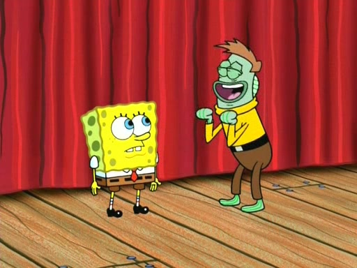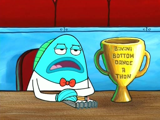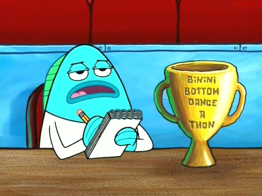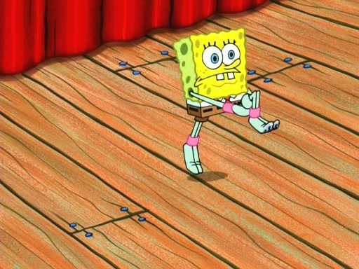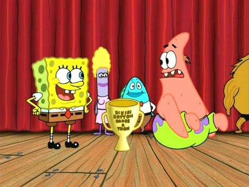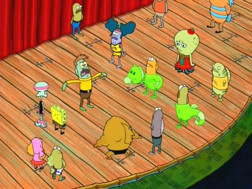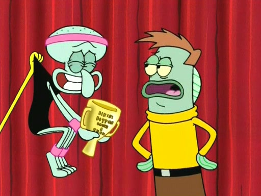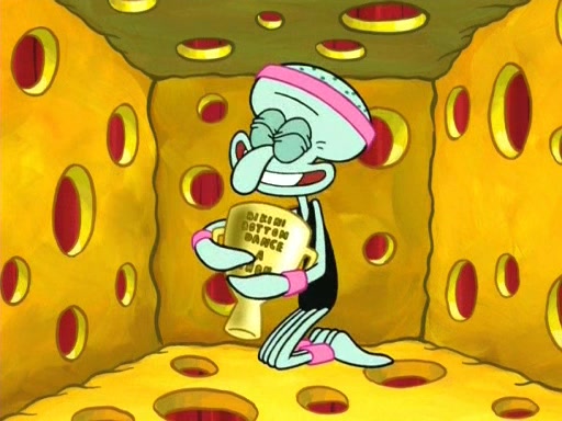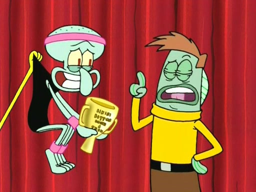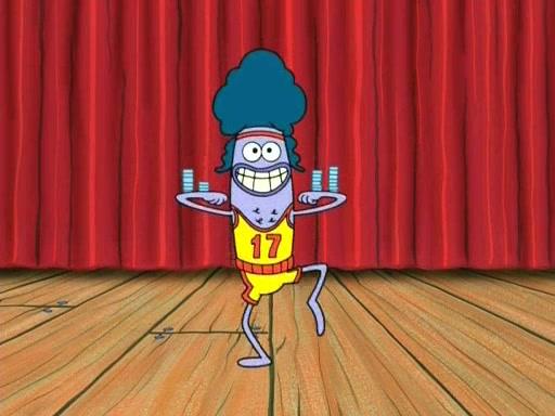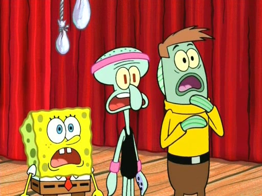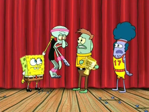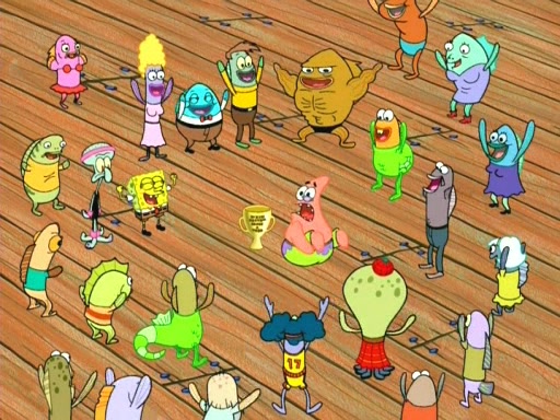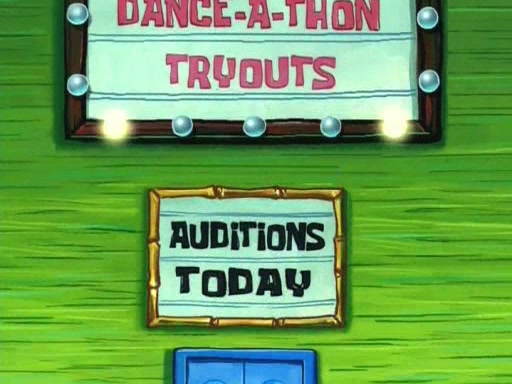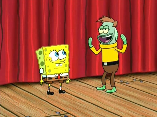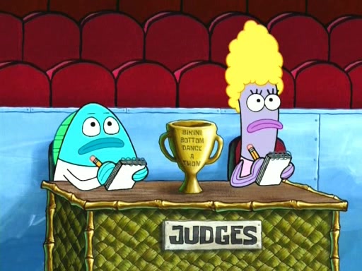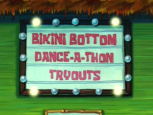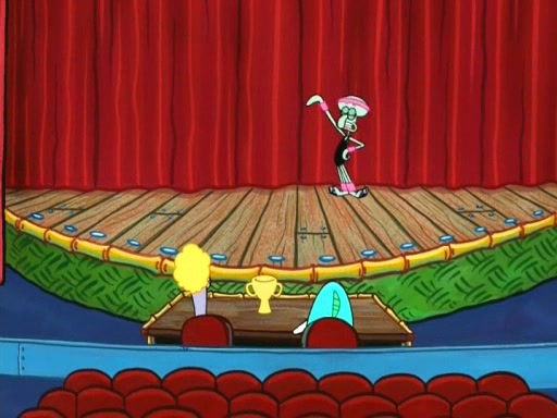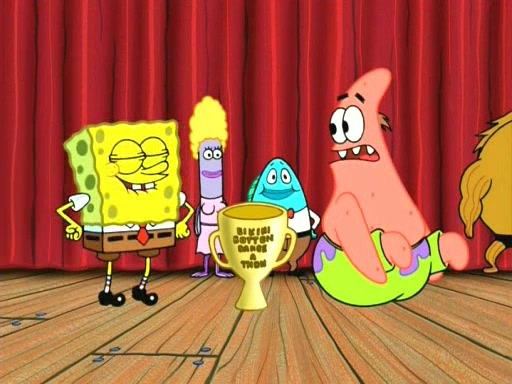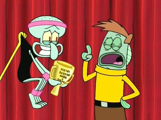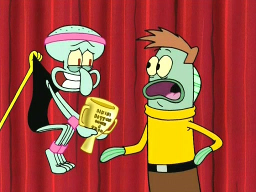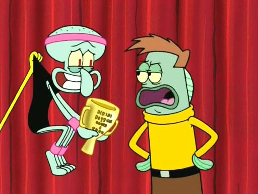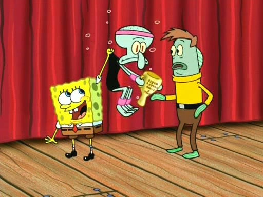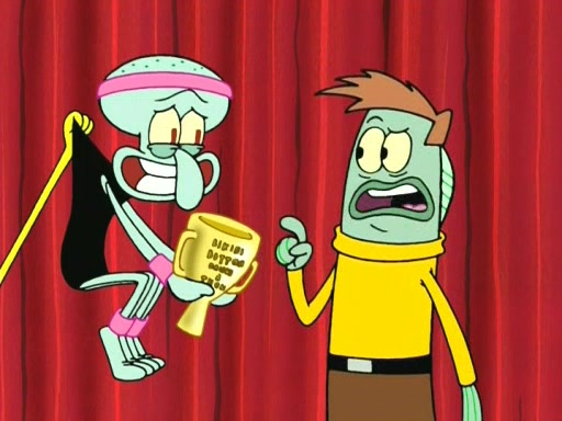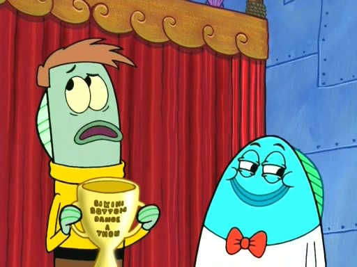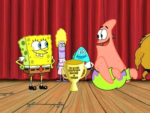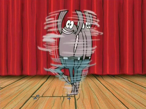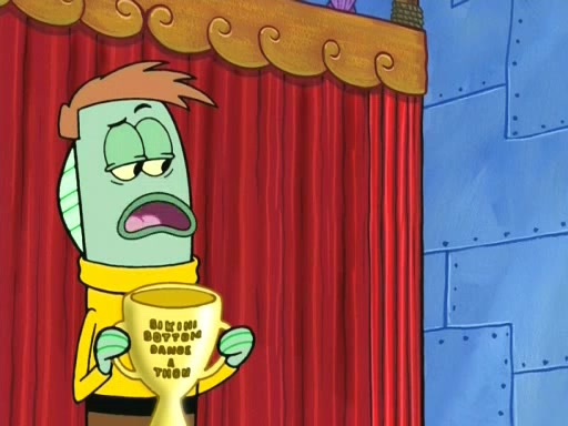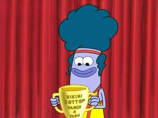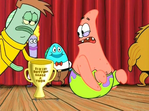 On the night of the big competition, lots of people come, as well as a coin dancer who wows the crowd and ends with a high rating. SpongeBob thinks he can't compete against that, but Squidward thinks different. When SpongeBob's up, Squidward dances, but the crowd is not enjoying it. Soon, Squidward gets a cramp in some of his tentacles, causing him to scream in pain and hold it whilst hopping around. Soon, the crowd leaves, and Fred is the last to leave. But after catching a glimpse of Squidward reacting to his cramp, he begins to call the crowd back. It isn't long before Squidward has to pull up his knee. And it isn't long when Squidward's remaining tentacles get cramped too, causing Squidward to pull that knee up too, and hold them in pain, causing SpongeBob with no arms or legs, to fall over. The crowd actually applauds at the end, which leads to SpongeBob and Squidward the trophy. SpongeBob pops out his arms and legs and begins to take the trophy, but Squidward beats him to it, causing him to have to swallow the trophy to get to Squidward. SpongeBob then says he couldn't have done it without Squidward, and pulls Squidward out of him, revealing that partnered dancers are disqualified. The trophy is confiscated from Squidward, and it turns out that literally everyone was partnered, even the coin dancer (he had someone named Pedro hidden in his hair, and he had something that popped out coins). The only individual dancer in the contest is number 52, which is indeed Patrick who also got a real cramp like Squidward did, winning him the trophy. SpongeBob says he is impressed with Patrick's new dance, whence Patrick screams before saying "Thanks."