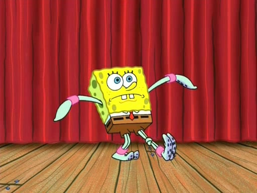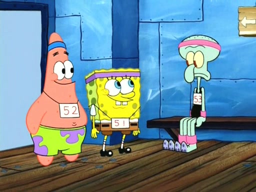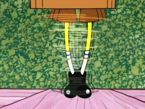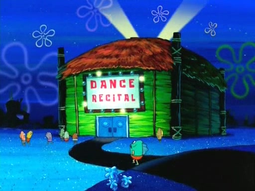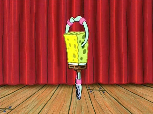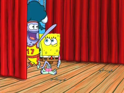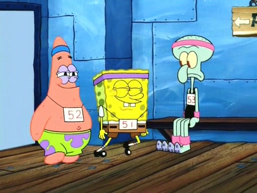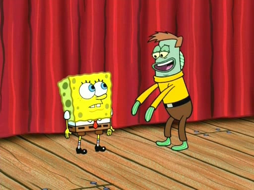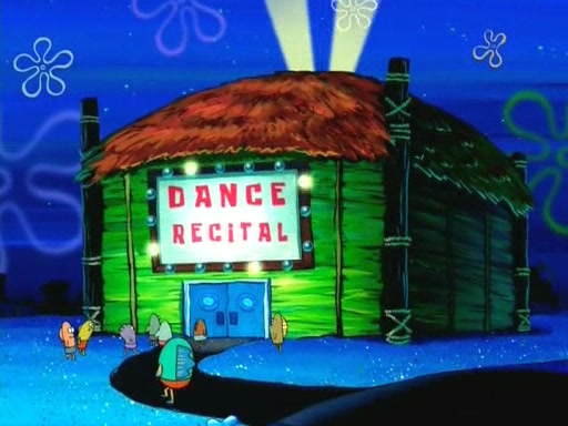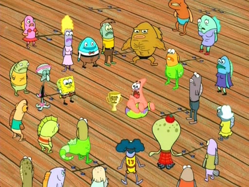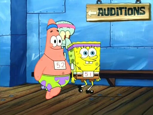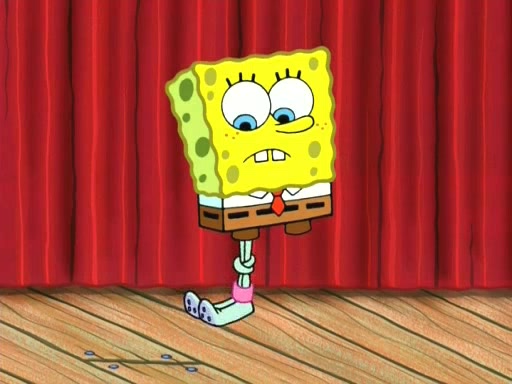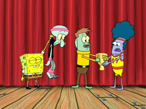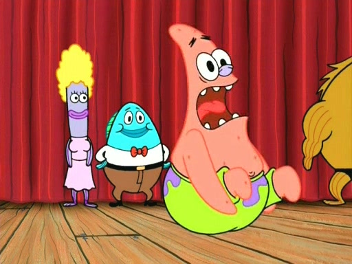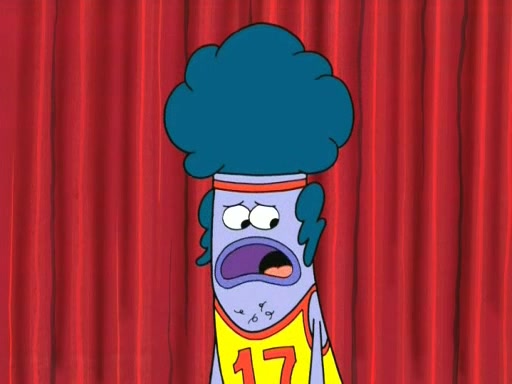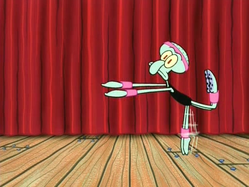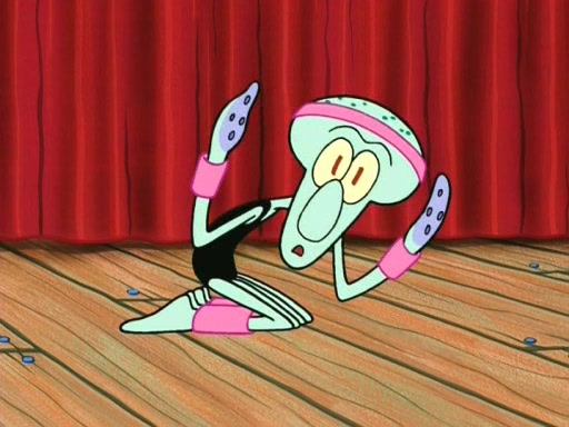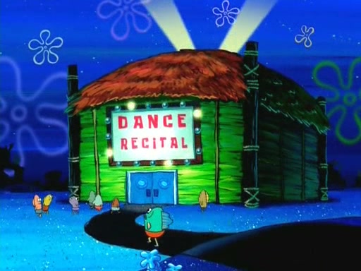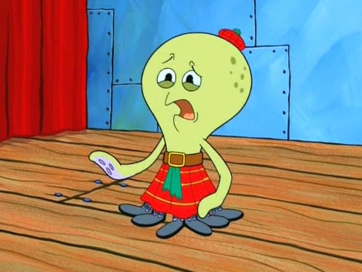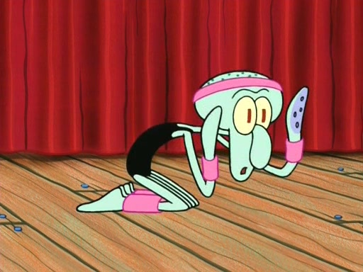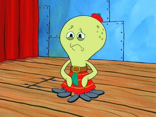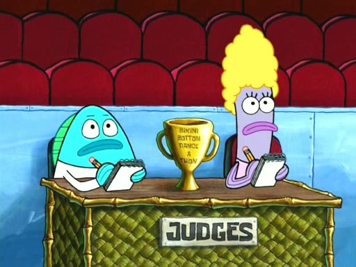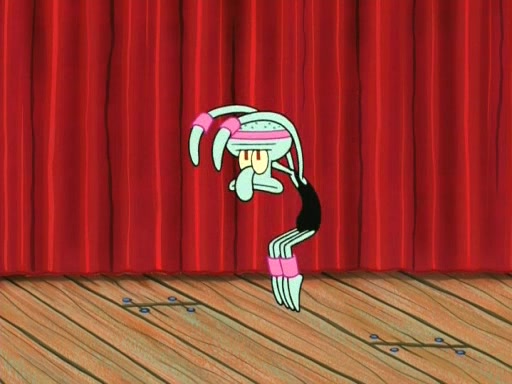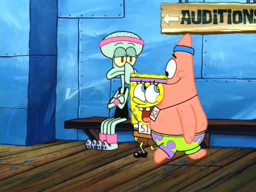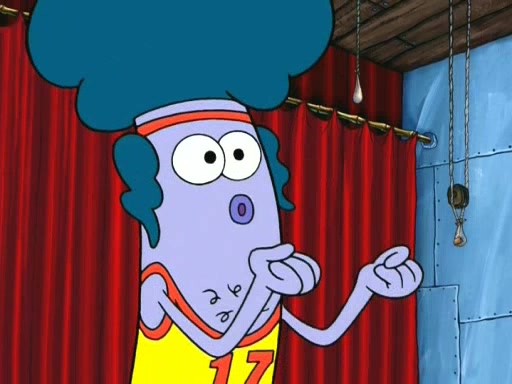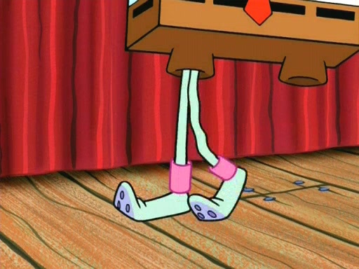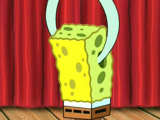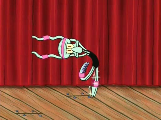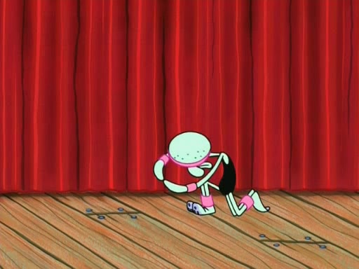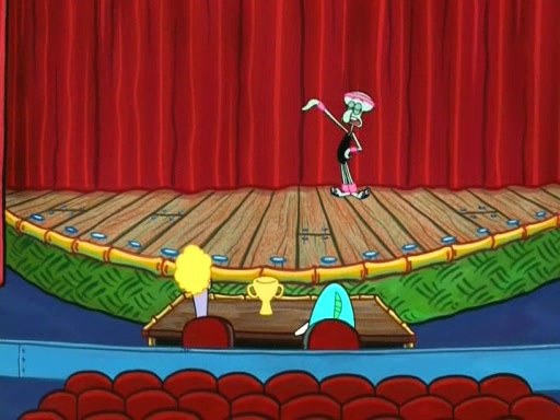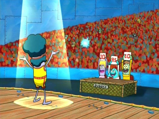On the night of the big competition, lots of people come, as well as a coin dancer who wows the crowd and ends with a high rating. SpongeBob thinks he can't compete against that, but Squidward thinks different. When SpongeBob's up, Squidward dances, but the crowd is not enjoying it. Soon, Squidward gets a cramp in some of his tentacles, causing him to scream in pain and hold it whilst hopping around. Soon, the crowd leaves, and Fred is the last to leave. But after catching a glimpse of Squidward reacting to his cramp, he begins to call the crowd back. It isn't long before Squidward has to pull up his knee. And it isn't long when Squidward's remaining tentacles get cramped too, causing Squidward to pull that knee up too, and hold them in pain, causing SpongeBob with no arms or legs, to fall over. The crowd actually applauds at the end, which leads to SpongeBob and Squidward the trophy. SpongeBob pops out his arms and legs and begins to take the trophy, but Squidward beats him to it, causing him to have to swallow the trophy to get to Squidward. SpongeBob then says he couldn't have done it without Squidward, and pulls Squidward out of him, revealing that partnered dancers are disqualified. The trophy is confiscated from Squidward, and it turns out that literally everyone was partnered, even the coin dancer (he had someone named Pedro hidden in his hair, and he had something that popped out coins). The only individual dancer in the contest is number 52, which is indeed Patrick who also got a real cramp like Squidward did, winning him the trophy. SpongeBob says he is impressed with Patrick's new dance, whence Patrick screams before saying "Thanks."
