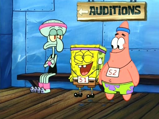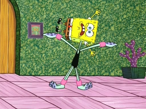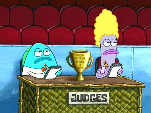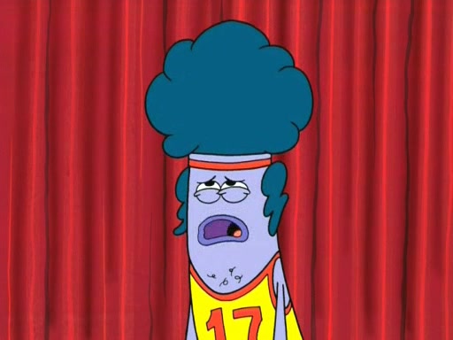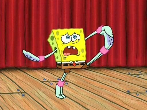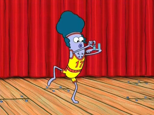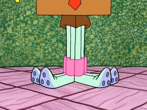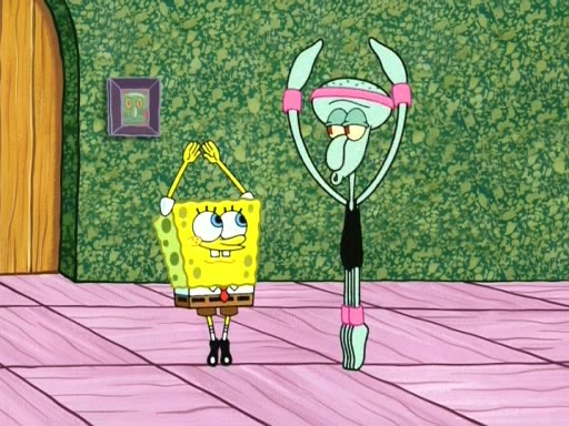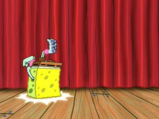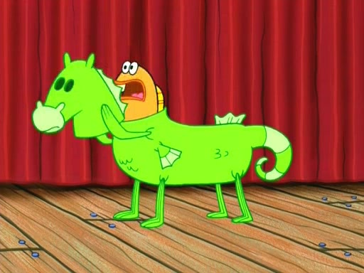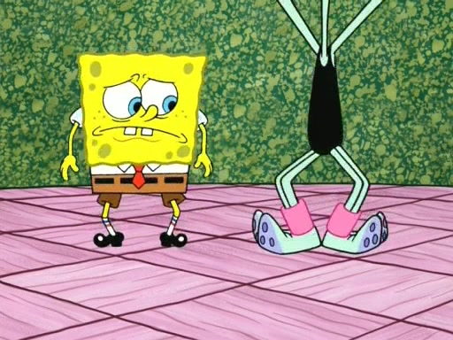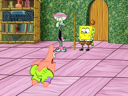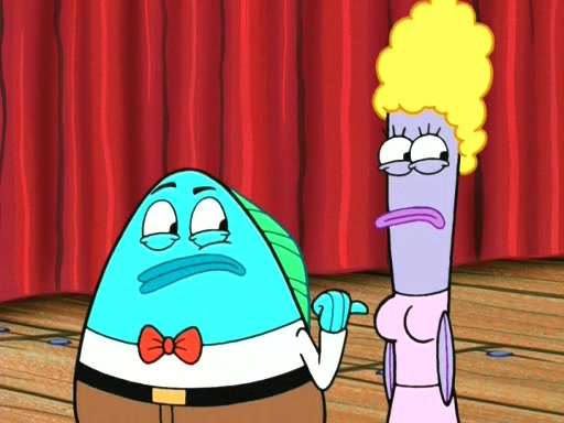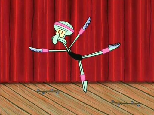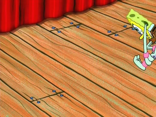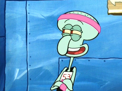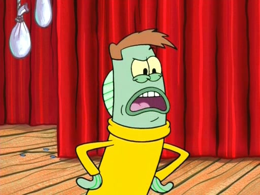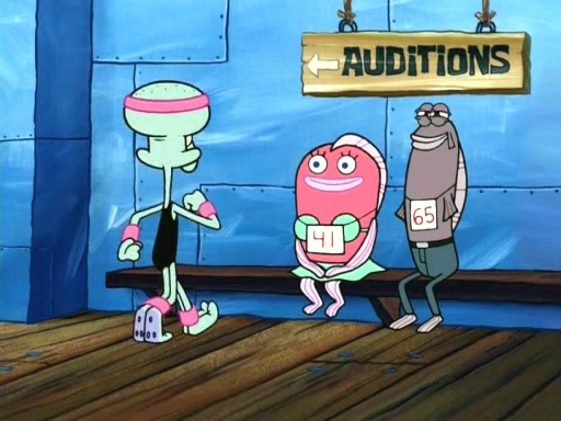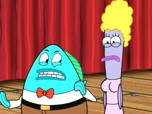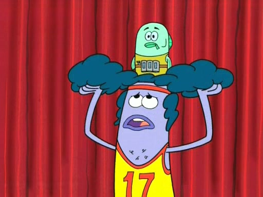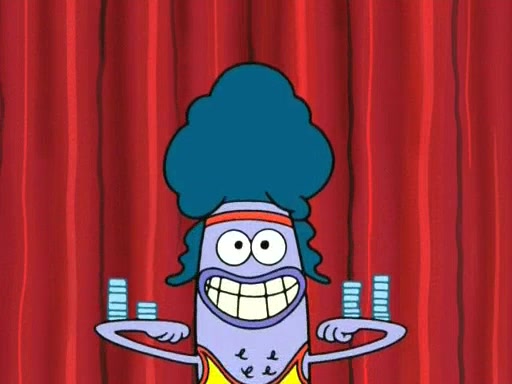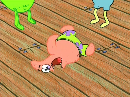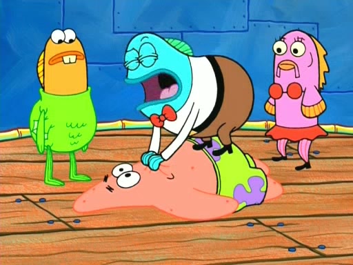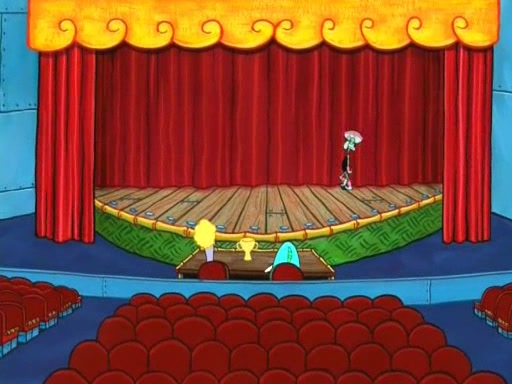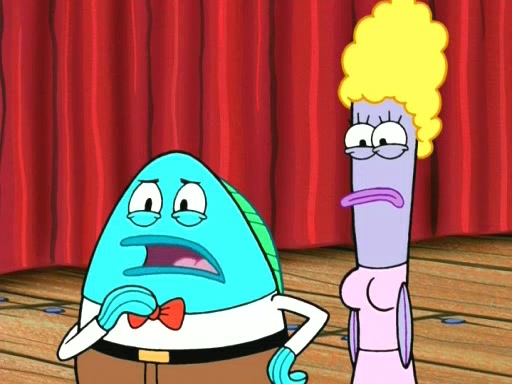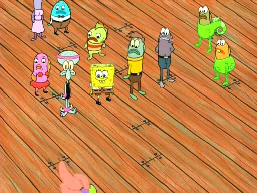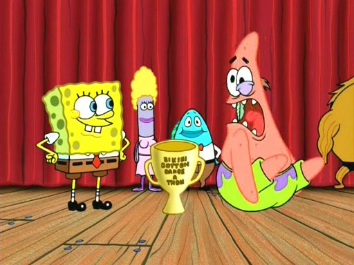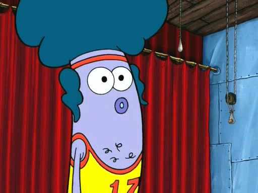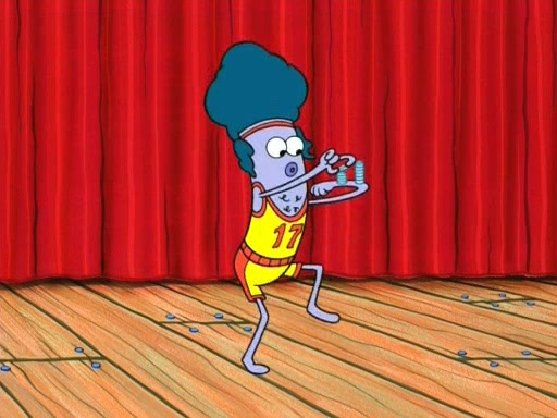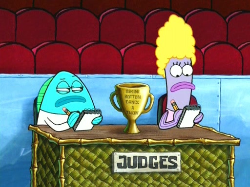 On the night of the big competition, lots of people come, as well as a coin dancer who wows the crowd and ends with a high rating. SpongeBob thinks he can't compete against that, but Squidward thinks different. When SpongeBob's up, Squidward dances, but the crowd is not enjoying it. Soon, Squidward gets a cramp in some of his tentacles, causing him to scream in pain and hold it whilst hopping around. Soon, the crowd leaves, and Fred is the last to leave. But after catching a glimpse of Squidward reacting to his cramp, he begins to call the crowd back. It isn't long before Squidward has to pull up his knee. And it isn't long when Squidward's remaining tentacles get cramped too, causing Squidward to pull that knee up too, and hold them in pain, causing SpongeBob with no arms or legs, to fall over. The crowd actually applauds at the end, which leads to SpongeBob and Squidward the trophy. SpongeBob pops out his arms and legs and begins to take the trophy, but Squidward beats him to it, causing him to have to swallow the trophy to get to Squidward. SpongeBob then says he couldn't have done it without Squidward, and pulls Squidward out of him, revealing that partnered dancers are disqualified. The trophy is confiscated from Squidward, and it turns out that literally everyone was partnered, even the coin dancer (he had someone named Pedro hidden in his hair, and he had something that popped out coins). The only individual dancer in the contest is number 52, which is indeed Patrick who also got a real cramp like Squidward did, winning him the trophy. SpongeBob says he is impressed with Patrick's new dance, whence Patrick screams before saying "Thanks."