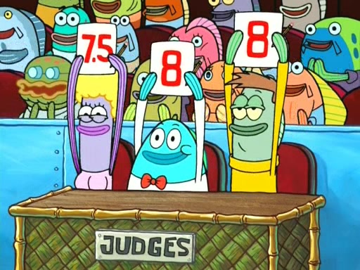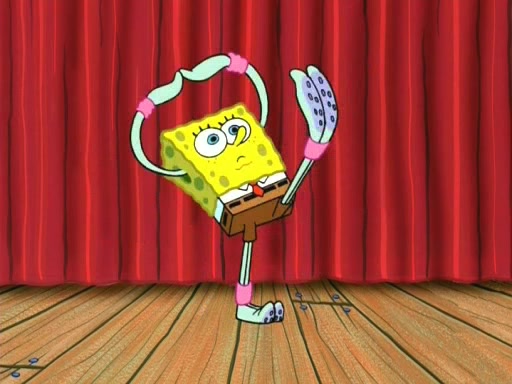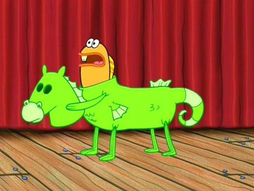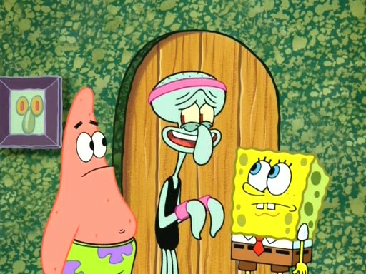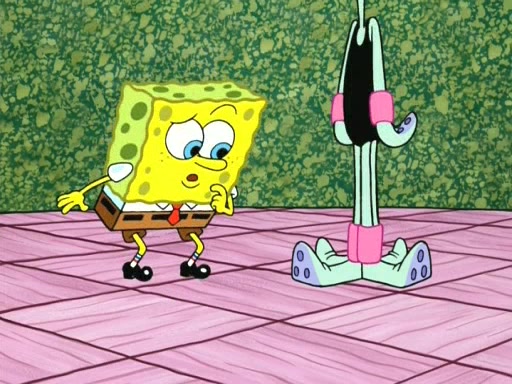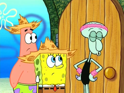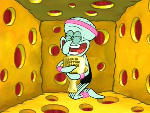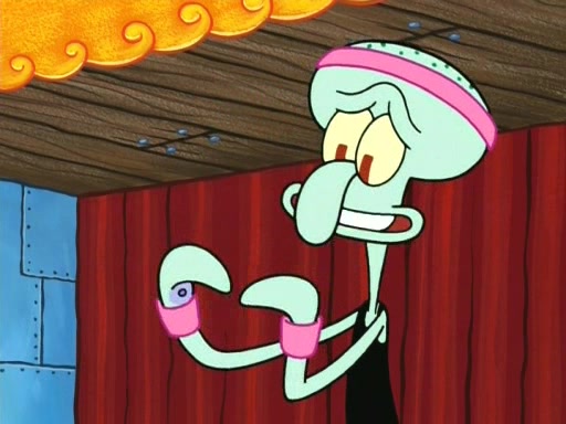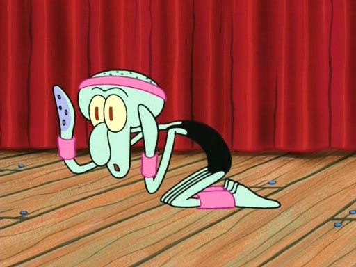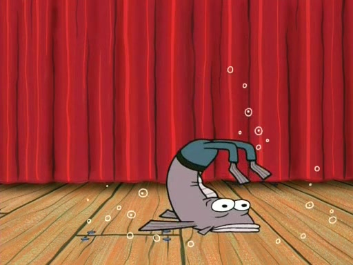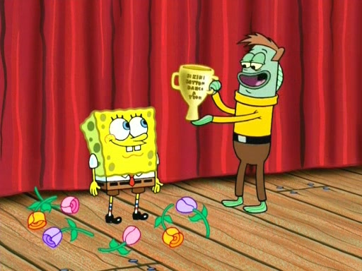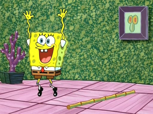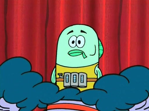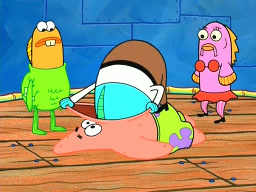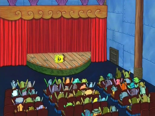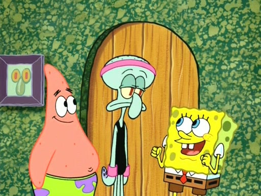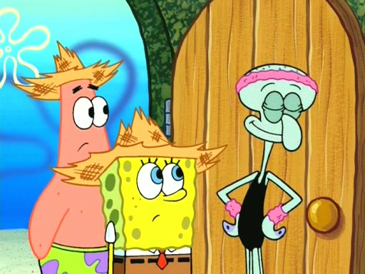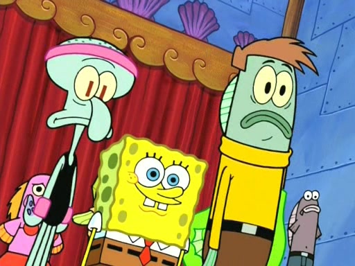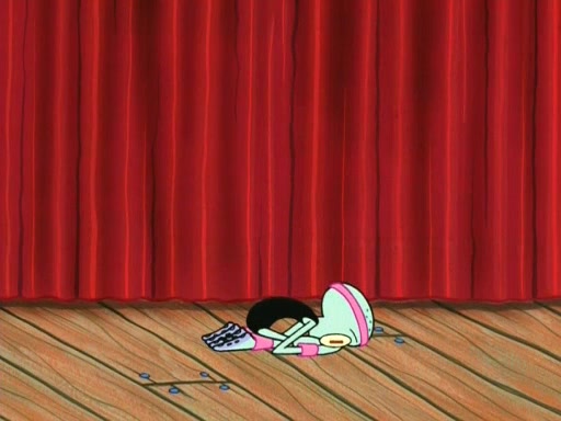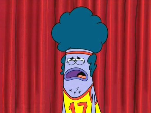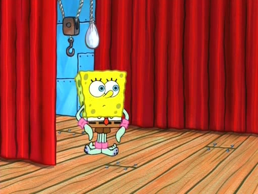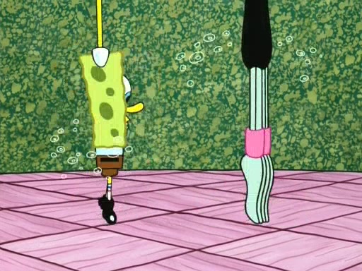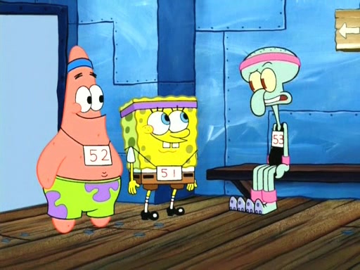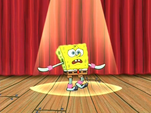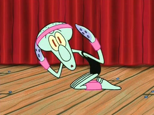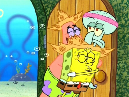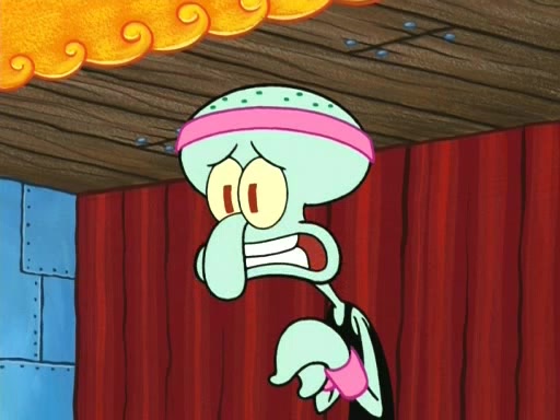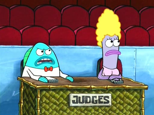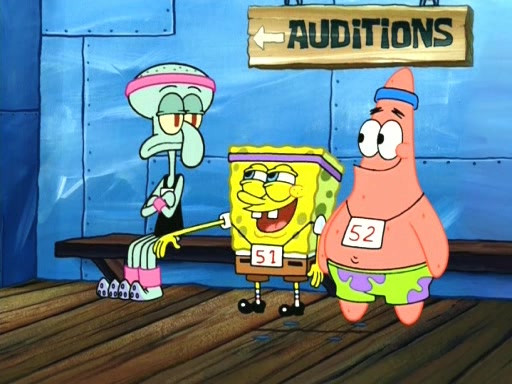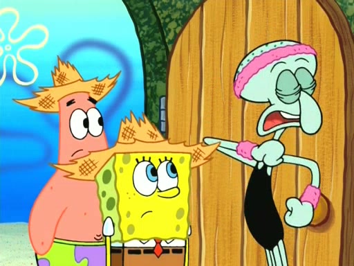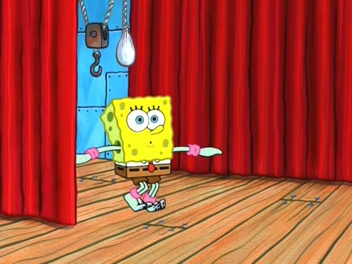 On the night of the big competition, lots of people come, as well as a coin dancer who wows the crowd and ends with a high rating. SpongeBob thinks he can't compete against that, but Squidward thinks different. When SpongeBob's up, Squidward dances, but the crowd is not enjoying it. Soon, Squidward gets a cramp in some of his tentacles, causing him to scream in pain and hold it whilst hopping around. Soon, the crowd leaves, and Fred is the last to leave. But after catching a glimpse of Squidward reacting to his cramp, he begins to call the crowd back. It isn't long before Squidward has to pull up his knee. And it isn't long when Squidward's remaining tentacles get cramped too, causing Squidward to pull that knee up too, and hold them in pain, causing SpongeBob with no arms or legs, to fall over. The crowd actually applauds at the end, which leads to SpongeBob and Squidward the trophy. SpongeBob pops out his arms and legs and begins to take the trophy, but Squidward beats him to it, causing him to have to swallow the trophy to get to Squidward. SpongeBob then says he couldn't have done it without Squidward, and pulls Squidward out of him, revealing that partnered dancers are disqualified. The trophy is confiscated from Squidward, and it turns out that literally everyone was partnered, even the coin dancer (he had someone named Pedro hidden in his hair, and he had something that popped out coins). The only individual dancer in the contest is number 52, which is indeed Patrick who also got a real cramp like Squidward did, winning him the trophy. SpongeBob says he is impressed with Patrick's new dance, whence Patrick screams before saying "Thanks."