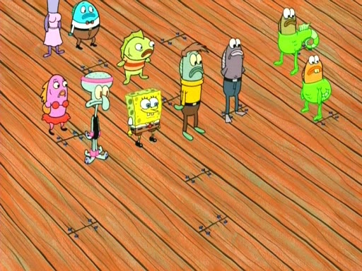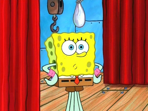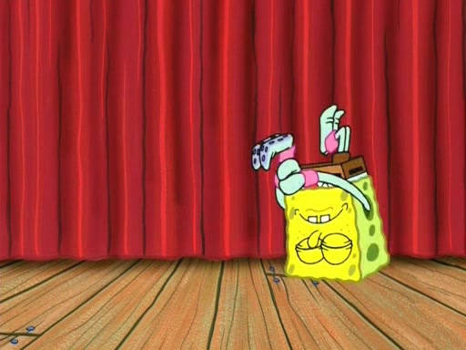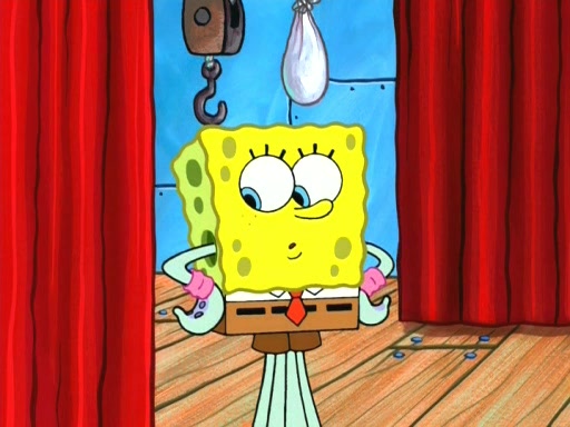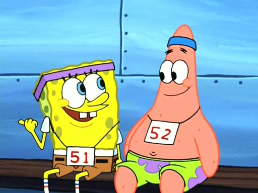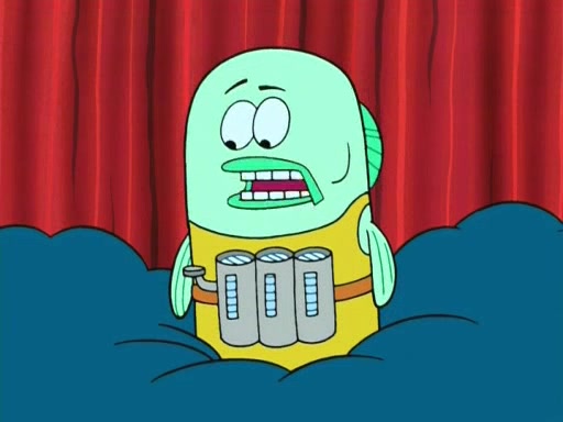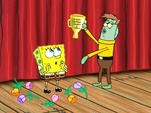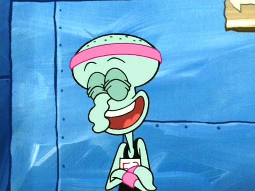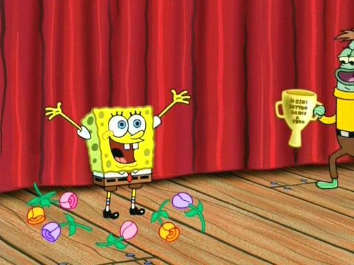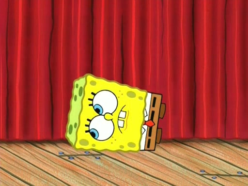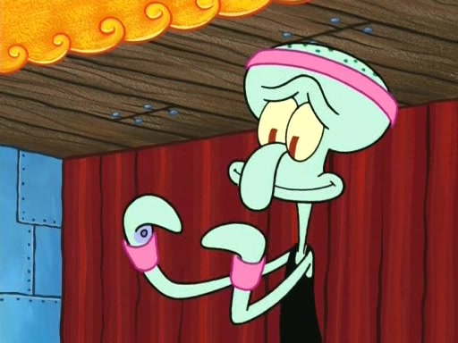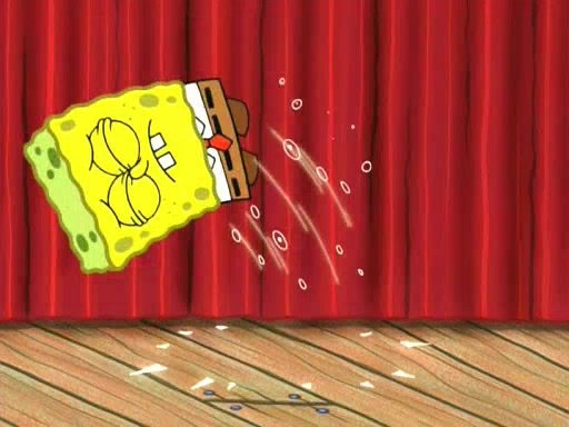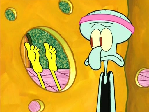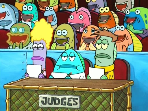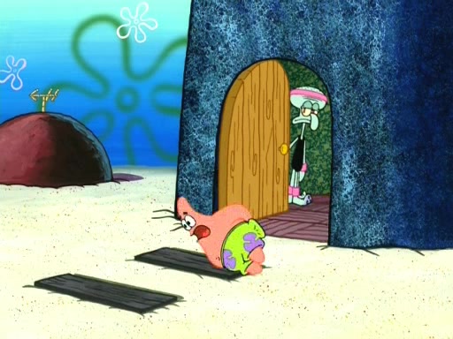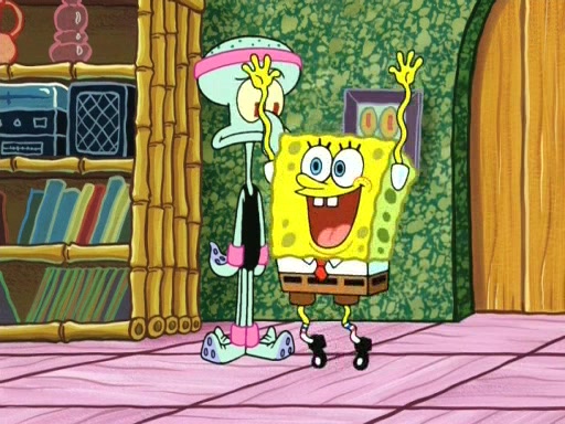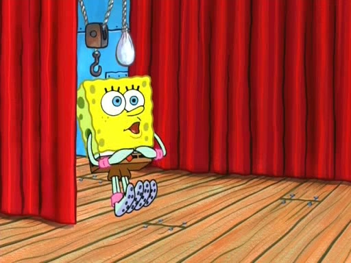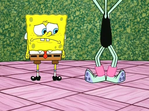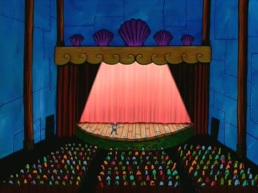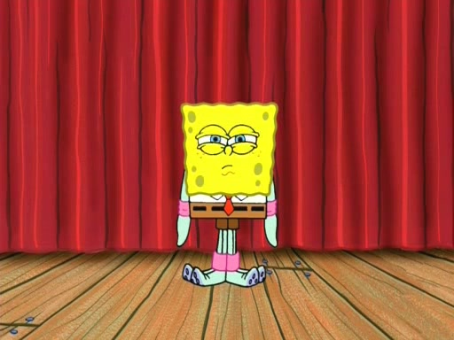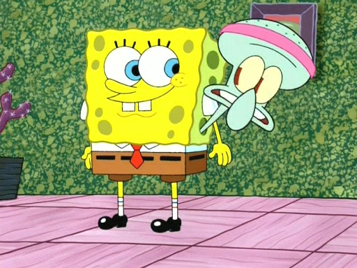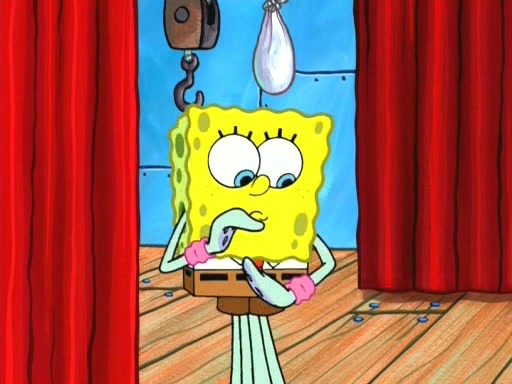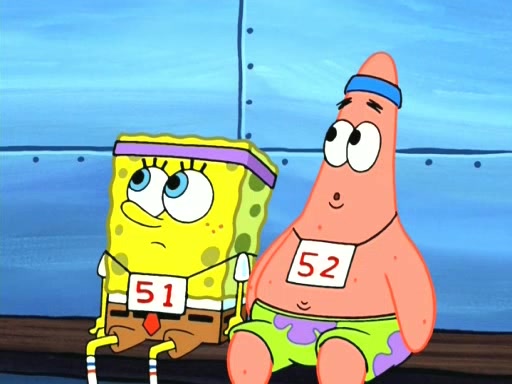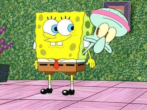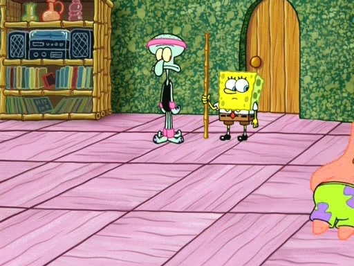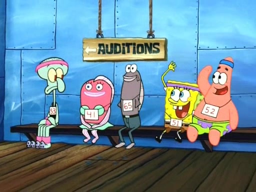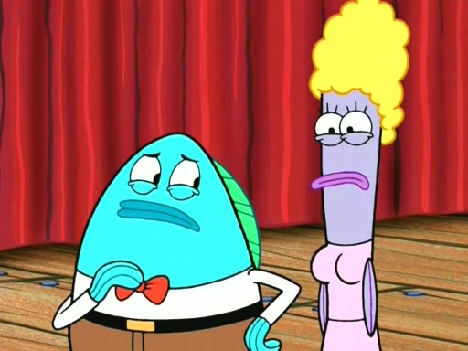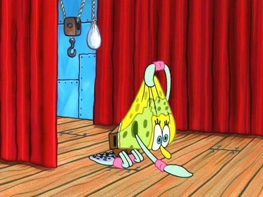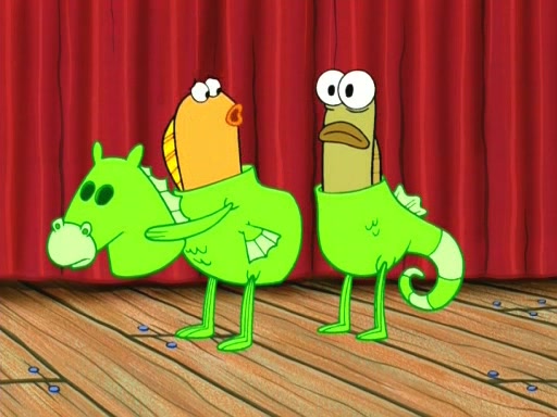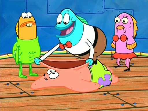 On the night of the big competition, lots of people come, as well as a coin dancer who wows the crowd and ends with a high rating. SpongeBob thinks he can't compete against that, but Squidward thinks different. When SpongeBob's up, Squidward dances, but the crowd is not enjoying it. Soon, Squidward gets a cramp in some of his tentacles, causing him to scream in pain and hold it whilst hopping around. Soon, the crowd leaves, and Fred is the last to leave. But after catching a glimpse of Squidward reacting to his cramp, he begins to call the crowd back. It isn't long before Squidward has to pull up his knee. And it isn't long when Squidward's remaining tentacles get cramped too, causing Squidward to pull that knee up too, and hold them in pain, causing SpongeBob with no arms or legs, to fall over. The crowd actually applauds at the end, which leads to SpongeBob and Squidward the trophy. SpongeBob pops out his arms and legs and begins to take the trophy, but Squidward beats him to it, causing him to have to swallow the trophy to get to Squidward. SpongeBob then says he couldn't have done it without Squidward, and pulls Squidward out of him, revealing that partnered dancers are disqualified. The trophy is confiscated from Squidward, and it turns out that literally everyone was partnered, even the coin dancer (he had someone named Pedro hidden in his hair, and he had something that popped out coins). The only individual dancer in the contest is number 52, which is indeed Patrick who also got a real cramp like Squidward did, winning him the trophy. SpongeBob says he is impressed with Patrick's new dance, whence Patrick screams before saying "Thanks."