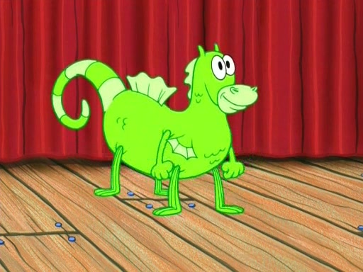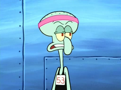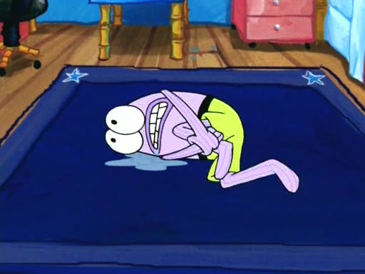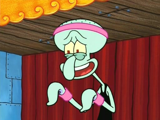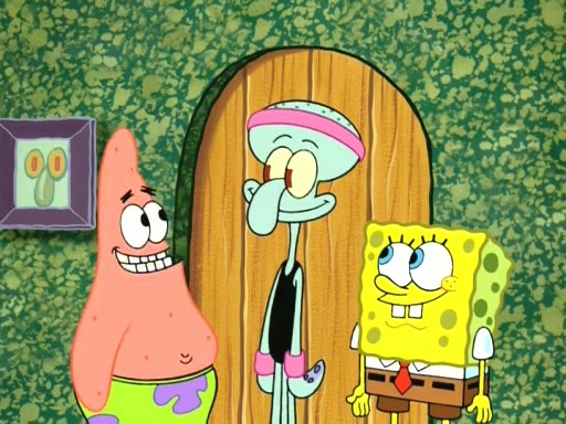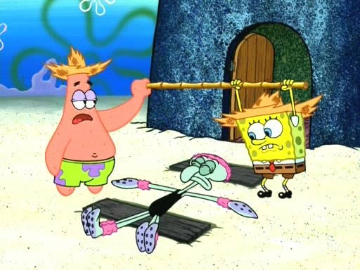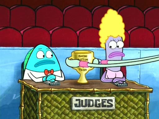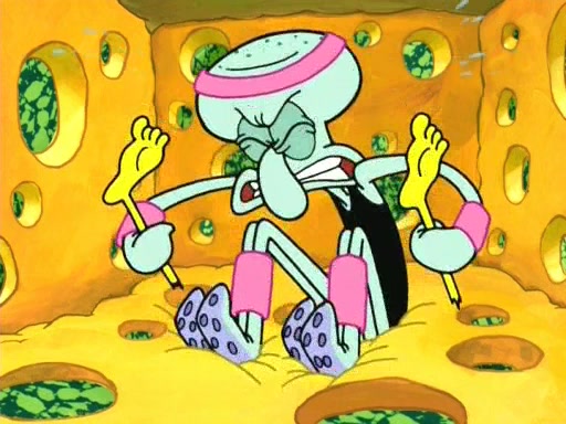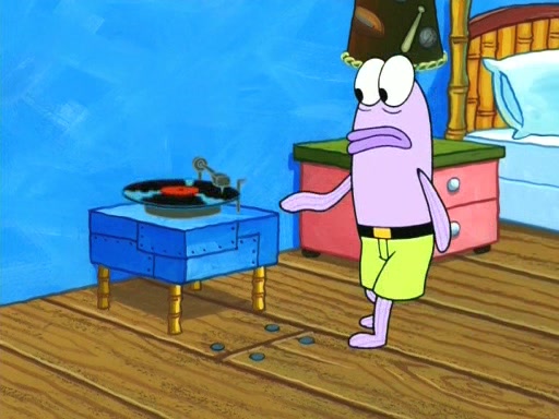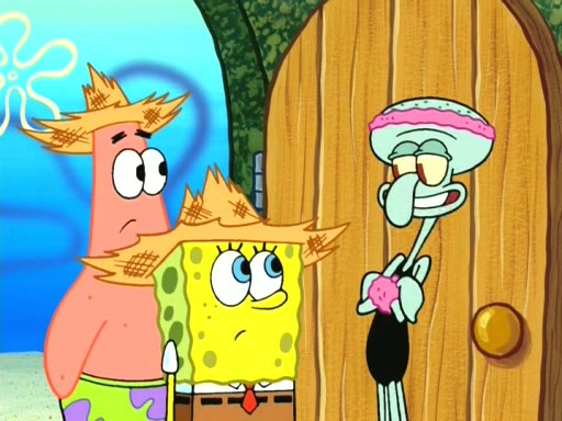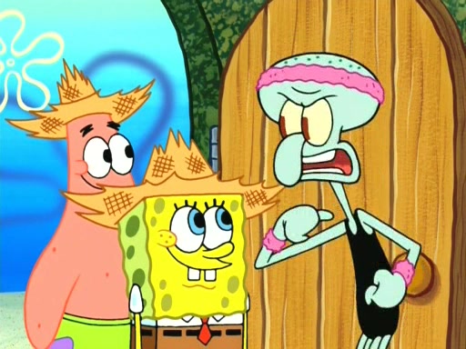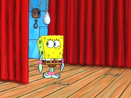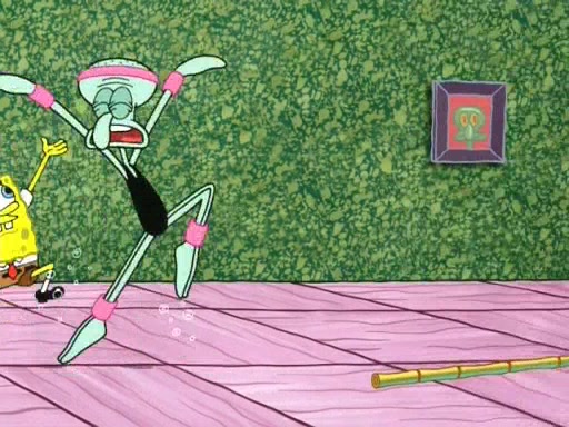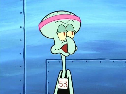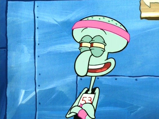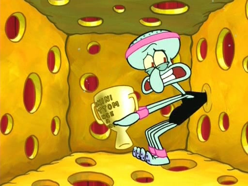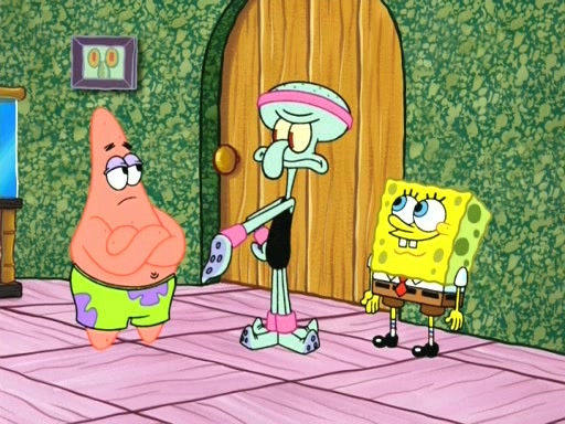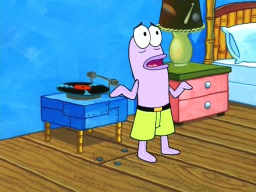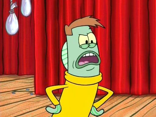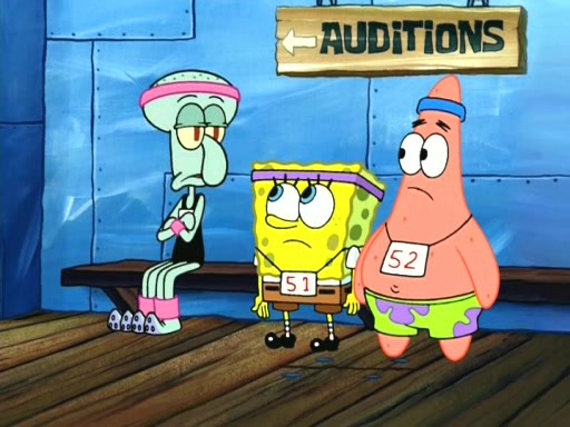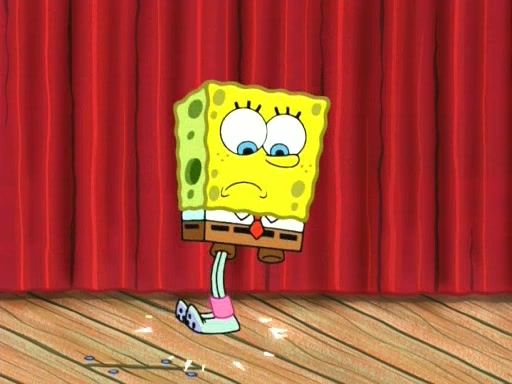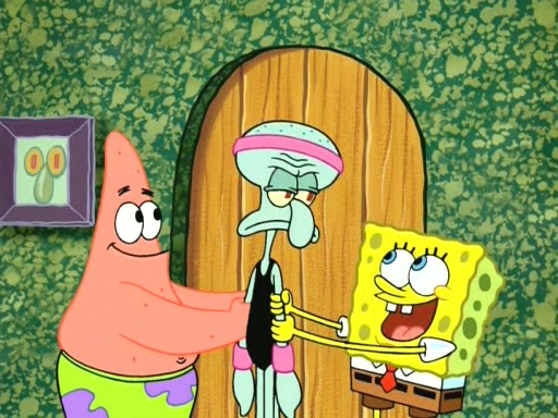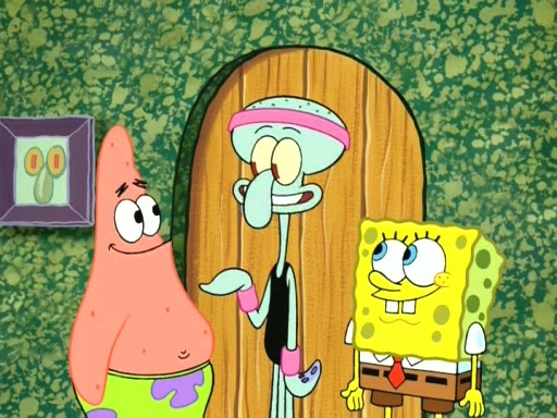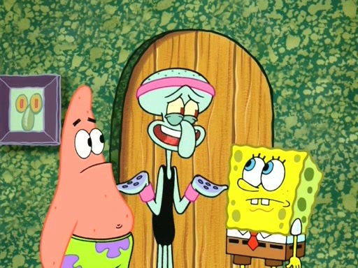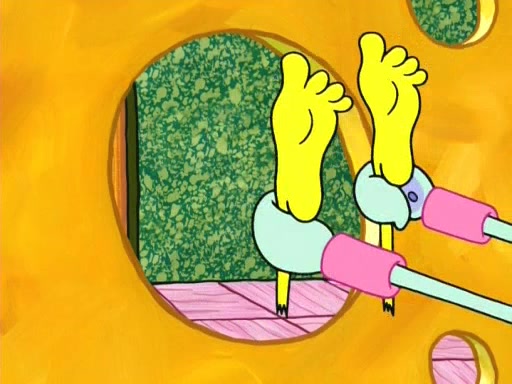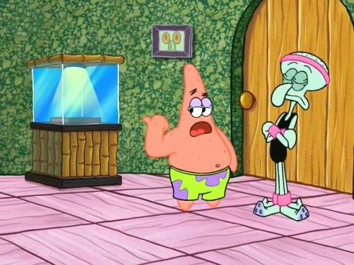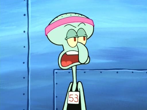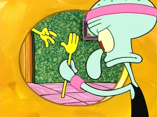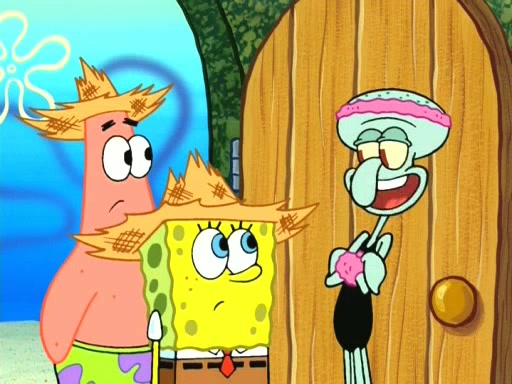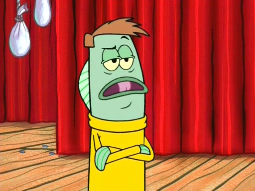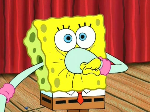 On the night of the big competition, lots of people come, as well as a coin dancer who wows the crowd and ends with a high rating. SpongeBob thinks he can't compete against that, but Squidward thinks different. When SpongeBob's up, Squidward dances, but the crowd is not enjoying it. Soon, Squidward gets a cramp in some of his tentacles, causing him to scream in pain and hold it whilst hopping around. Soon, the crowd leaves, and Fred is the last to leave. But after catching a glimpse of Squidward reacting to his cramp, he begins to call the crowd back. It isn't long before Squidward has to pull up his knee. And it isn't long when Squidward's remaining tentacles get cramped too, causing Squidward to pull that knee up too, and hold them in pain, causing SpongeBob with no arms or legs, to fall over. The crowd actually applauds at the end, which leads to SpongeBob and Squidward the trophy. SpongeBob pops out his arms and legs and begins to take the trophy, but Squidward beats him to it, causing him to have to swallow the trophy to get to Squidward. SpongeBob then says he couldn't have done it without Squidward, and pulls Squidward out of him, revealing that partnered dancers are disqualified. The trophy is confiscated from Squidward, and it turns out that literally everyone was partnered, even the coin dancer (he had someone named Pedro hidden in his hair, and he had something that popped out coins). The only individual dancer in the contest is number 52, which is indeed Patrick who also got a real cramp like Squidward did, winning him the trophy. SpongeBob says he is impressed with Patrick's new dance, whence Patrick screams before saying "Thanks."