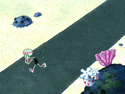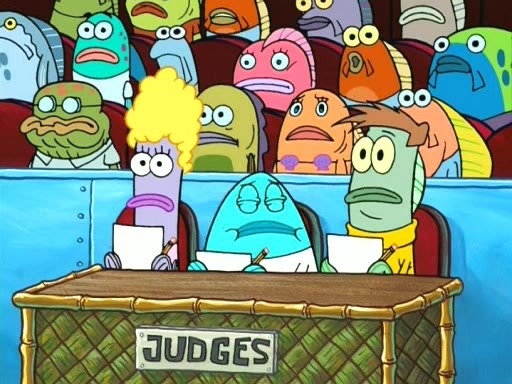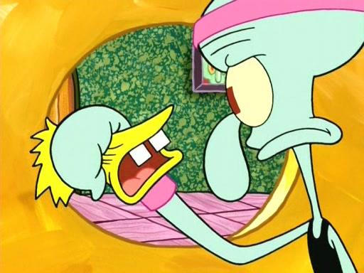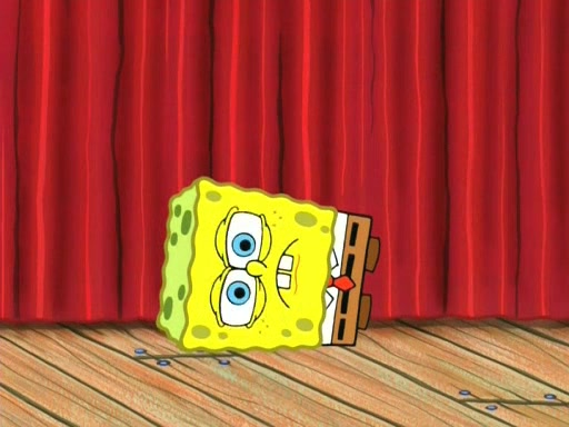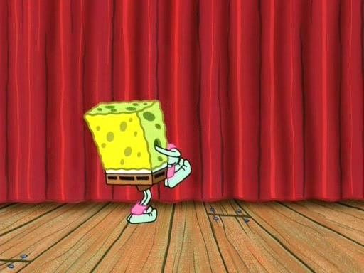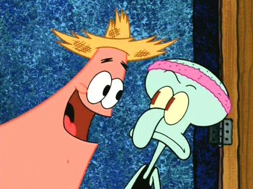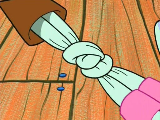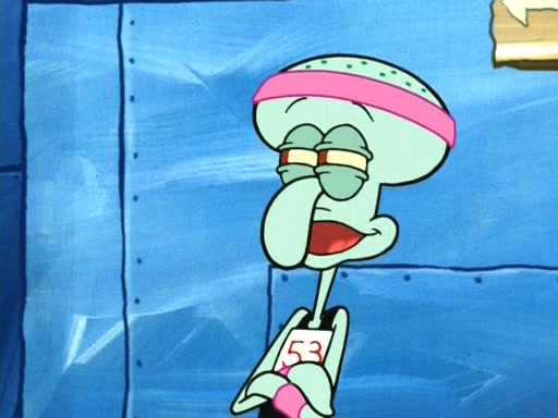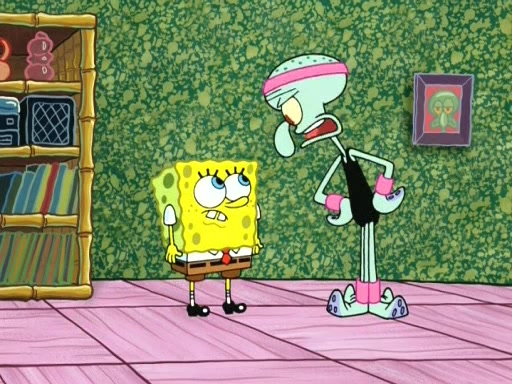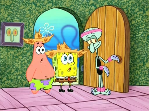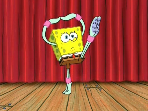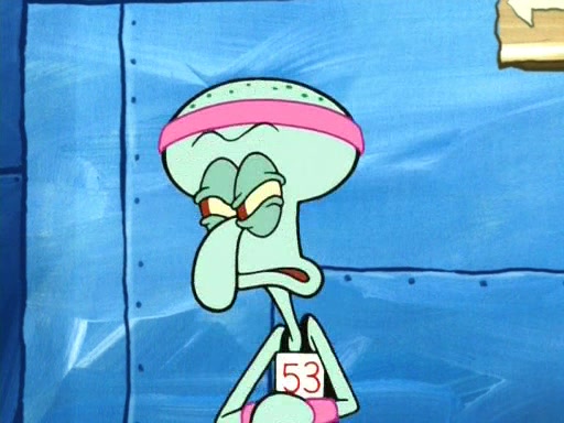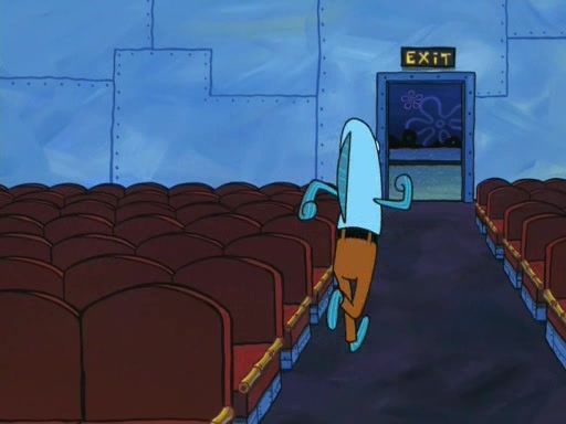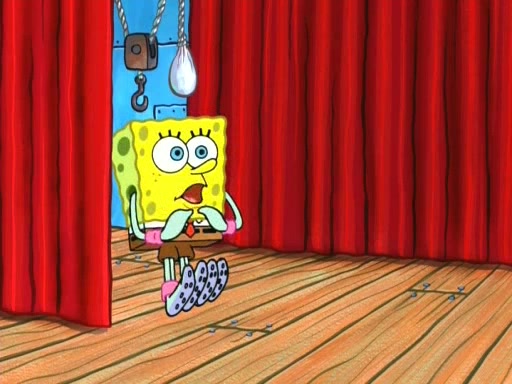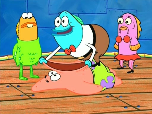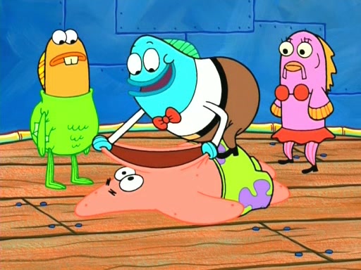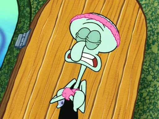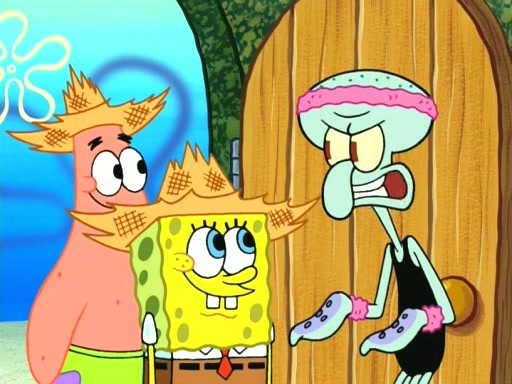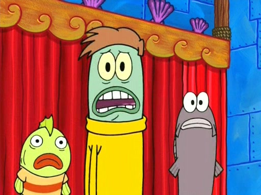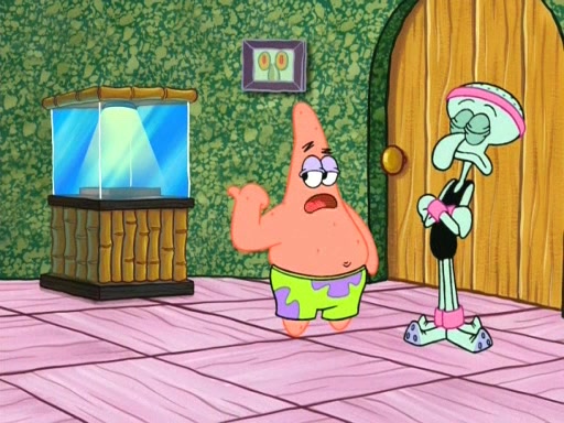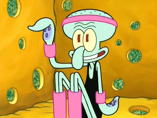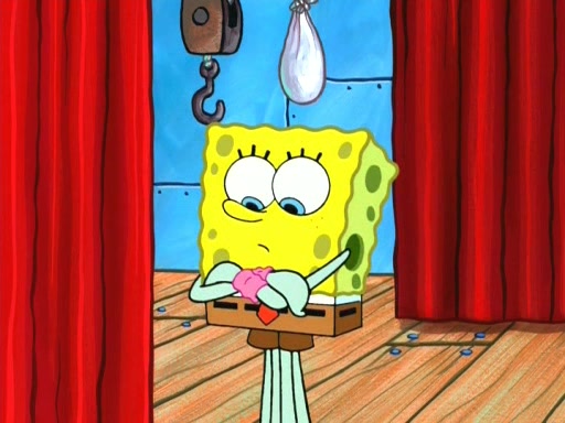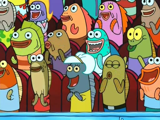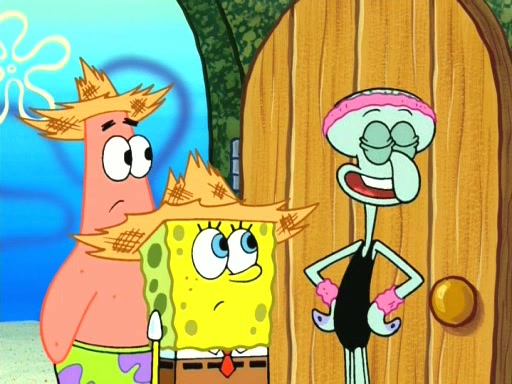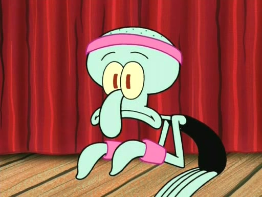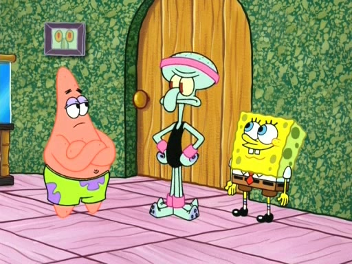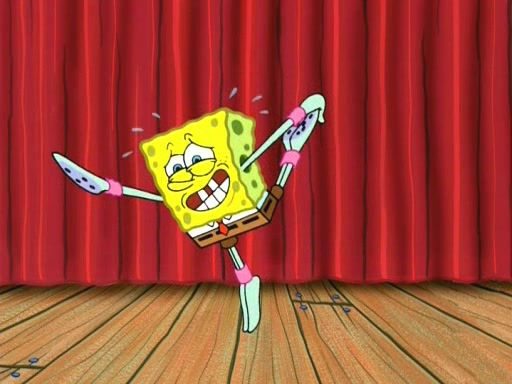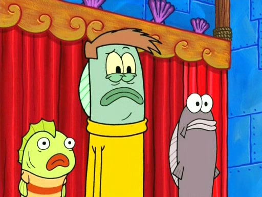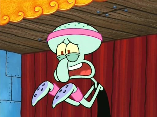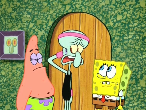 On the night of the big competition, lots of people come, as well as a coin dancer who wows the crowd and ends with a high rating. SpongeBob thinks he can't compete against that, but Squidward thinks different. When SpongeBob's up, Squidward dances, but the crowd is not enjoying it. Soon, Squidward gets a cramp in some of his tentacles, causing him to scream in pain and hold it whilst hopping around. Soon, the crowd leaves, and Fred is the last to leave. But after catching a glimpse of Squidward reacting to his cramp, he begins to call the crowd back. It isn't long before Squidward has to pull up his knee. And it isn't long when Squidward's remaining tentacles get cramped too, causing Squidward to pull that knee up too, and hold them in pain, causing SpongeBob with no arms or legs, to fall over. The crowd actually applauds at the end, which leads to SpongeBob and Squidward the trophy. SpongeBob pops out his arms and legs and begins to take the trophy, but Squidward beats him to it, causing him to have to swallow the trophy to get to Squidward. SpongeBob then says he couldn't have done it without Squidward, and pulls Squidward out of him, revealing that partnered dancers are disqualified. The trophy is confiscated from Squidward, and it turns out that literally everyone was partnered, even the coin dancer (he had someone named Pedro hidden in his hair, and he had something that popped out coins). The only individual dancer in the contest is number 52, which is indeed Patrick who also got a real cramp like Squidward did, winning him the trophy. SpongeBob says he is impressed with Patrick's new dance, whence Patrick screams before saying "Thanks."