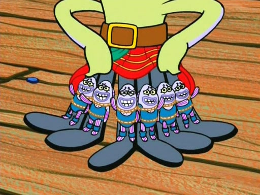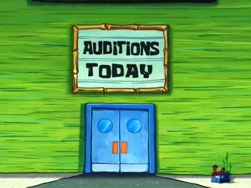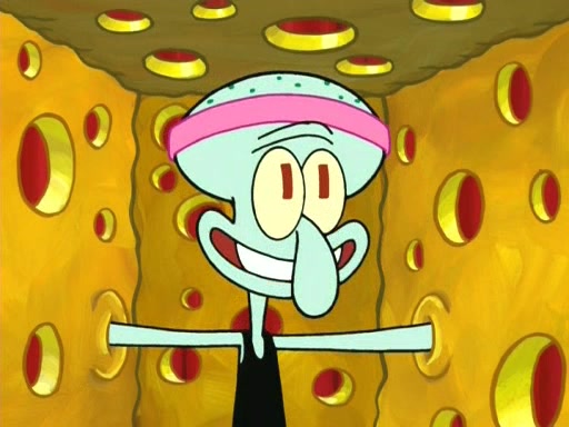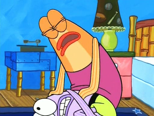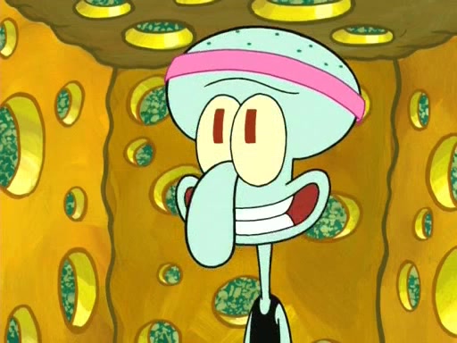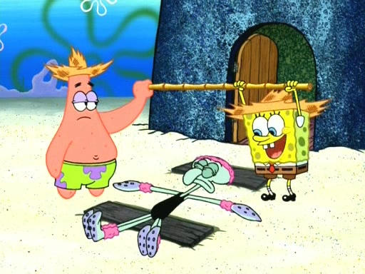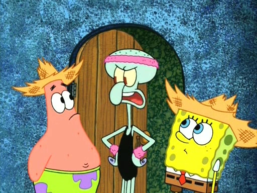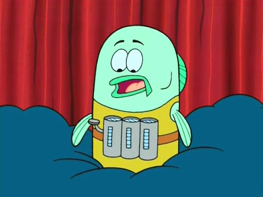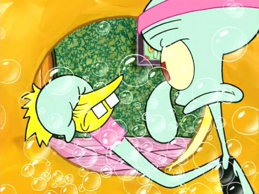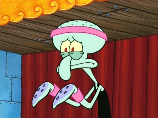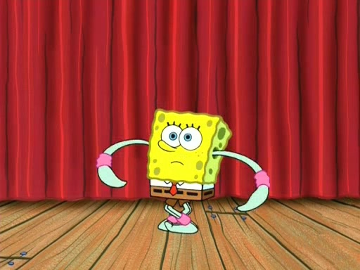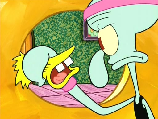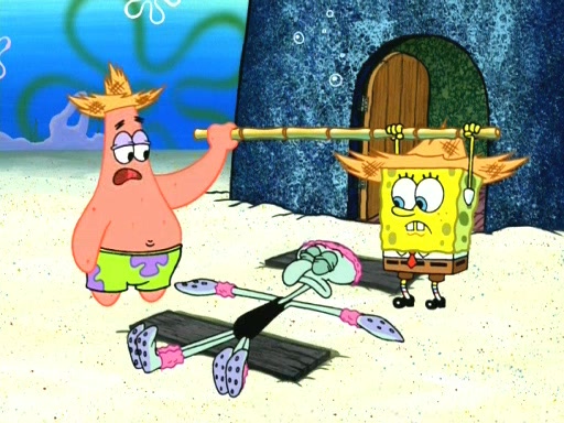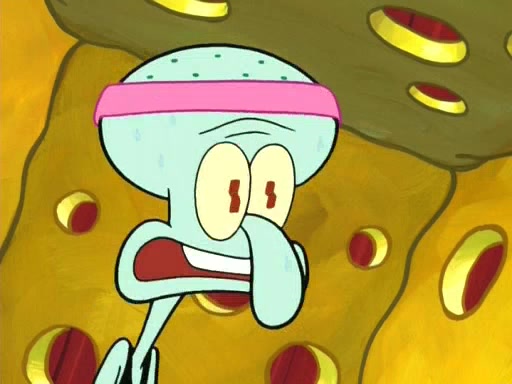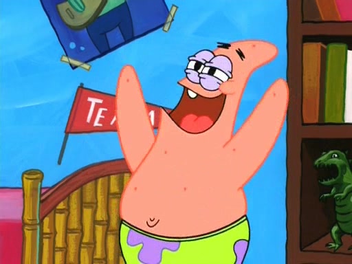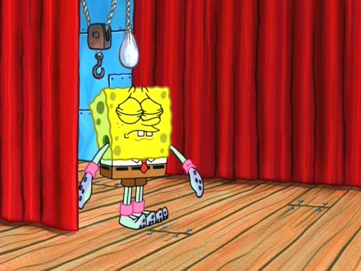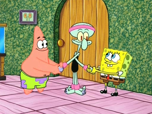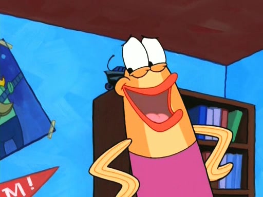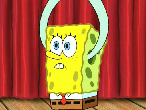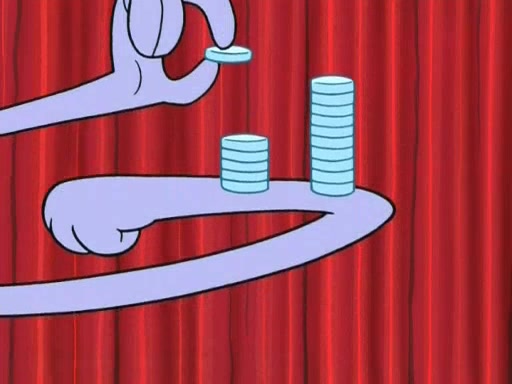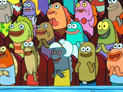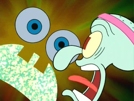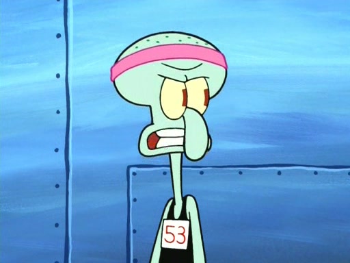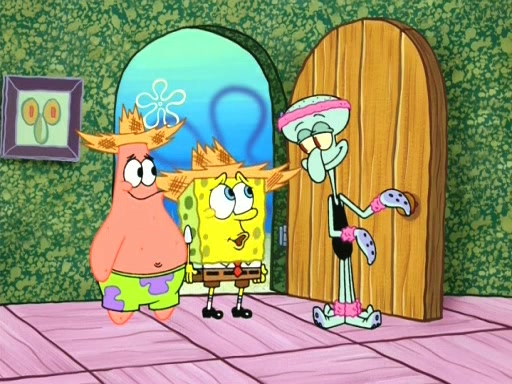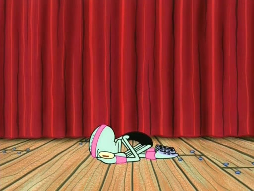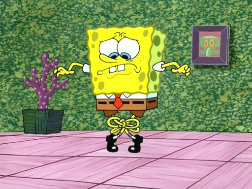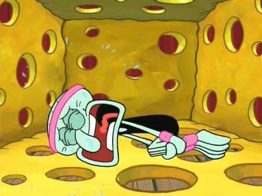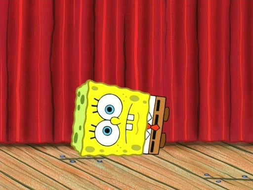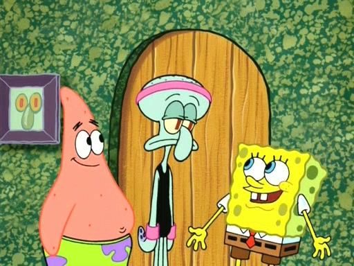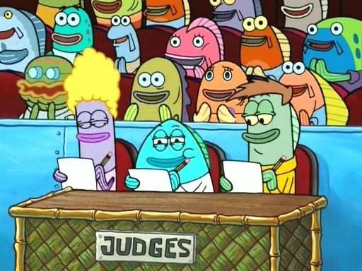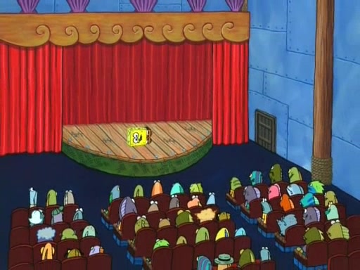 On the night of the big competition, lots of people come, as well as a coin dancer who wows the crowd and ends with a high rating. SpongeBob thinks he can't compete against that, but Squidward thinks different. When SpongeBob's up, Squidward dances, but the crowd is not enjoying it. Soon, Squidward gets a cramp in some of his tentacles, causing him to scream in pain and hold it whilst hopping around. Soon, the crowd leaves, and Fred is the last to leave. But after catching a glimpse of Squidward reacting to his cramp, he begins to call the crowd back. It isn't long before Squidward has to pull up his knee. And it isn't long when Squidward's remaining tentacles get cramped too, causing Squidward to pull that knee up too, and hold them in pain, causing SpongeBob with no arms or legs, to fall over. The crowd actually applauds at the end, which leads to SpongeBob and Squidward the trophy. SpongeBob pops out his arms and legs and begins to take the trophy, but Squidward beats him to it, causing him to have to swallow the trophy to get to Squidward. SpongeBob then says he couldn't have done it without Squidward, and pulls Squidward out of him, revealing that partnered dancers are disqualified. The trophy is confiscated from Squidward, and it turns out that literally everyone was partnered, even the coin dancer (he had someone named Pedro hidden in his hair, and he had something that popped out coins). The only individual dancer in the contest is number 52, which is indeed Patrick who also got a real cramp like Squidward did, winning him the trophy. SpongeBob says he is impressed with Patrick's new dance, whence Patrick screams before saying "Thanks."