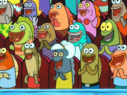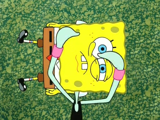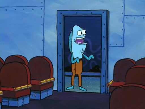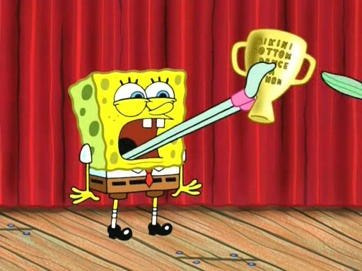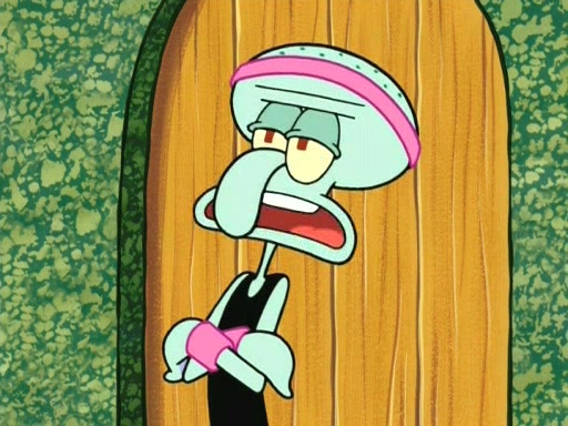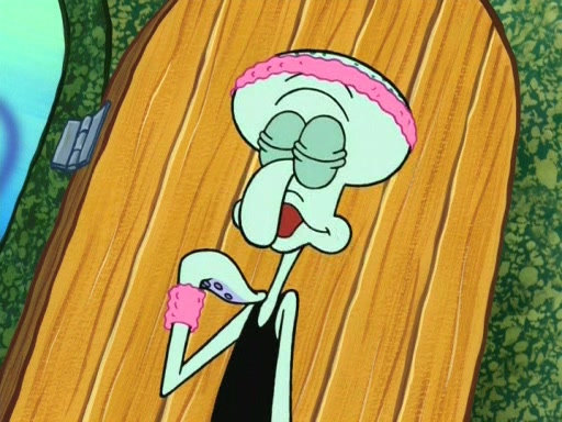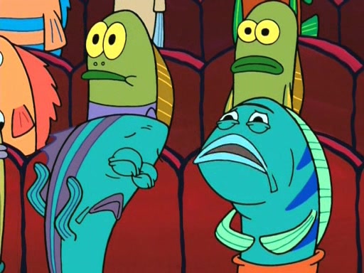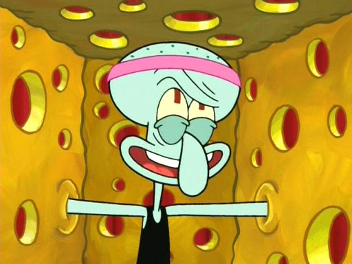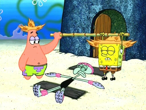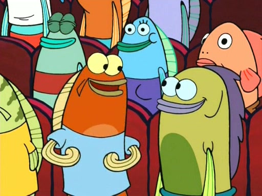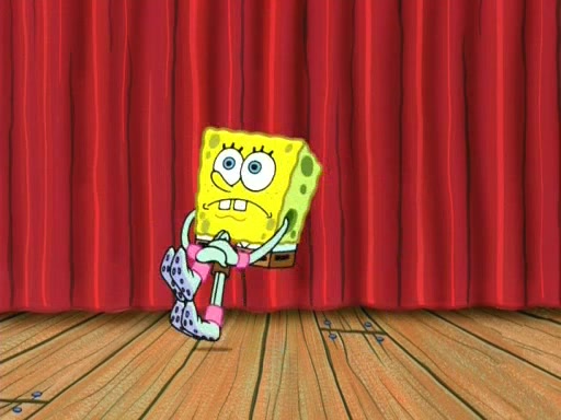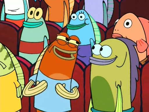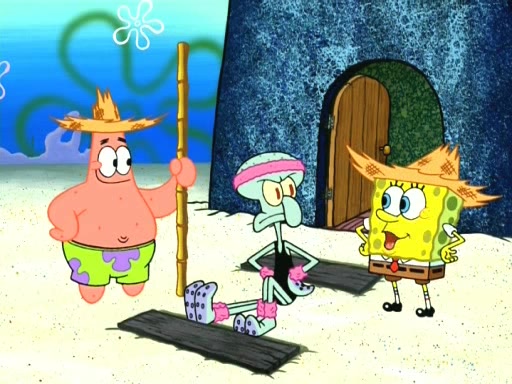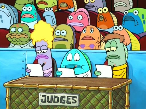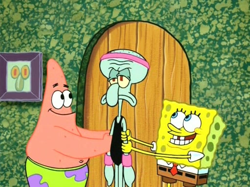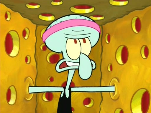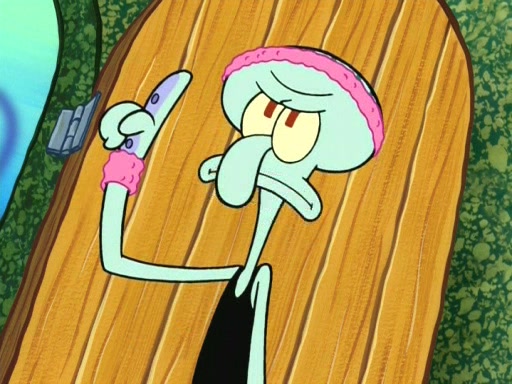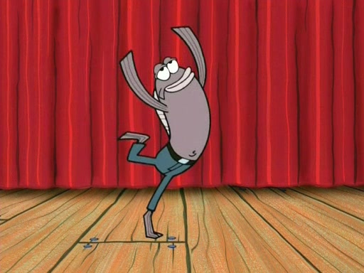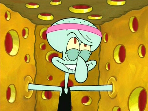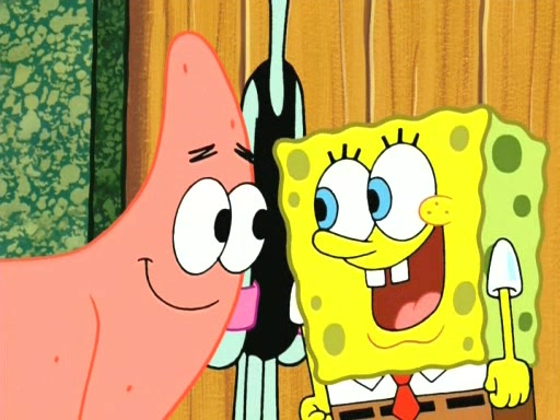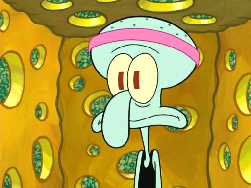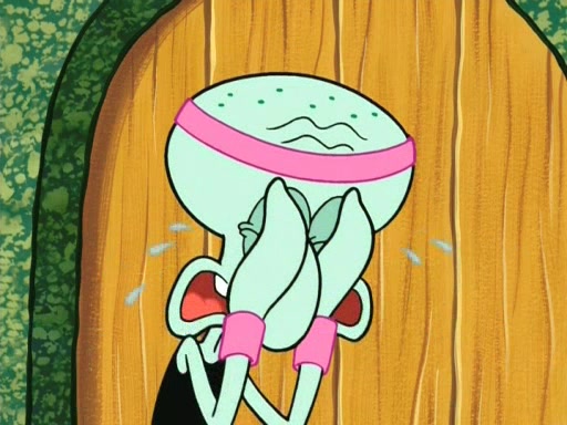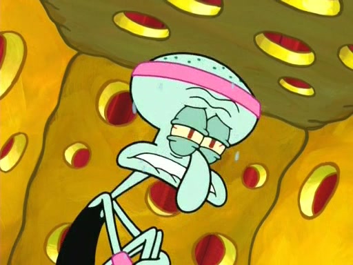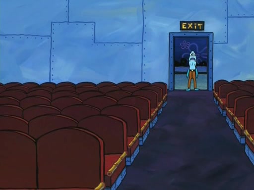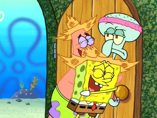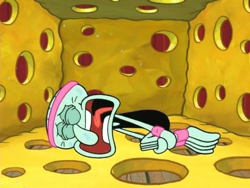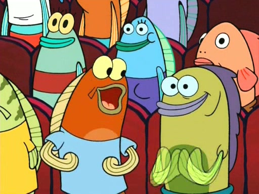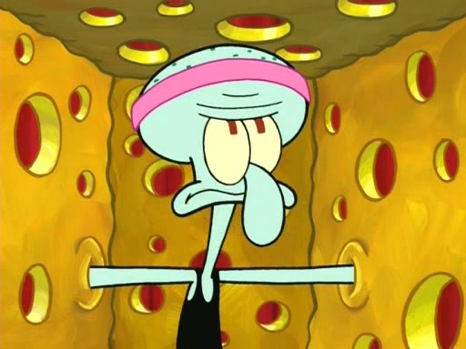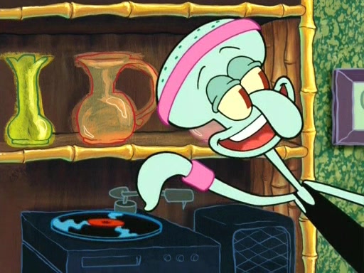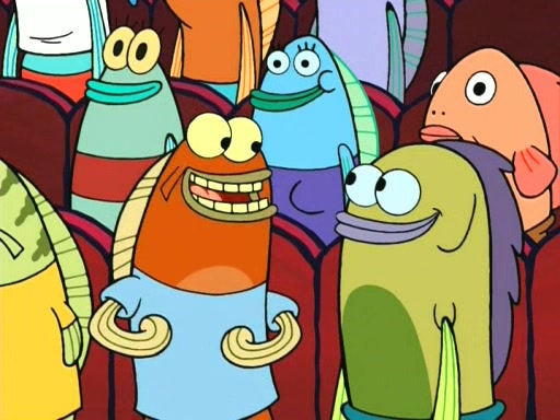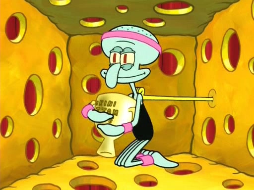 On the night of the big competition, lots of people come, as well as a coin dancer who wows the crowd and ends with a high rating. SpongeBob thinks he can't compete against that, but Squidward thinks different. When SpongeBob's up, Squidward dances, but the crowd is not enjoying it. Soon, Squidward gets a cramp in some of his tentacles, causing him to scream in pain and hold it whilst hopping around. Soon, the crowd leaves, and Fred is the last to leave. But after catching a glimpse of Squidward reacting to his cramp, he begins to call the crowd back. It isn't long before Squidward has to pull up his knee. And it isn't long when Squidward's remaining tentacles get cramped too, causing Squidward to pull that knee up too, and hold them in pain, causing SpongeBob with no arms or legs, to fall over. The crowd actually applauds at the end, which leads to SpongeBob and Squidward the trophy. SpongeBob pops out his arms and legs and begins to take the trophy, but Squidward beats him to it, causing him to have to swallow the trophy to get to Squidward. SpongeBob then says he couldn't have done it without Squidward, and pulls Squidward out of him, revealing that partnered dancers are disqualified. The trophy is confiscated from Squidward, and it turns out that literally everyone was partnered, even the coin dancer (he had someone named Pedro hidden in his hair, and he had something that popped out coins). The only individual dancer in the contest is number 52, which is indeed Patrick who also got a real cramp like Squidward did, winning him the trophy. SpongeBob says he is impressed with Patrick's new dance, whence Patrick screams before saying "Thanks."
