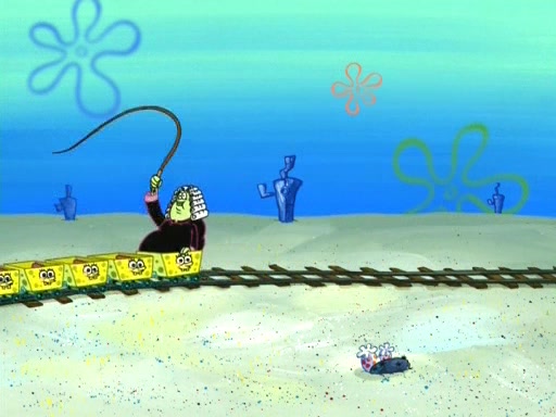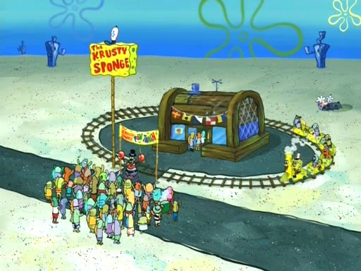 The next day, SpongeBob came to see that there was a new sign at the Krusty Krab, reading The Krusty Sponge, he also found a long line, and Squidward in a SpongeBob costume as the resturant's Mascot. A boy named Tyler ask Squidward in SpongeBob costume that he take autograph and accidentally slap a little boy which is Krab disappoint him. SpongeBob found that his new job was to run a train outside the Krusty Krab, which Mr. Krabs was charging people to ride it, SpongeBob was the driver, after he was out of energy from driving. His passengers unfortunately didn't care in the slightest at how obviously exhausted he was and demanded on threat of riot that he keep pedaling. He managed to slip away and find Mr. Krabs had gotten all kinds of new products, customized to be like SpongeBob.