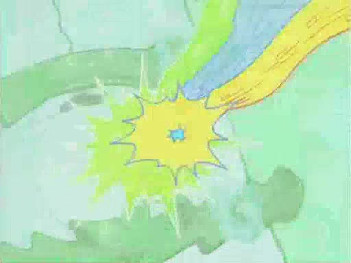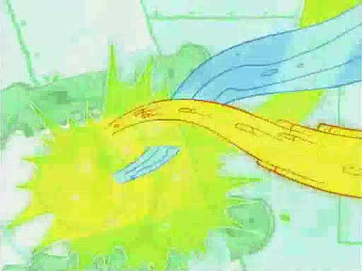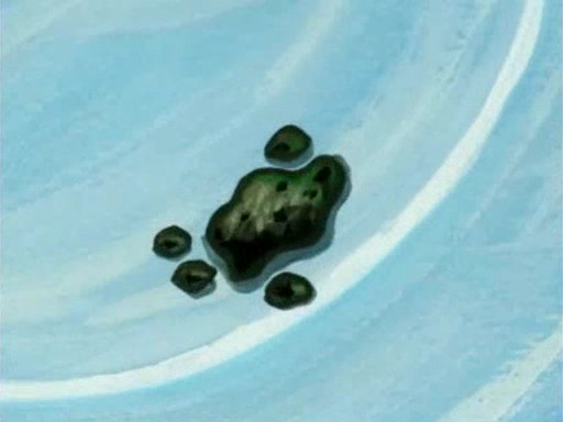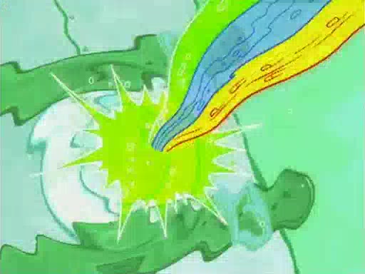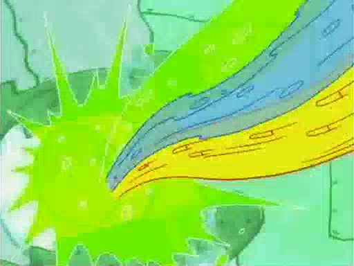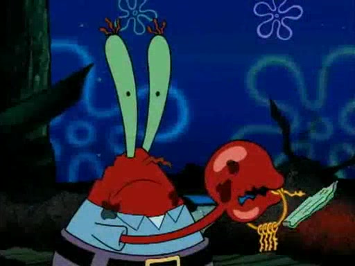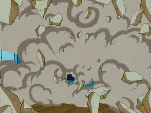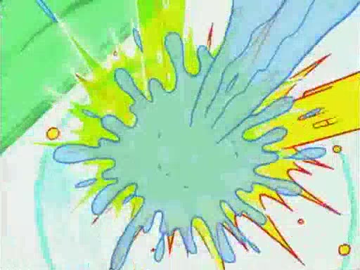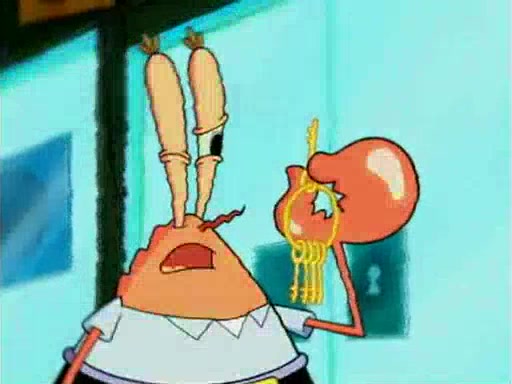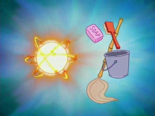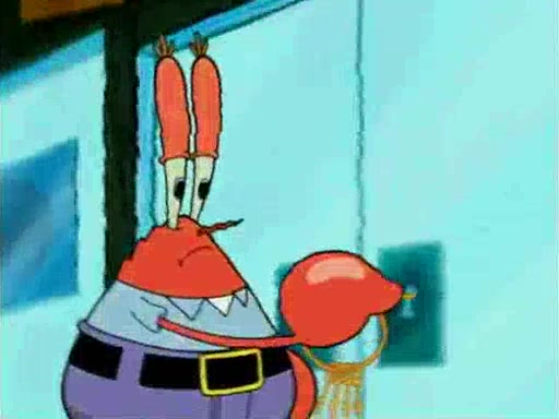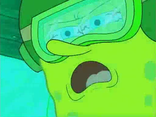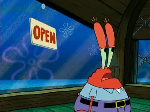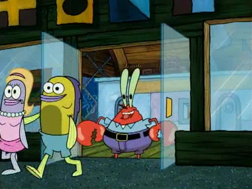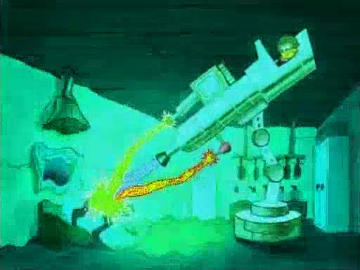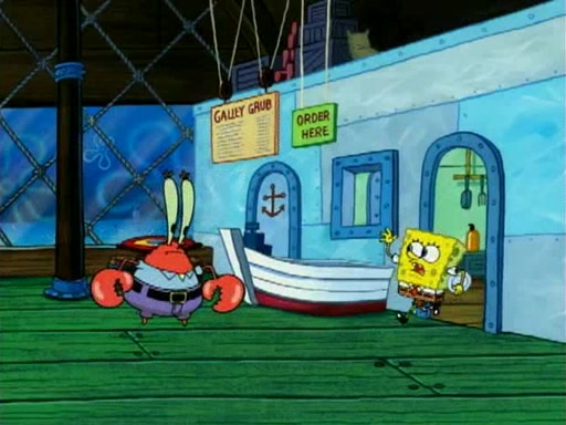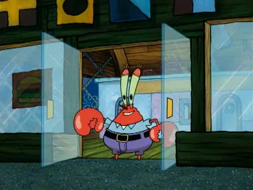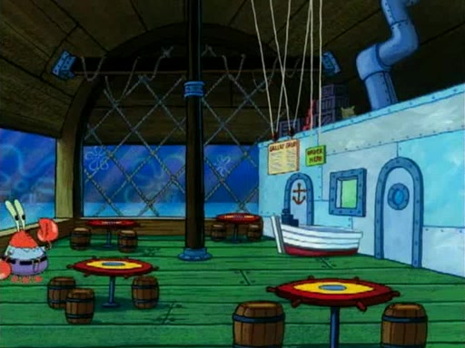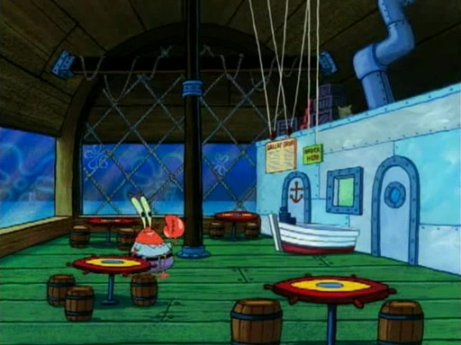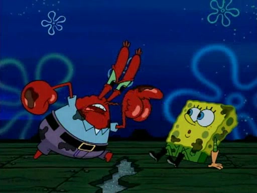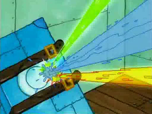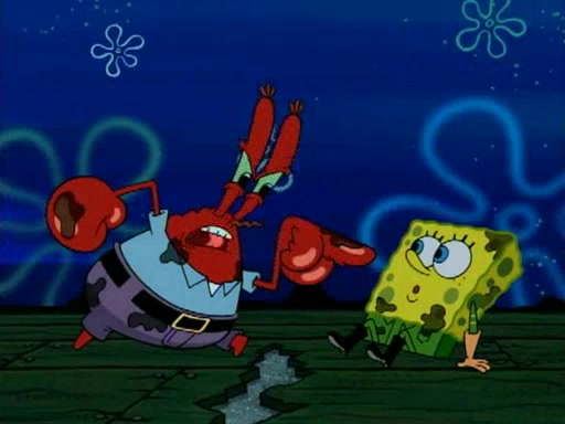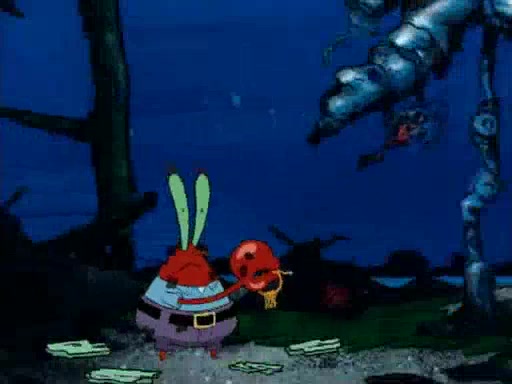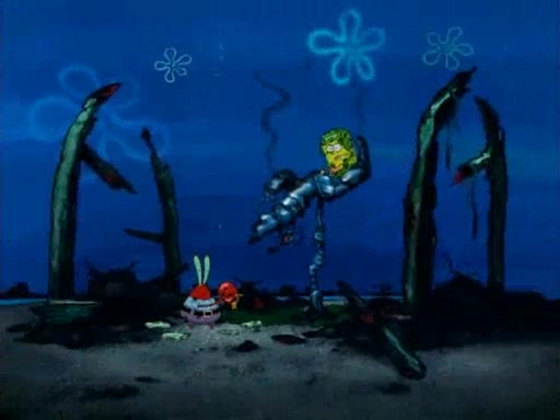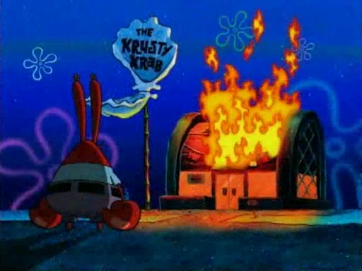 Meanwhile, SpongeBob is still trying to get the spot off and then crosses the laser beams. SpongeBob declares "More power!" While it's happening, the Krusty Krab sends out 'sound'-like waves through the air, causing everything to look like it's wiggling. Mr. Krabs checks out of his window again and decides to go see how SpongeBob's doing. When Mr. Krabs is near the Krusty Krab, he says "Oh, boy, that can't be good." As Mr. Krabs gets his key out, SpongeBob uses maximum power on the spot. Once Mr. Krabs opens the door, a huge blast wrecks the restaurant and a bursting size of an atomic bomb. Once the explosion is over, we the restaurant completely destroyed and then the Spot-Master 6000 disintegrates. SpongeBob looks at the plate and notices he spot is finally off the plate. However, Mr. Krabs angrily chases SpongeBob because his restaurant is destroyed.