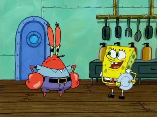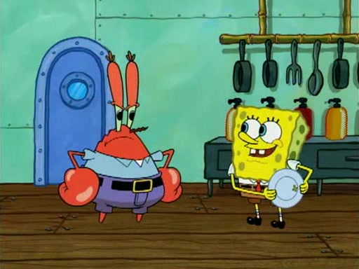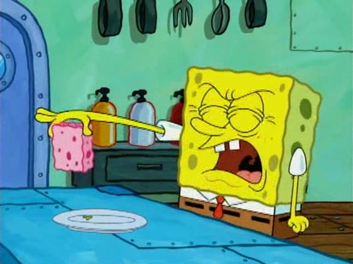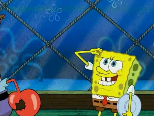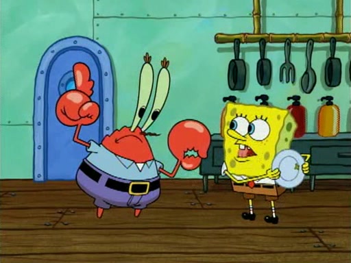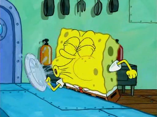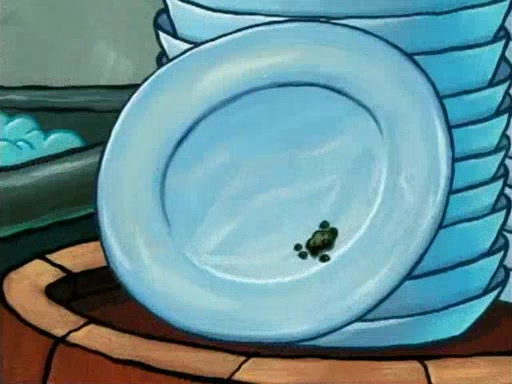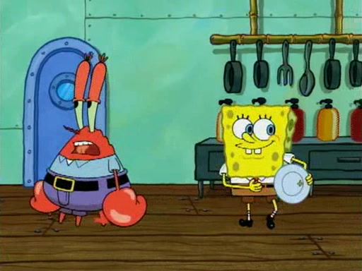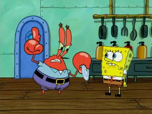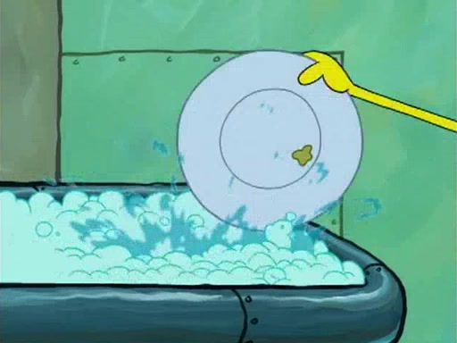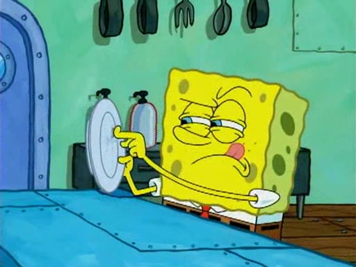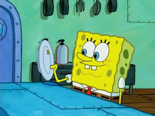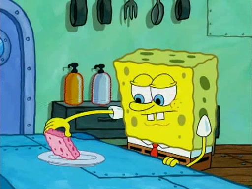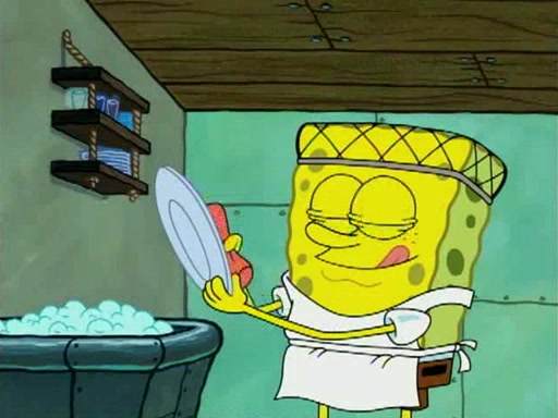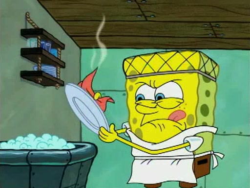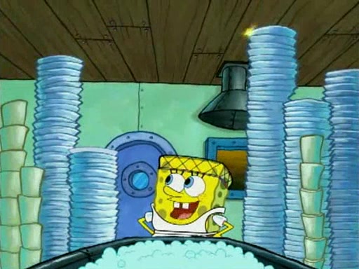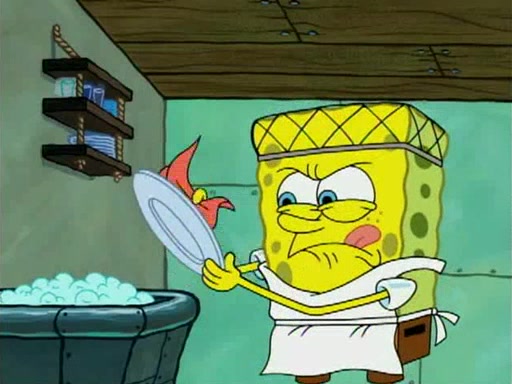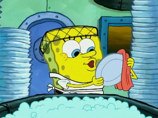 The episode starts with Mr. Krabs closing the Krusty Krab stating "Thought those deadbeats would never leave." Meanwhile, SpongeBob is in the kitchen and finishes washing the dishes. Mr. Krabs comes in and he finds a dirty spot on a plate. Mr. Krabs shows this SpongeBob and then states that SpongeBob can't leave until he gets the spot removed. Mr. Krabs tells SpongeBob to lock up when he's done. SpongeBob then reminds Mr. Krabs that when he was left alone at work, the Krusty Krab set on fire. Mr. Krabs tells SpongeBob that he removed all welding equipment from the premises so there no chance of a fire happening again. SpongeBob tries scrubbing of the spot off the plate, but it ain't working. So SpongeBob declares war. First, he uses jackhammer but SpongeBob falls over and jackhammer repeatedly smacks him in the face. Second, he tries with repeatedly banging a bat on plates which fails. Thirdly, he uses a chainsaw and repeatedly bangs on the plate. Once SpongeBob is out of breath, he gets a tank and shoots a pink sponge on the plate. Since that fails, SpongeBob spits on the plate and it STILL doesn't work. SpongeBob states "I got to finish this."