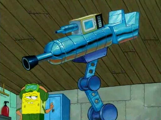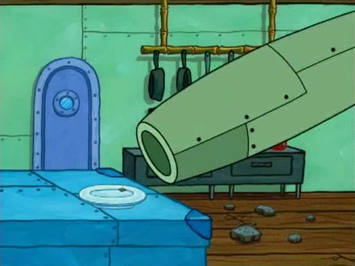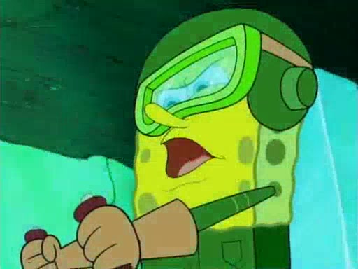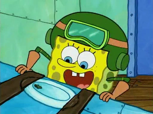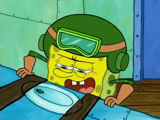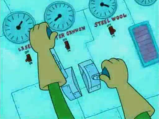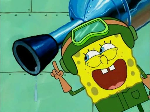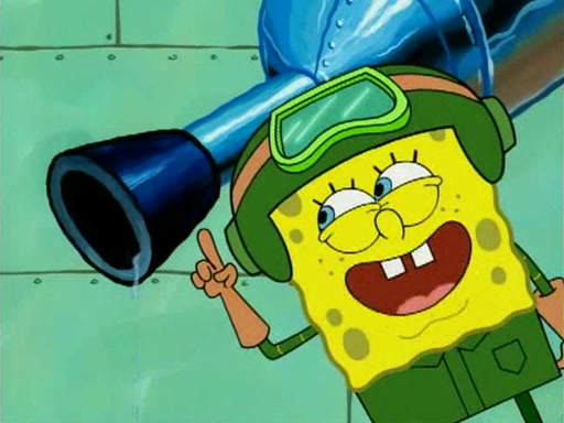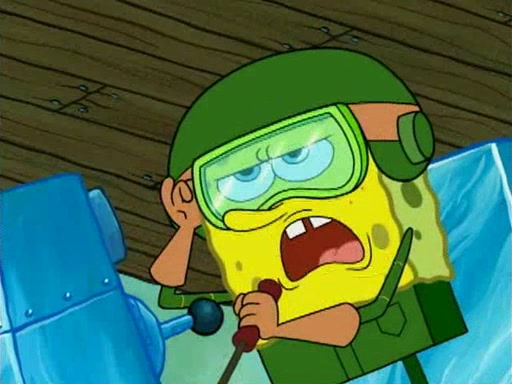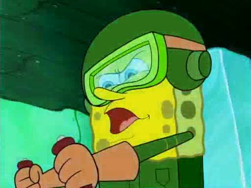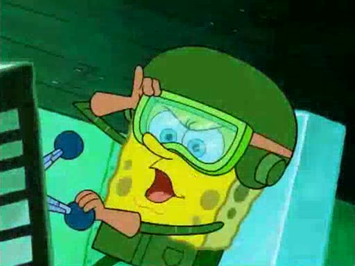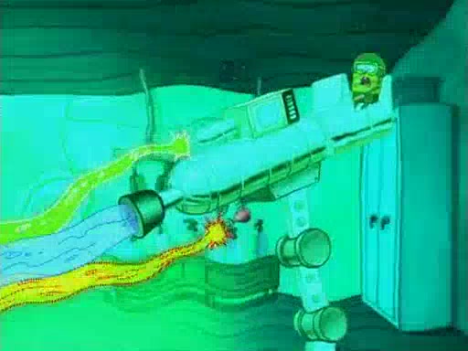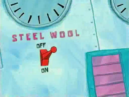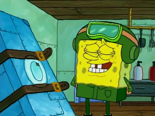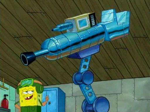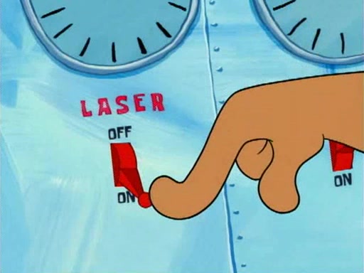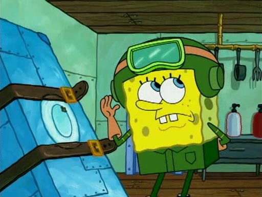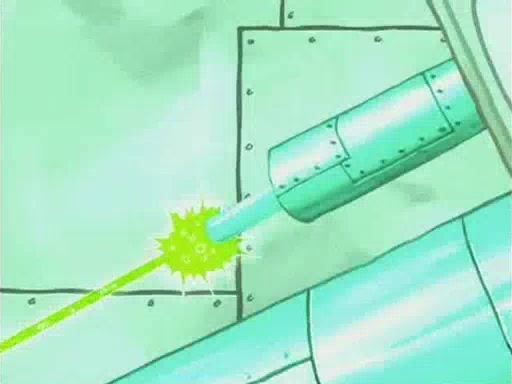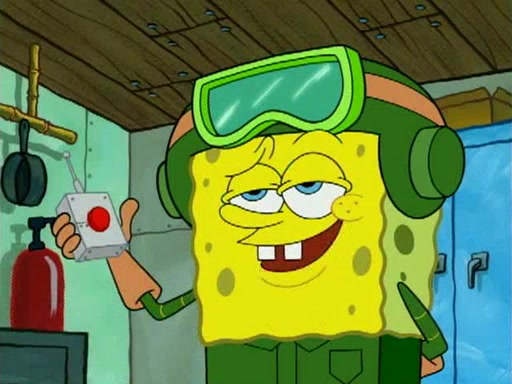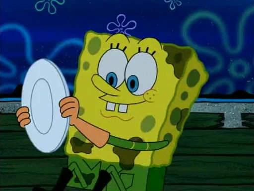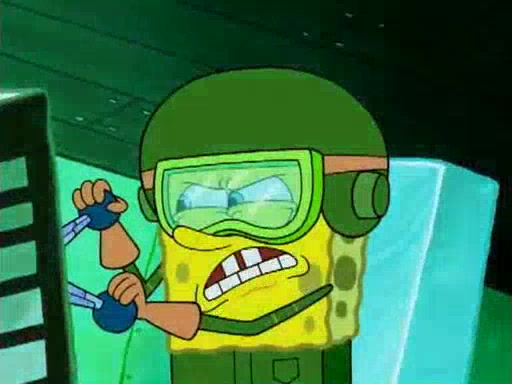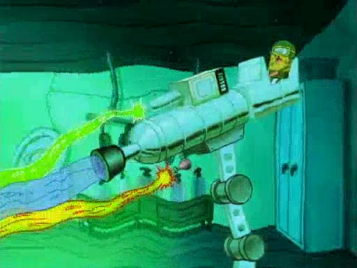 SpongeBob soon comes back, dressed in an army outfit and introduces the dirty spot to the Spot-Master 6000. SpongeBob first shows the spot the microwave-powered laser particle beam. Then, he shows the spot the laser-guided high pressure water cannon. Finally, SpongeBob shows the spot a specially woven metal alloy ingeniously combined with state of the art cleaning materials. He calls it steel wool. And it comes with a laser. SpongeBob asks the spot "Any last words?" After hearing nothing from the plate, SpongeBob starts up Spot-Master 6000 and turns on the particle beam and the water cannon. Since it's not working, he turns on the steel wool laser. While this is happening, the Krusty Krab shakes, lights are shining out of it and Mr. Krabs can see it from his home. Mr. Krabs looks through his window and first thinks it has nothing to do with SpongeBob.