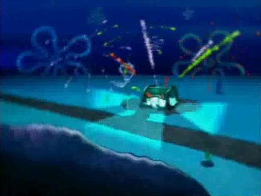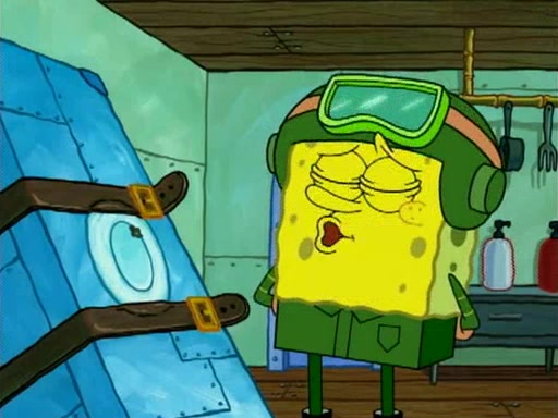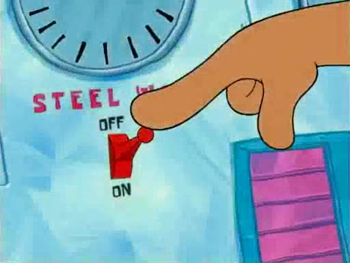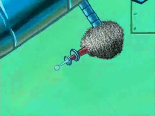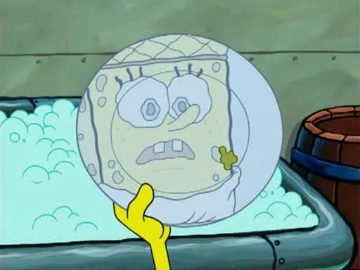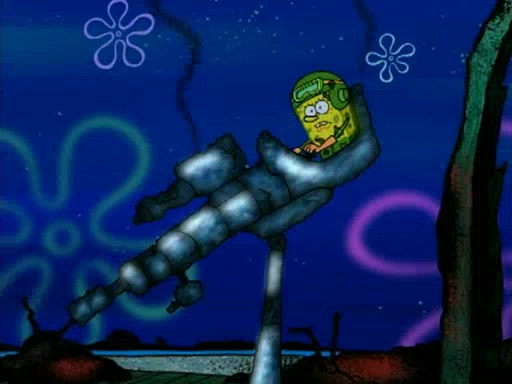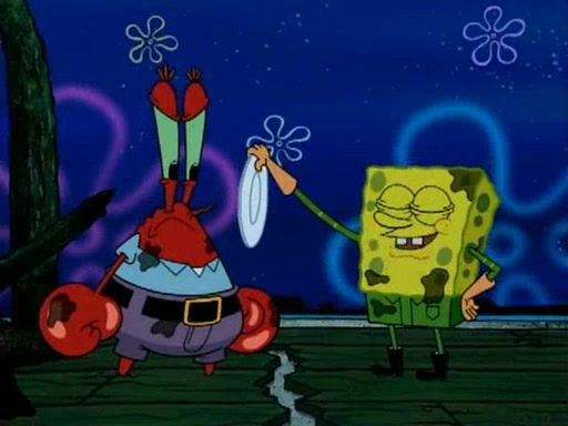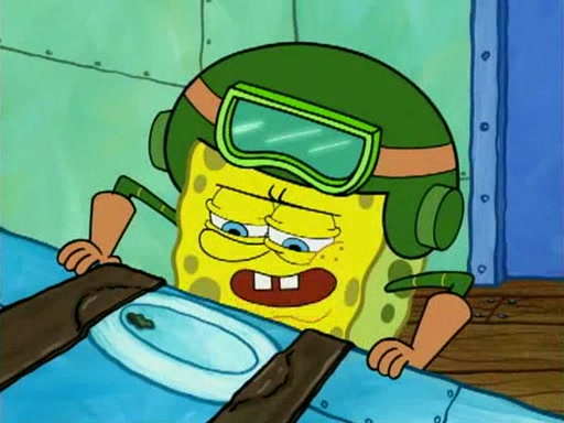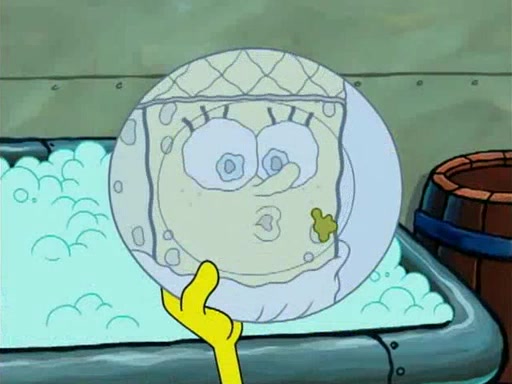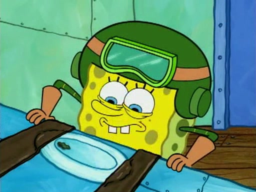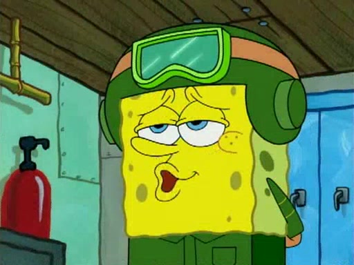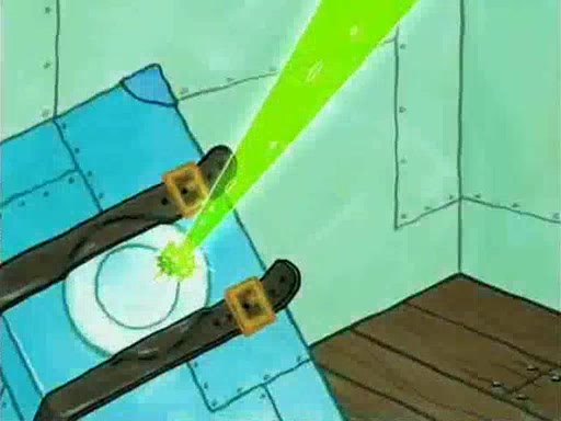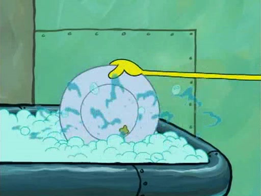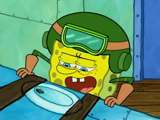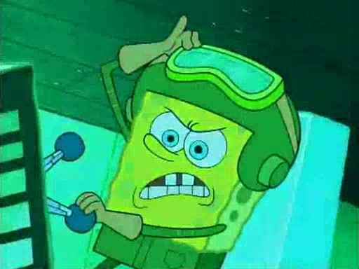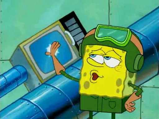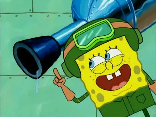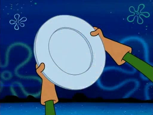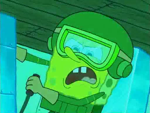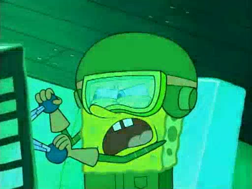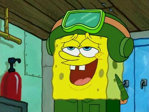 SpongeBob soon comes back, dressed in an army outfit and introduces the dirty spot to the Spot-Master 6000. SpongeBob first shows the spot the microwave-powered laser particle beam. Then, he shows the spot the laser-guided high pressure water cannon. Finally, SpongeBob shows the spot a specially woven metal alloy ingeniously combined with state of the art cleaning materials. He calls it steel wool. And it comes with a laser. SpongeBob asks the spot "Any last words?" After hearing nothing from the plate, SpongeBob starts up Spot-Master 6000 and turns on the particle beam and the water cannon. Since it's not working, he turns on the steel wool laser. While this is happening, the Krusty Krab shakes, lights are shining out of it and Mr. Krabs can see it from his home. Mr. Krabs looks through his window and first thinks it has nothing to do with SpongeBob.