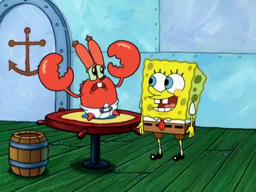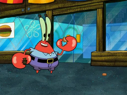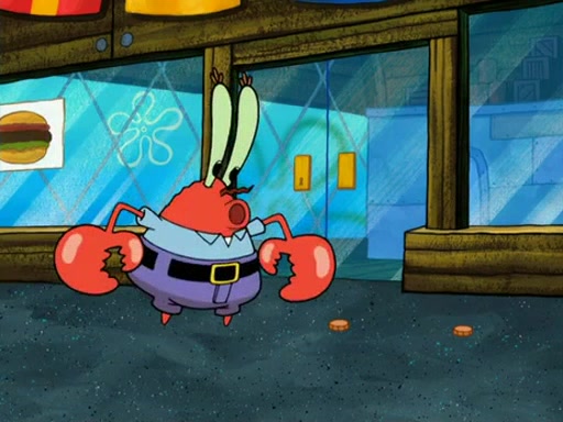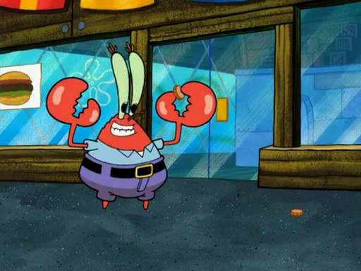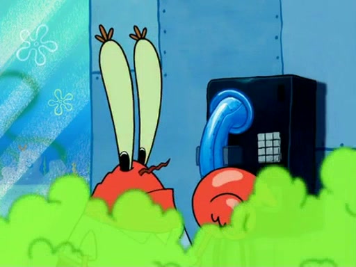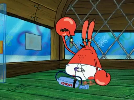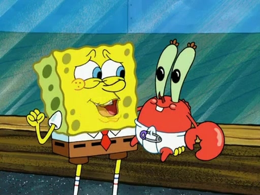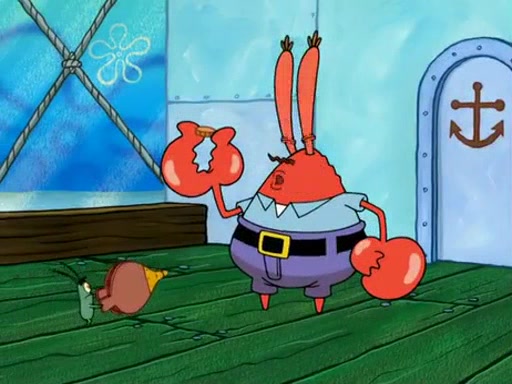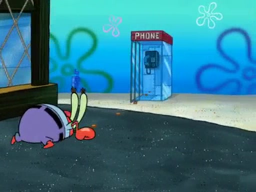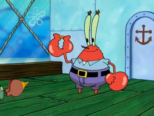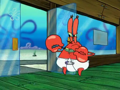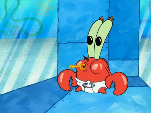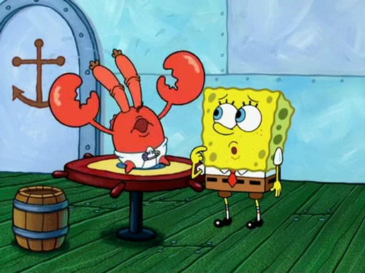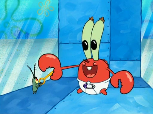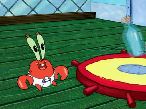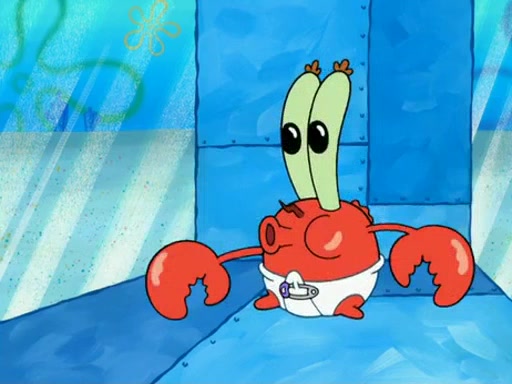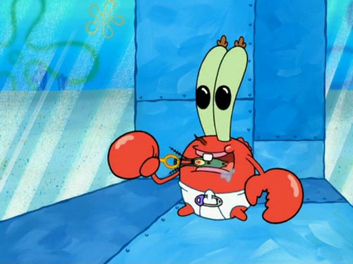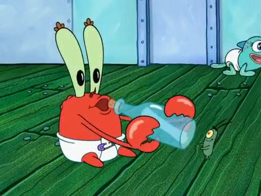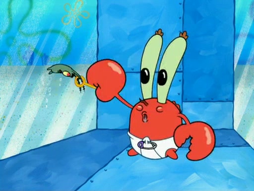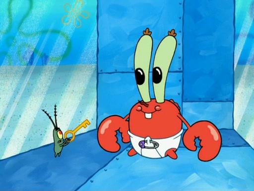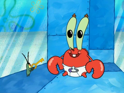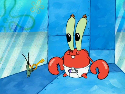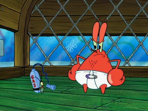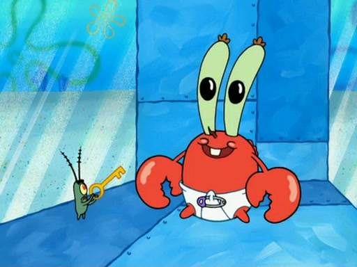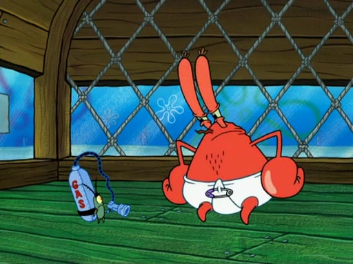 Plankton then leads Mr. Krabs in a telephone booth by money where he sprays Goo Goo Gas on him, turning Mr. Krabs into a baby but Baby Krabs teeths on Plankton. SpongeBob finds Baby Krabs and takes him, but Plankton accidentally reveals that Baby Krabs is Mr. Krabs and gets arrested, but easily escapes. SpongeBob takes the baby in the Krusty Krab and tries to comfort him with many items, eventually succeeding with a stack of twenties.