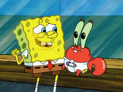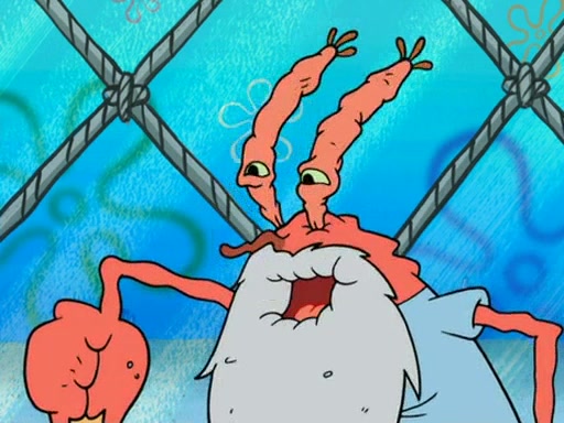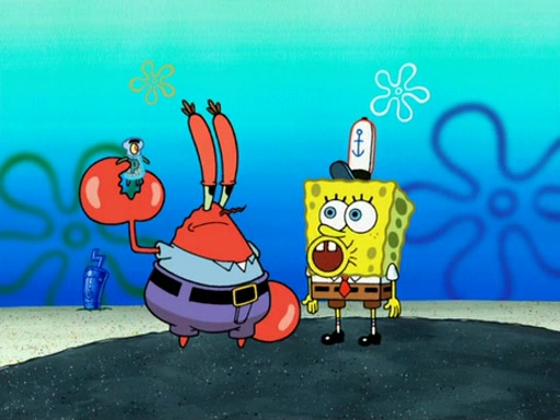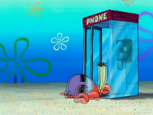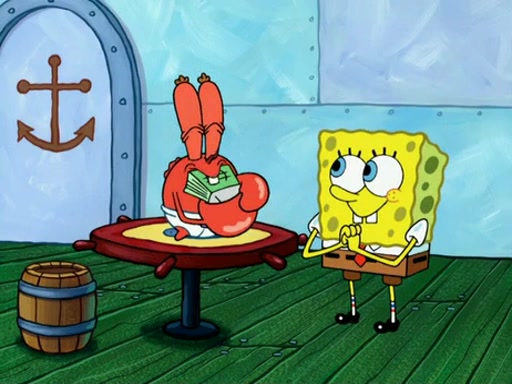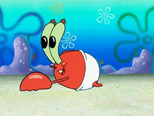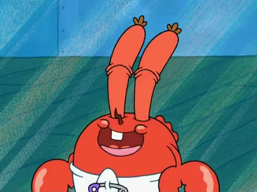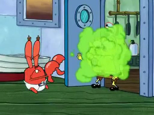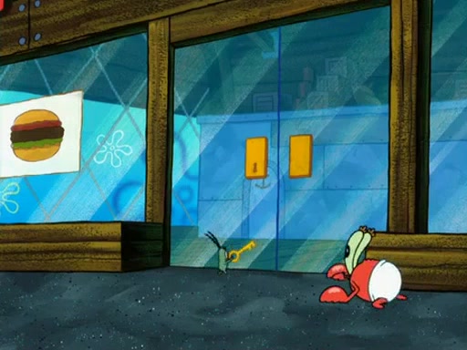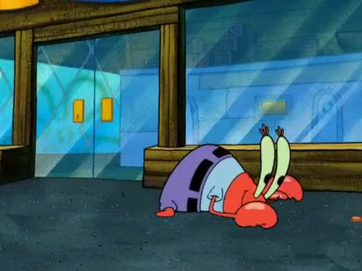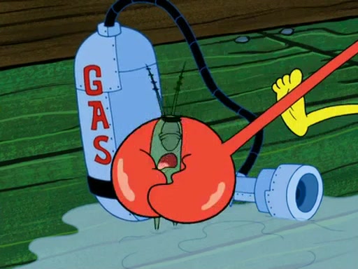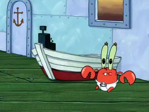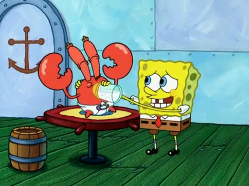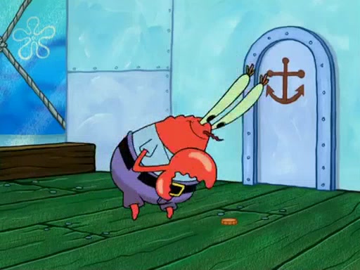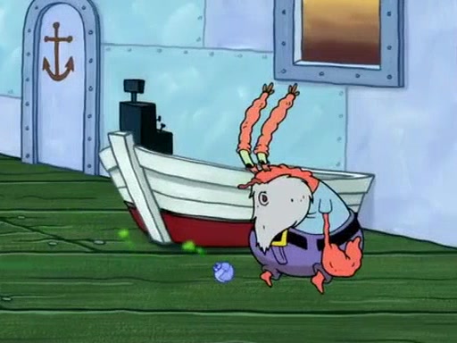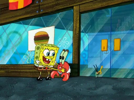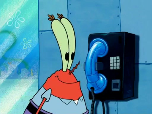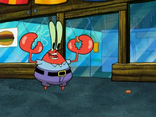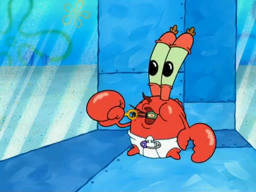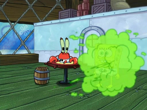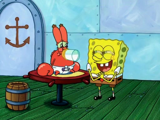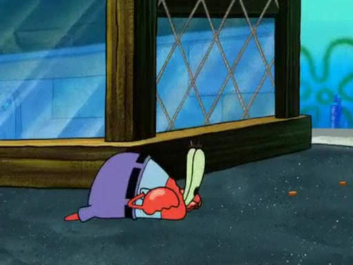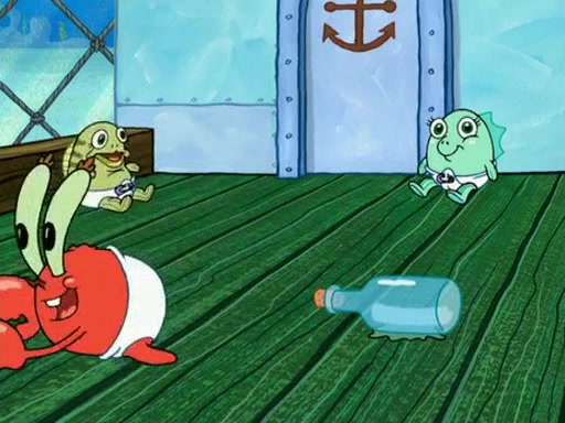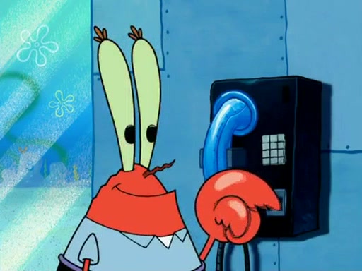 Plankton then leads Mr. Krabs in a telephone booth by money where he sprays Goo Goo Gas on him, turning Mr. Krabs into a baby but Baby Krabs teeths on Plankton. SpongeBob finds Baby Krabs and takes him, but Plankton accidentally reveals that Baby Krabs is Mr. Krabs and gets arrested, but easily escapes. SpongeBob takes the baby in the Krusty Krab and tries to comfort him with many items, eventually succeeding with a stack of twenties.