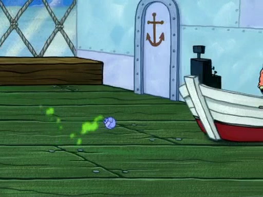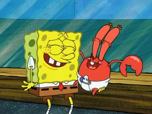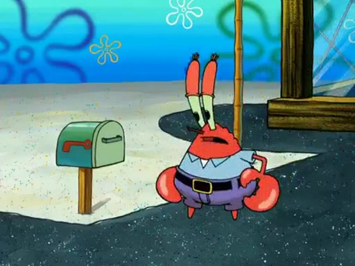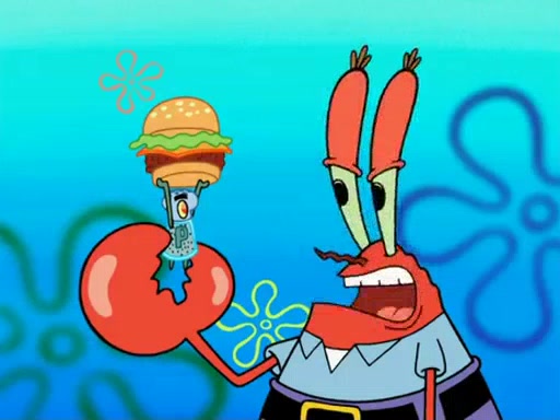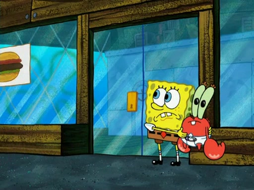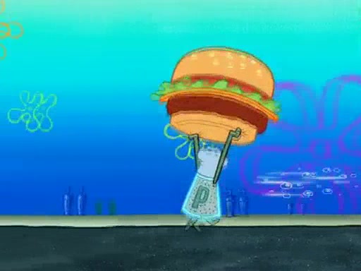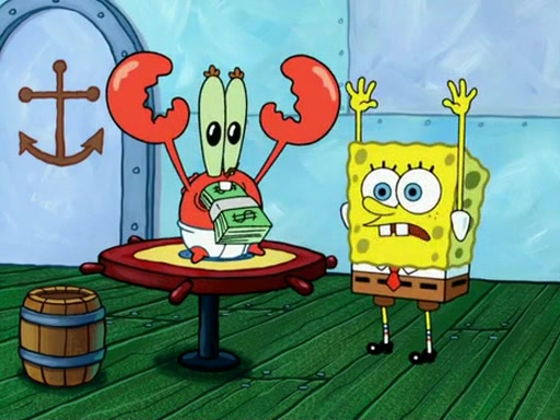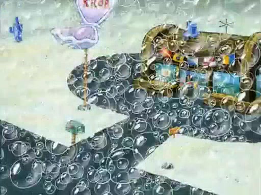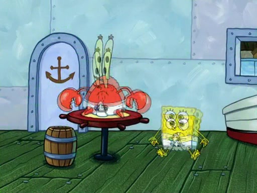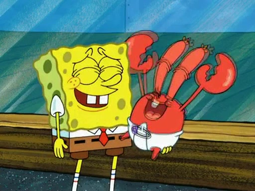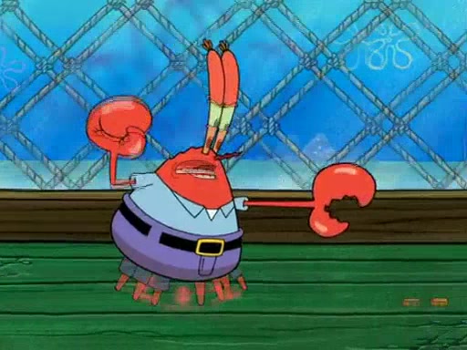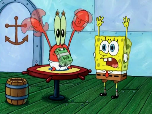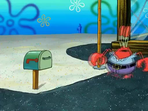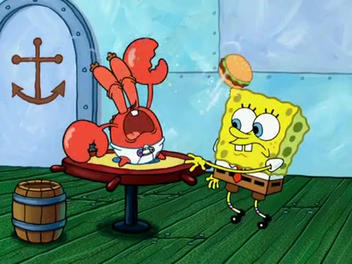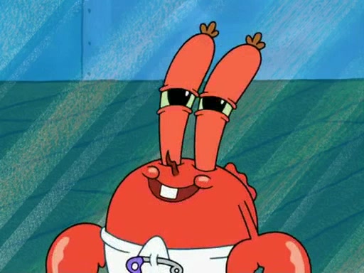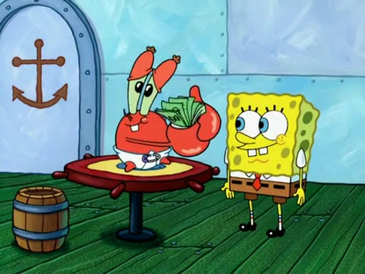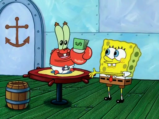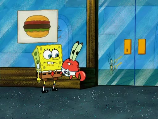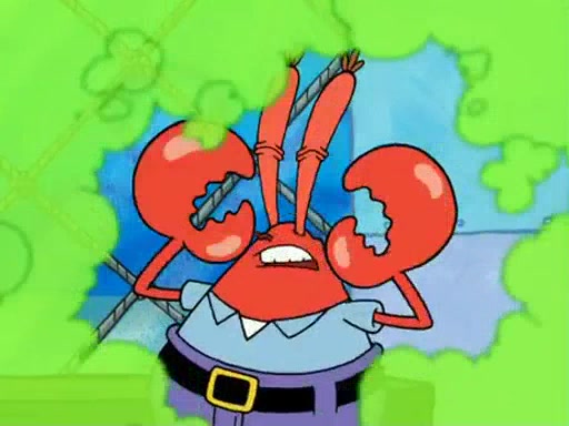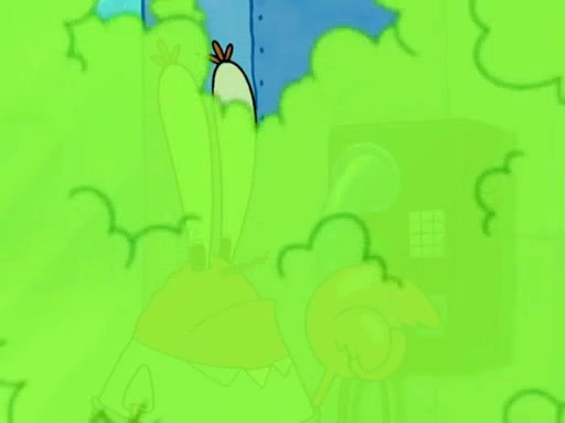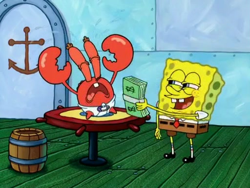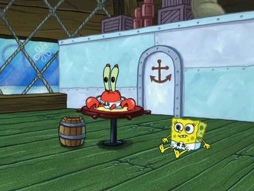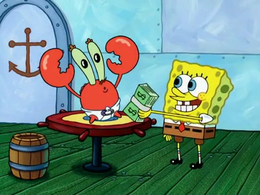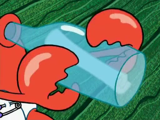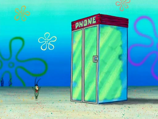 Plankton then leads Mr. Krabs in a telephone booth by money where he sprays Goo Goo Gas on him, turning Mr. Krabs into a baby but Baby Krabs teeths on Plankton. SpongeBob finds Baby Krabs and takes him, but Plankton accidentally reveals that Baby Krabs is Mr. Krabs and gets arrested, but easily escapes. SpongeBob takes the baby in the Krusty Krab and tries to comfort him with many items, eventually succeeding with a stack of twenties.