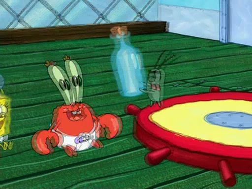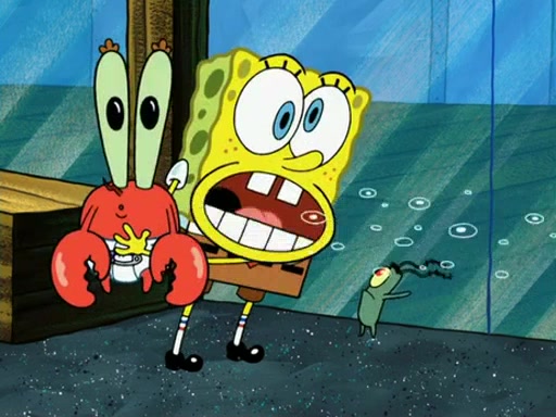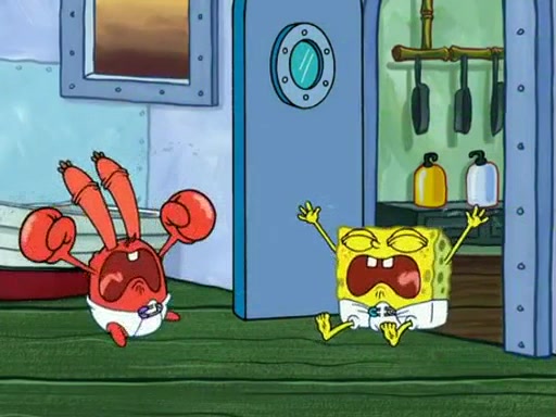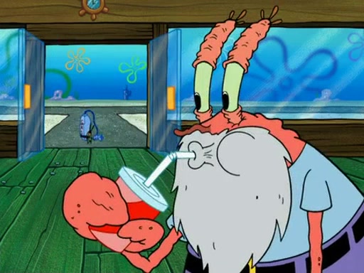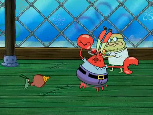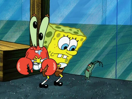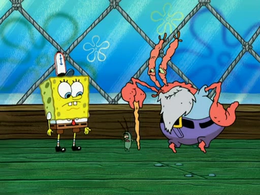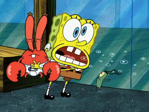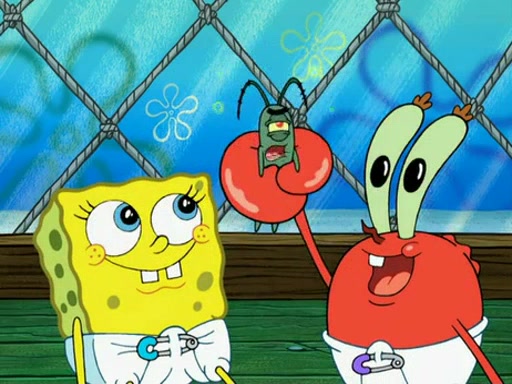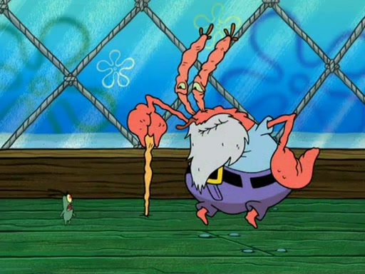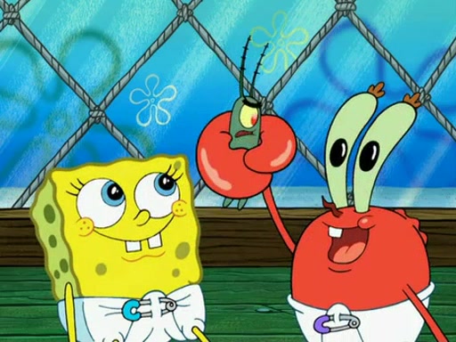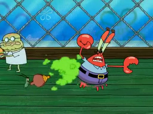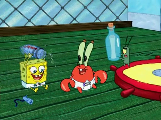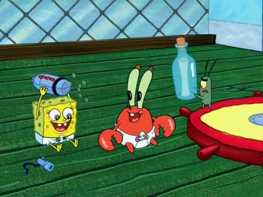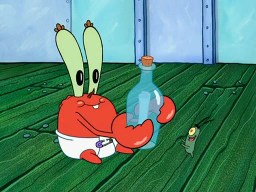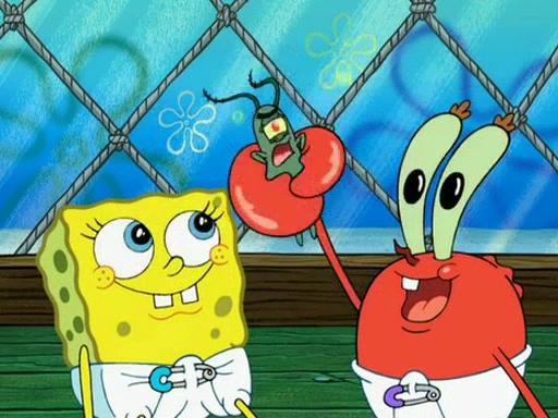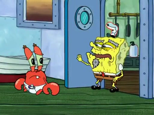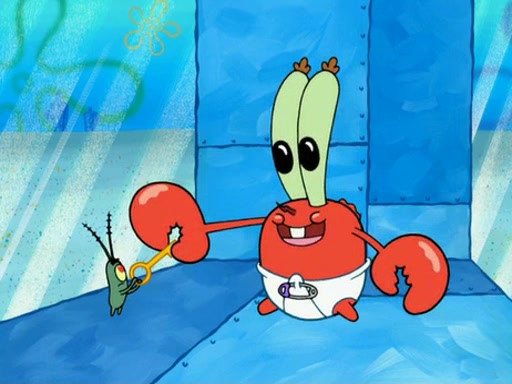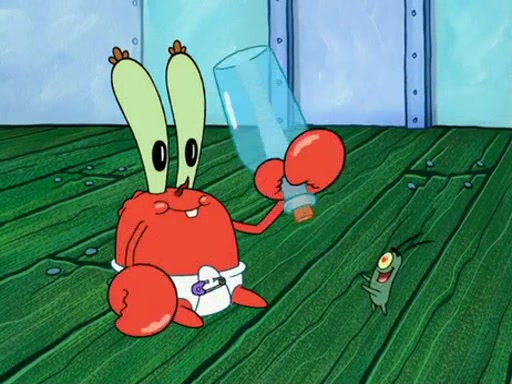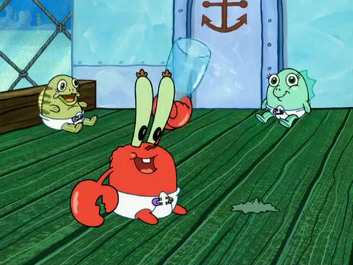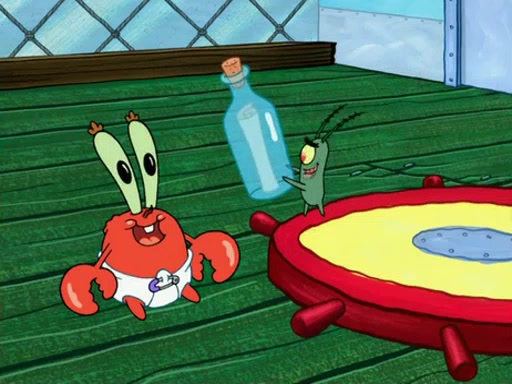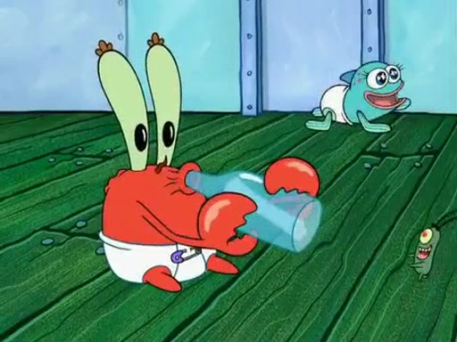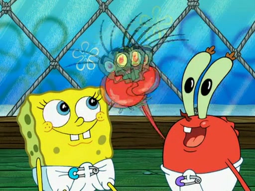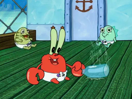 Meanwhile, Plankton sprays Baby Krabs and SpongeBob but Mr. Krabs is now an adult and SpongeBob is a baby. Plankton squirts SpongeBob and he is now an adult again. The same thing happens again, and Plankton thinks it was not right. He gets launched out of the Krusty Krab by Mr. Krabs again. Later, Plankton uses a new spray and sprays Mr. Krabs again. However, Mr. Krabs is now elderly, much to Plankton's dismay, thinking it was a baby at first.