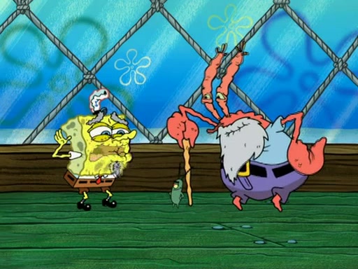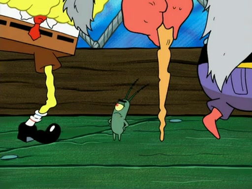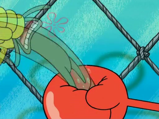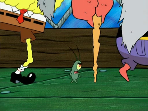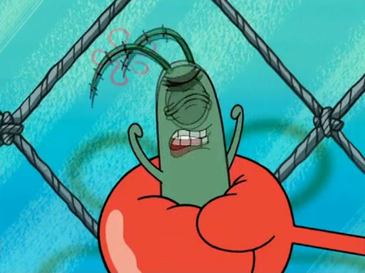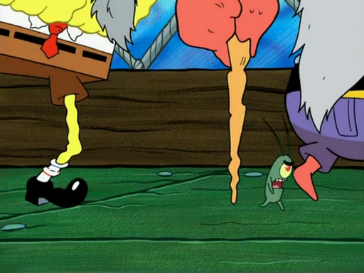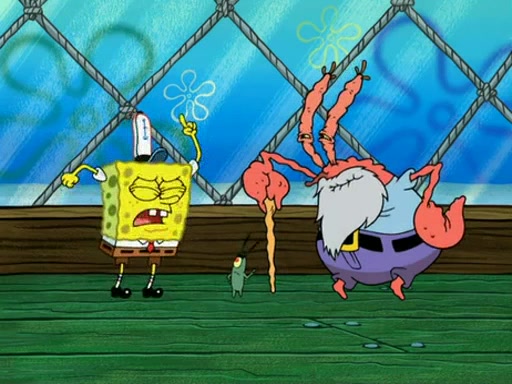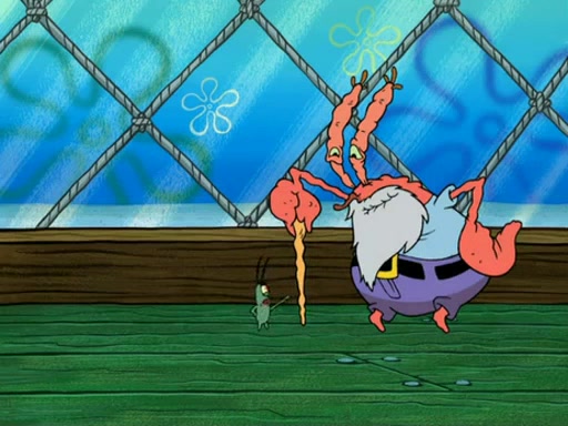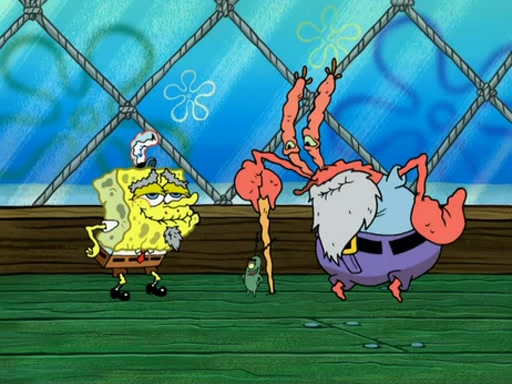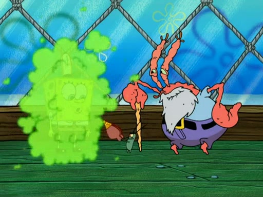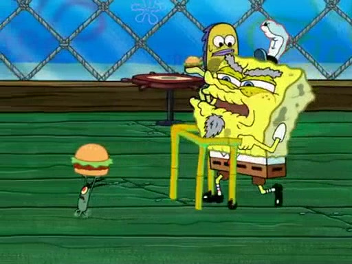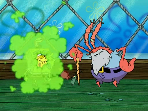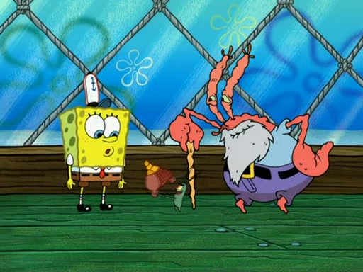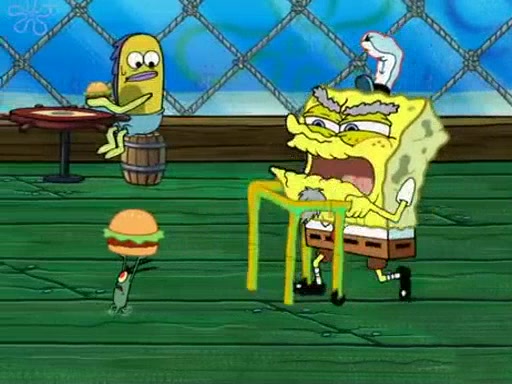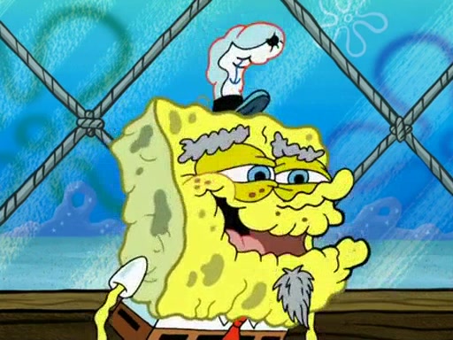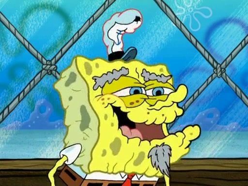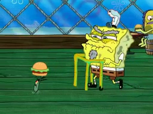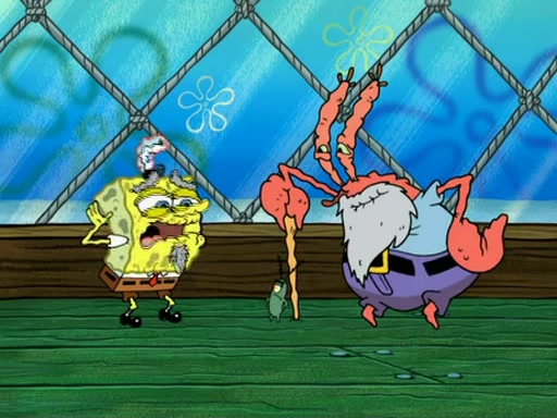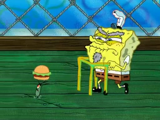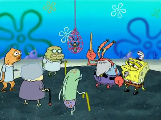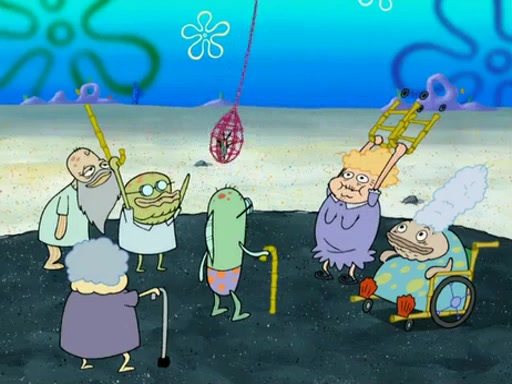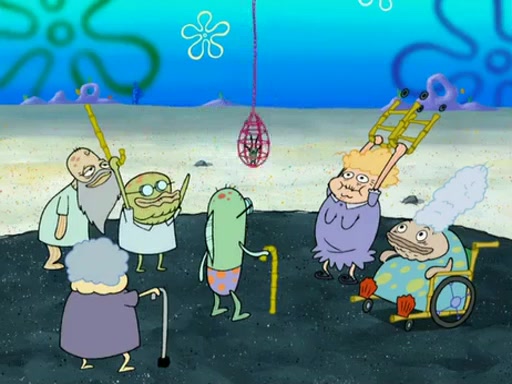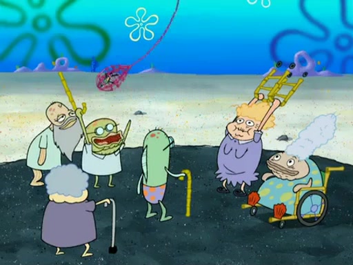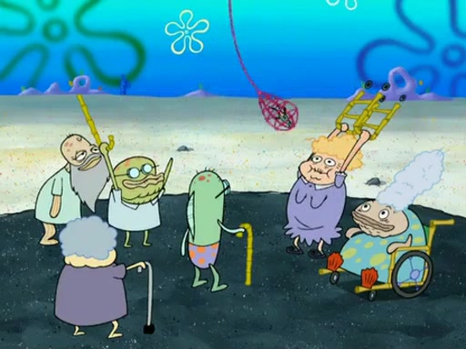 Soon, SpongeBob appears out of nowhere and says a speech about caring for Senior Citizens. However, Plankton sprays him as well. Then, he realizes that this was Senior Citizen Spray, but then says that they cannot catch him. SpongeBob and Mr. Krabs then trap Plankton by knitting a net, getting hit one by one by senior citizens.