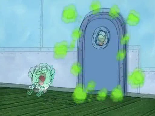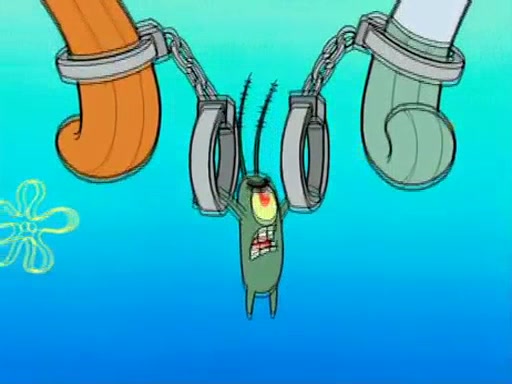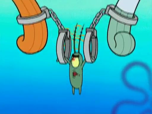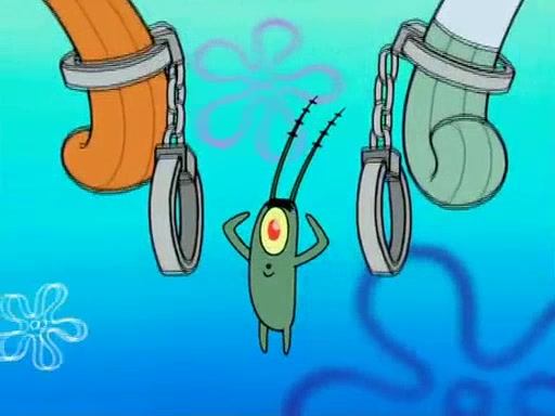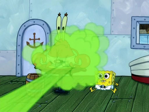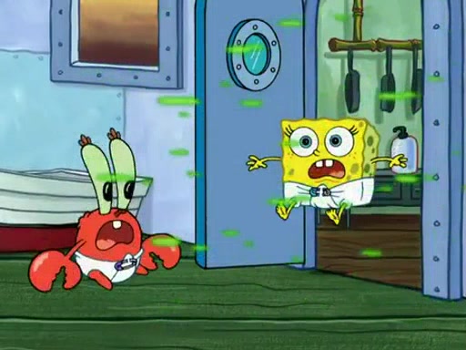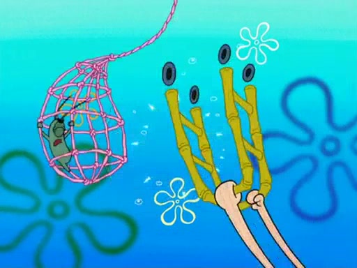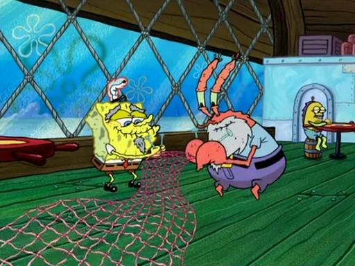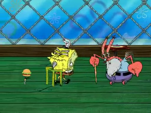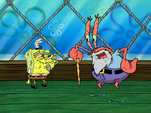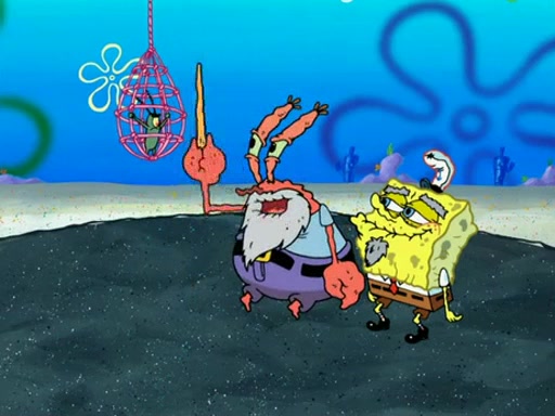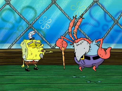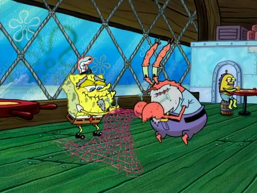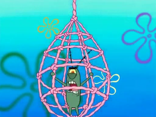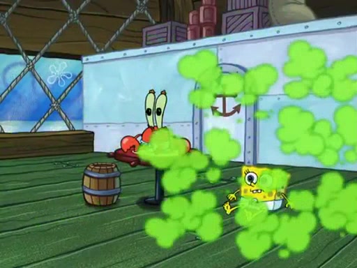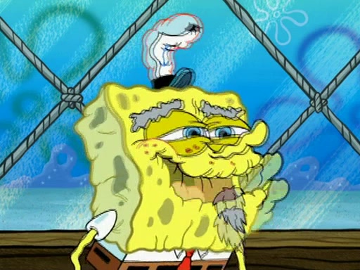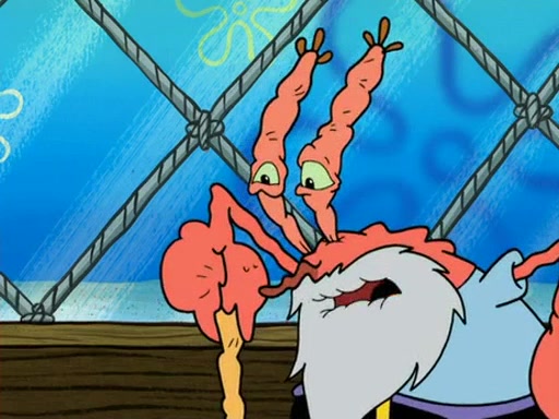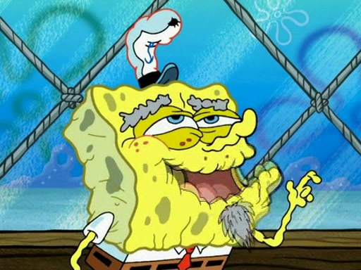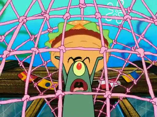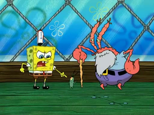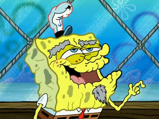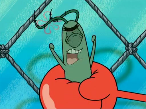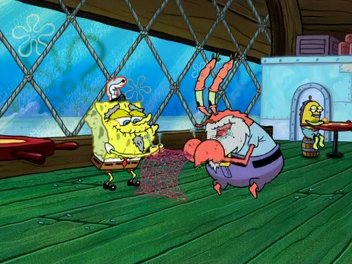 Soon, SpongeBob appears out of nowhere and says a speech about caring for Senior Citizens. However, Plankton sprays him as well. Then, he realizes that this was Senior Citizen Spray, but then says that they cannot catch him. SpongeBob and Mr. Krabs then trap Plankton by knitting a net, getting hit one by one by senior citizens.