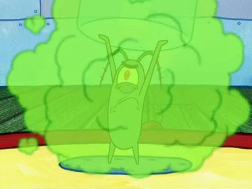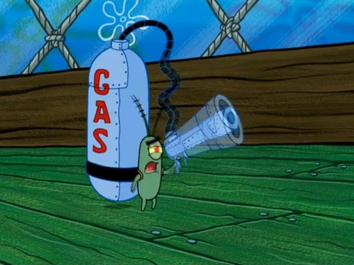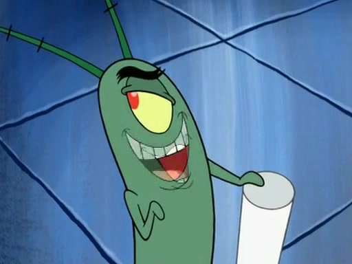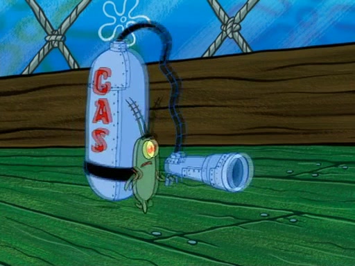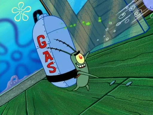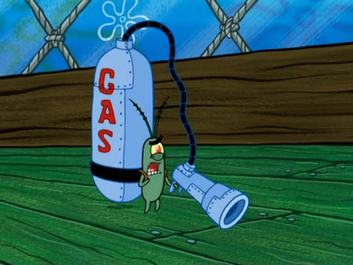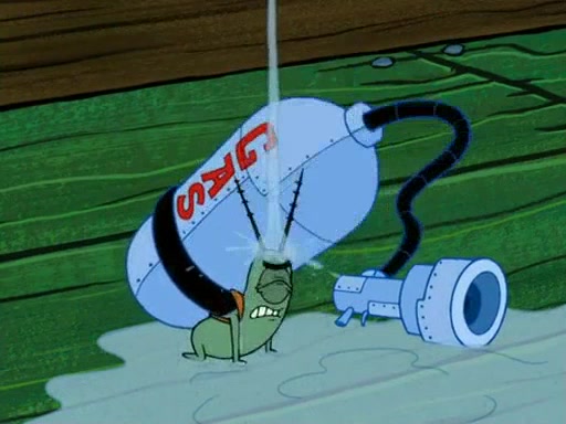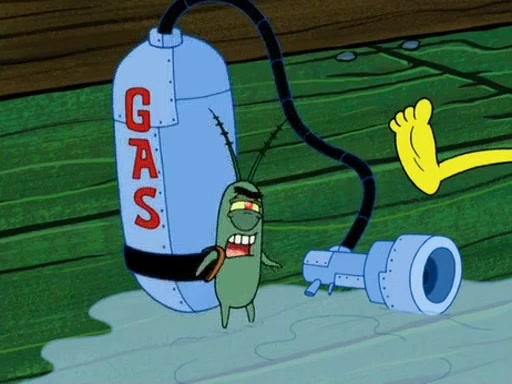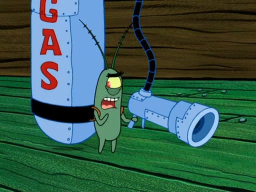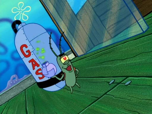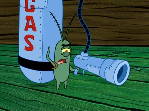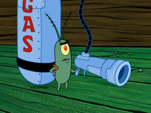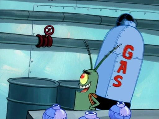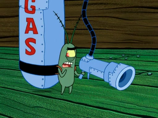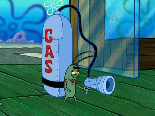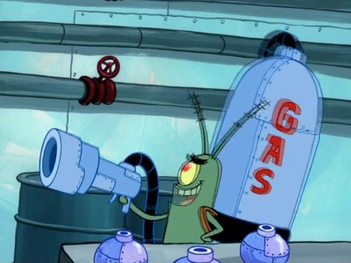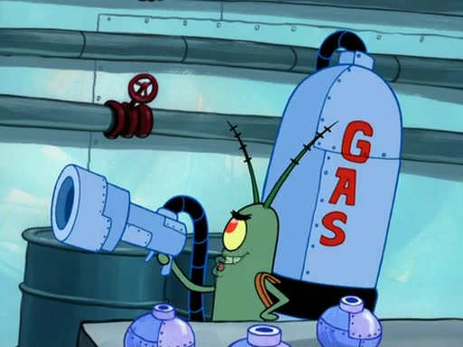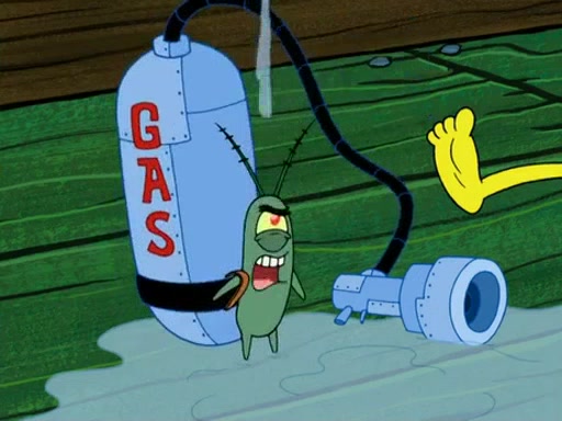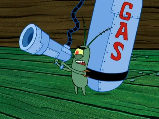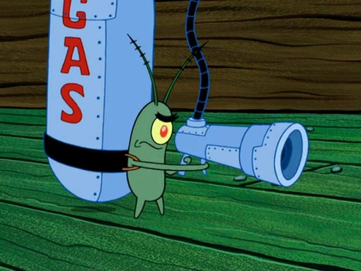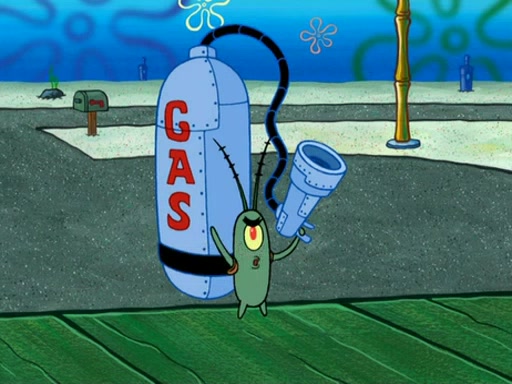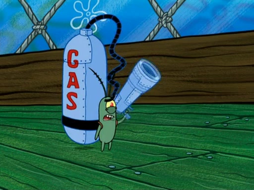 Baby SpongeBob then bashes the Goo Goo Gas canister, much to Plankton's dismay. But, Baby SpongeBob accidentally playing with the gas and flies in the air, turning Plankton into a microscopic baby. In the end of the episode, Plankton says "Ahem, Momma's evil little genius needs a diaper!"